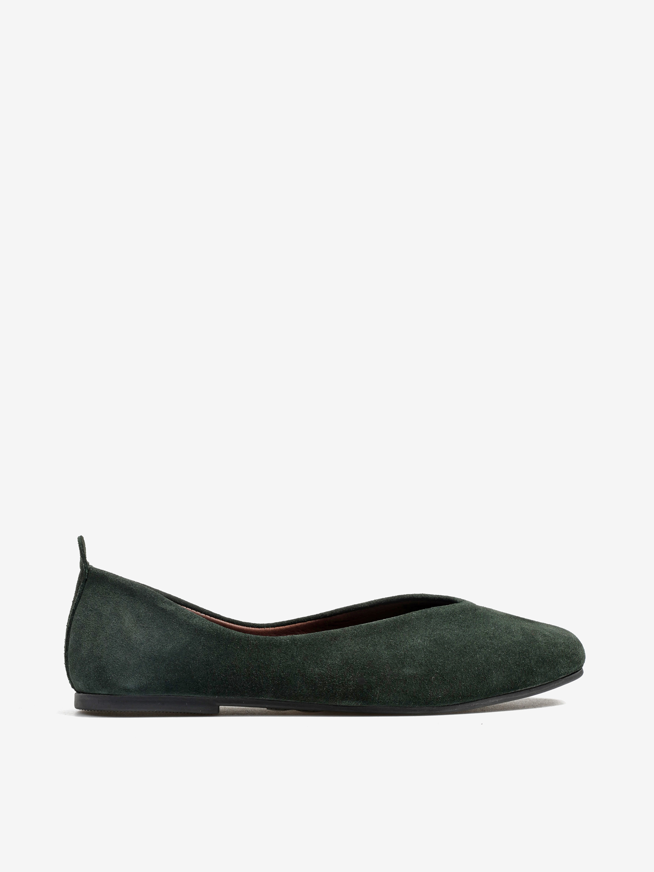 Baleriny wykonane z zamszowej, miękkiej skóry. Kwadratowy nosek i głębokie wycięcie w szpic.