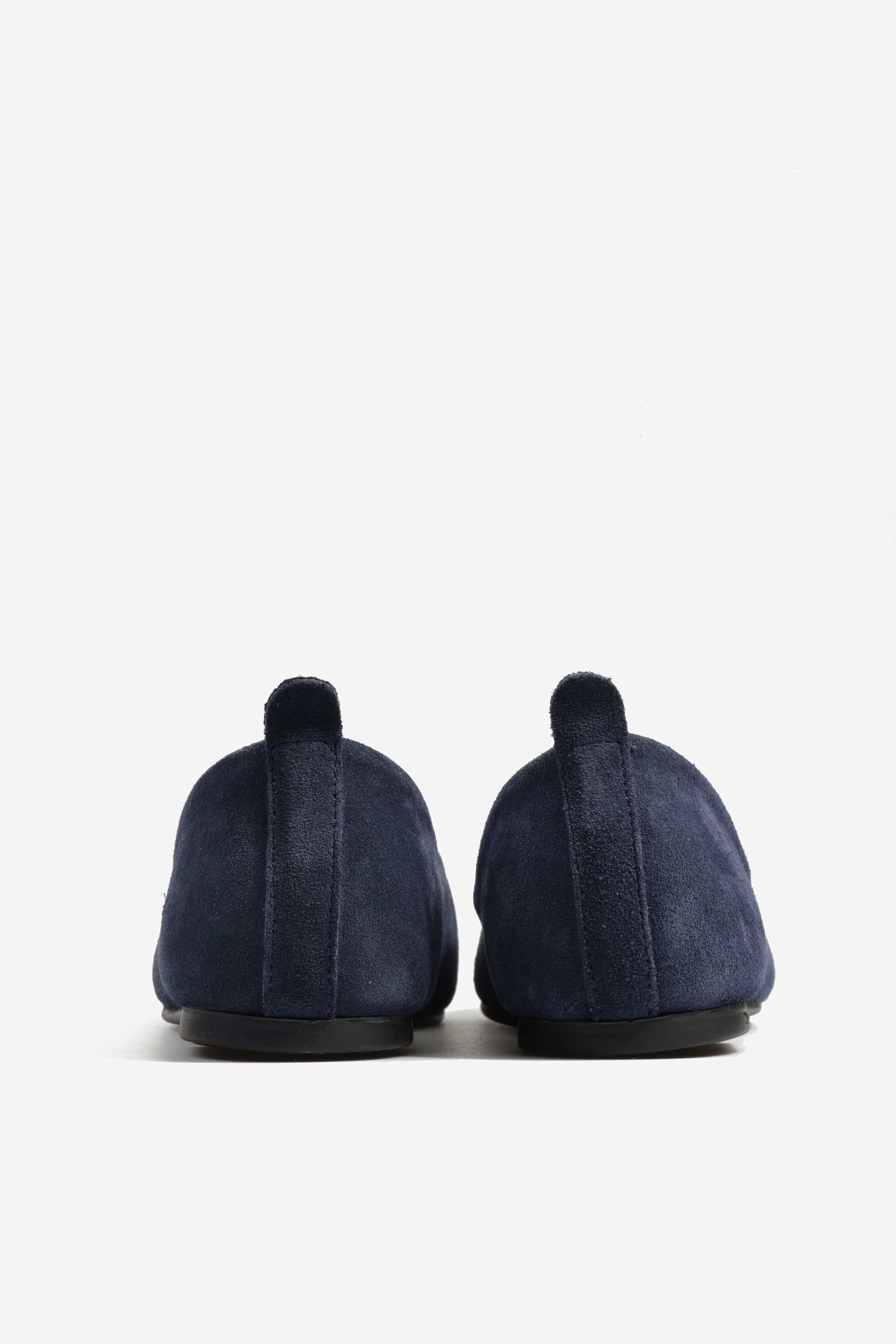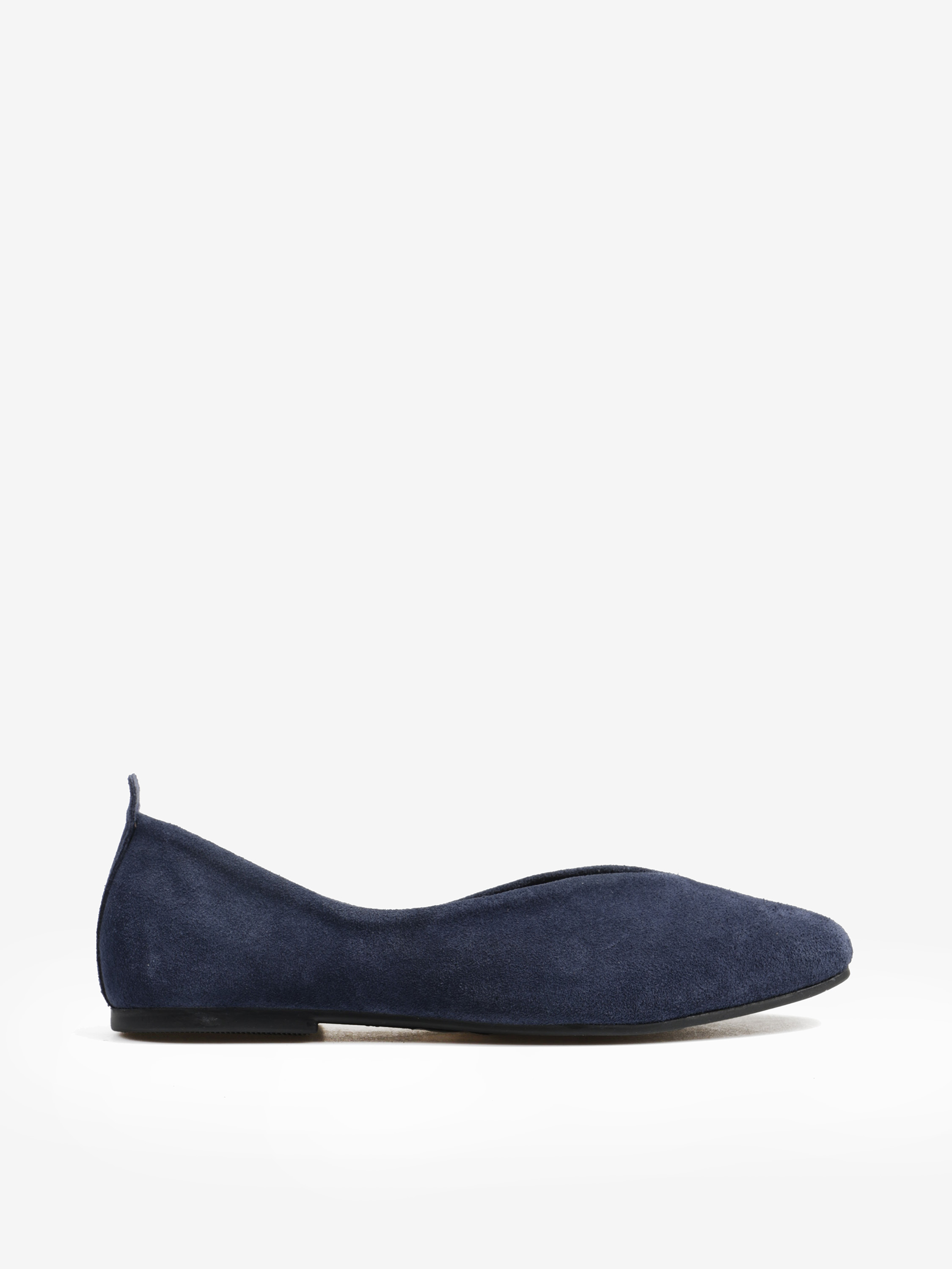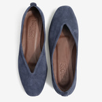 Baleriny wykonane z zamszowej, miękkiej skóry. Kwadratowy nosek i głębokie wycięcie w szpic.