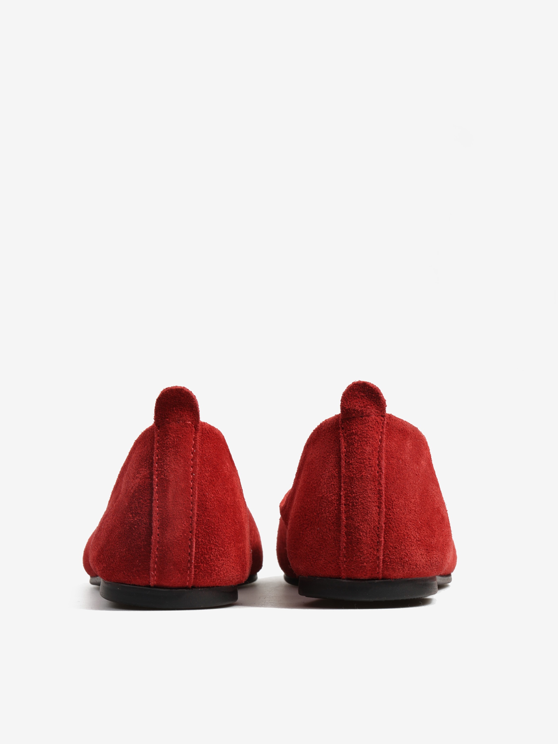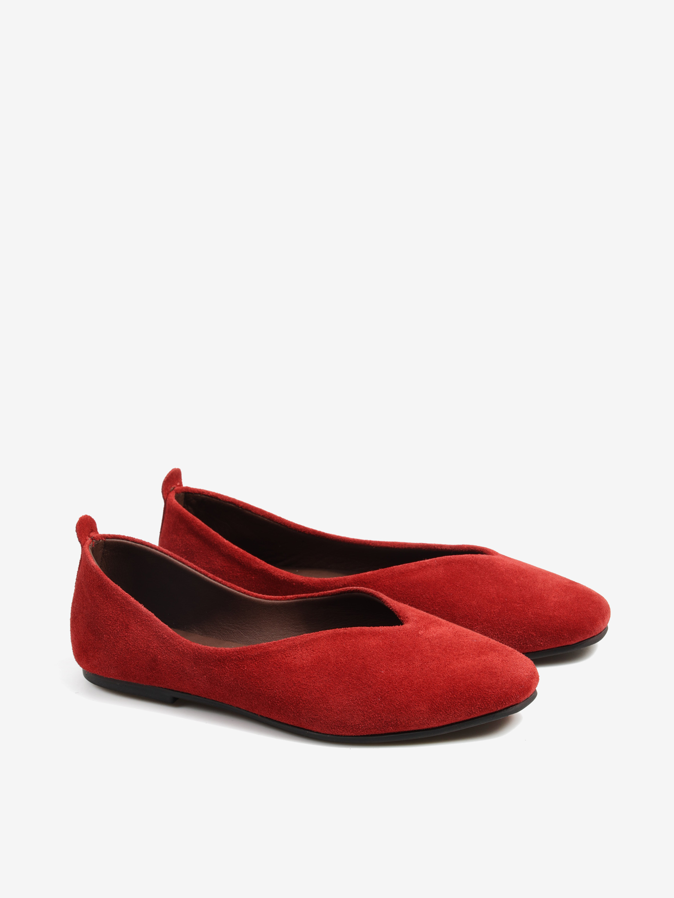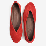 Baleriny wykonane z zamszowej, miękkiej skóry. Kwadratowy nosek i głębokie wycięcie w szpic.