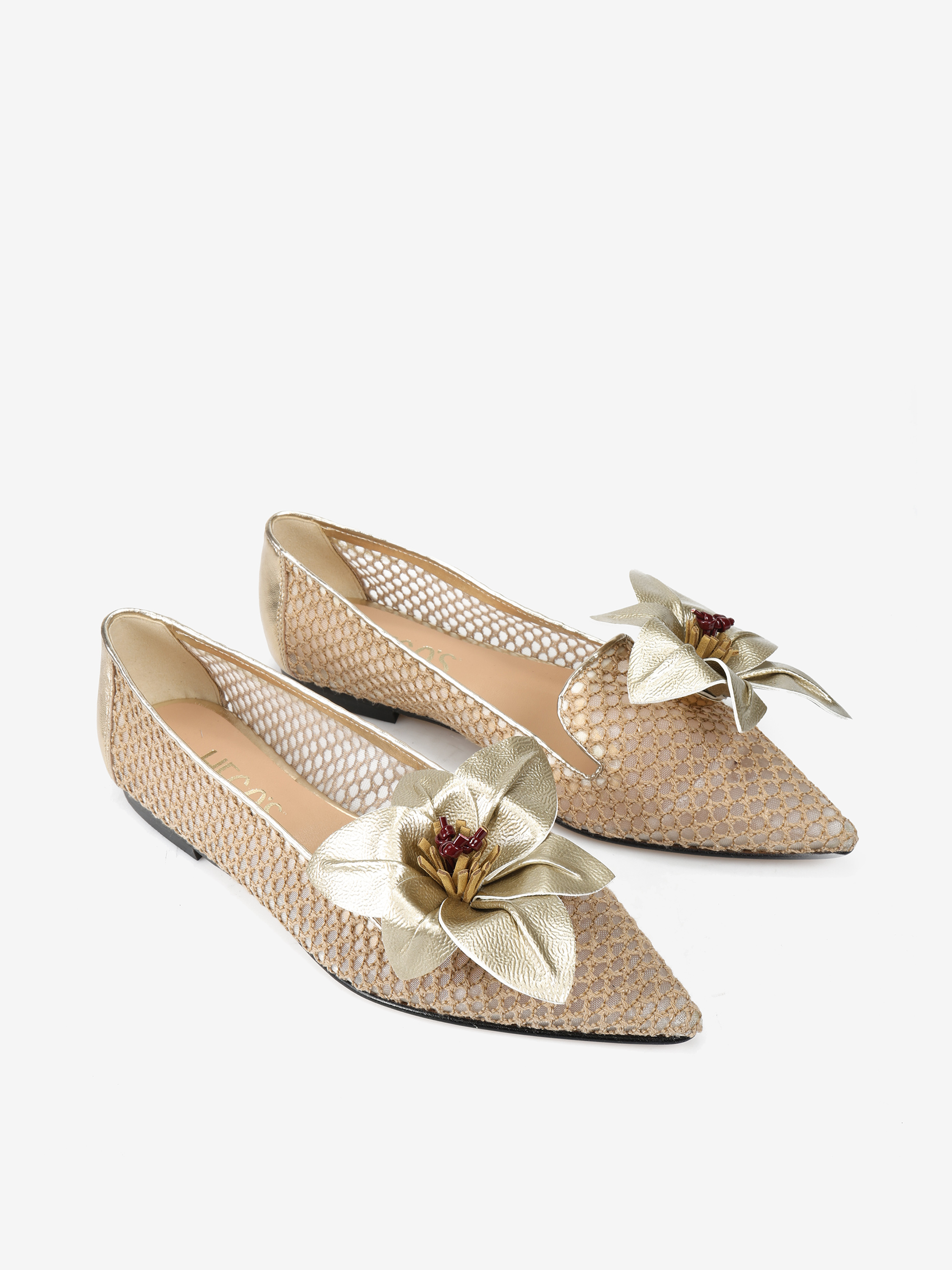 Baleriny z noskiem w szpic z przewiewnej siateczki z ozdobnym kwiatem. Skórzana pięta.