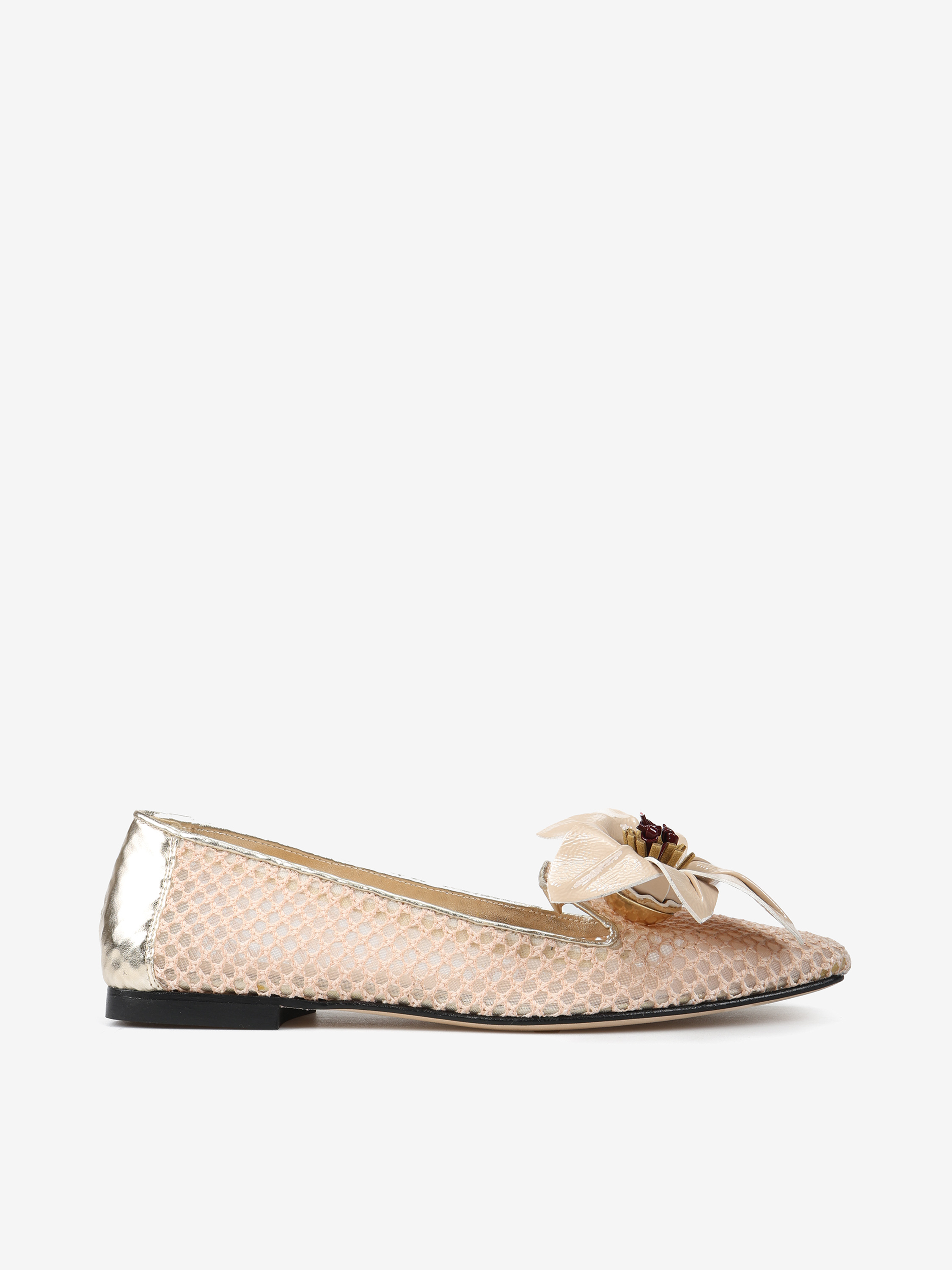 Baleriny z przewiewnej siateczki z ozdobnym kwiatem. Skórzana pięta.