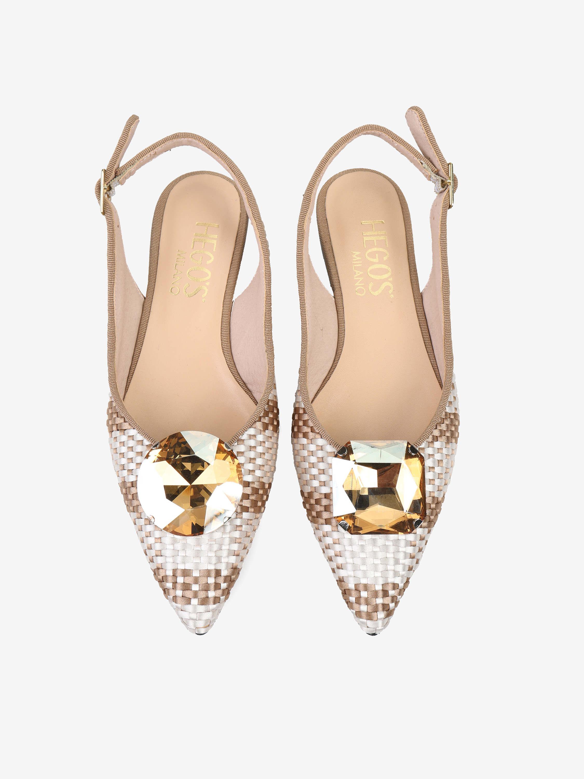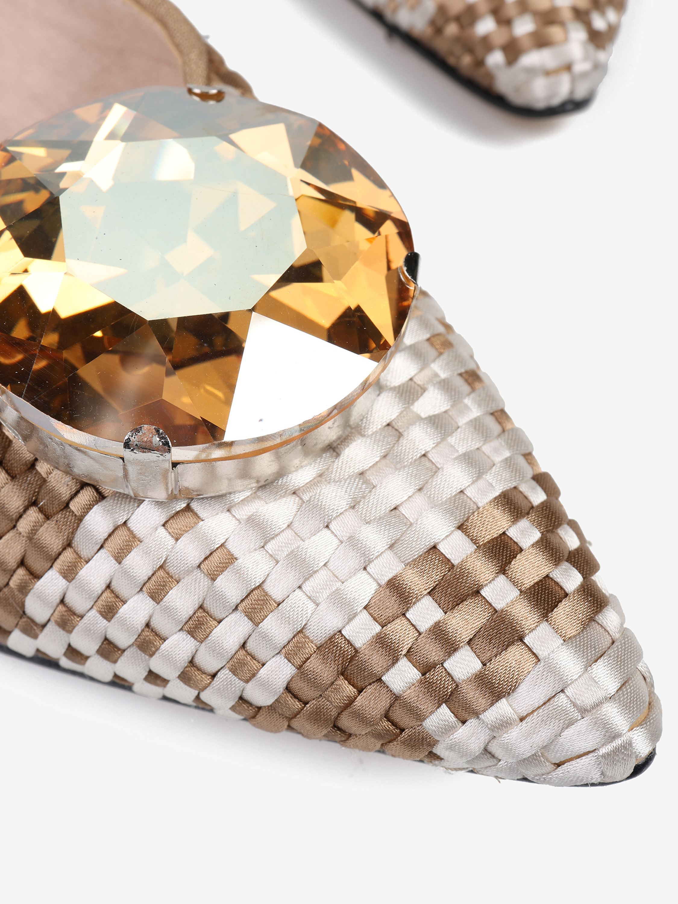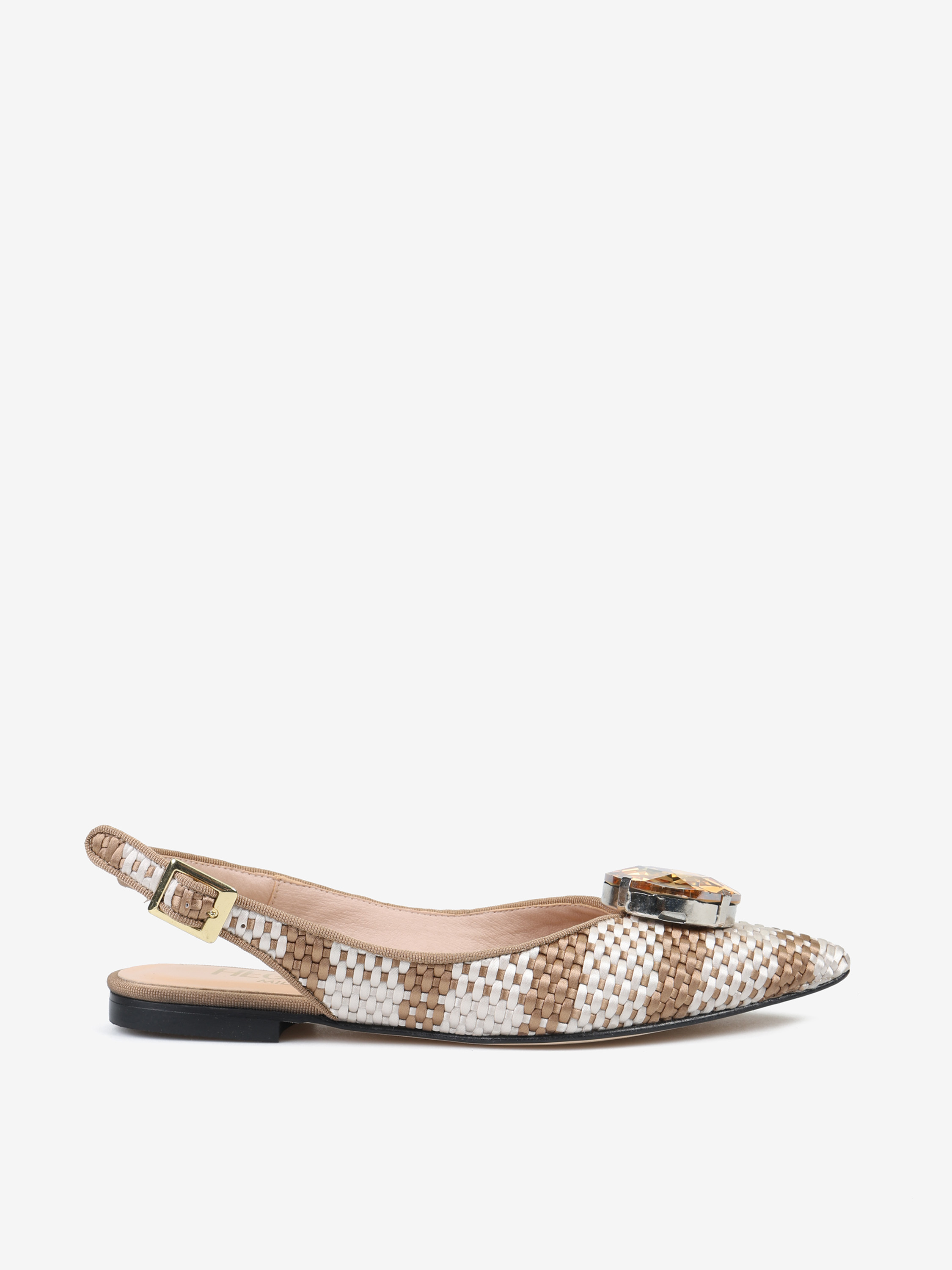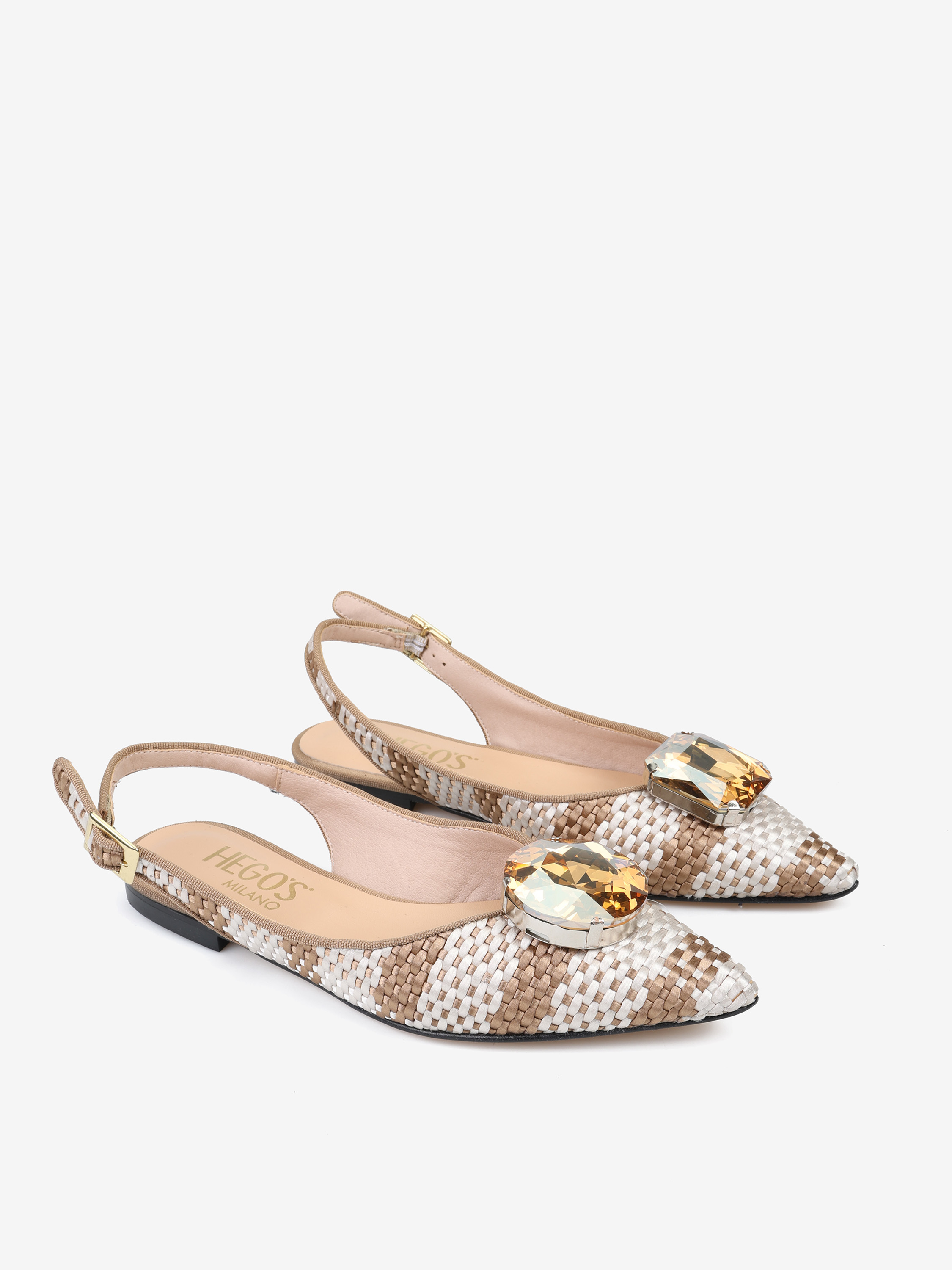 Baleriny z noskiem w szpic z ozdobnym kamieniem. Pleciony materiał i odkryta pięta z regulowanym paskiem.