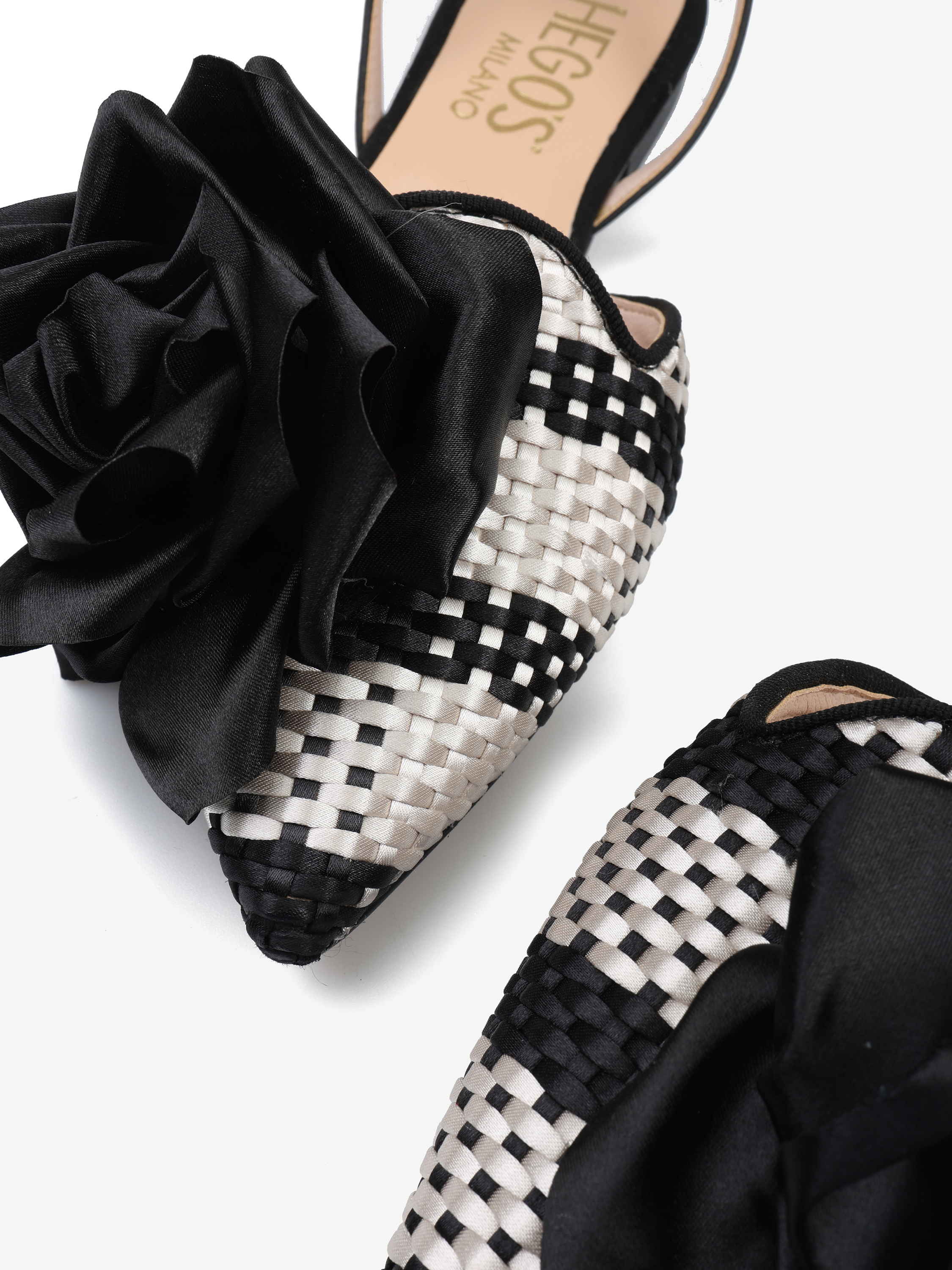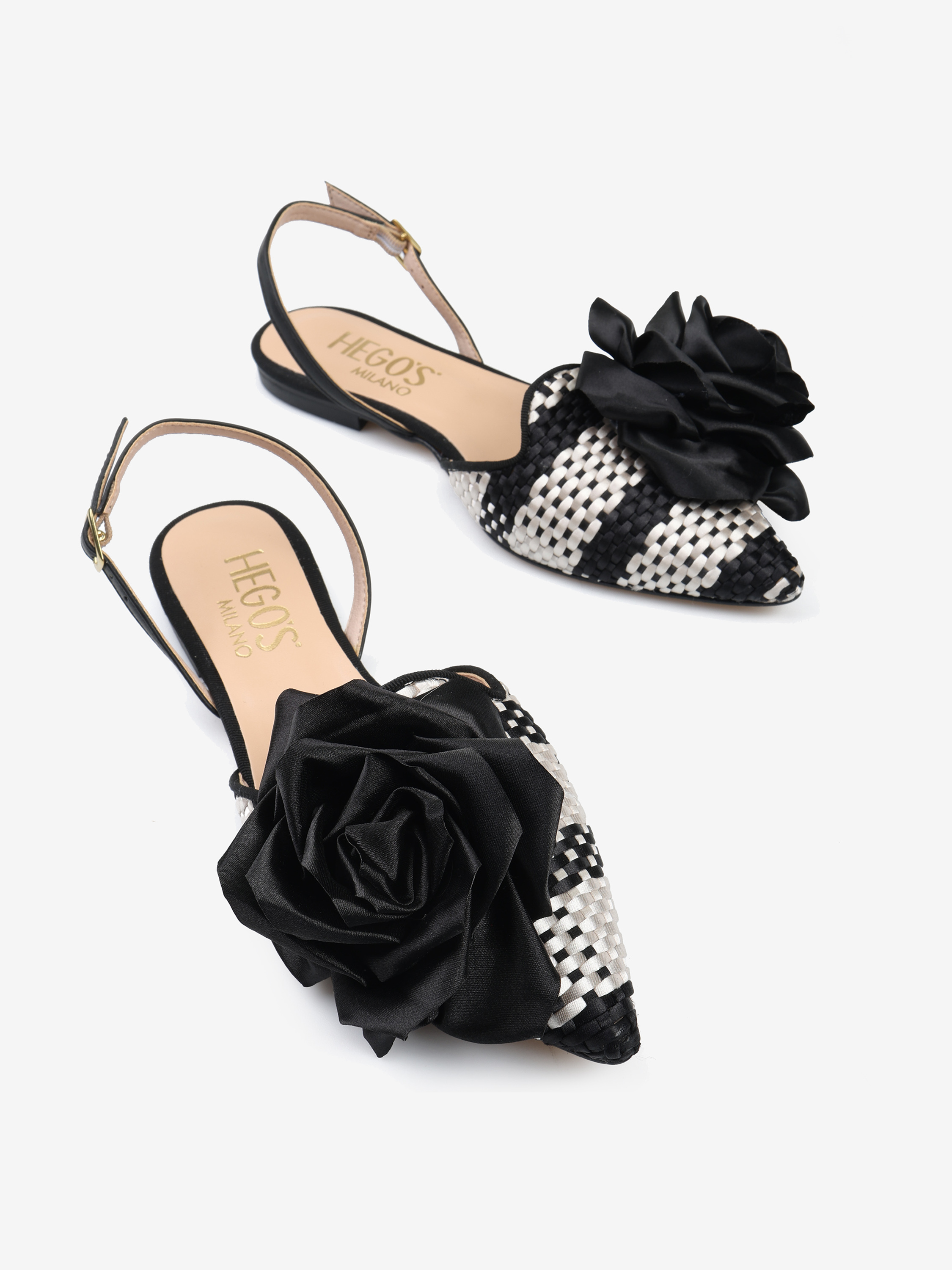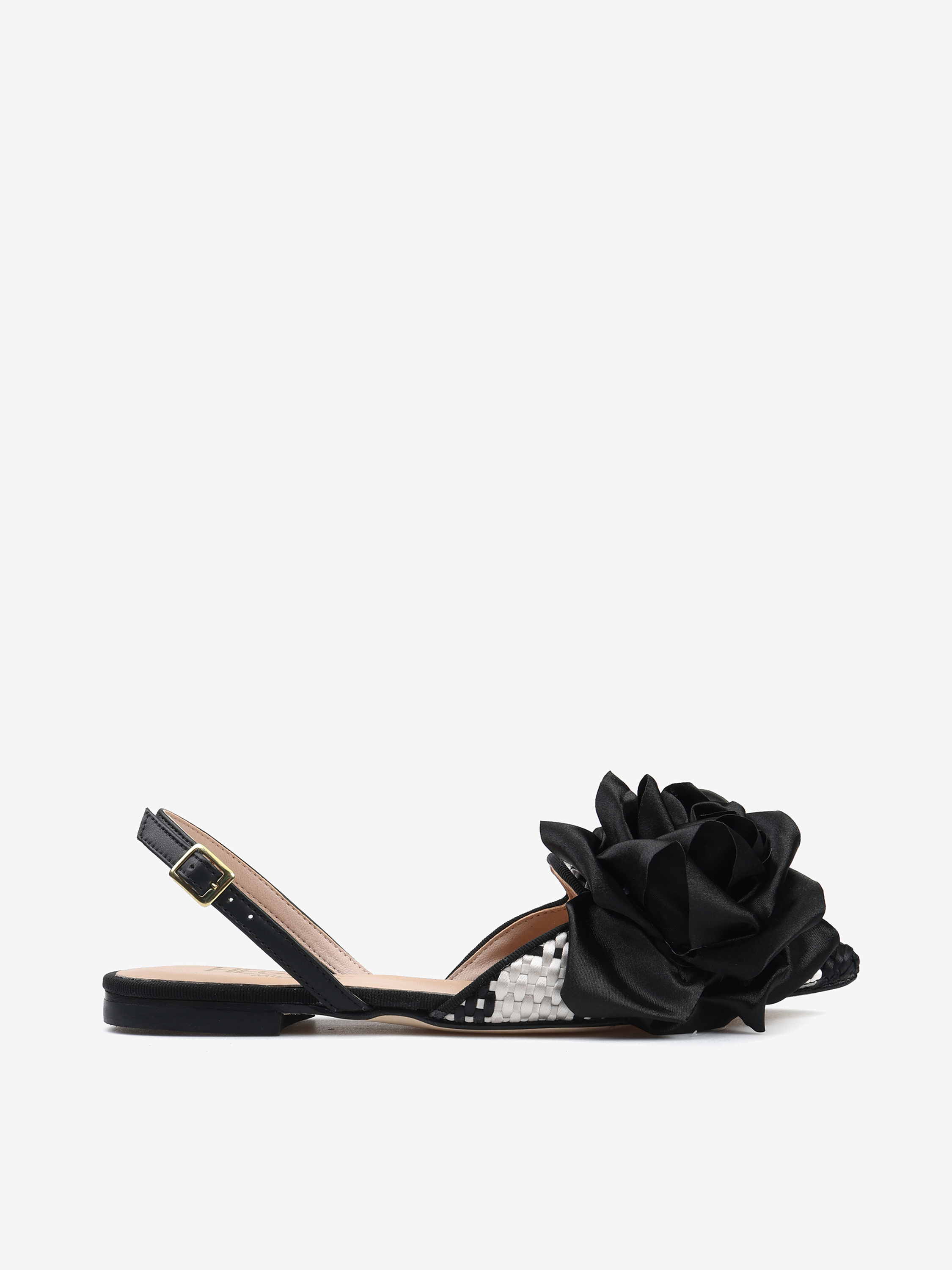 Baleriny z noskiem w szpic z ozdobnym kwiatem. Pleciony materiał i odkryta pięta z regulowanym paskiem.