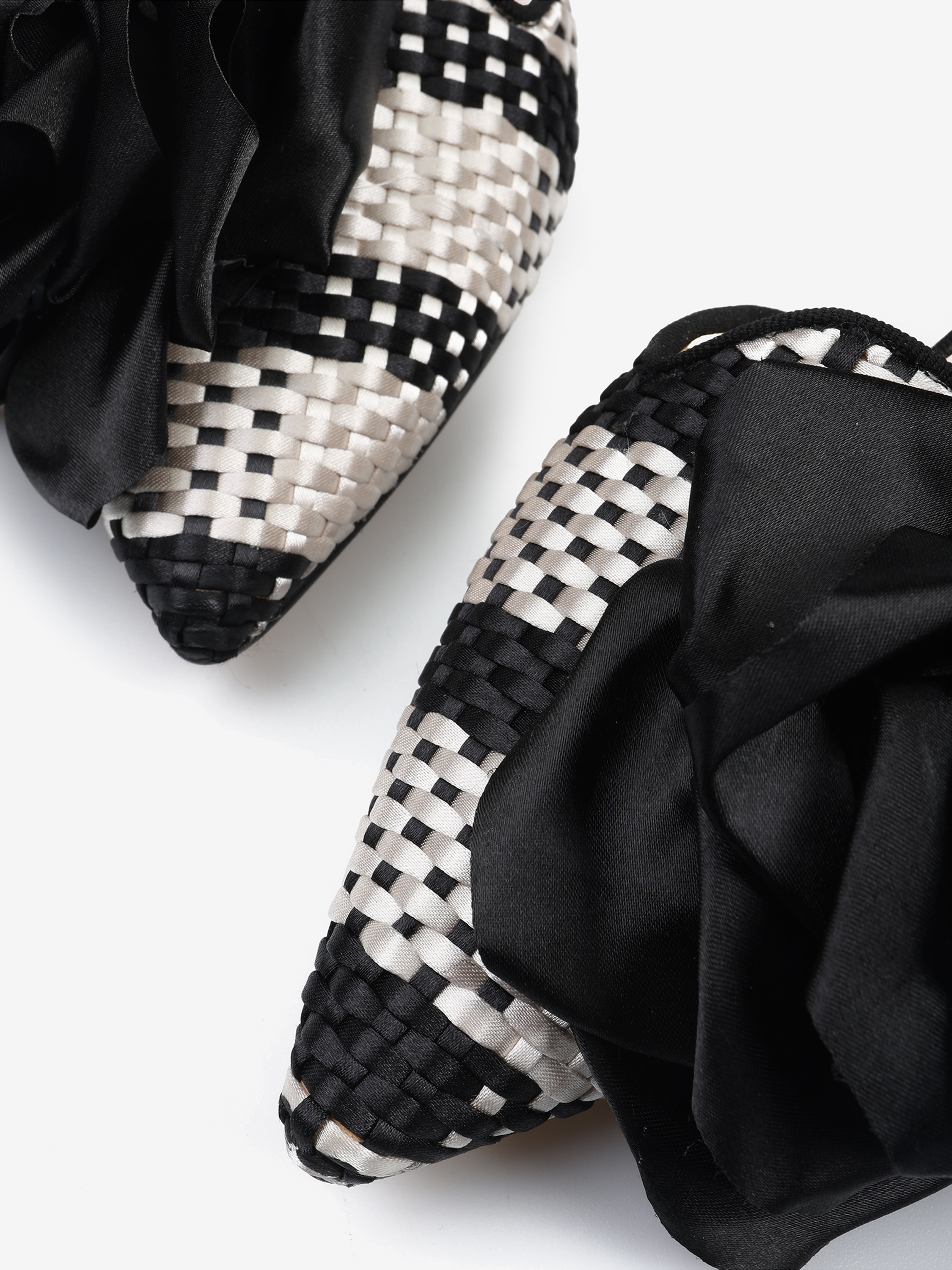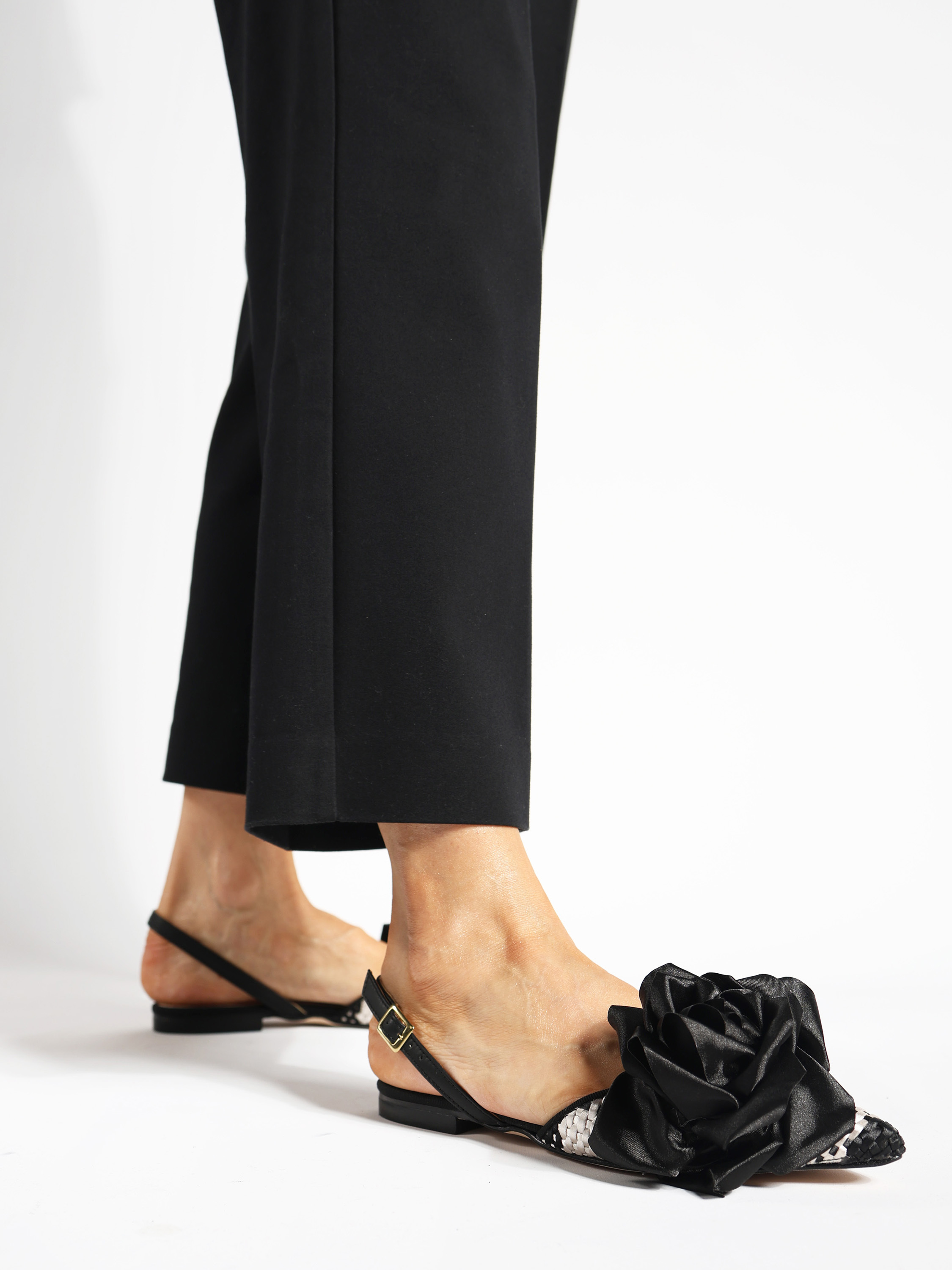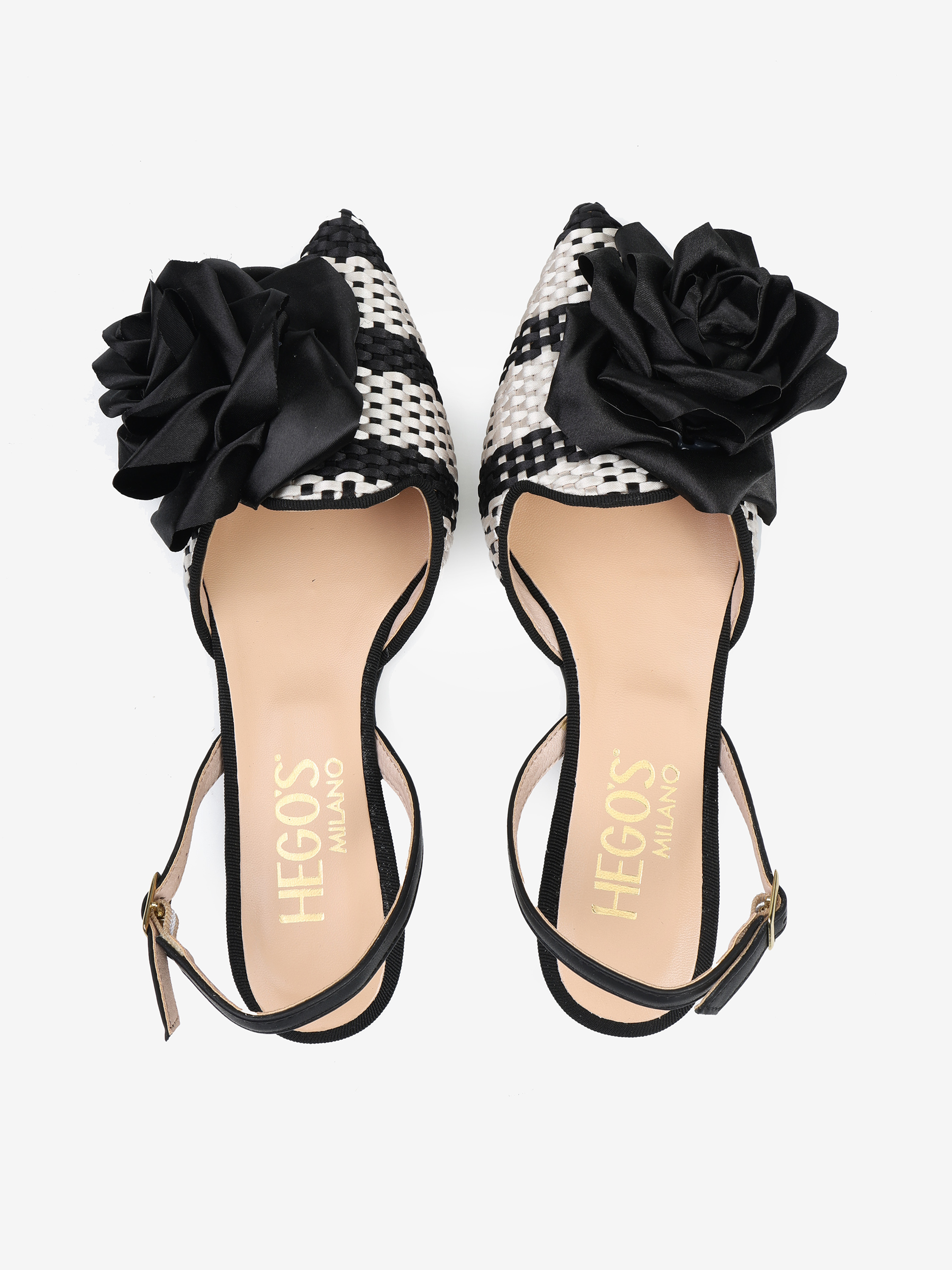 Baleriny z noskiem w szpic z ozdobnym kwiatem. Pleciony materiał i odkryta pięta z regulowanym paskiem.