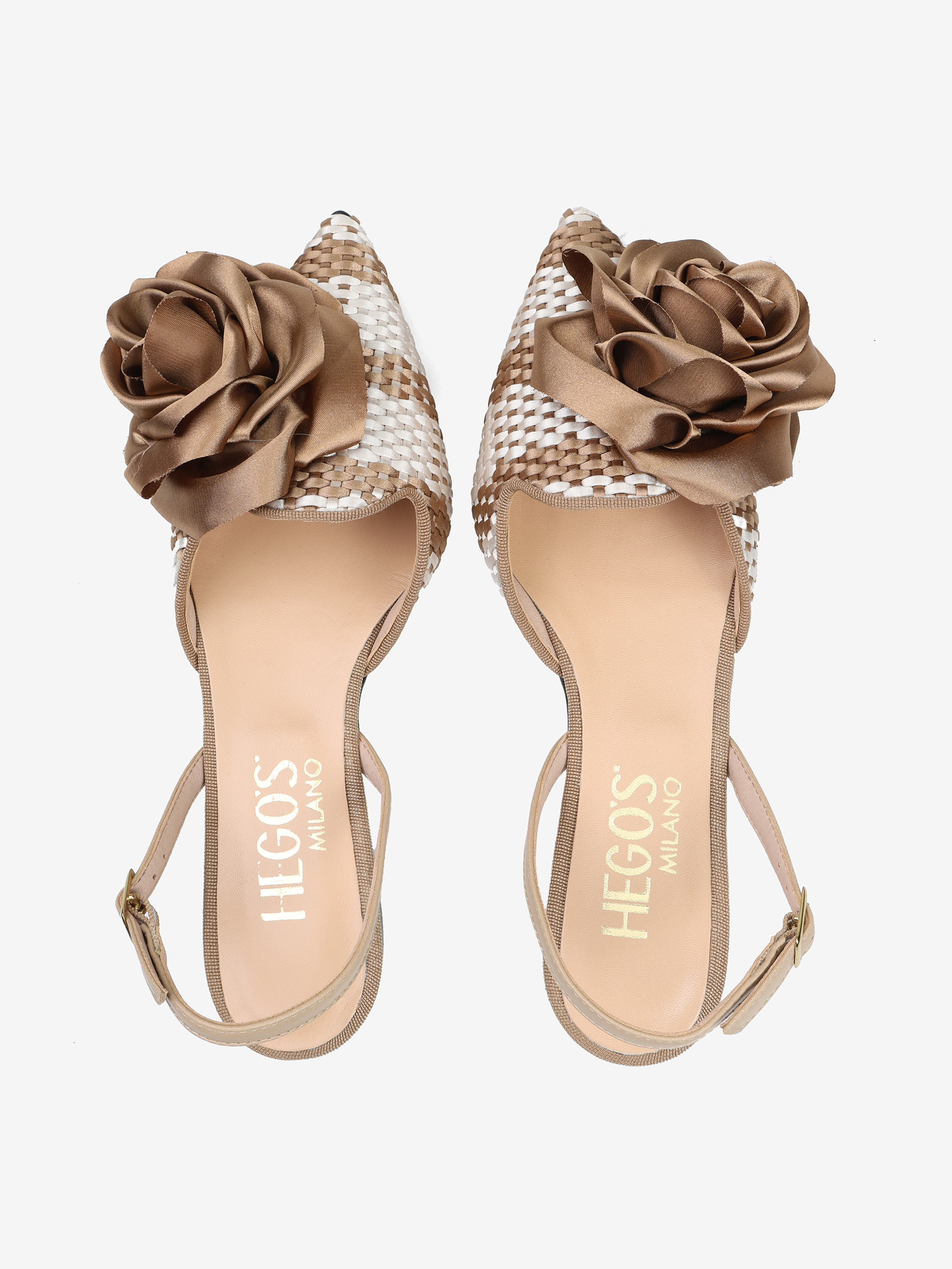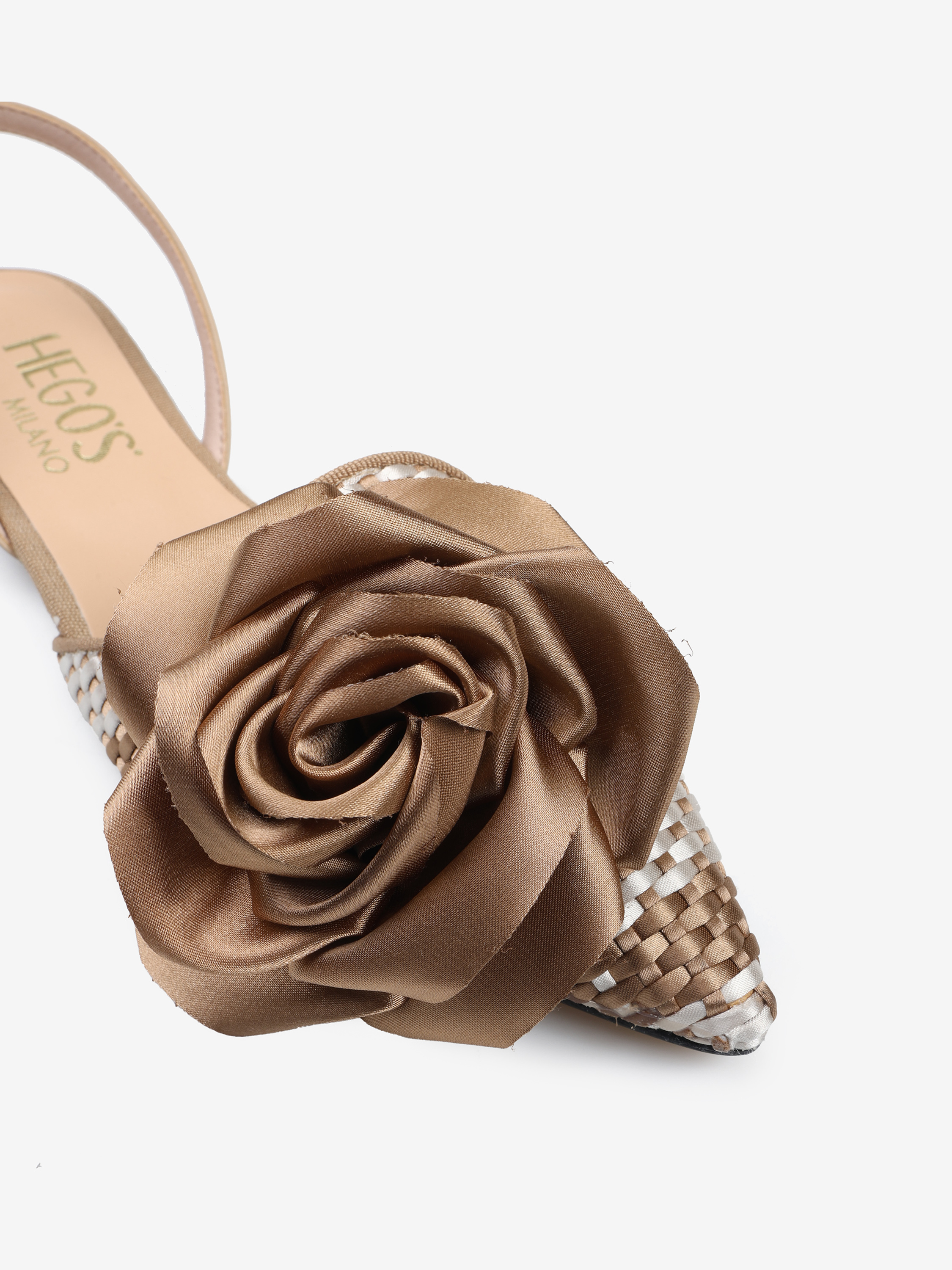Baleriny z noskiem w szpic z ozdobnym kwiatem. Pleciony materiał i odkryta pięta z regulowanym paskiem.