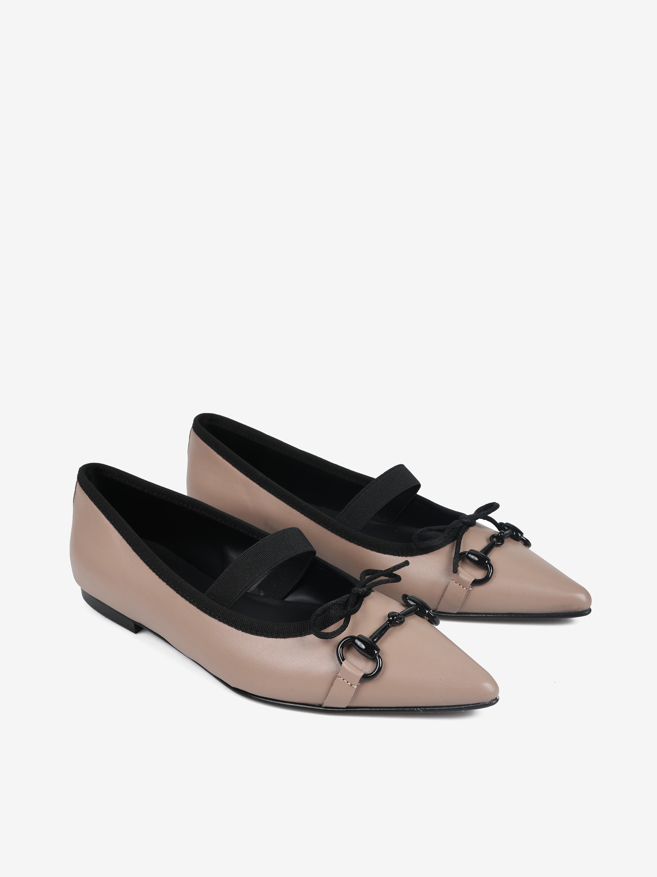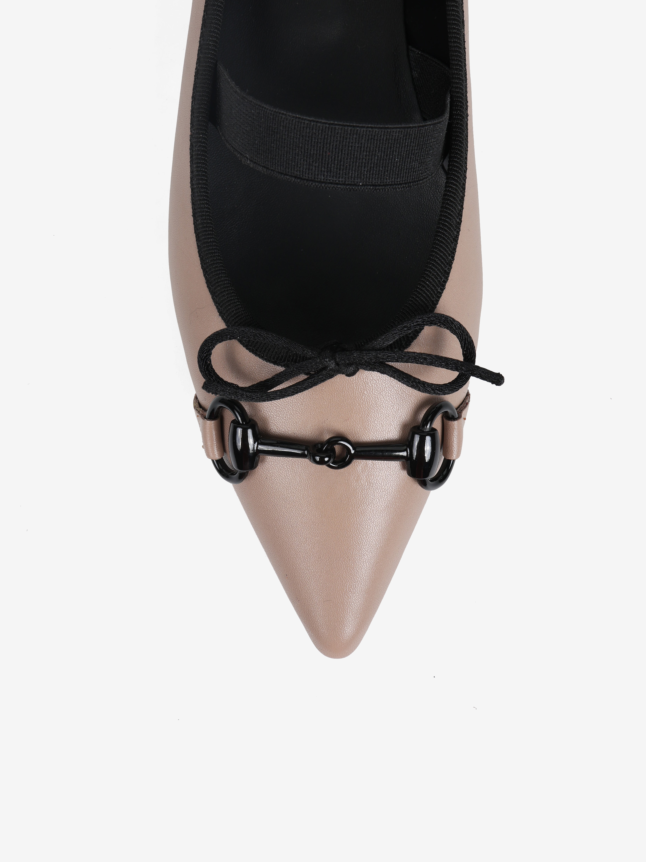 Baleriny z noskiem w szpic i ozdobnym wędzidłem wykonane z miękkiej, delikatnej skóry. Wiązana kokardka i gumka na podbiciu umożliwiają regulację dopasowania.