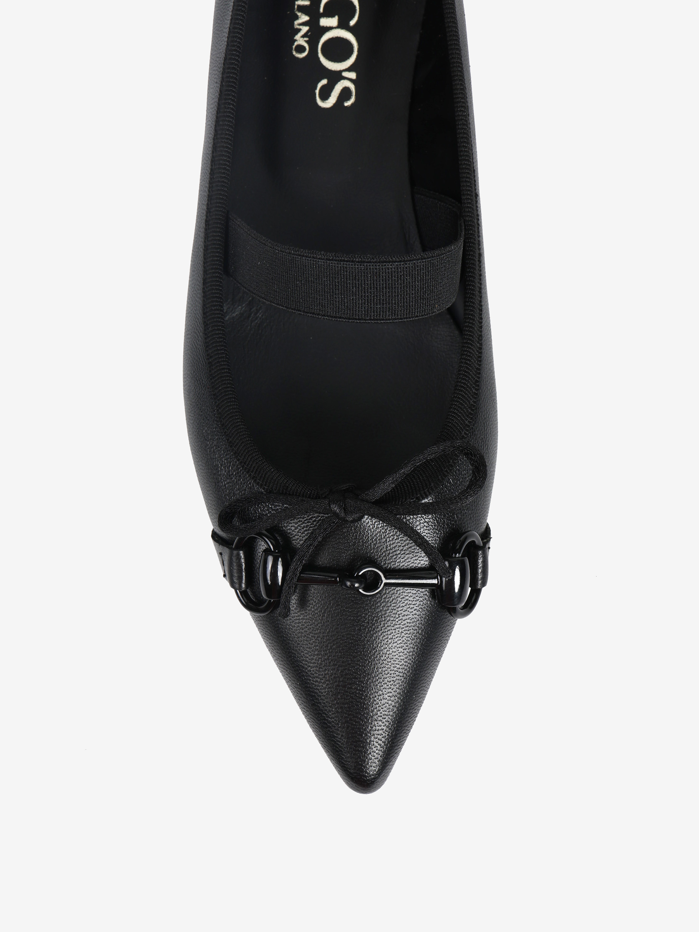 Baleriny z noskiem w szpic i ozdobnym wędzidłem wykonane z miękkiej, delikatnej skóry. Wiązana kokardka i gumka na podbiciu umożliwiają regulację dopasowania.