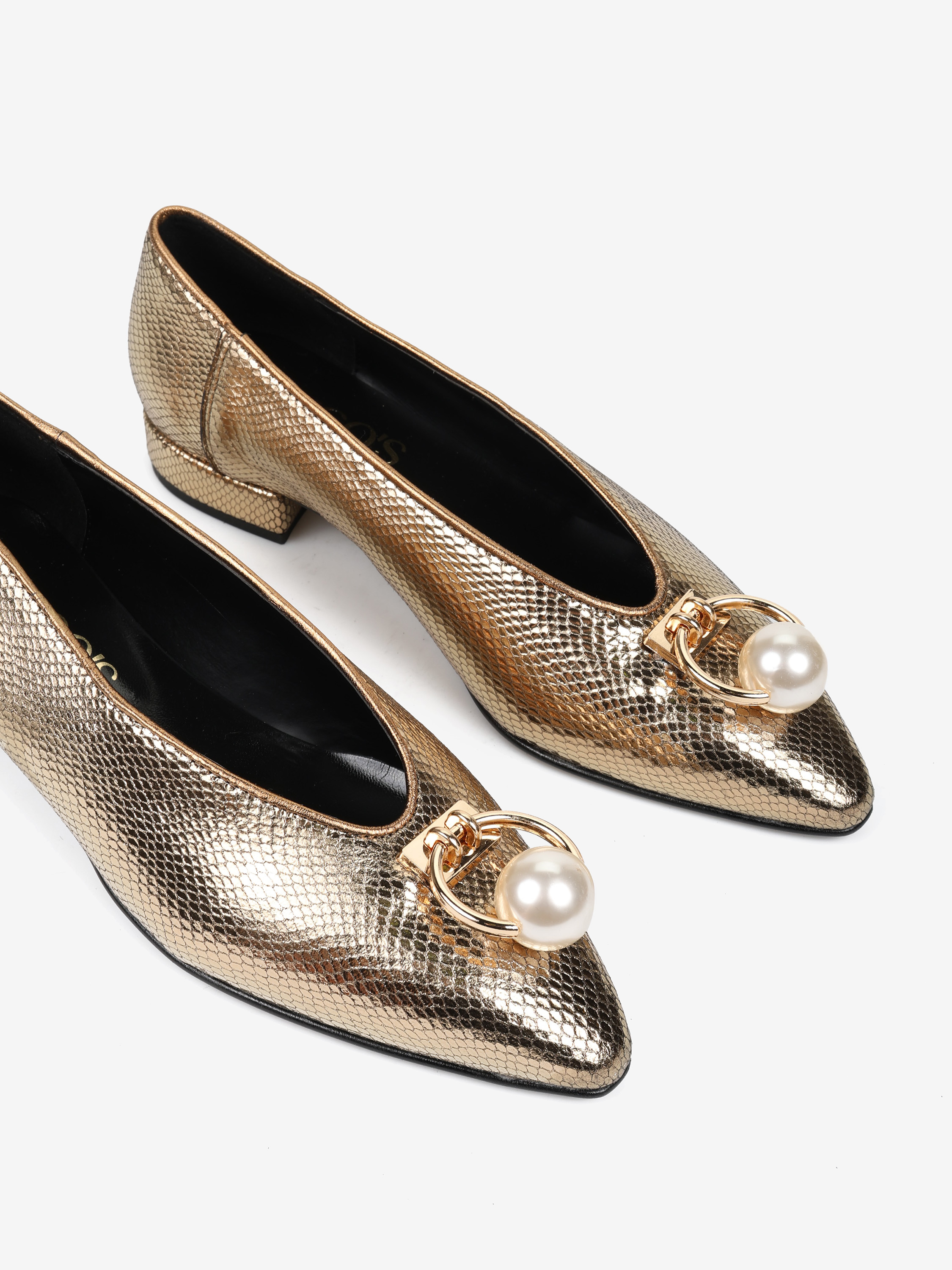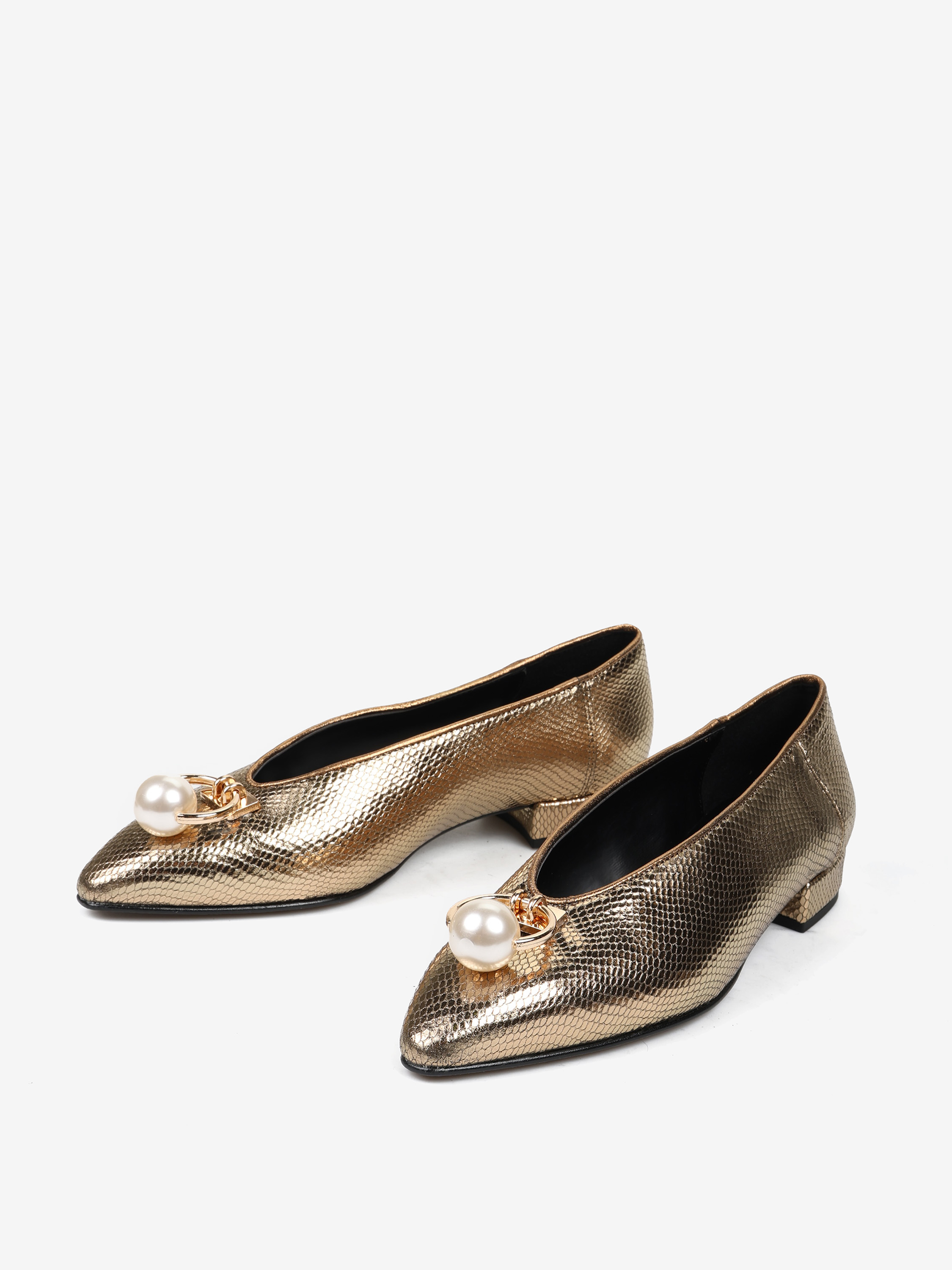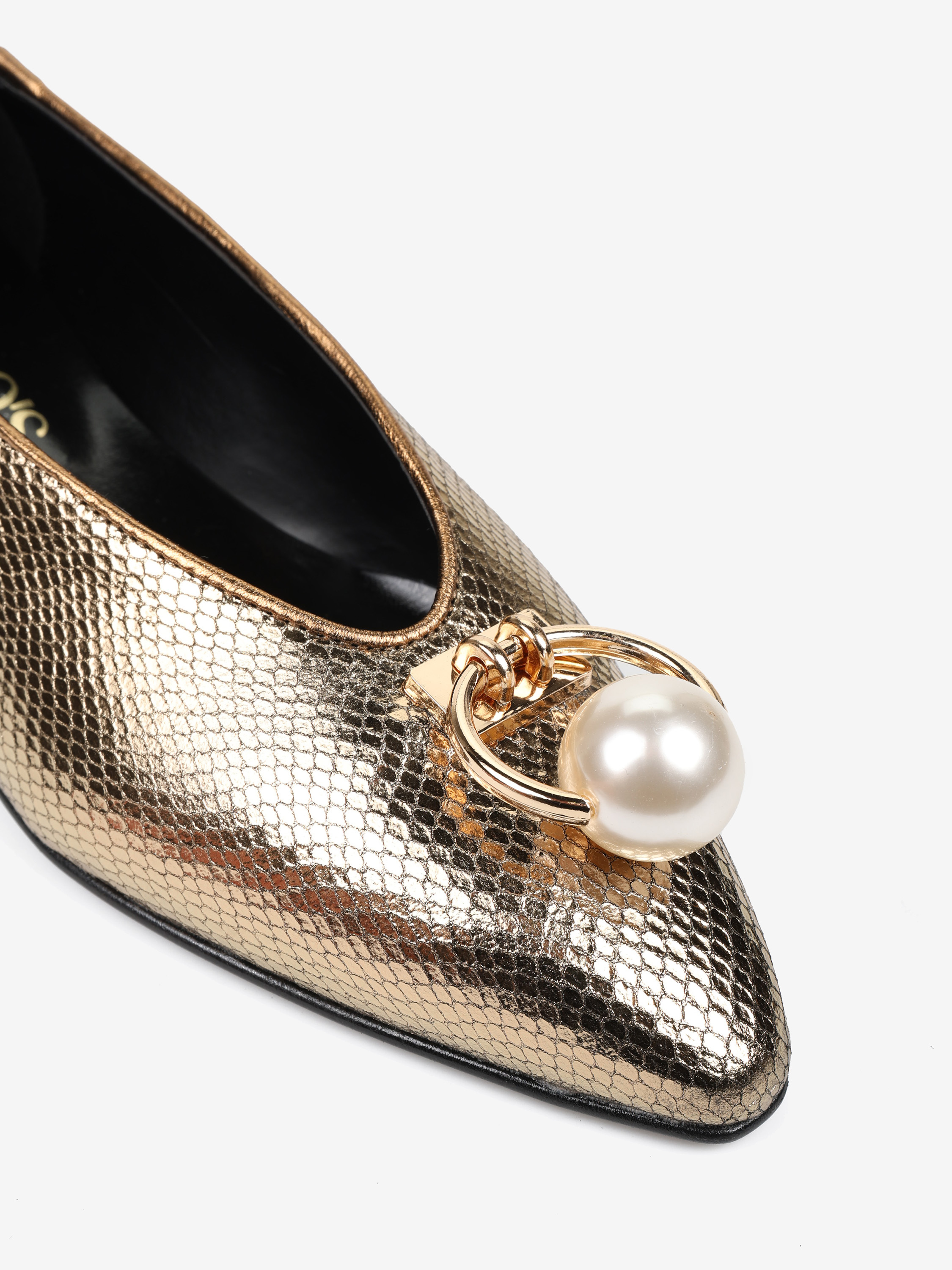 Baleriny z noskami w szpic, wykonane z metalizowanej skóry tłoczonej w łuskę węża. Niski obcas i biżuteryjna aplikacja z perłą.