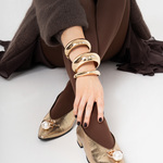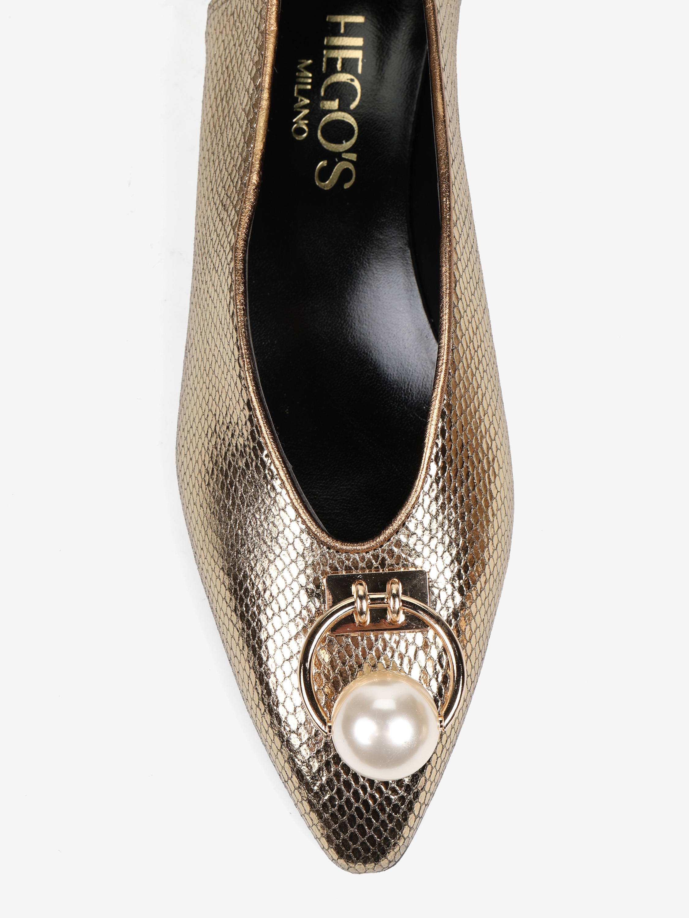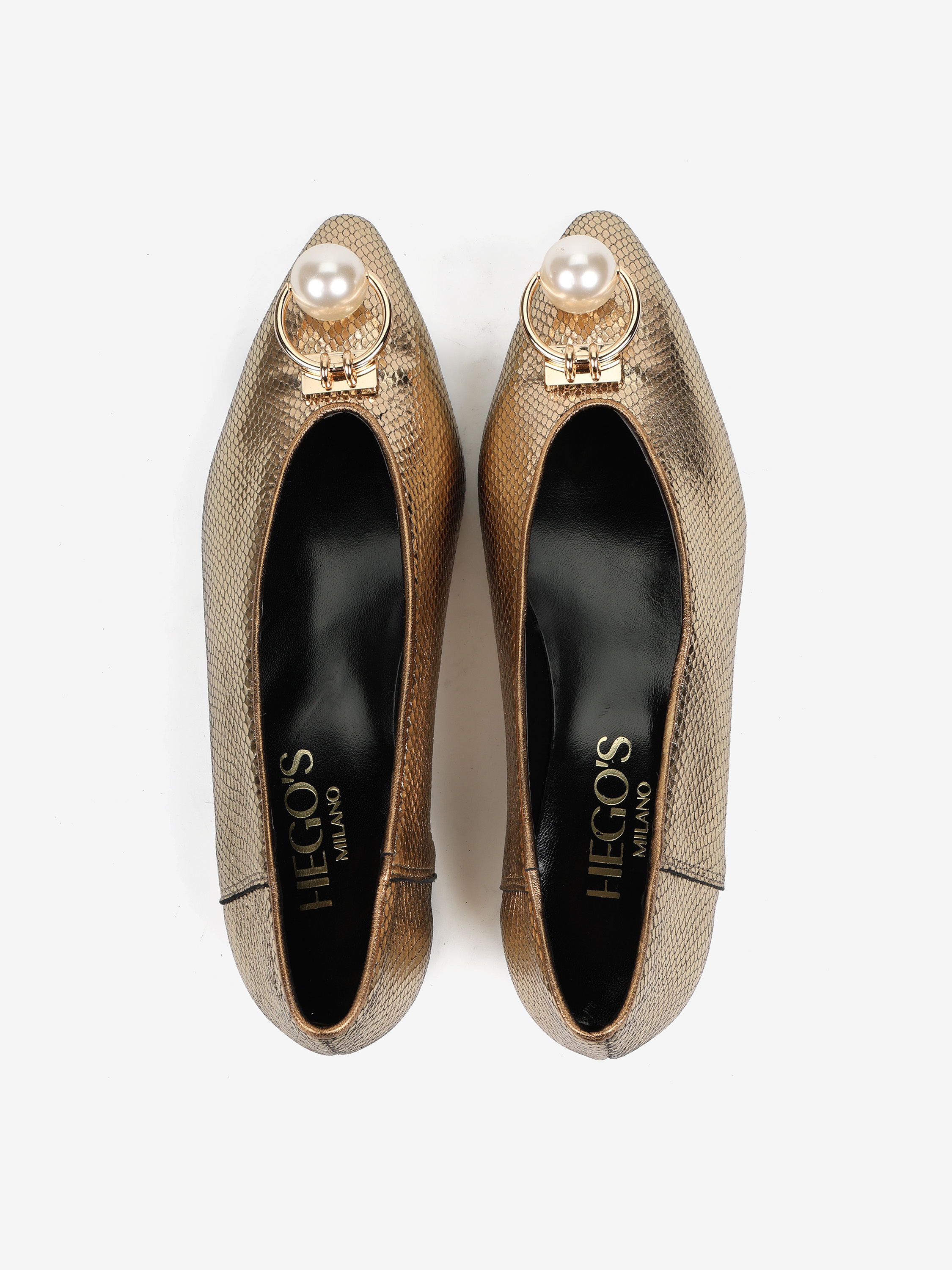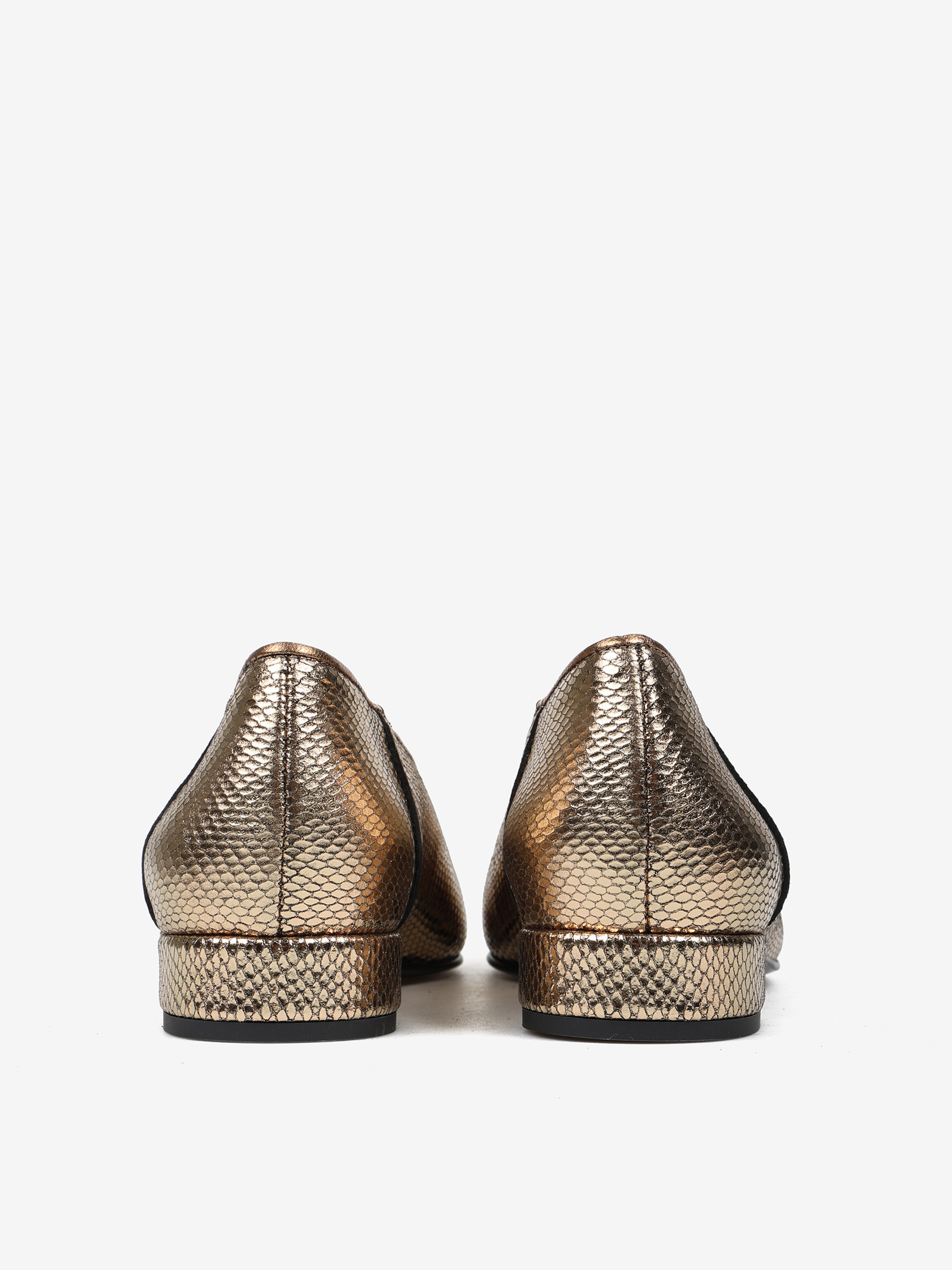 Baleriny z noskami w szpic, wykonane z metalizowanej skóry tłoczonej w łuskę węża. Niski obcas i biżuteryjna aplikacja z perłą.
