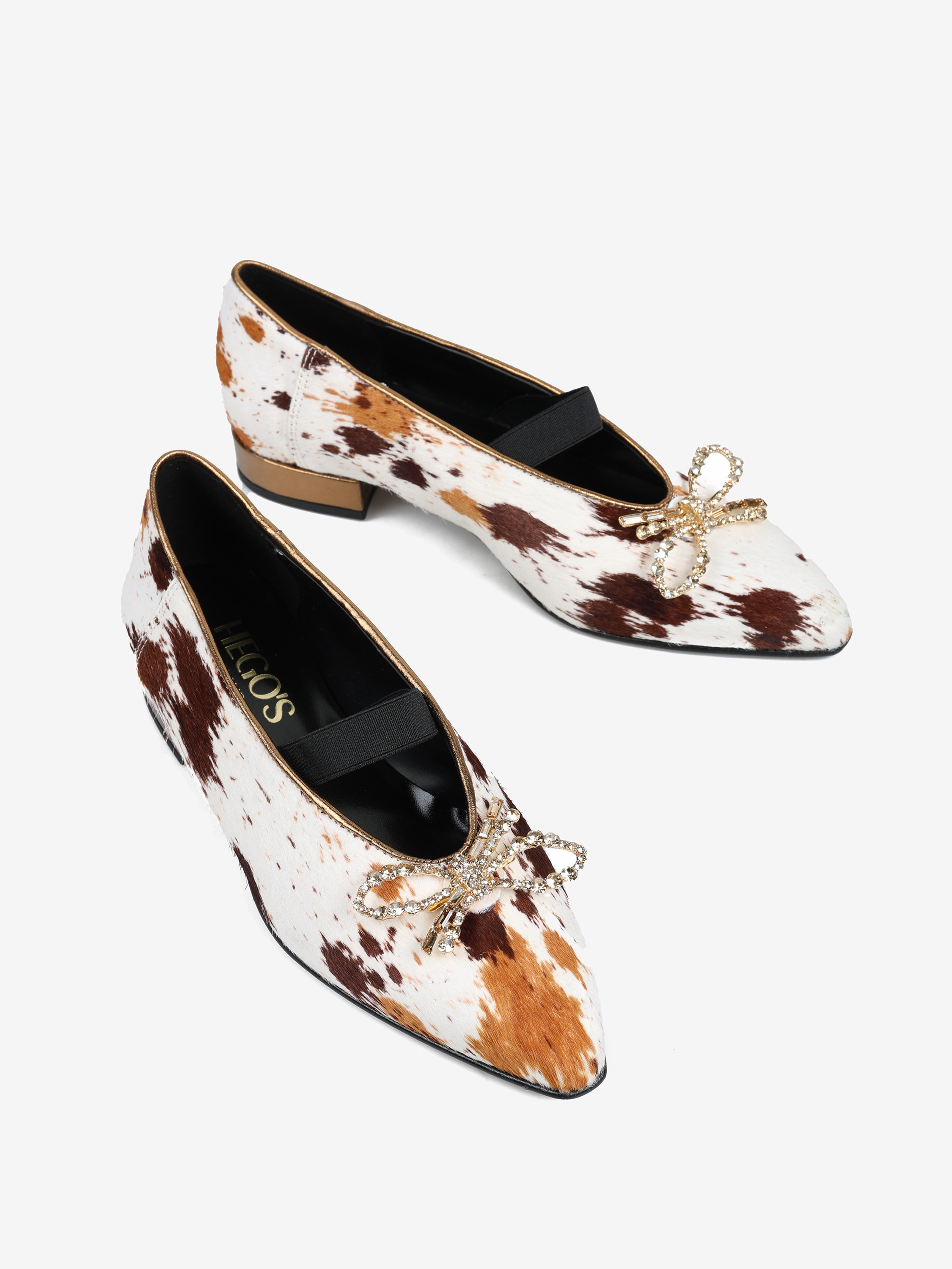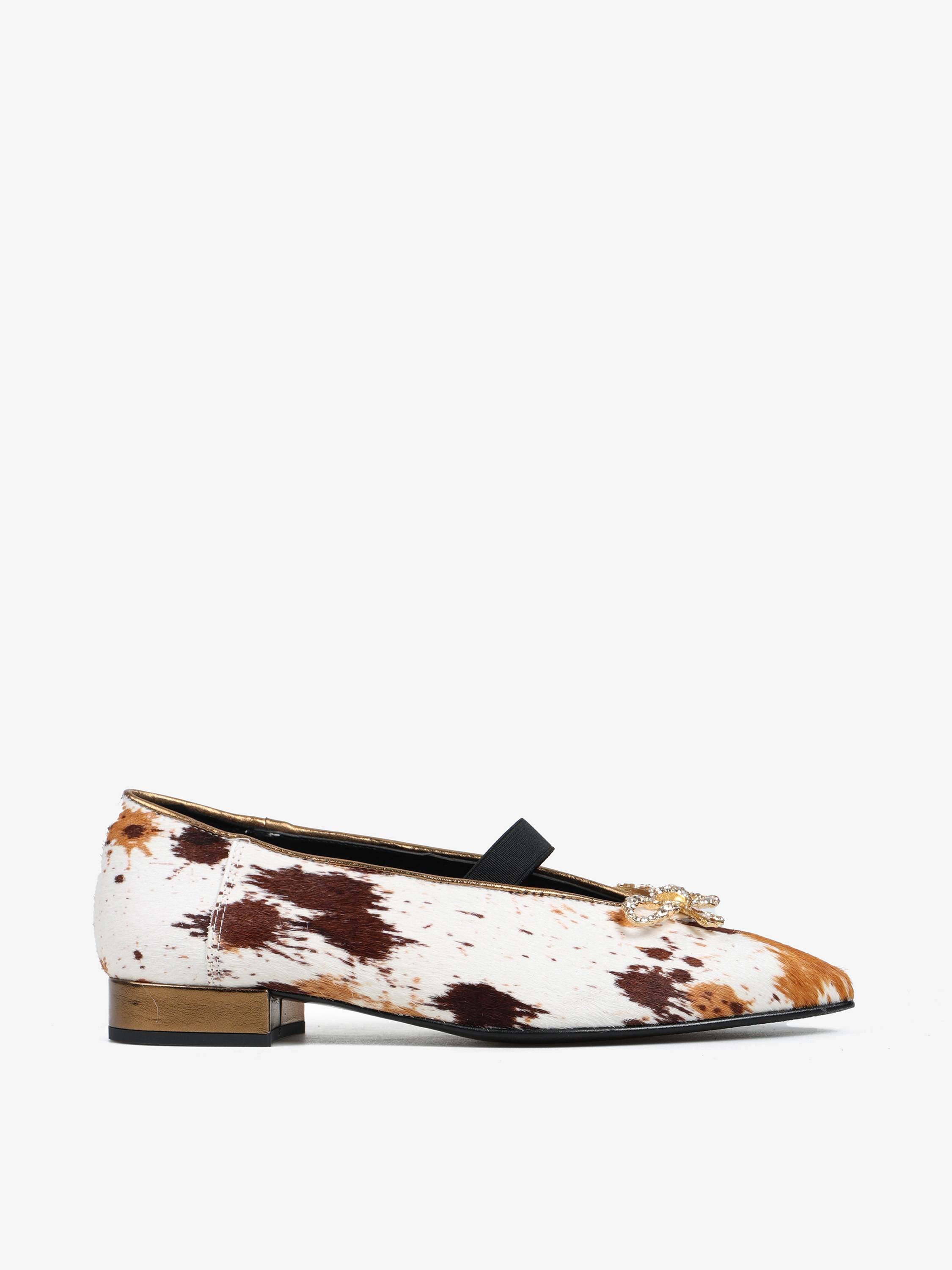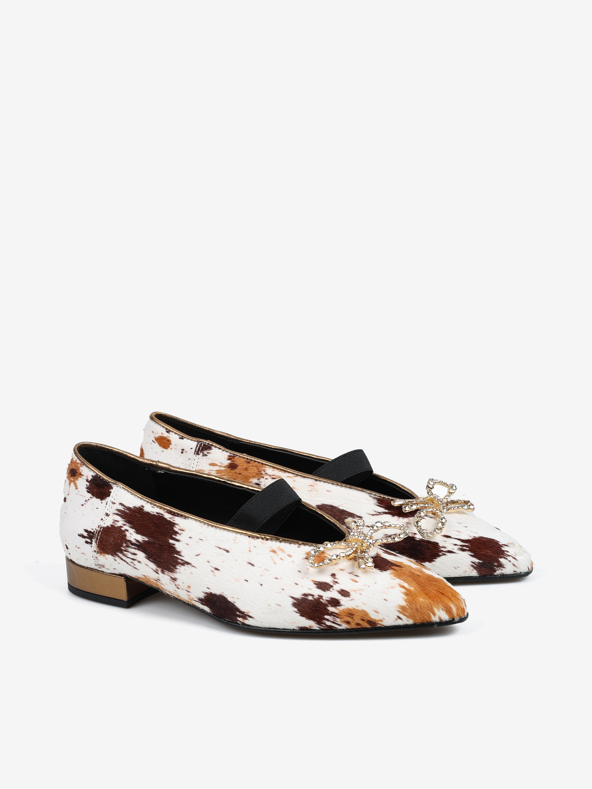 Baleriny z noskiem w szpic i gumką na podbiciu, wykonane z naturalnej skóry z włosiem. Wykończone ozdobną, biżuteryjną kokardą.