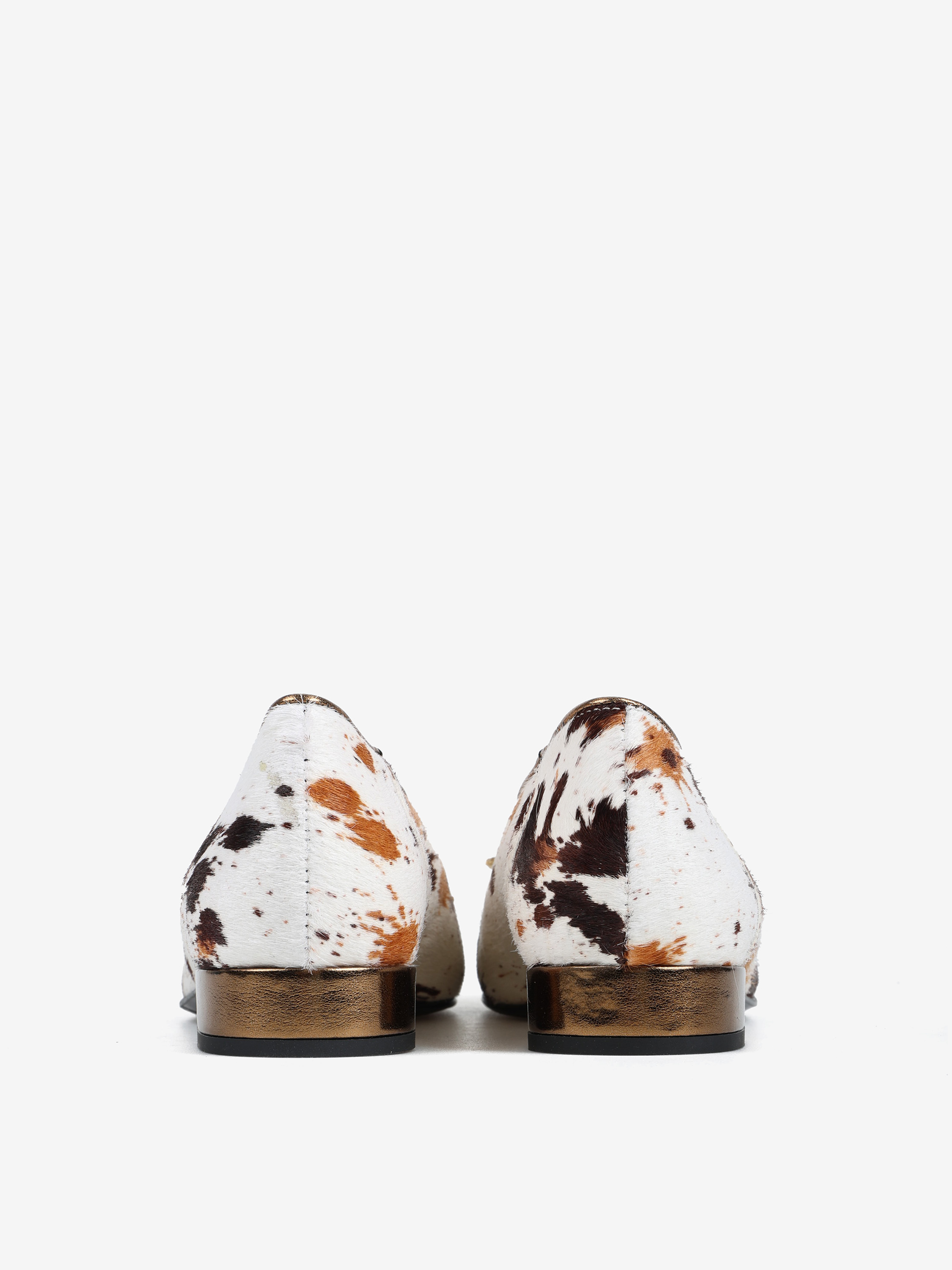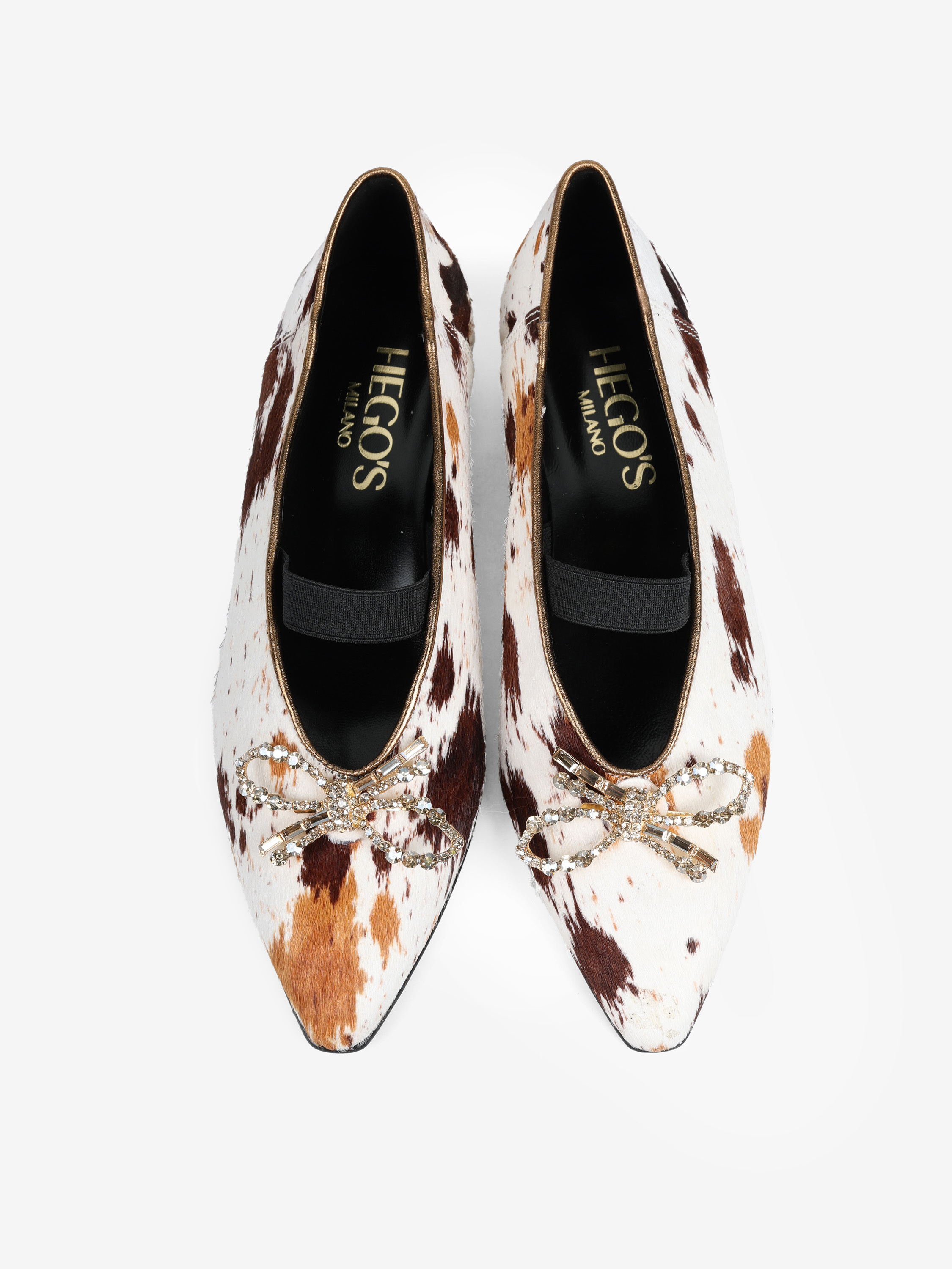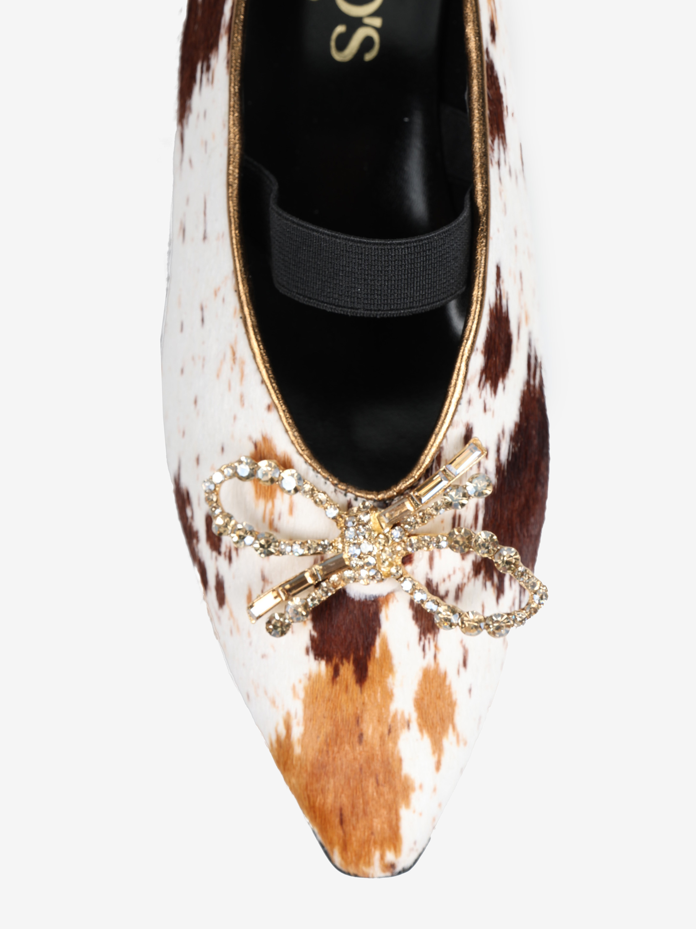 Baleriny z noskiem w szpic i gumką na podbiciu, wykonane z naturalnej skóry z włosiem. Wykończone ozdobną, biżuteryjną kokardą.