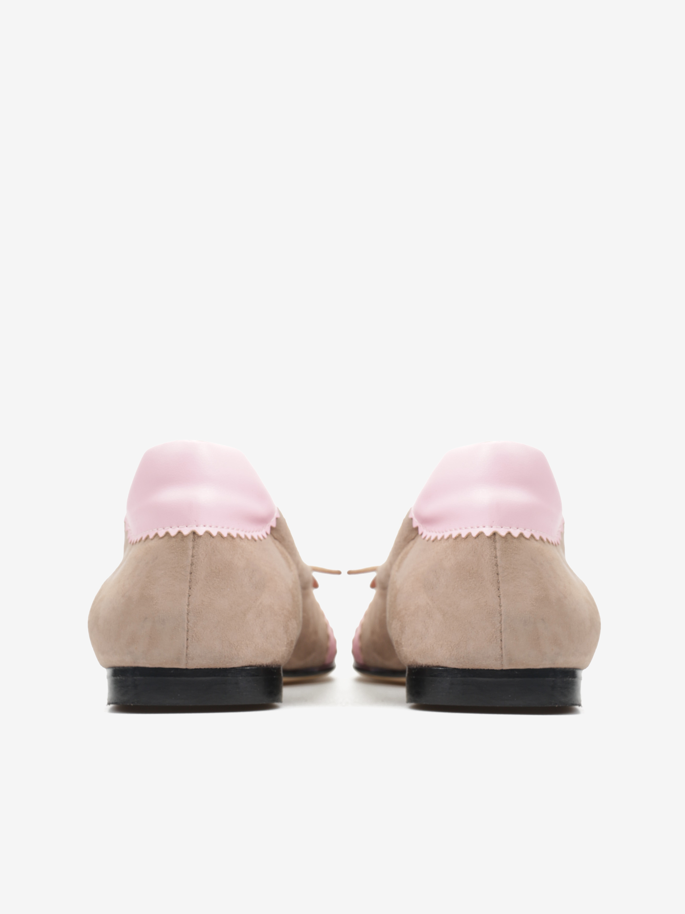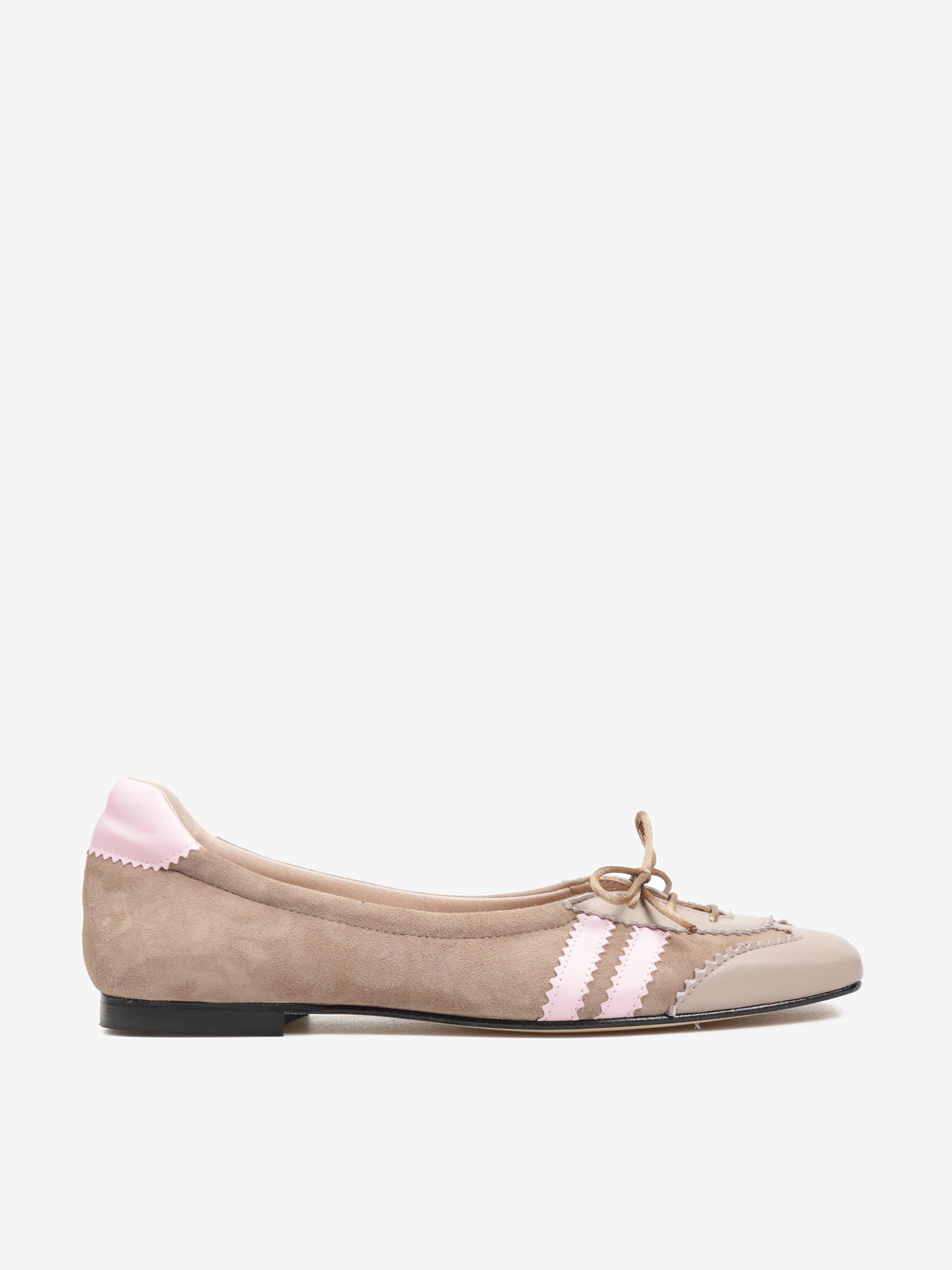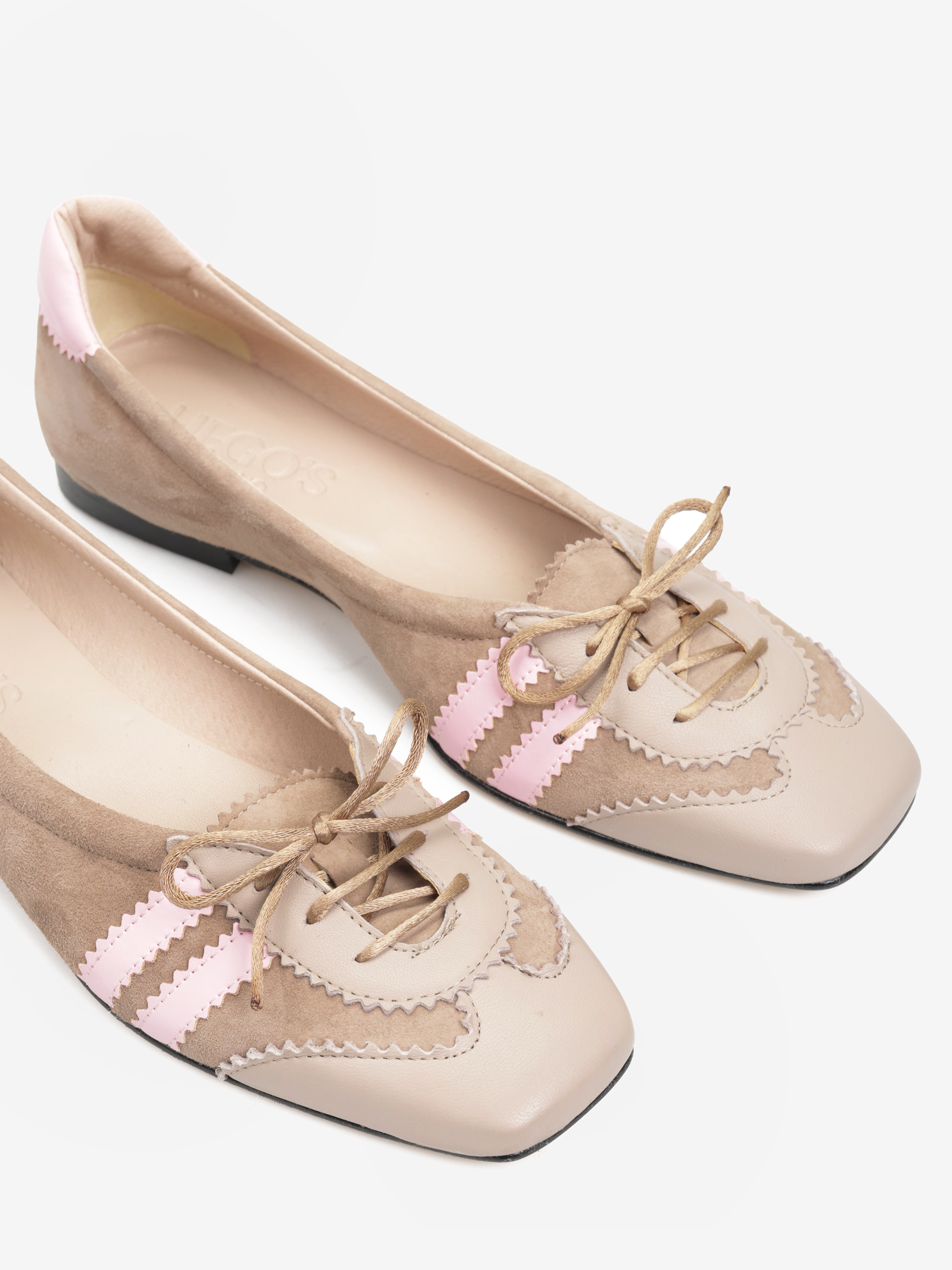 Beżowe baleriny w sportowym stylu z kwadratowymi noskami i pudroworóżowymi detalami. Wykonane z miękkiej i delikatnej skóry. Wiązanie na nosku pozwala na idealne dopasowanie buta do stopy.