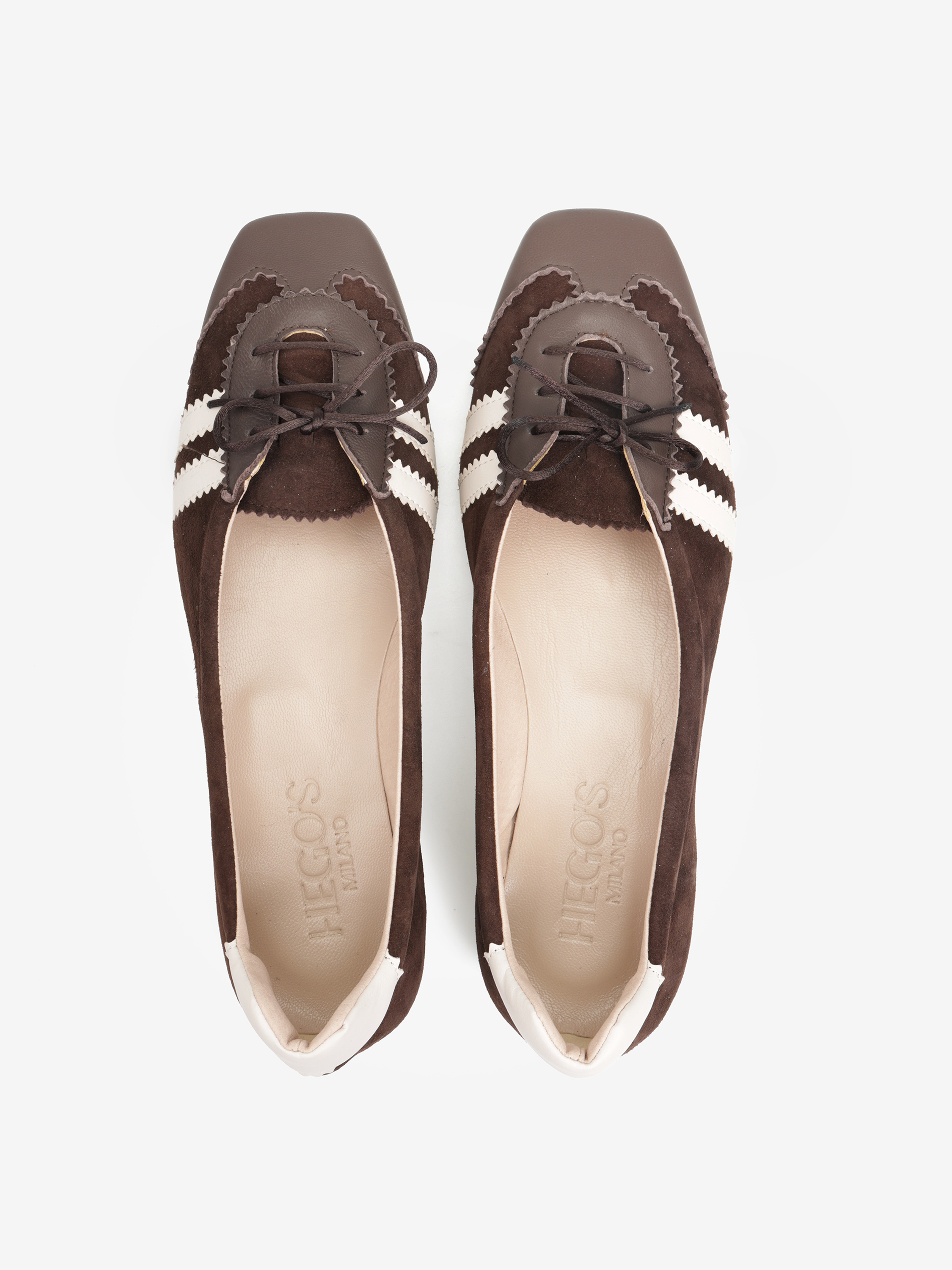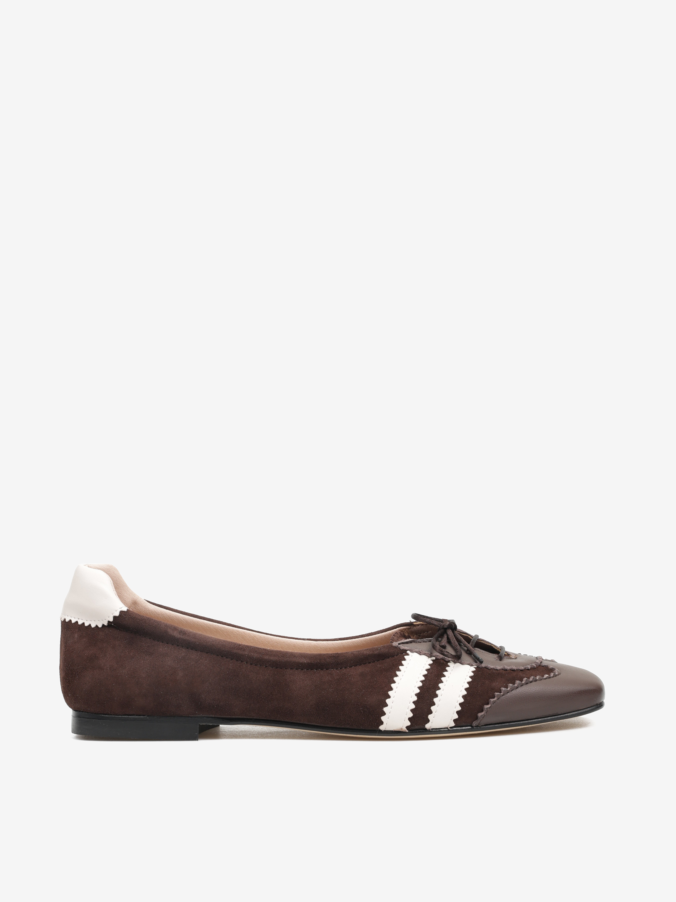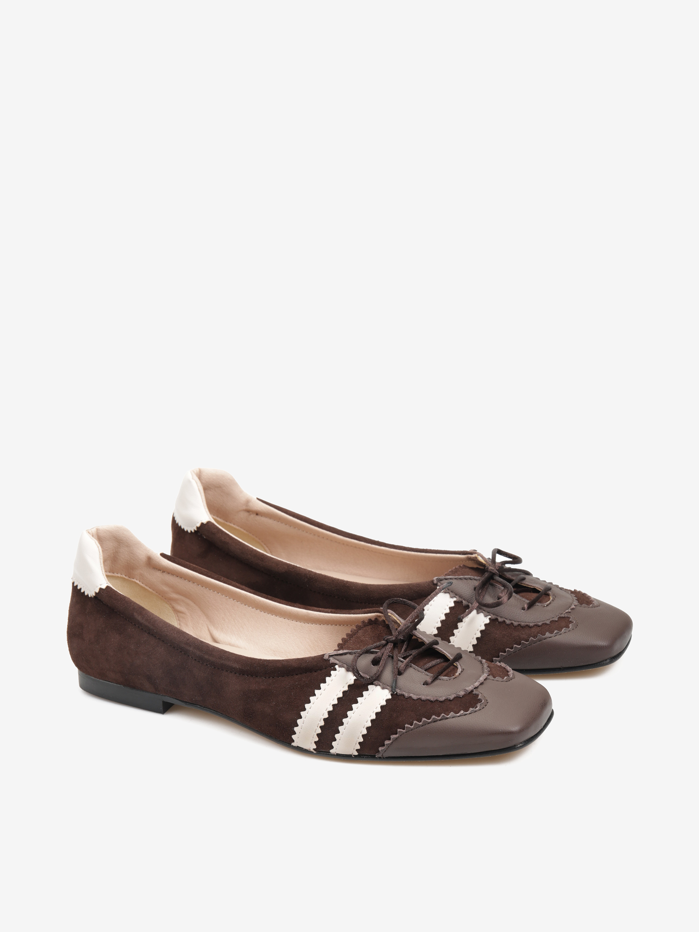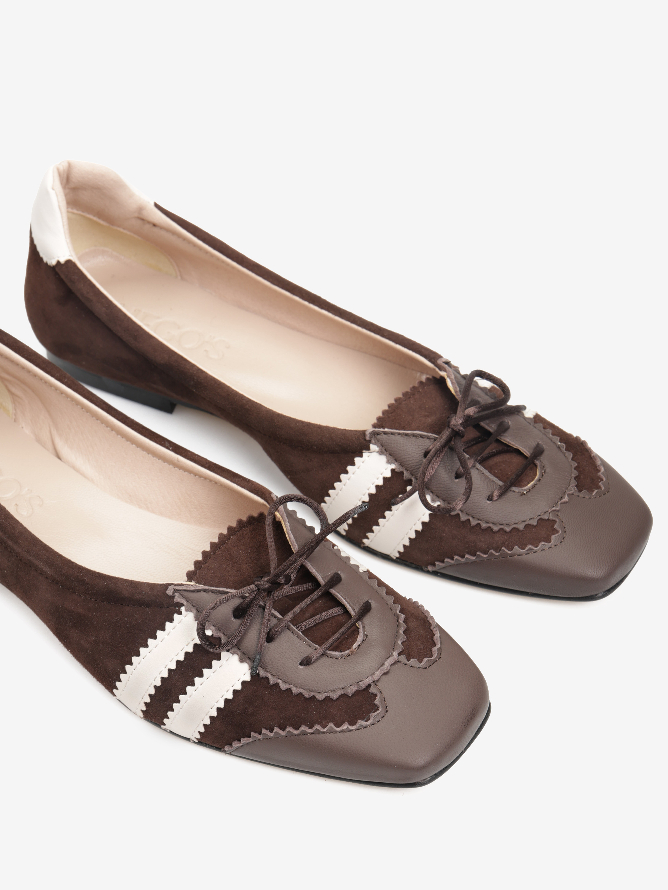 Czekoladowobrązowe baleriny w sportowym stylu z kwadratowymi noskami i kremowymi detalami. Wykonane z miękkiej i delikatnej skóry. Wiązanie na nosku pozwala na idealne dopasowanie buta do stopy.