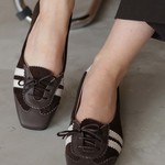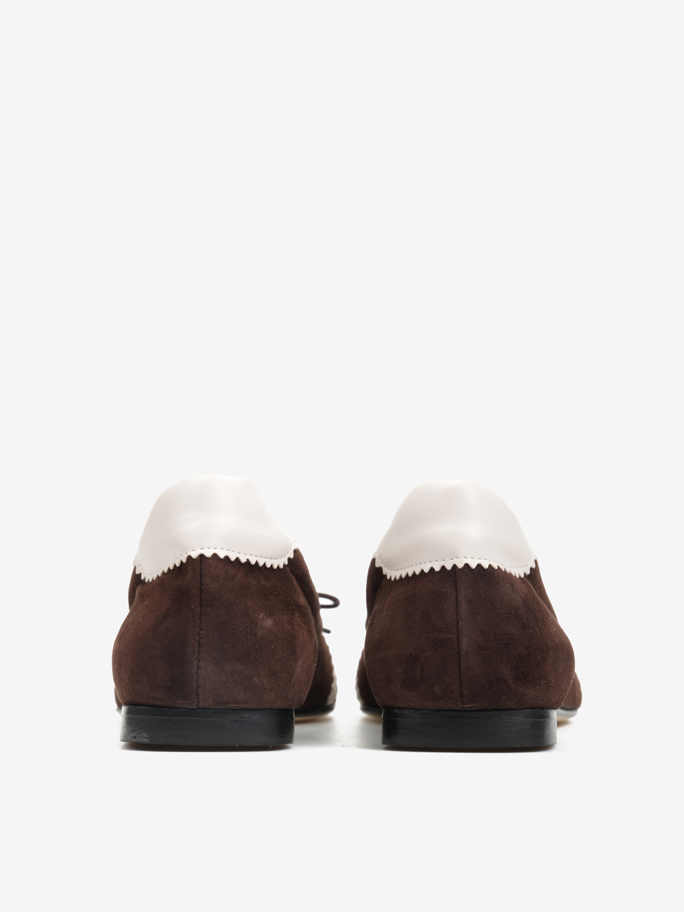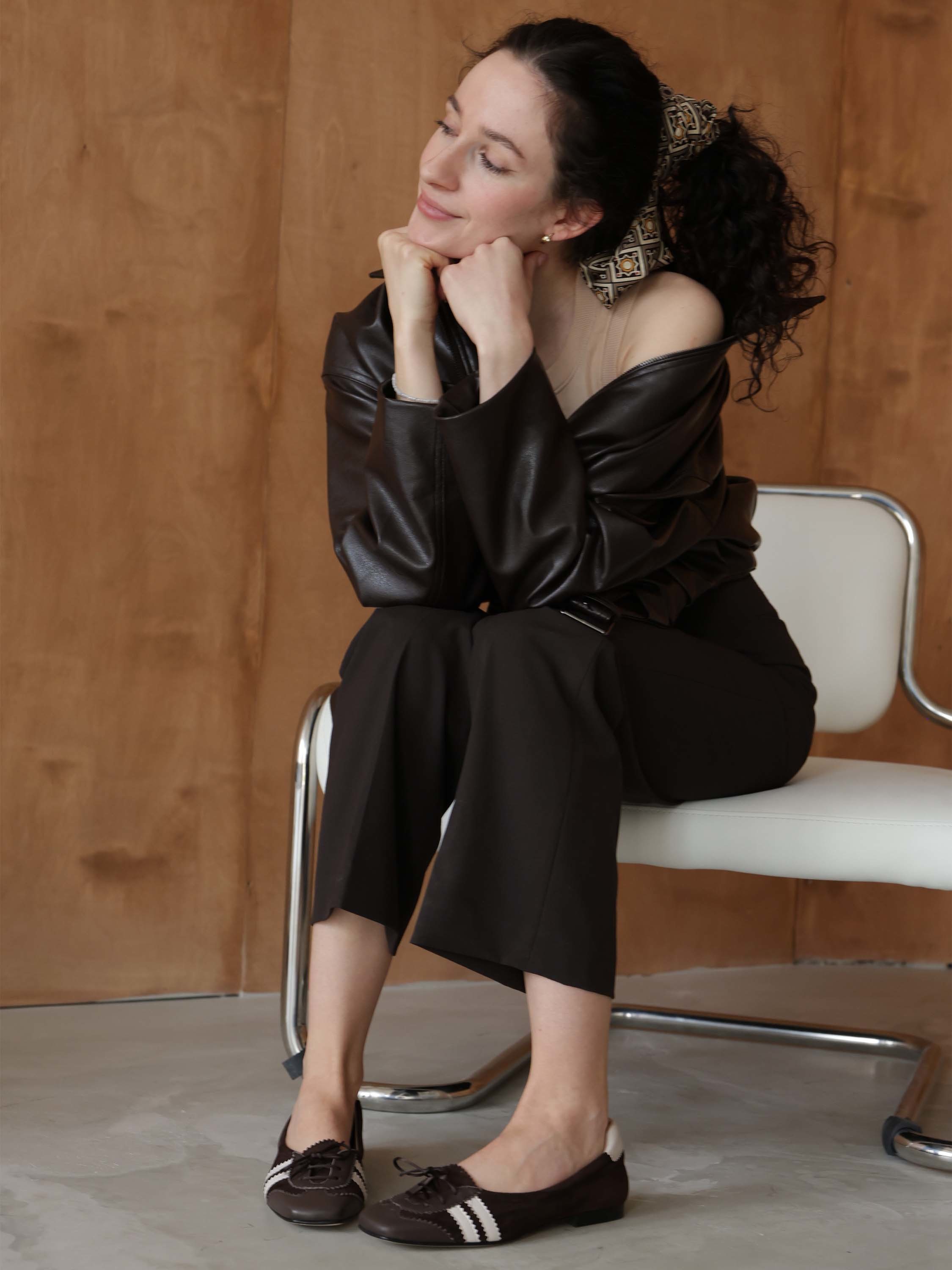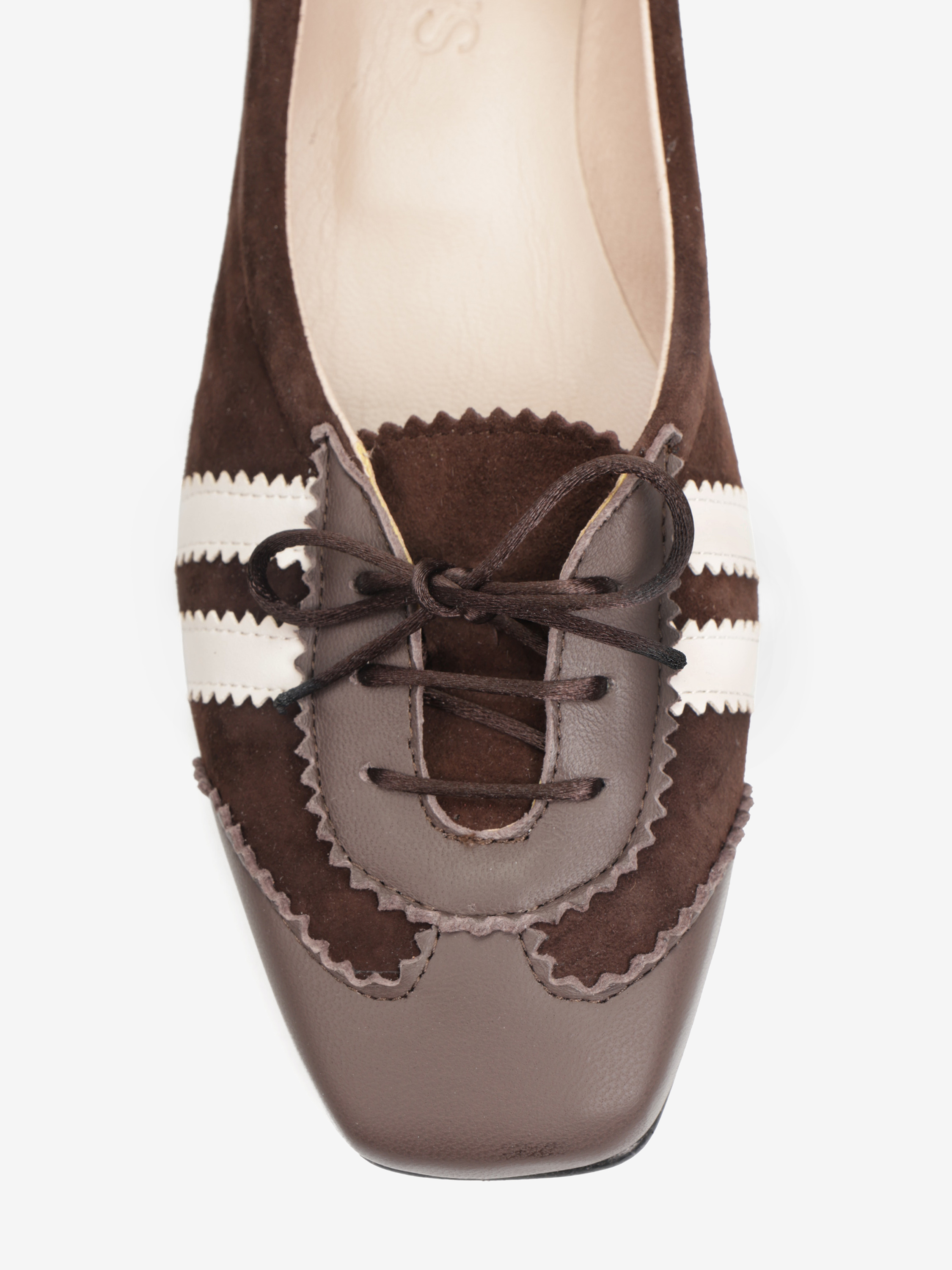 Czekoladowobrązowe baleriny w sportowym stylu z kwadratowymi noskami i kremowymi detalami. Wykonane z miękkiej i delikatnej skóry. Wiązanie na nosku pozwala na idealne dopasowanie buta do stopy.
