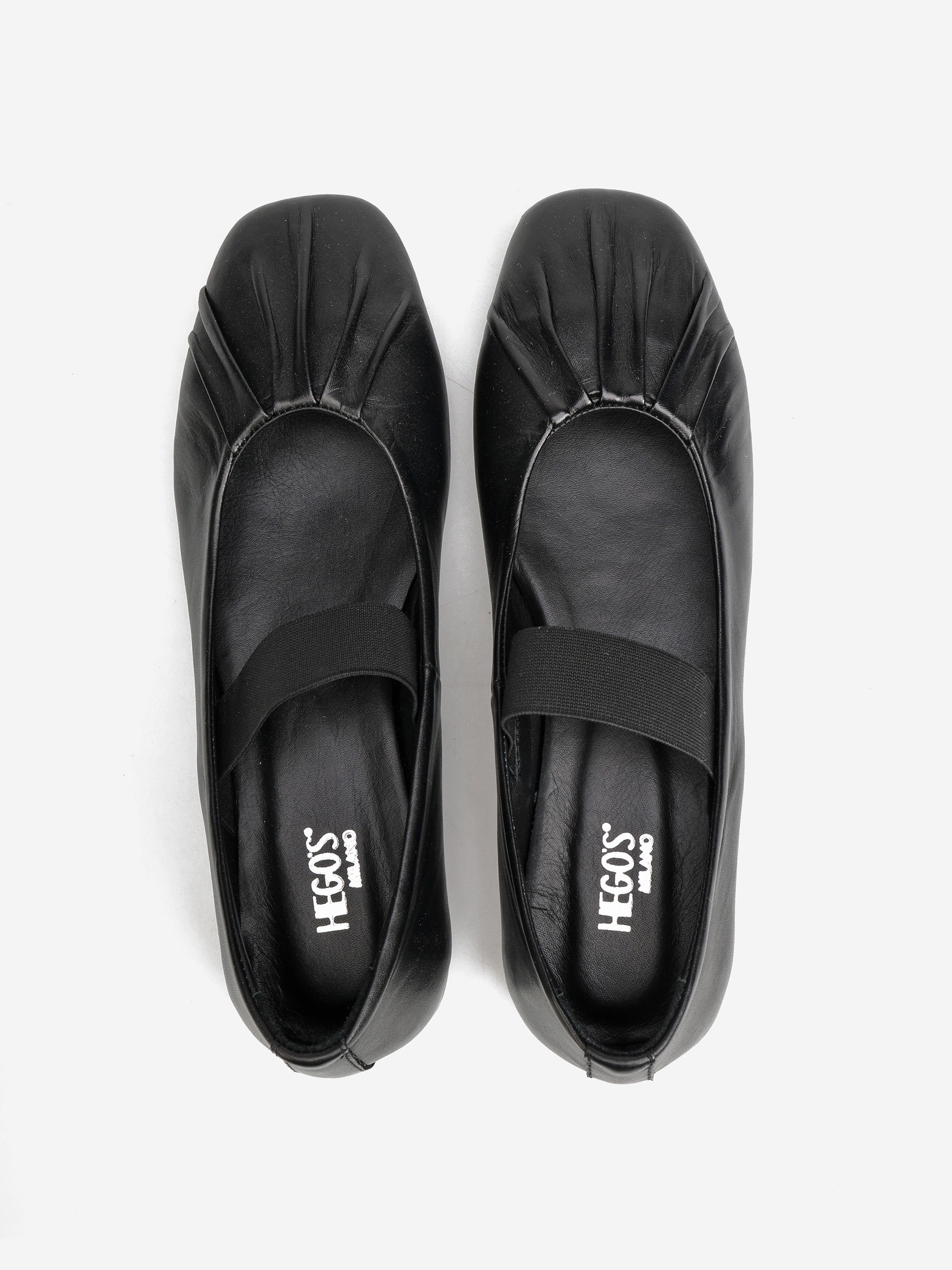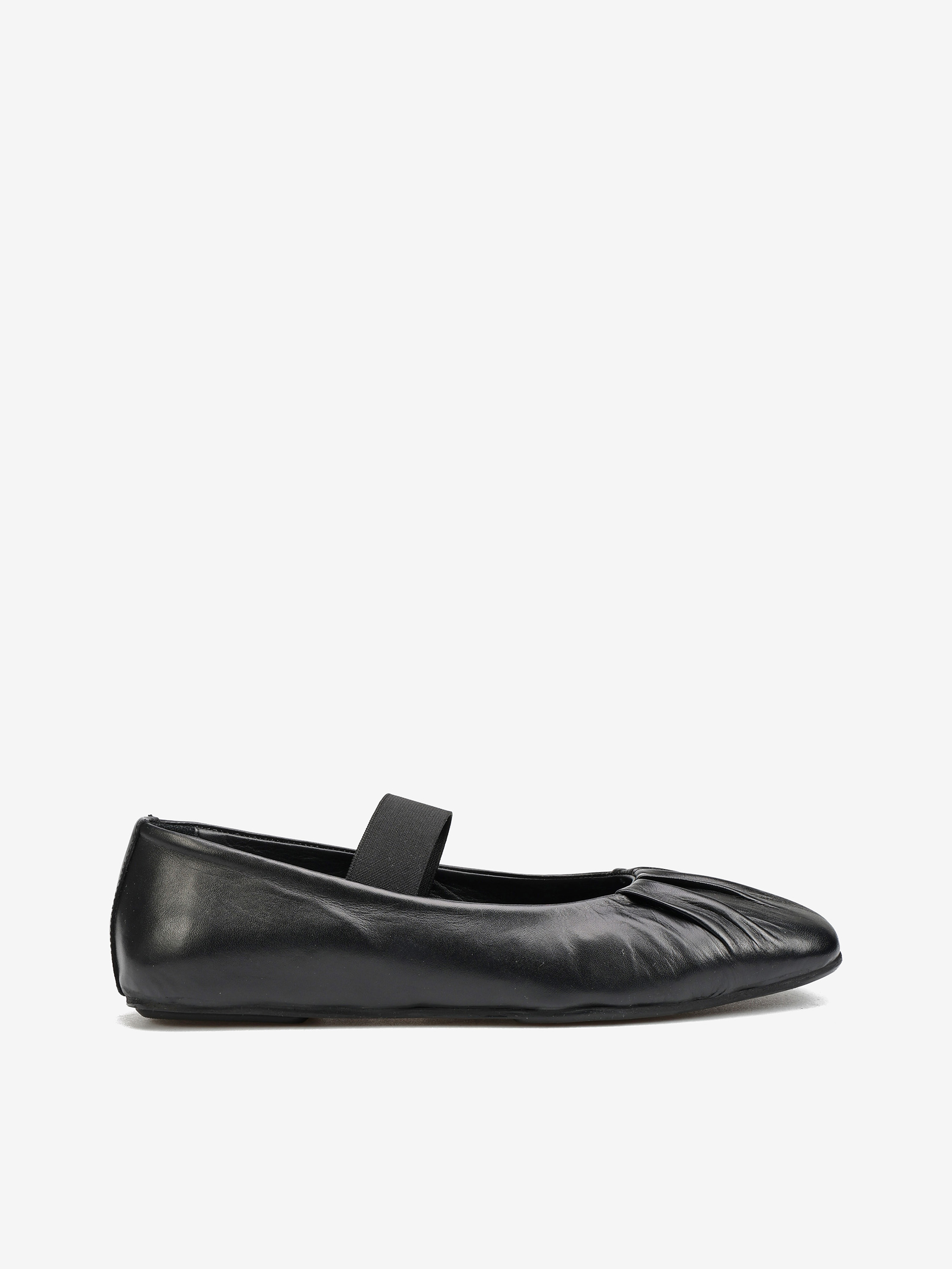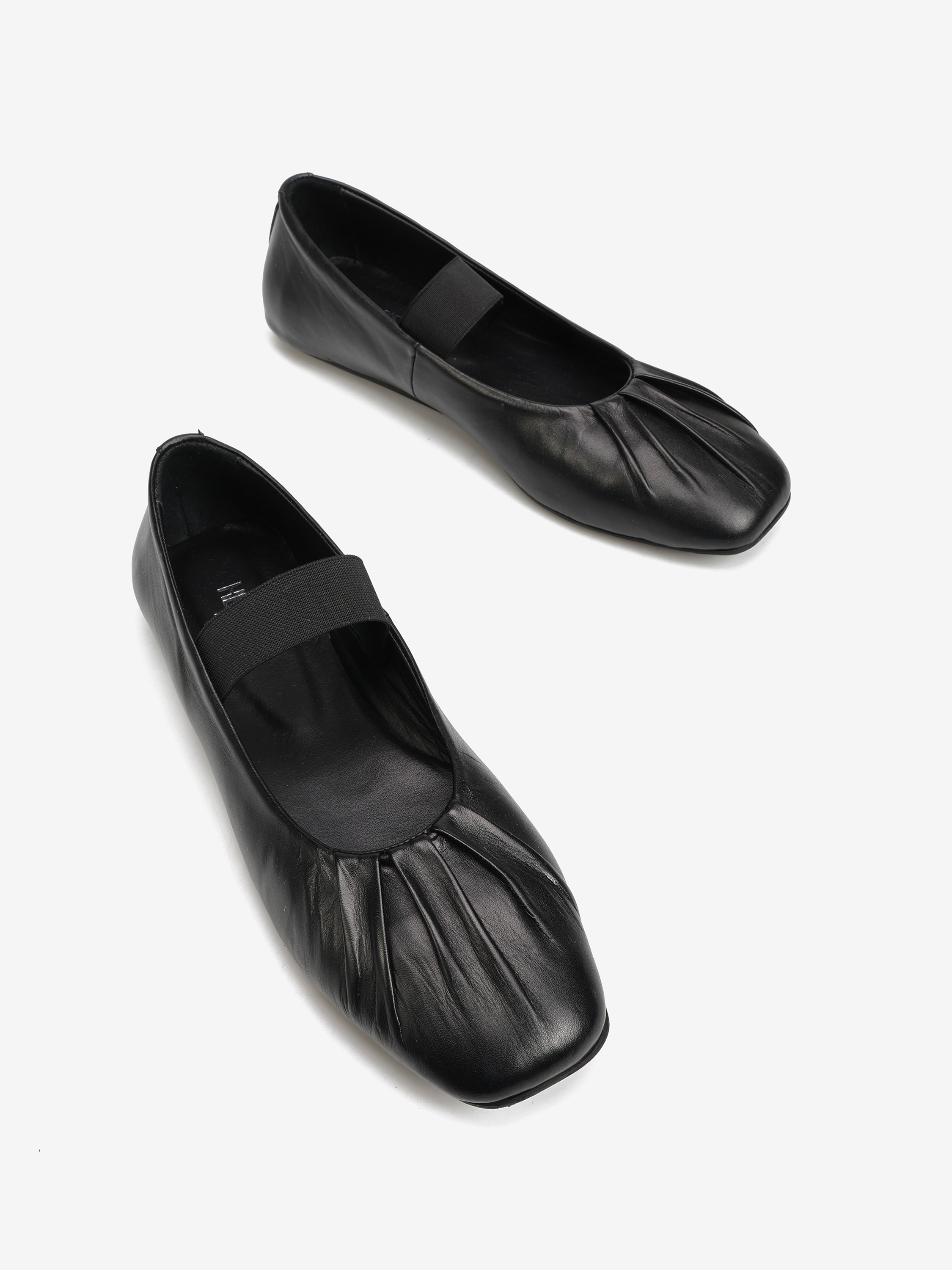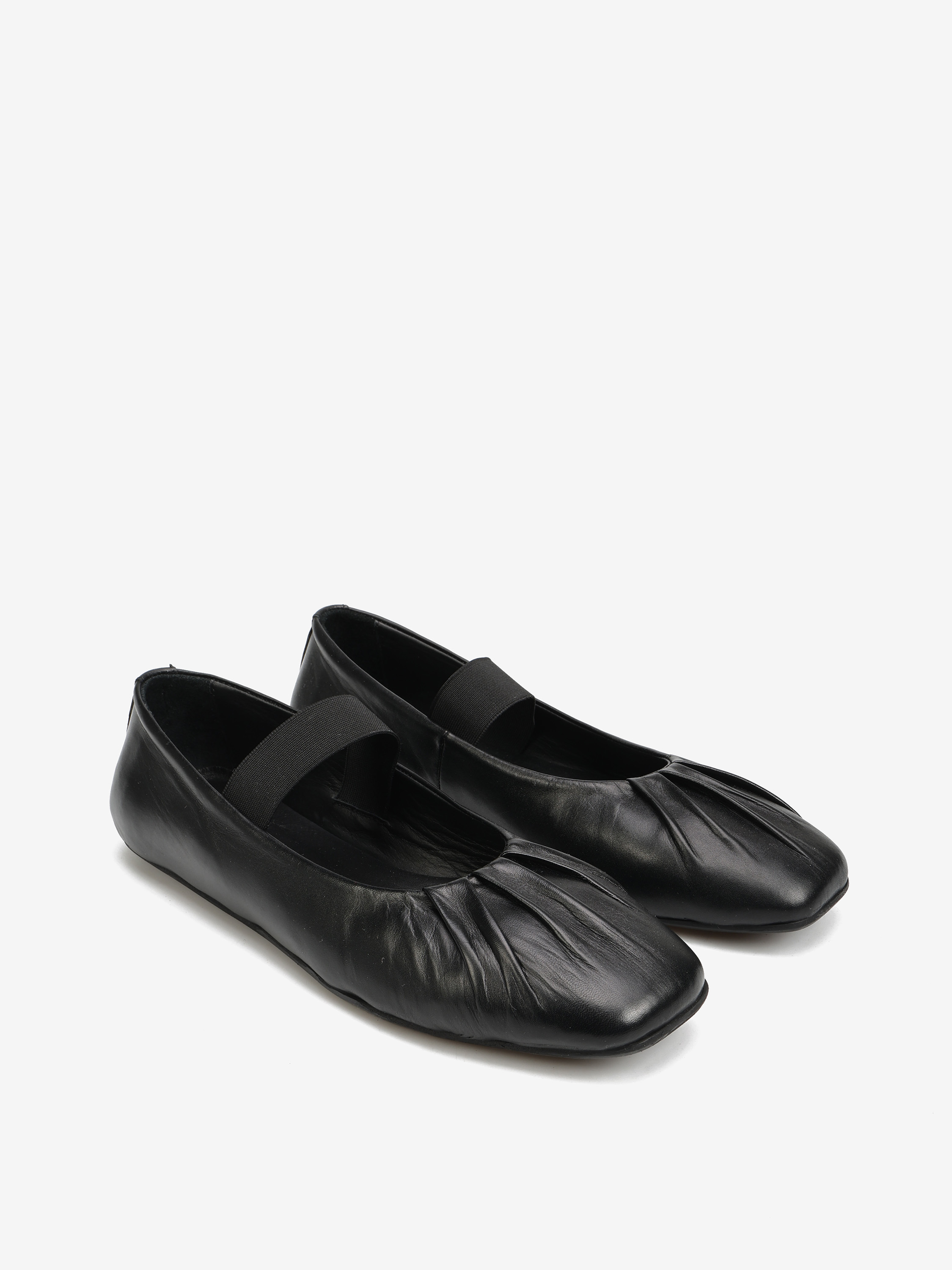 Baleriny z kwadratowym noskiem wykonane z miękkiej, delikatnej skóry. Ozdobne marszczenie i pasek na podbiciu.