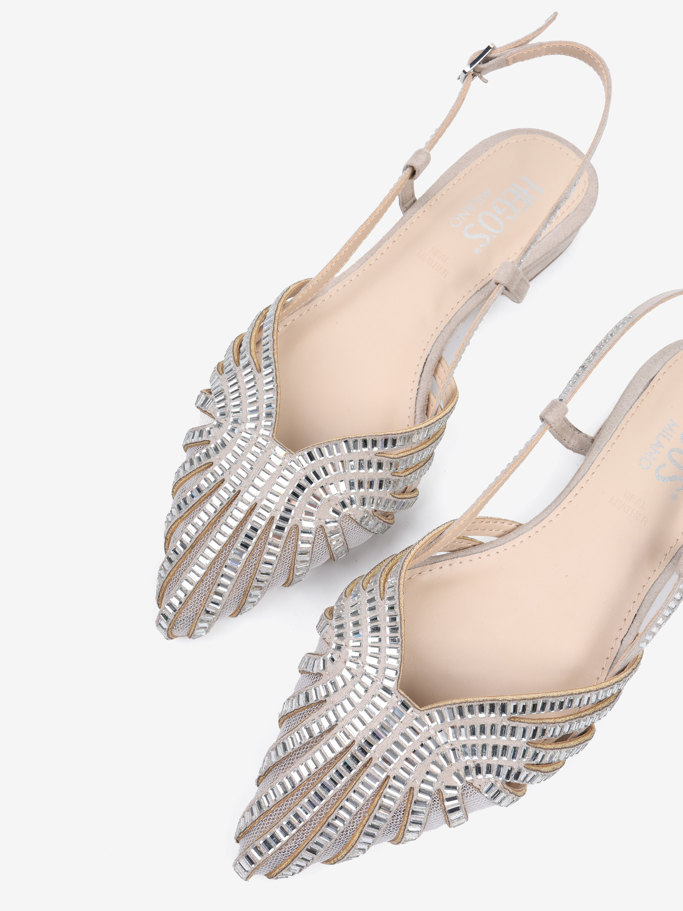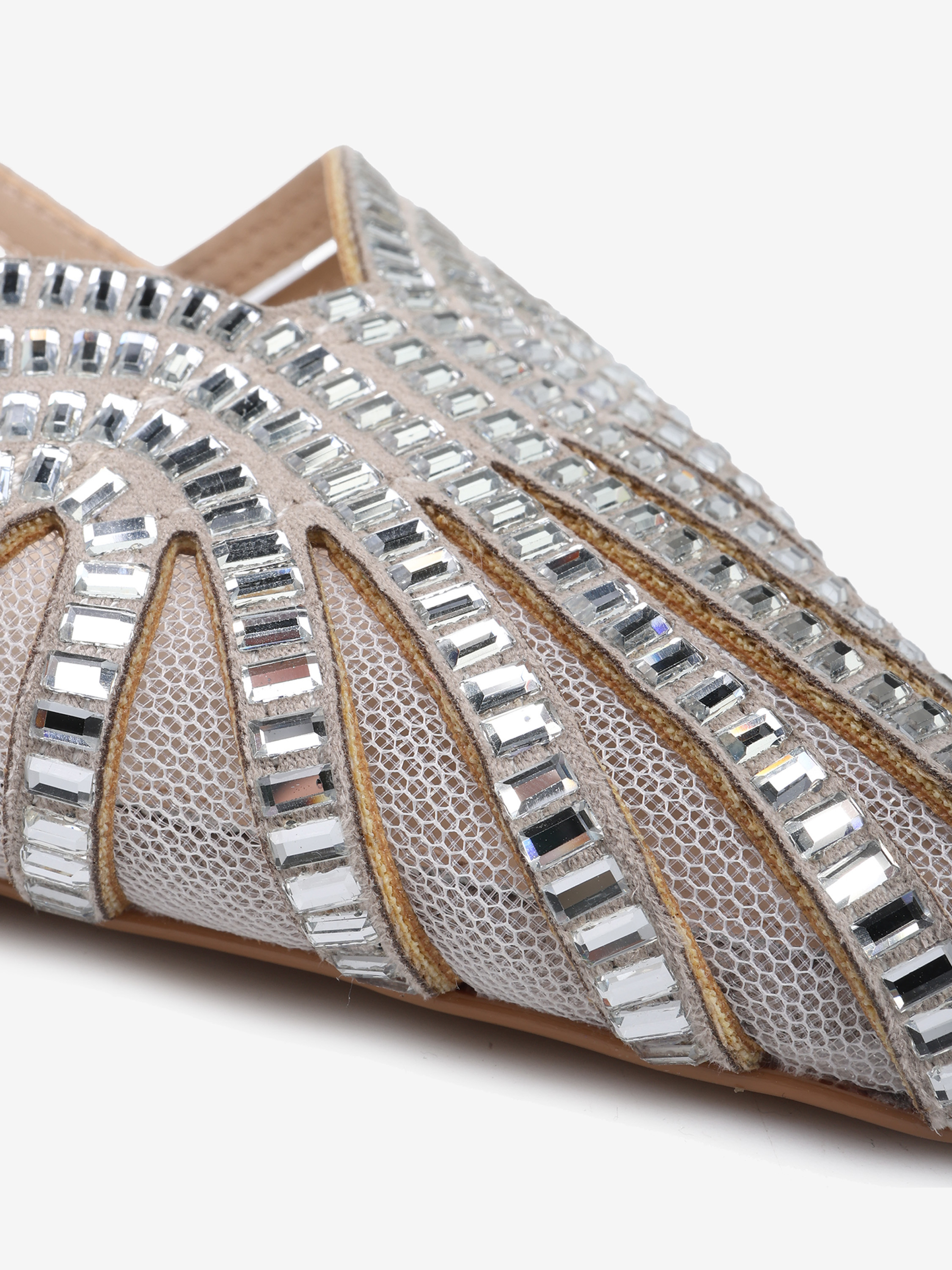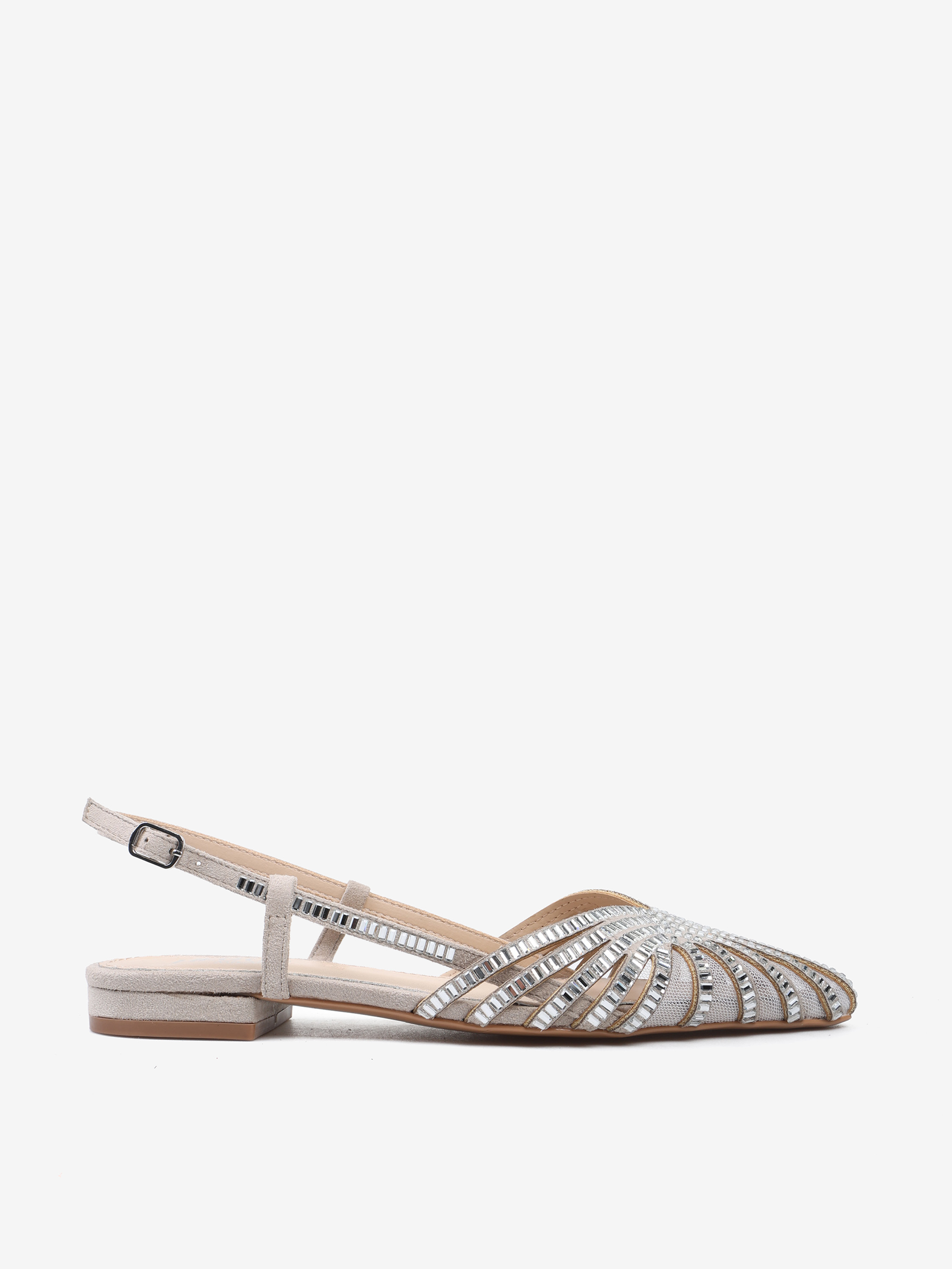 Baleriny z odkrytą piętą z regulowanym paskiem. Ażurowy nosek w szpic z siateczką i ozdobnymi, połyskującymi kamyczkami.