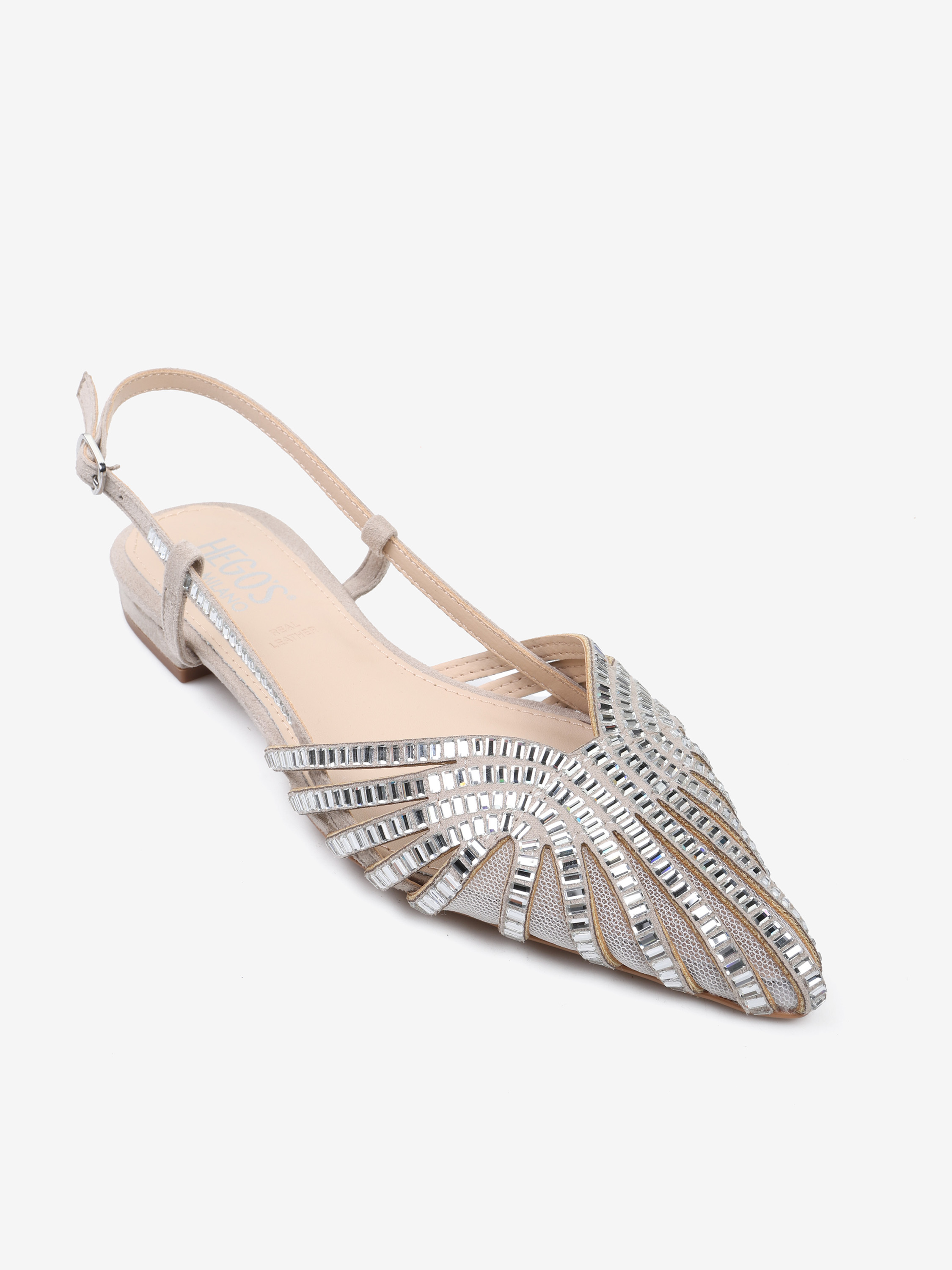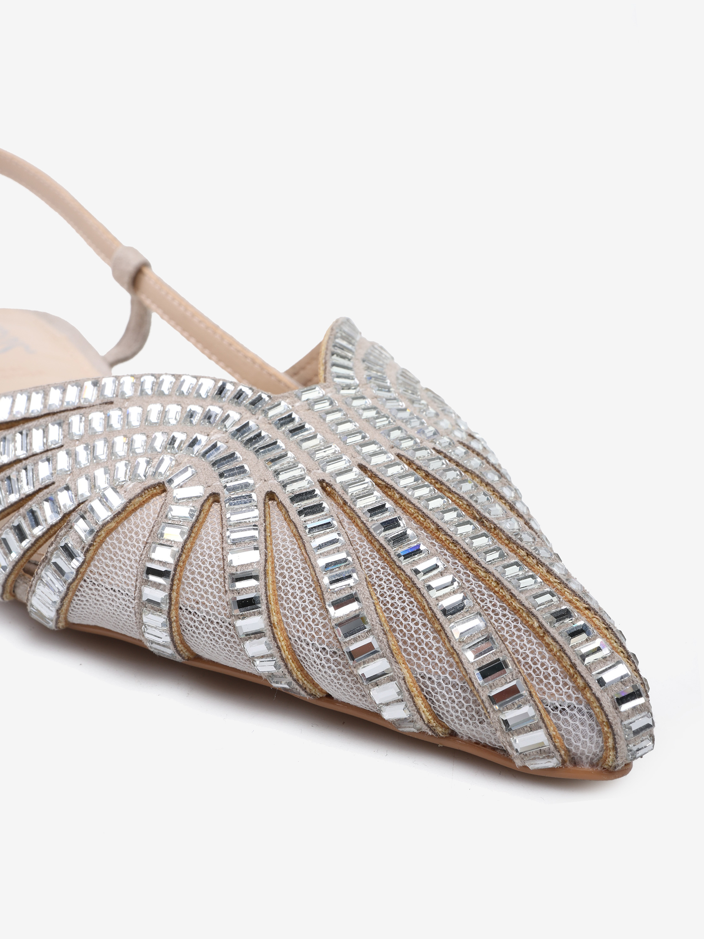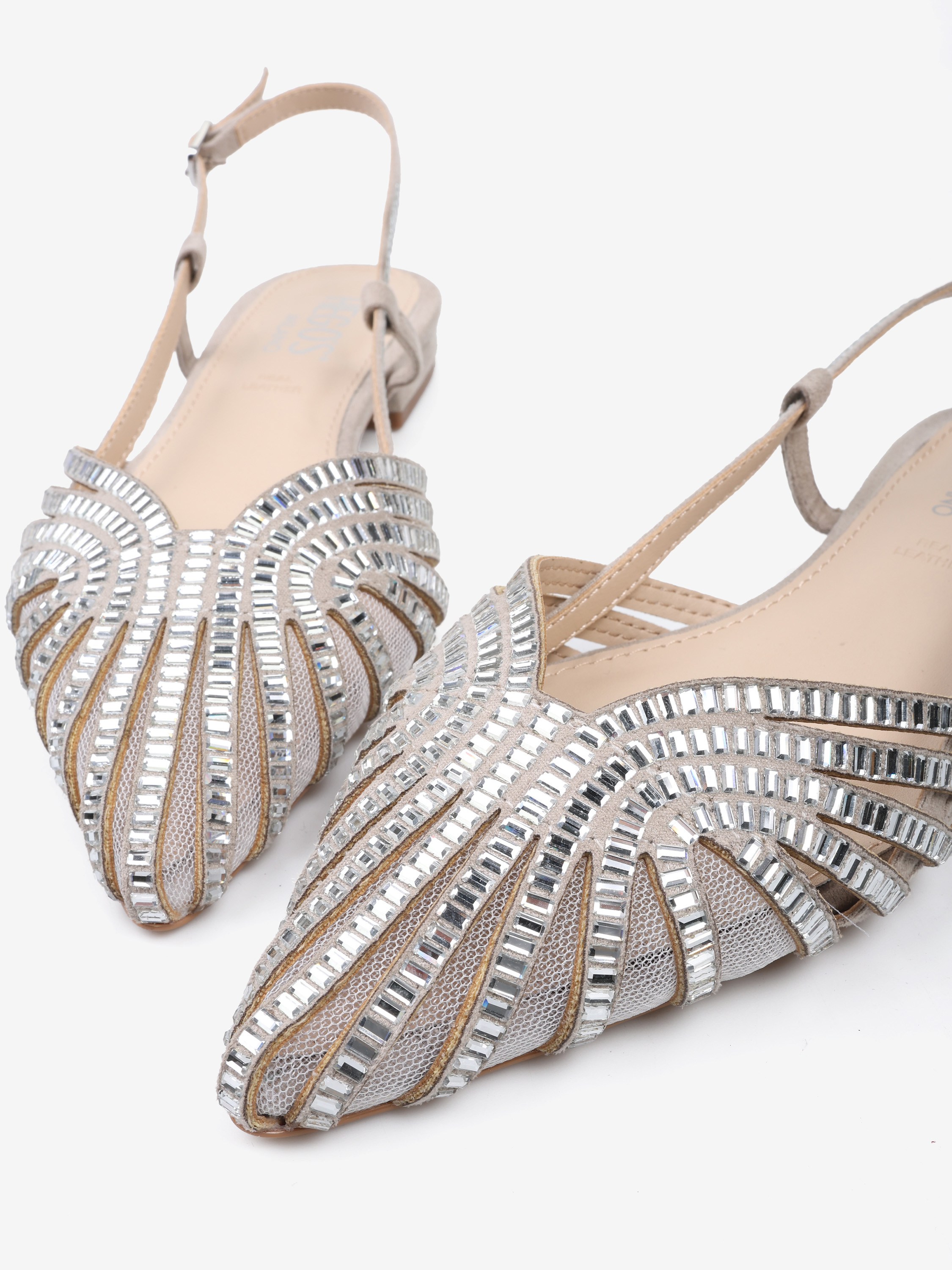 Baleriny z odkrytą piętą z regulowanym paskiem. Ażurowy nosek w szpic z siateczką i ozdobnymi, połyskującymi kamyczkami.