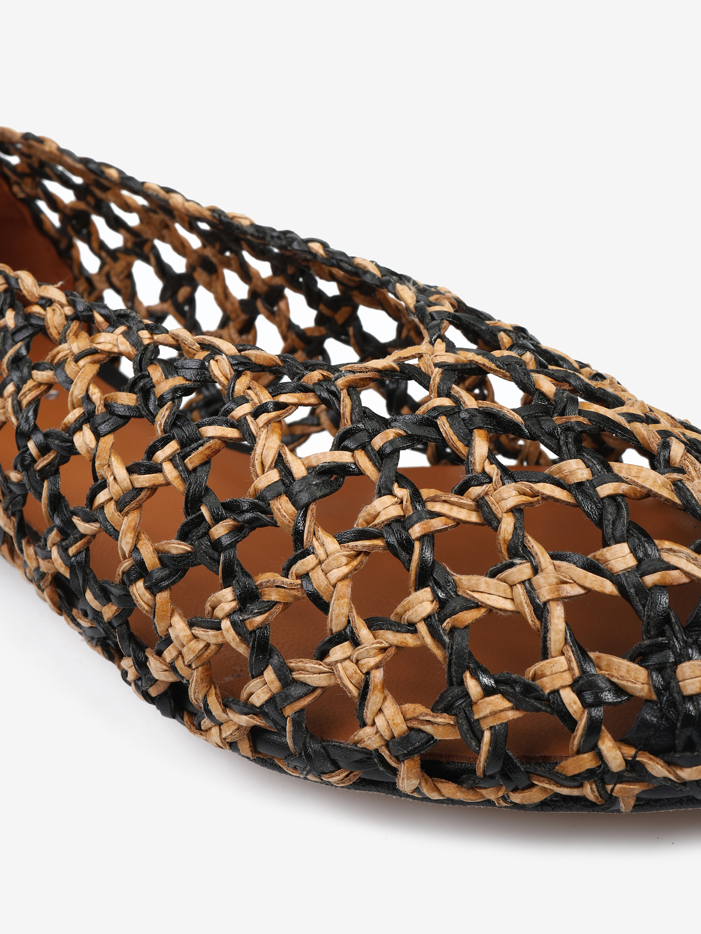 Baleriny z noskiem w szpic wykonane z dwukolorowej, skórzanej plecionki.