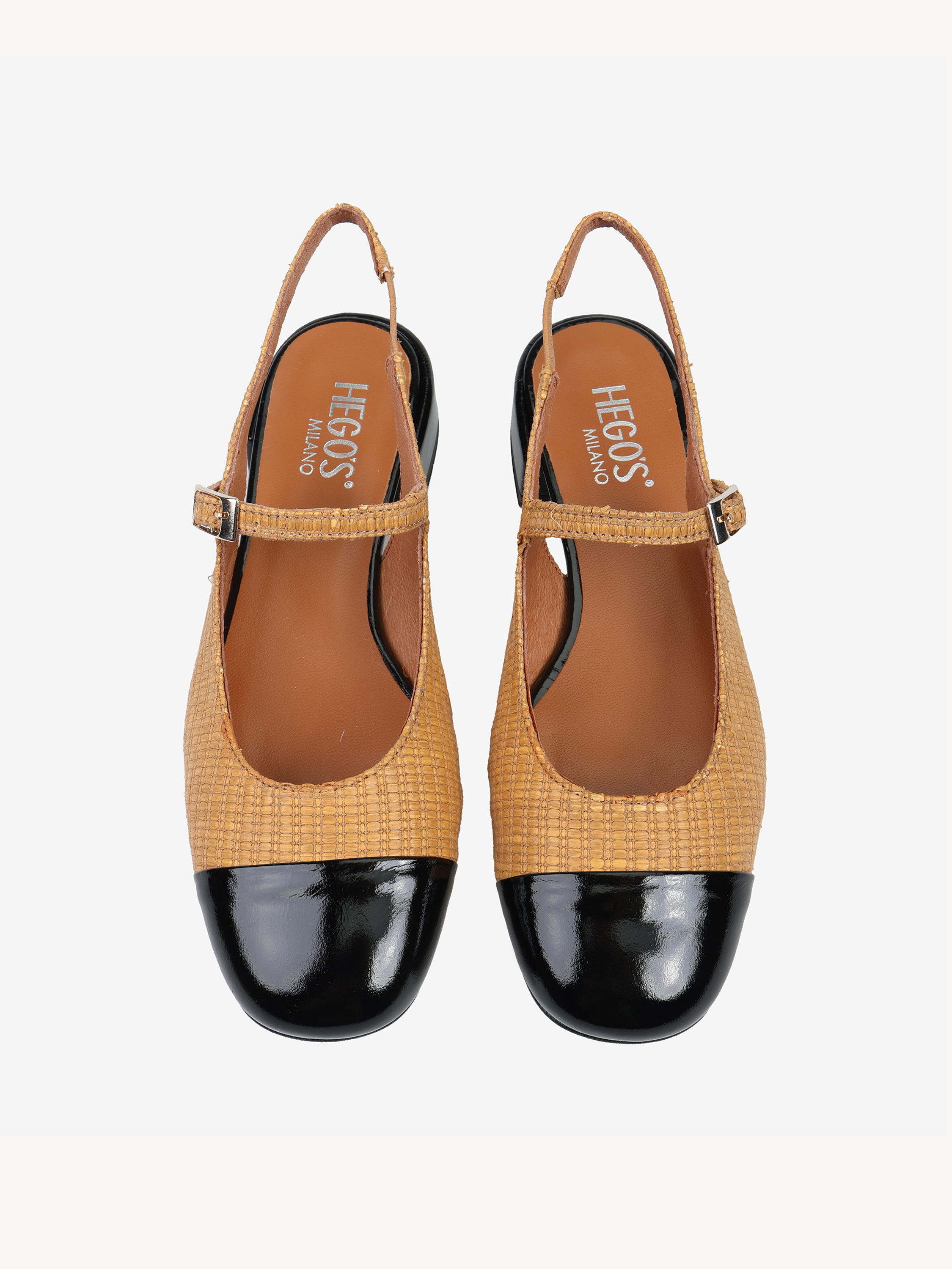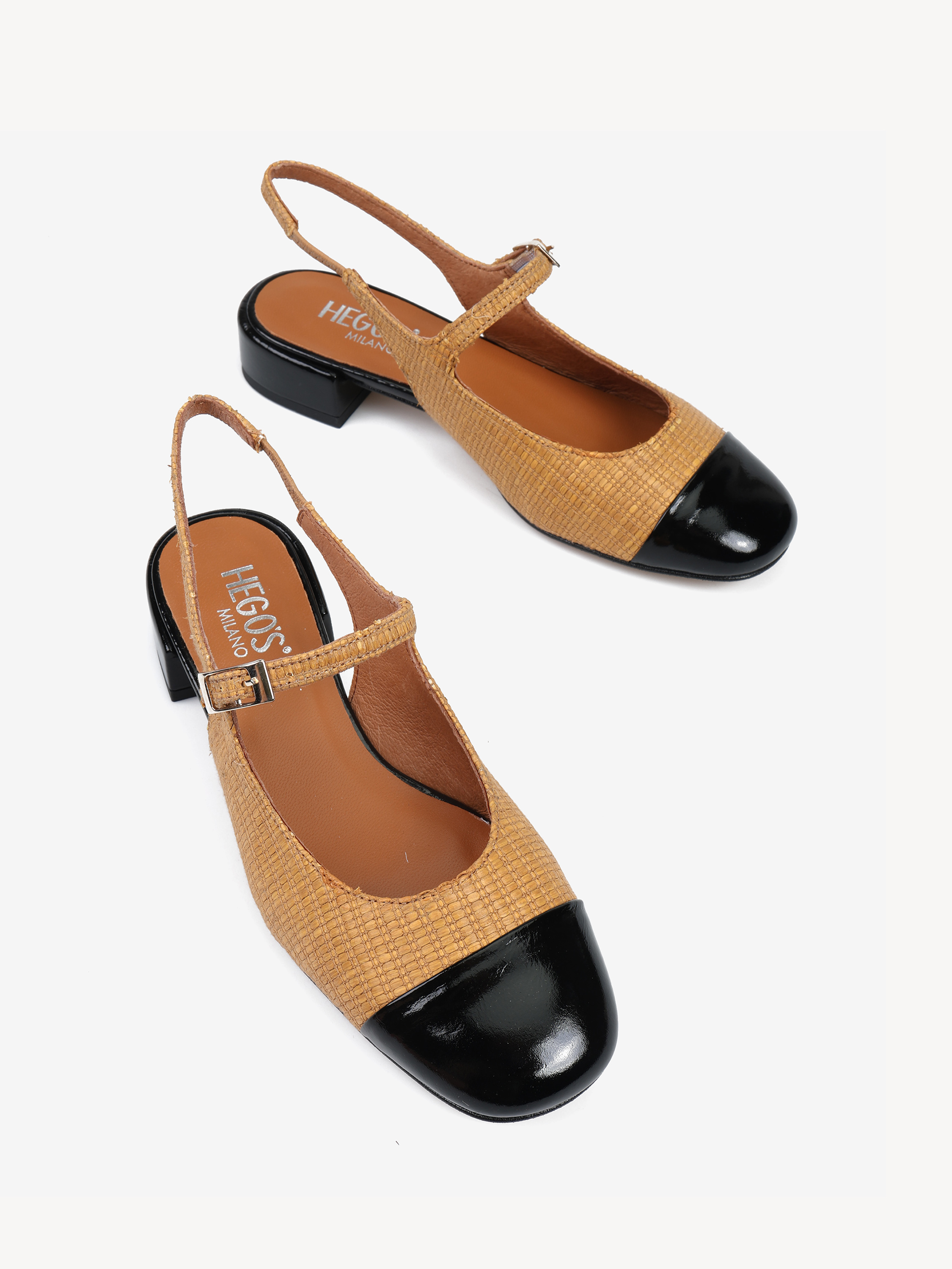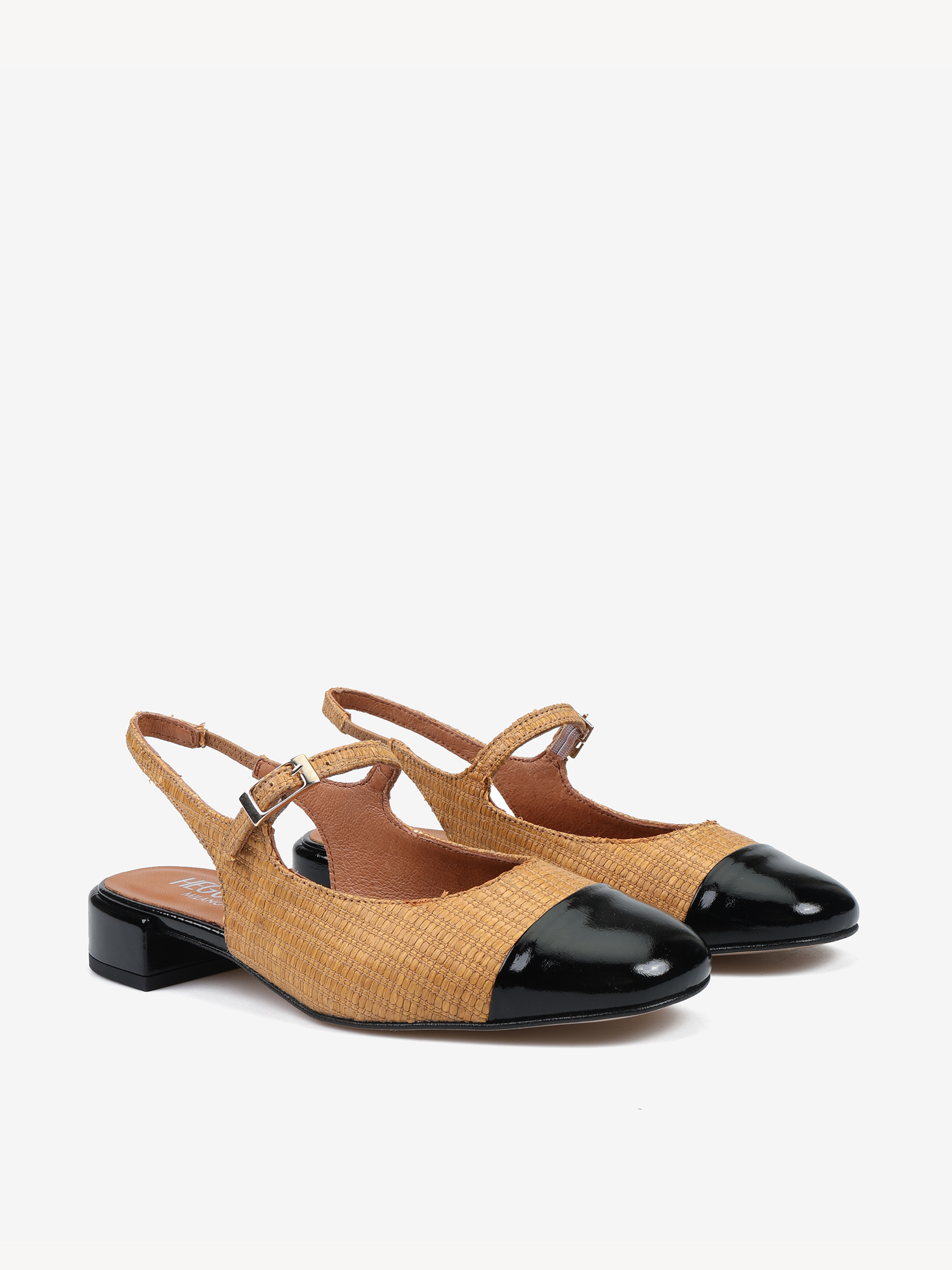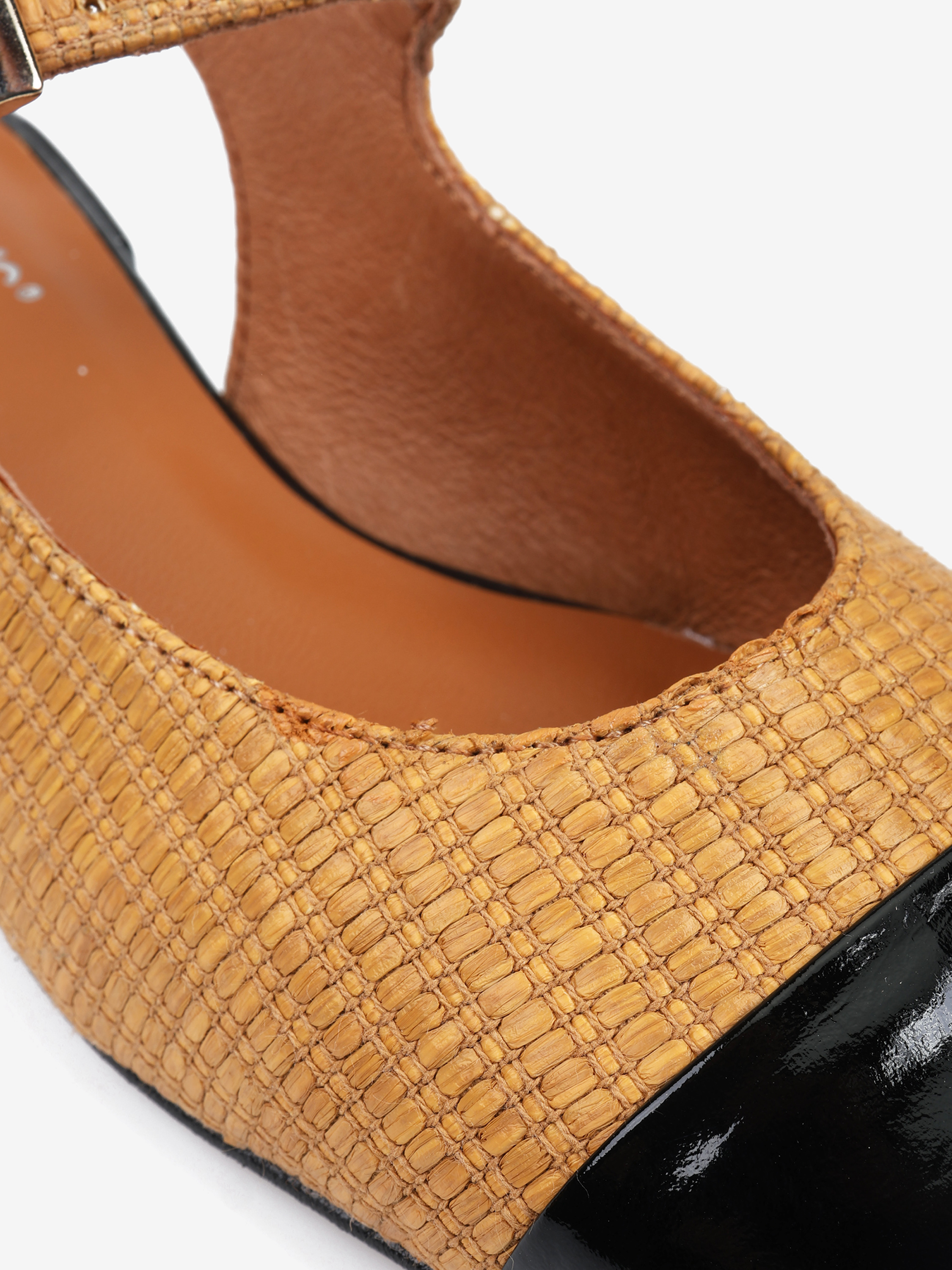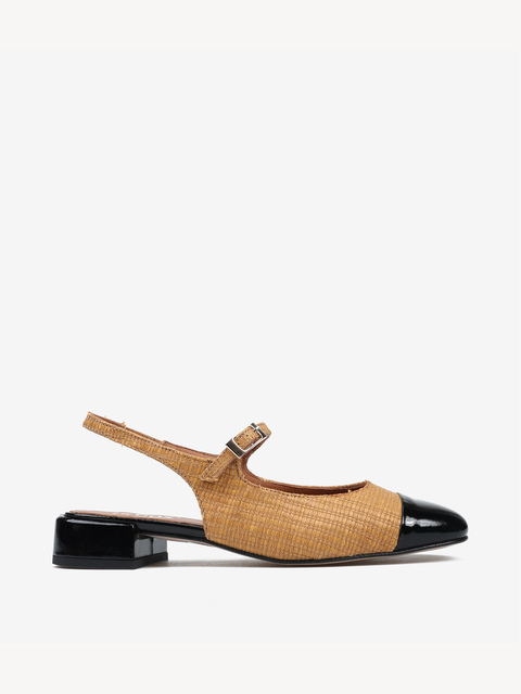 Baleriny Mary Jane wykonane z rafii. Odkryta pięta, niski obcas, skórzany czarny nosek i regulowany pasek.