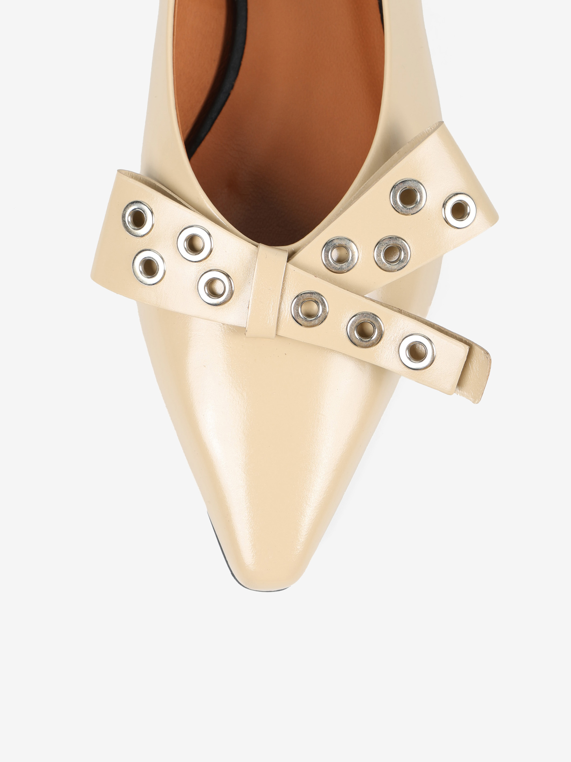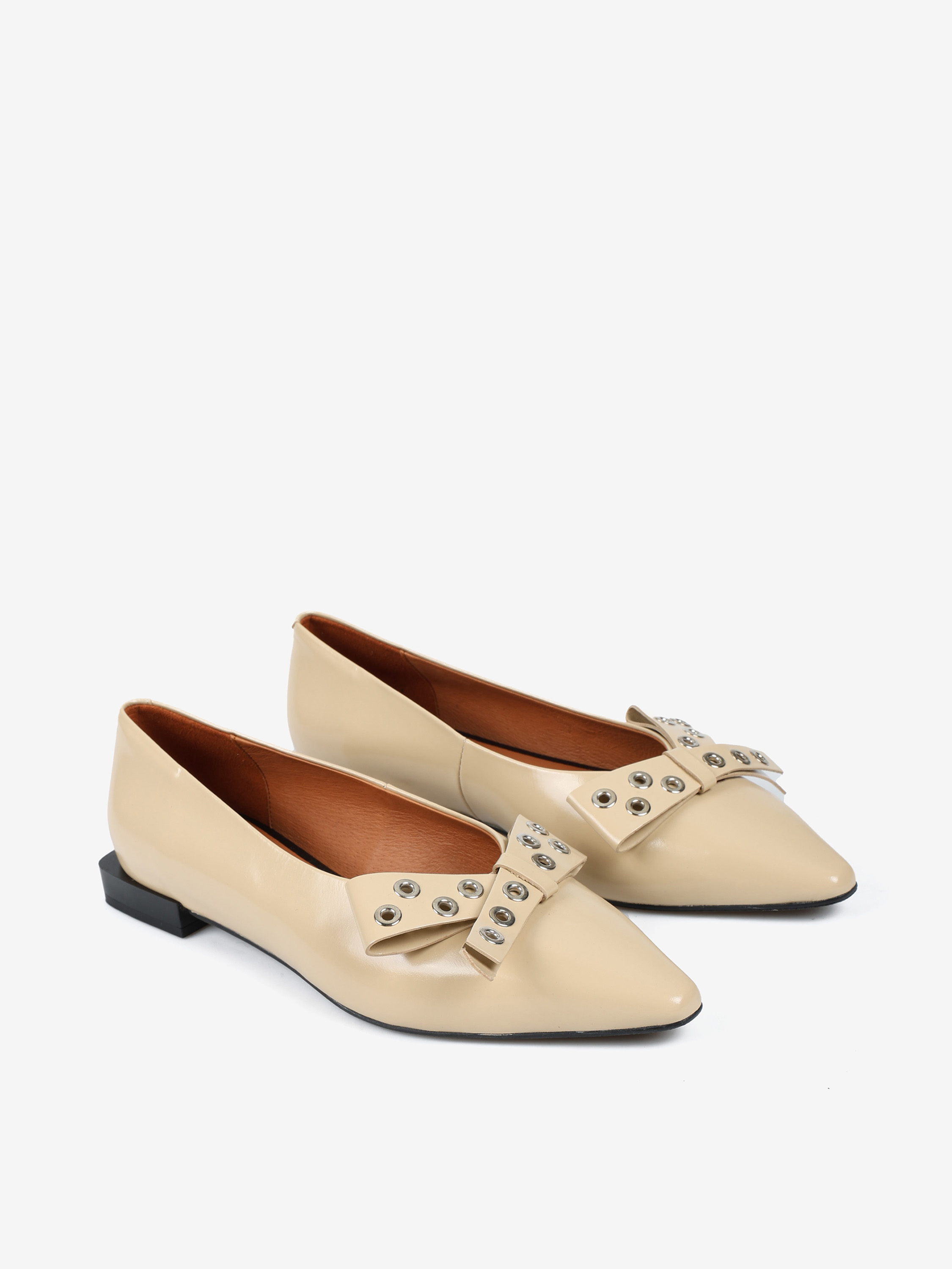 Baleriny na niskim klocku wykonane z wysokopolerowanej skóry. Nosek w szpic z ozdobną kokardą z ćwiekami.