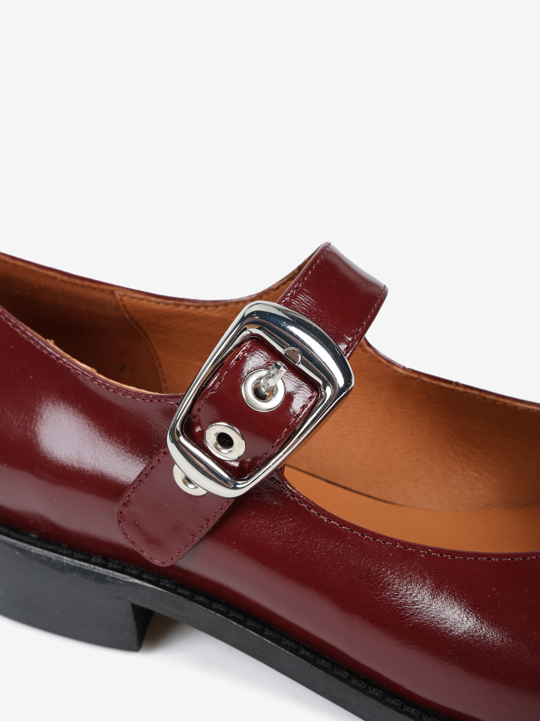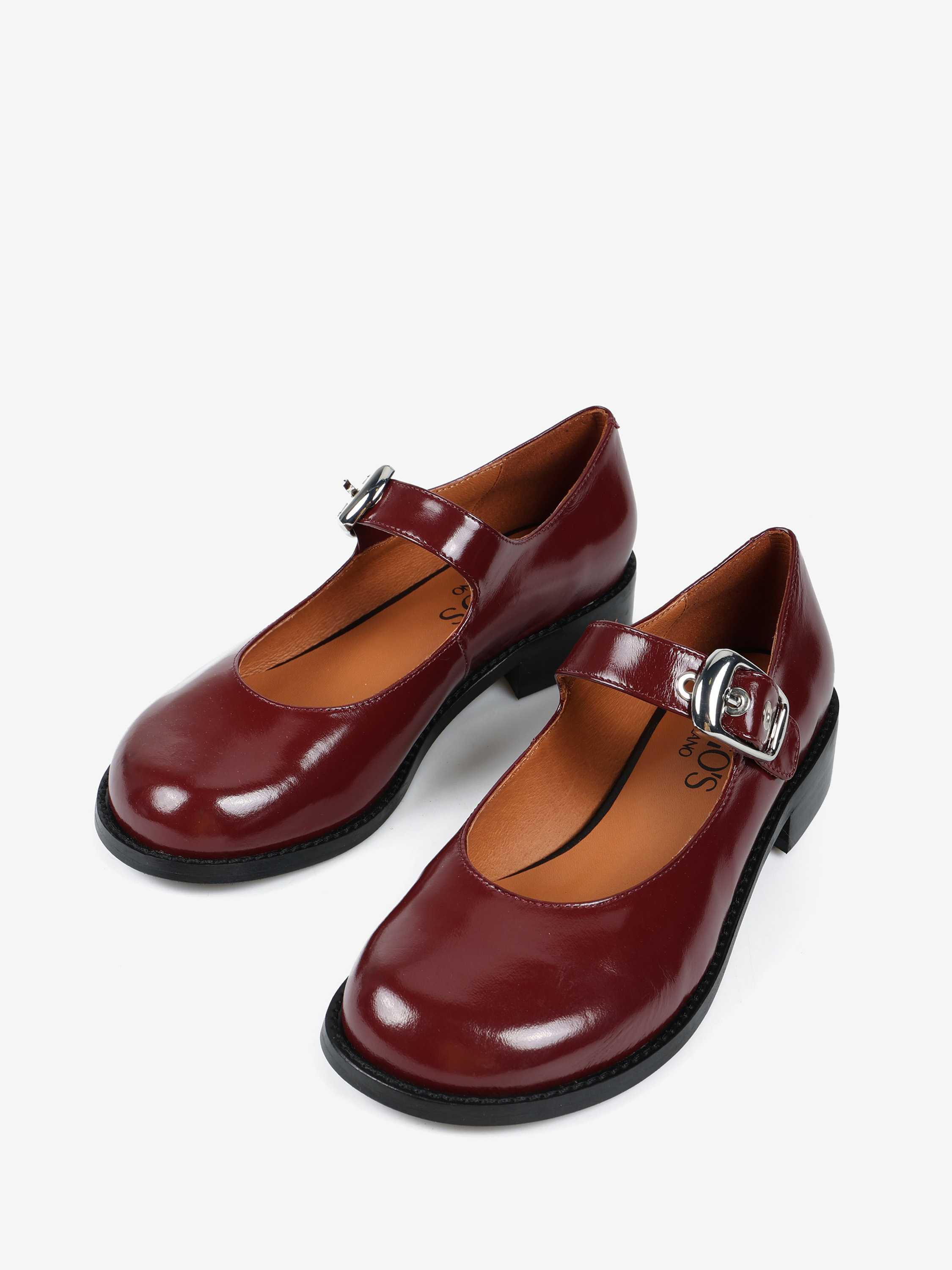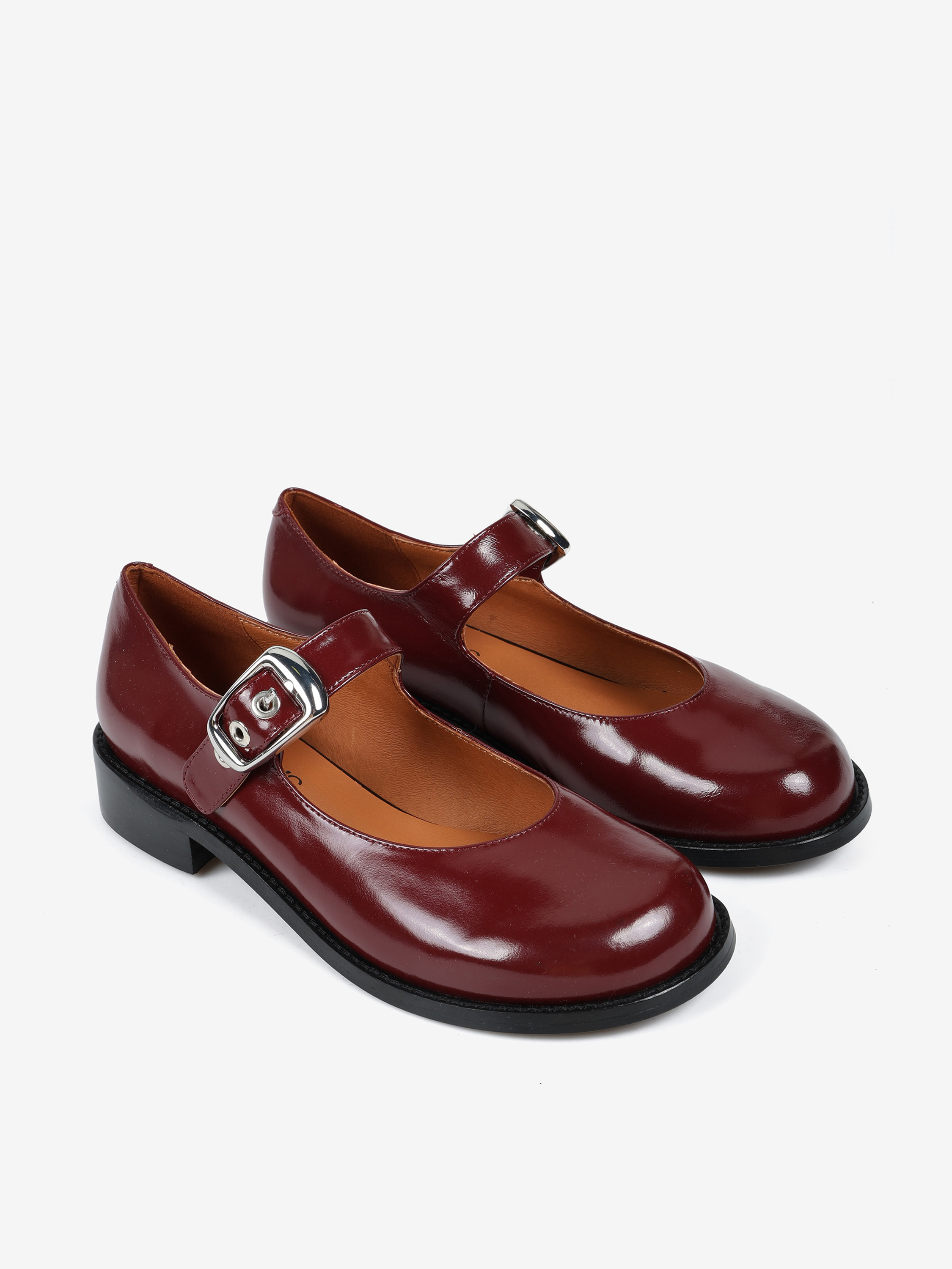Baleriny Mary Jane na niskim obcasie, wykonane z wysokopolerowanej skóry. Okrągłe noski i regulowany pasek.