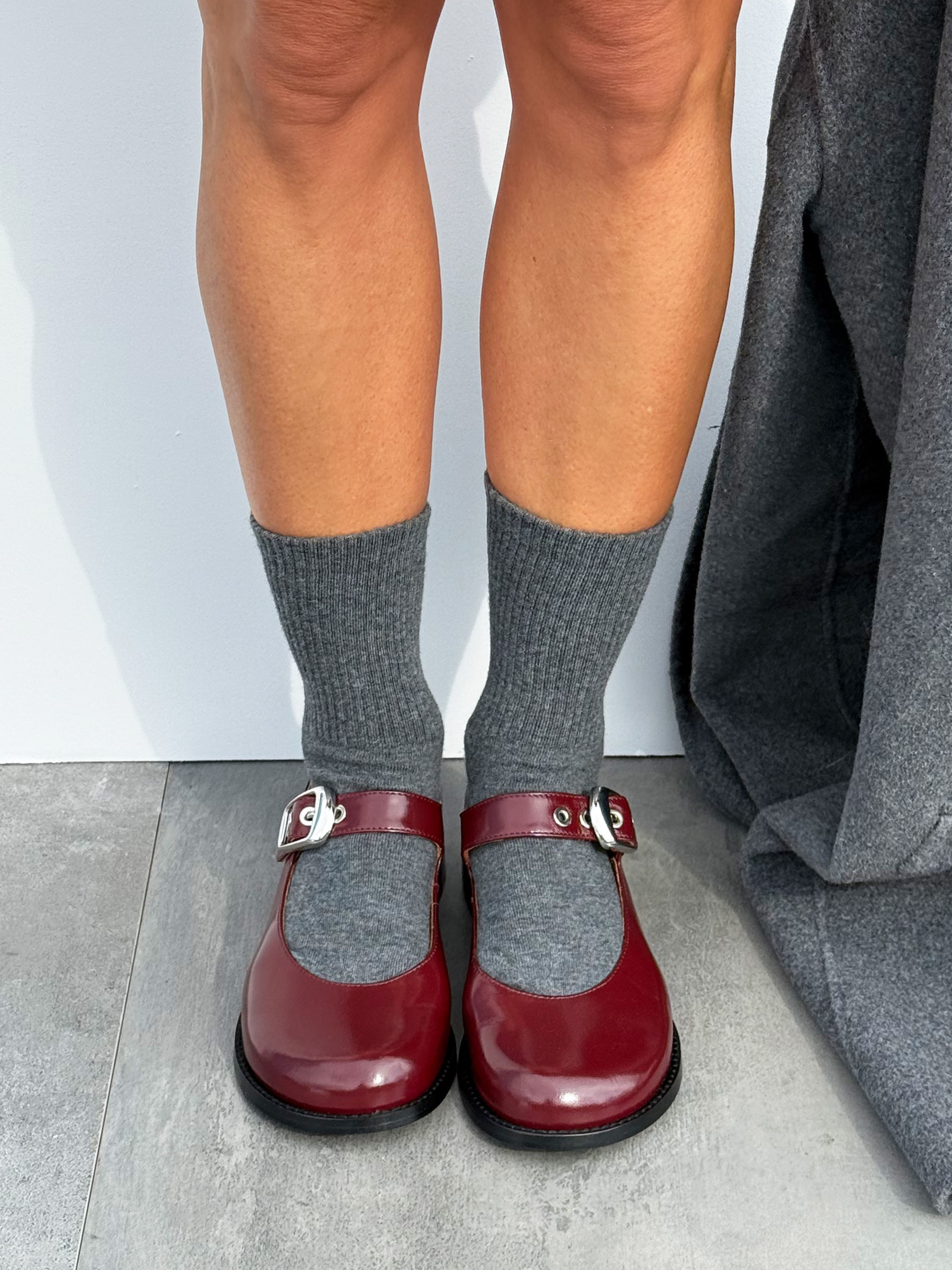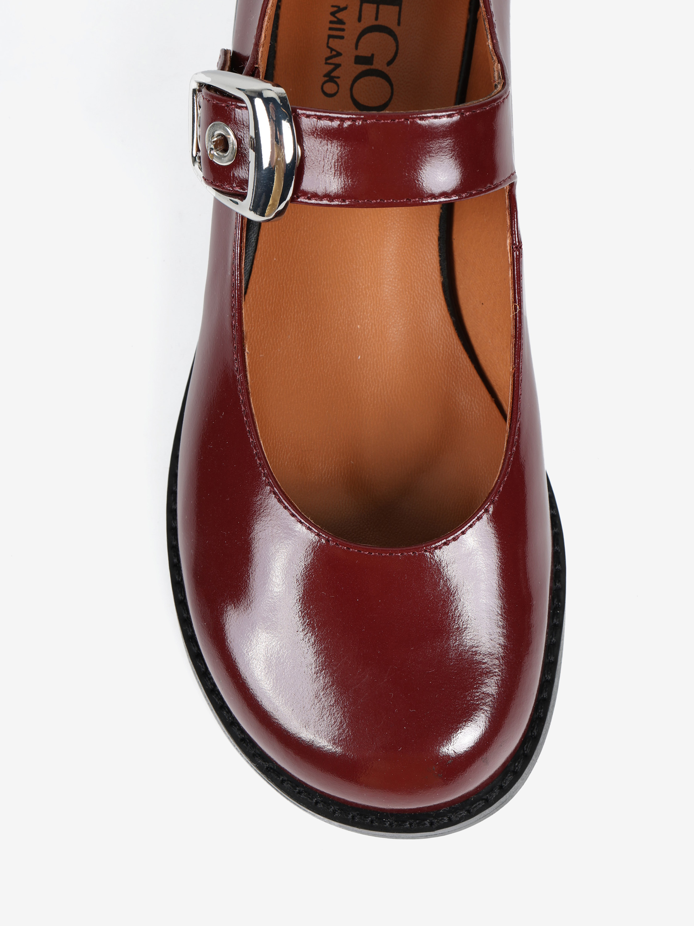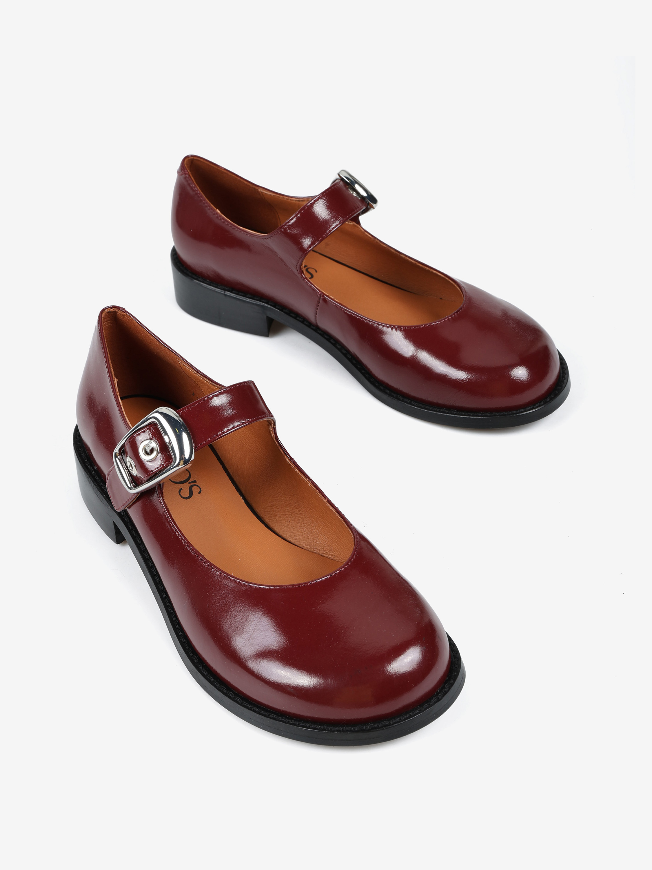 Baleriny Mary Jane na niskim obcasie, wykonane z wysokopolerowanej skóry. Okrągłe noski i regulowany pasek.