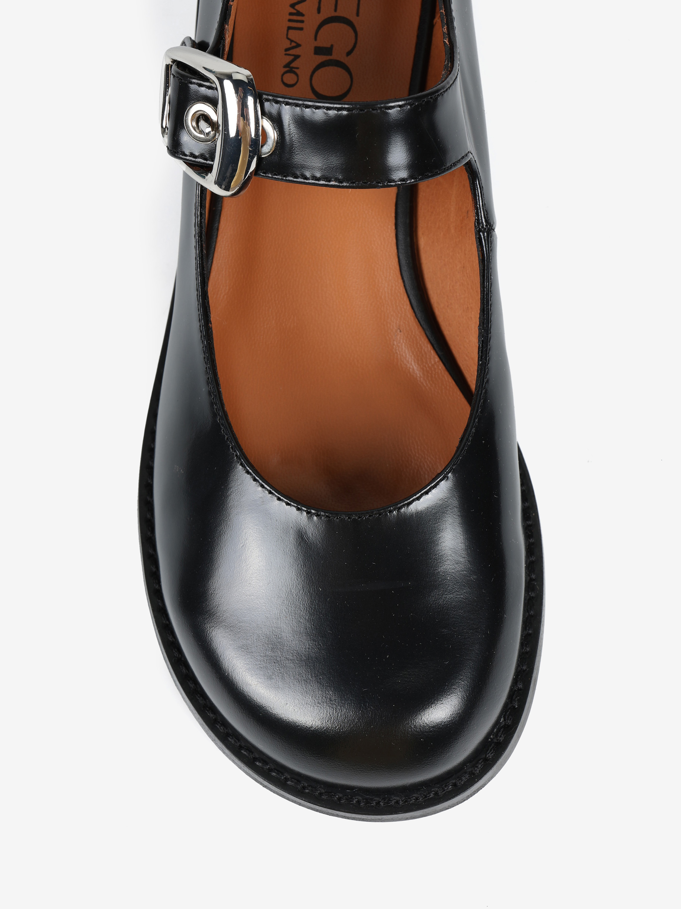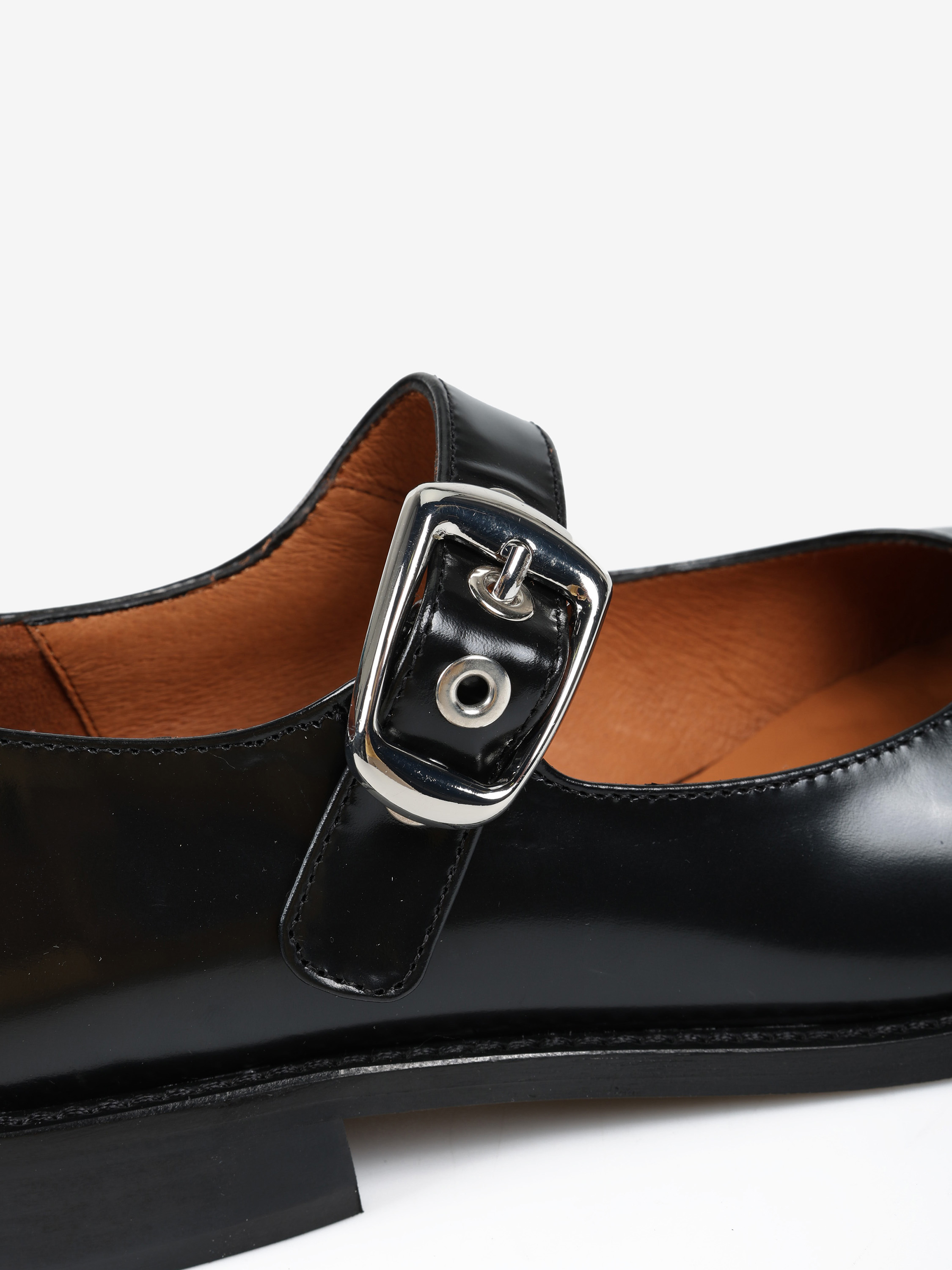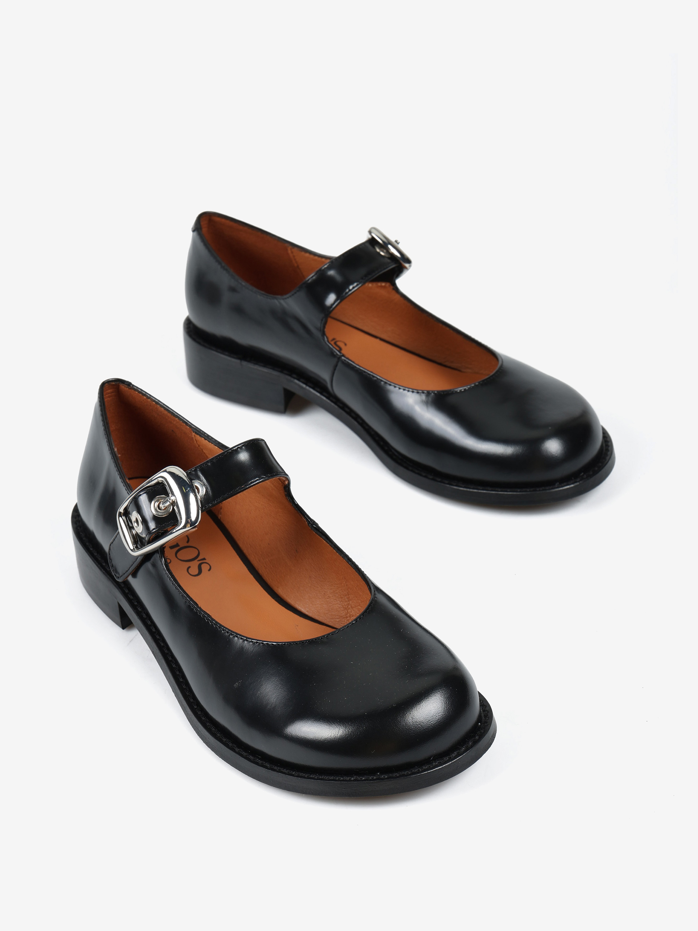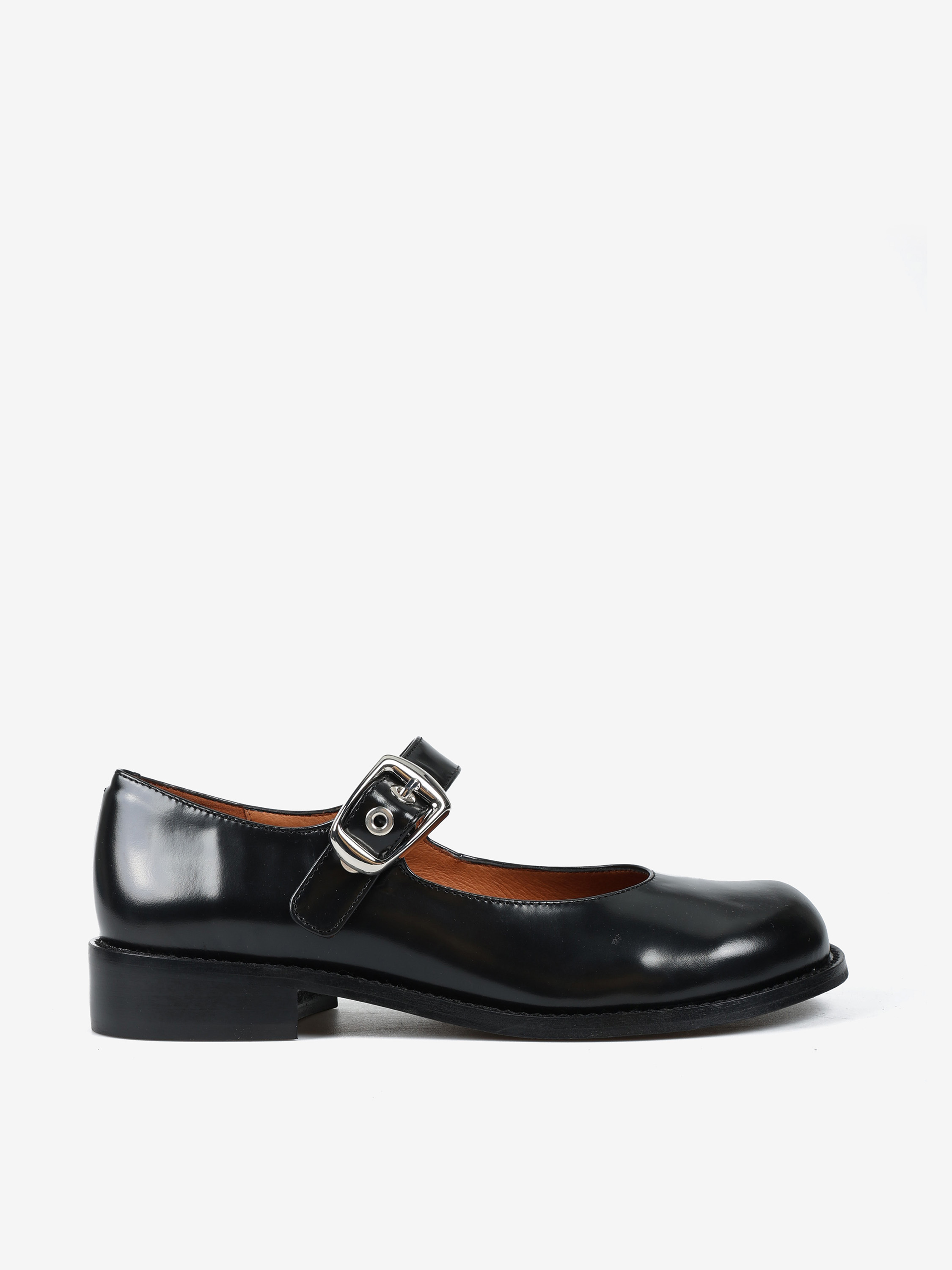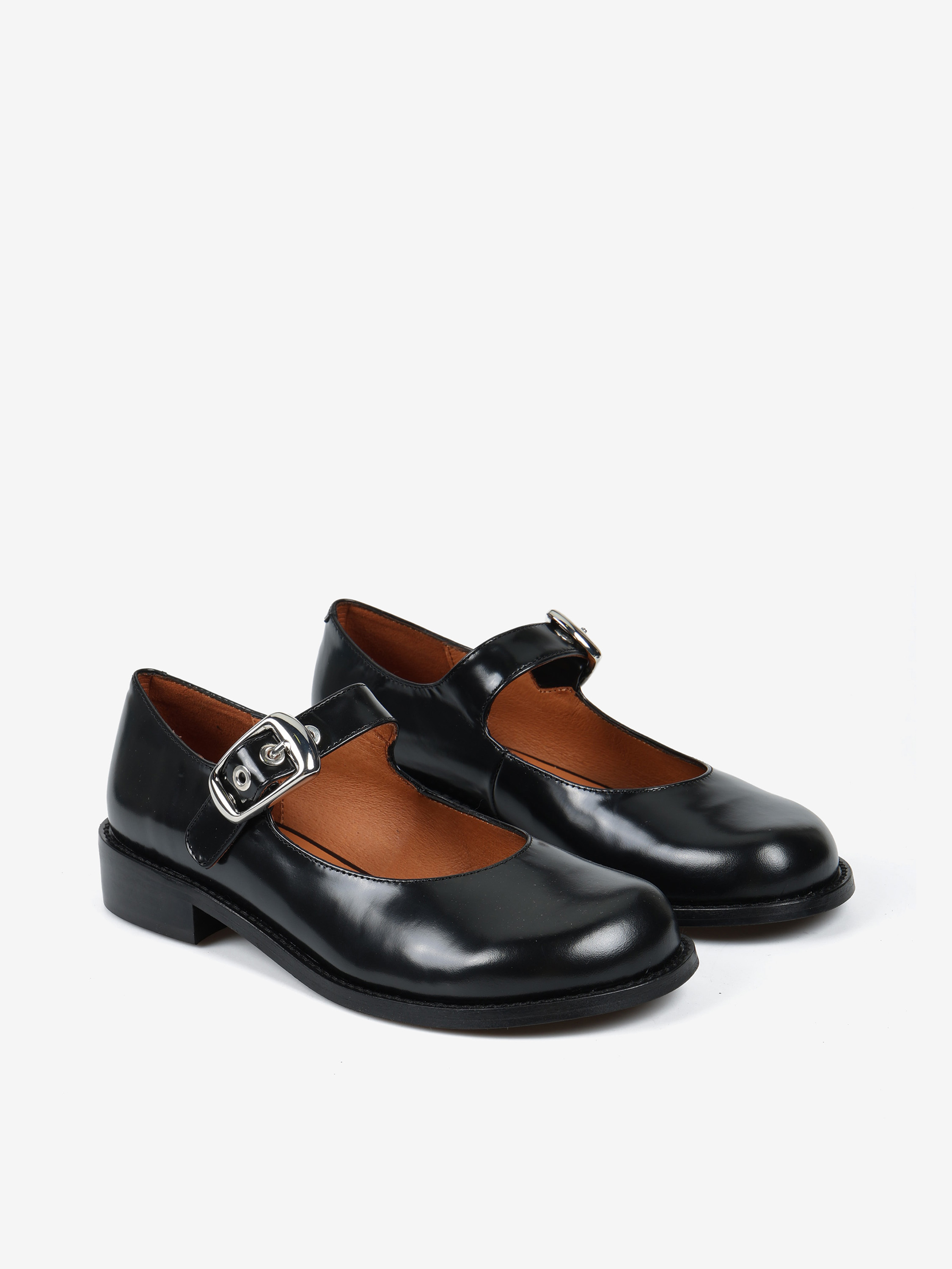 Baleriny Mary Jane na niskim obcasie, wykonane z wysokopolerowanej skóry. Okrągłe noski i regulowany pasek.