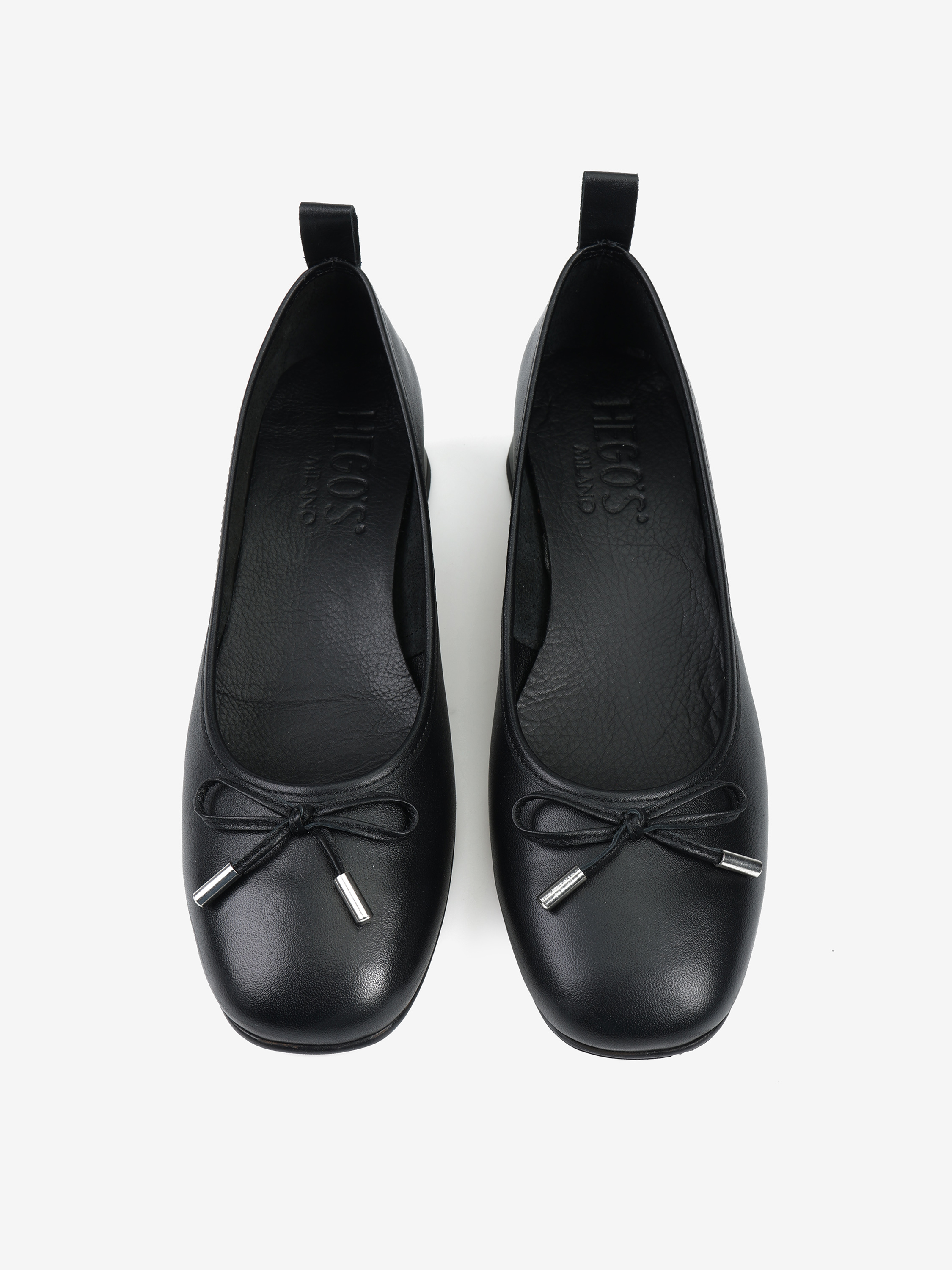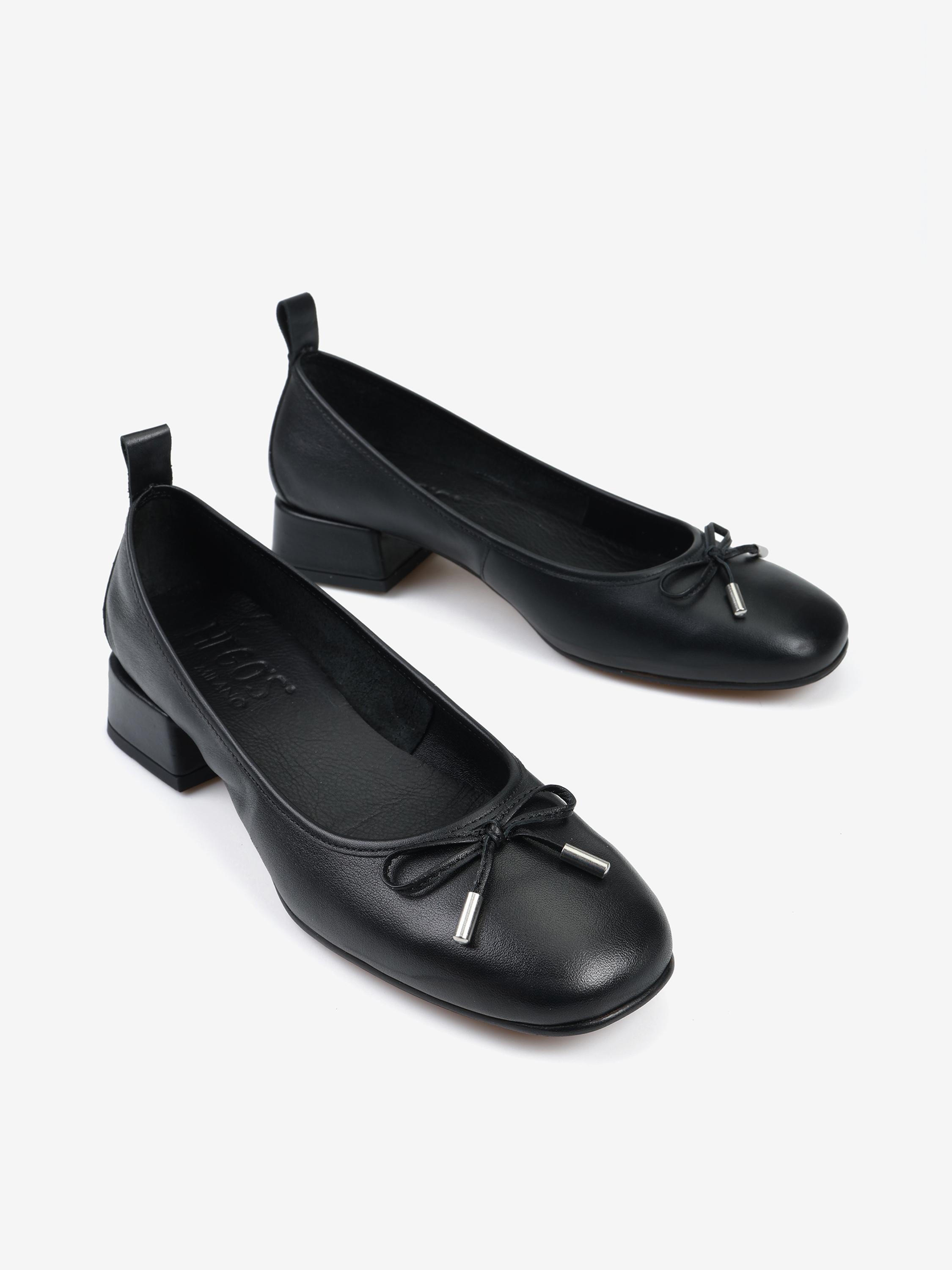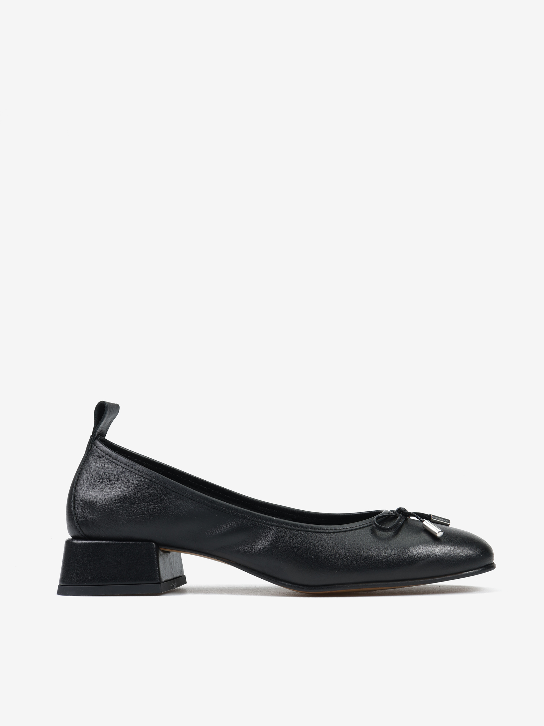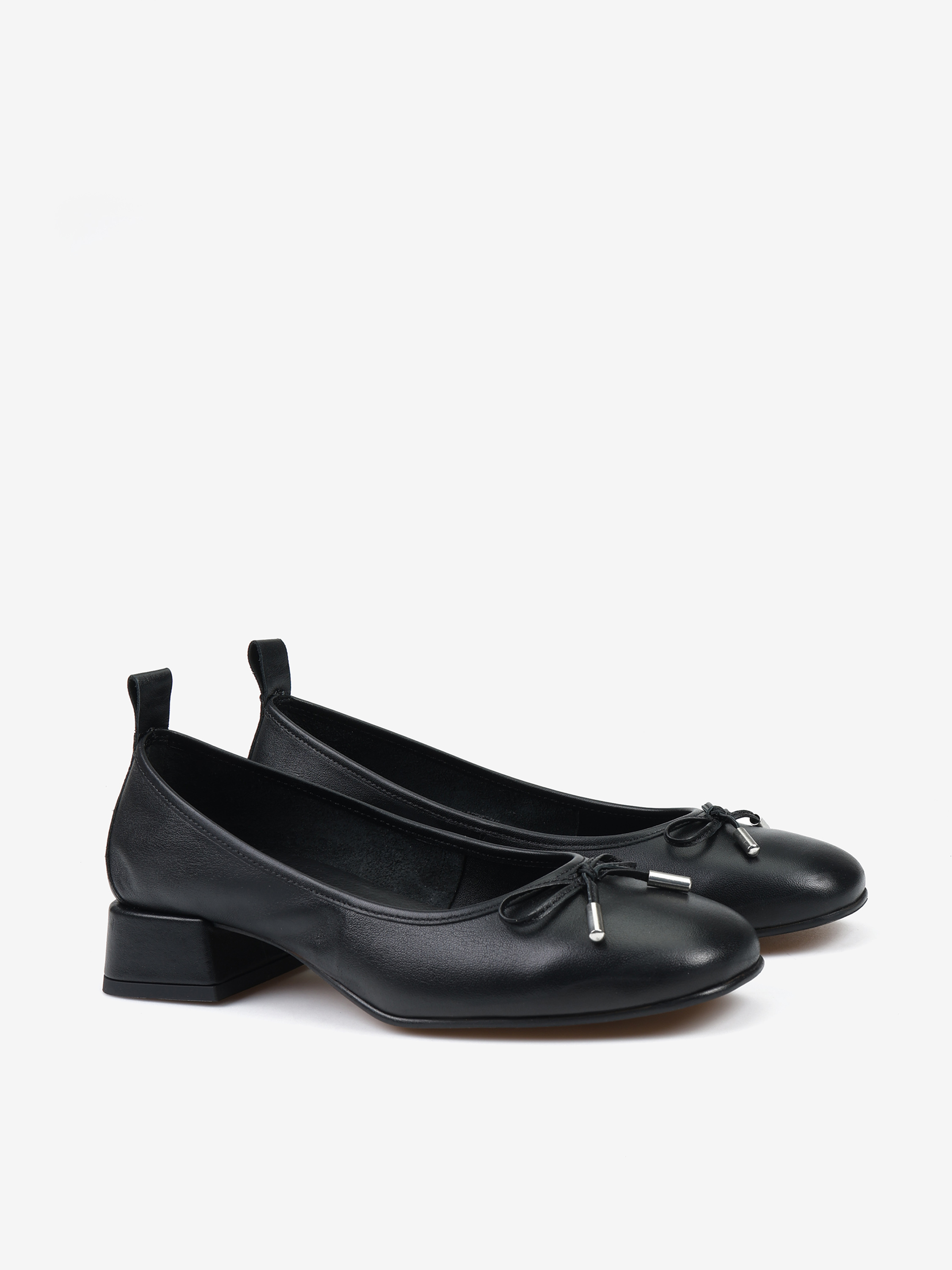 Baleriny na niskim obcasie wykonane z miękkiej, delikatnej skóry. Ozdobna kokardka z metalowymi skuwkami.
