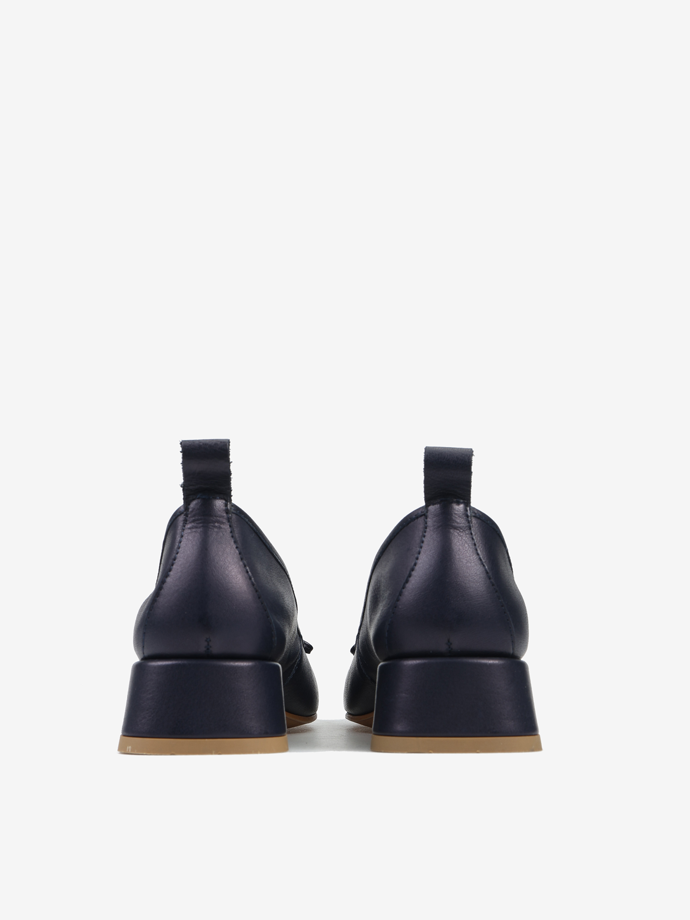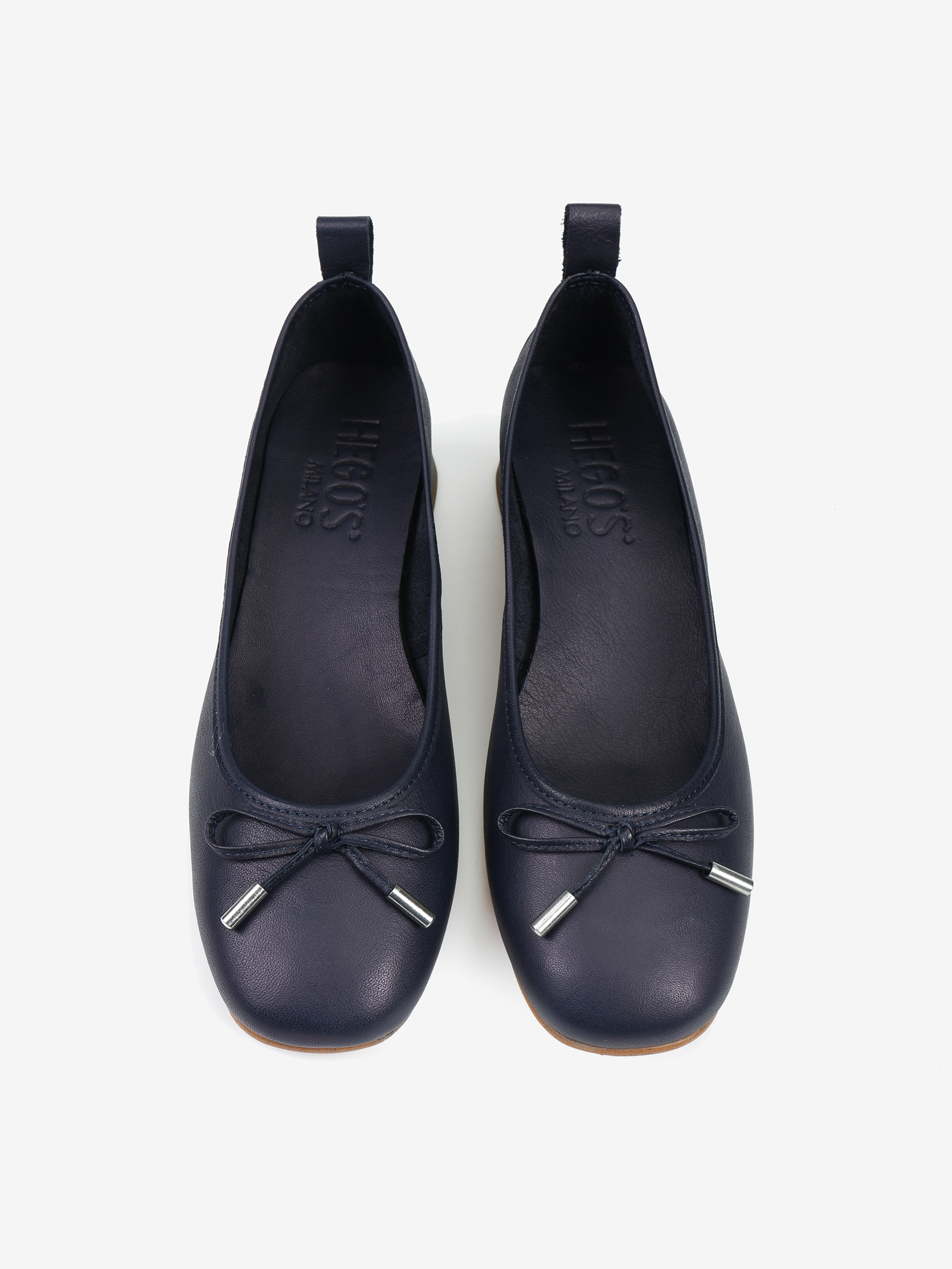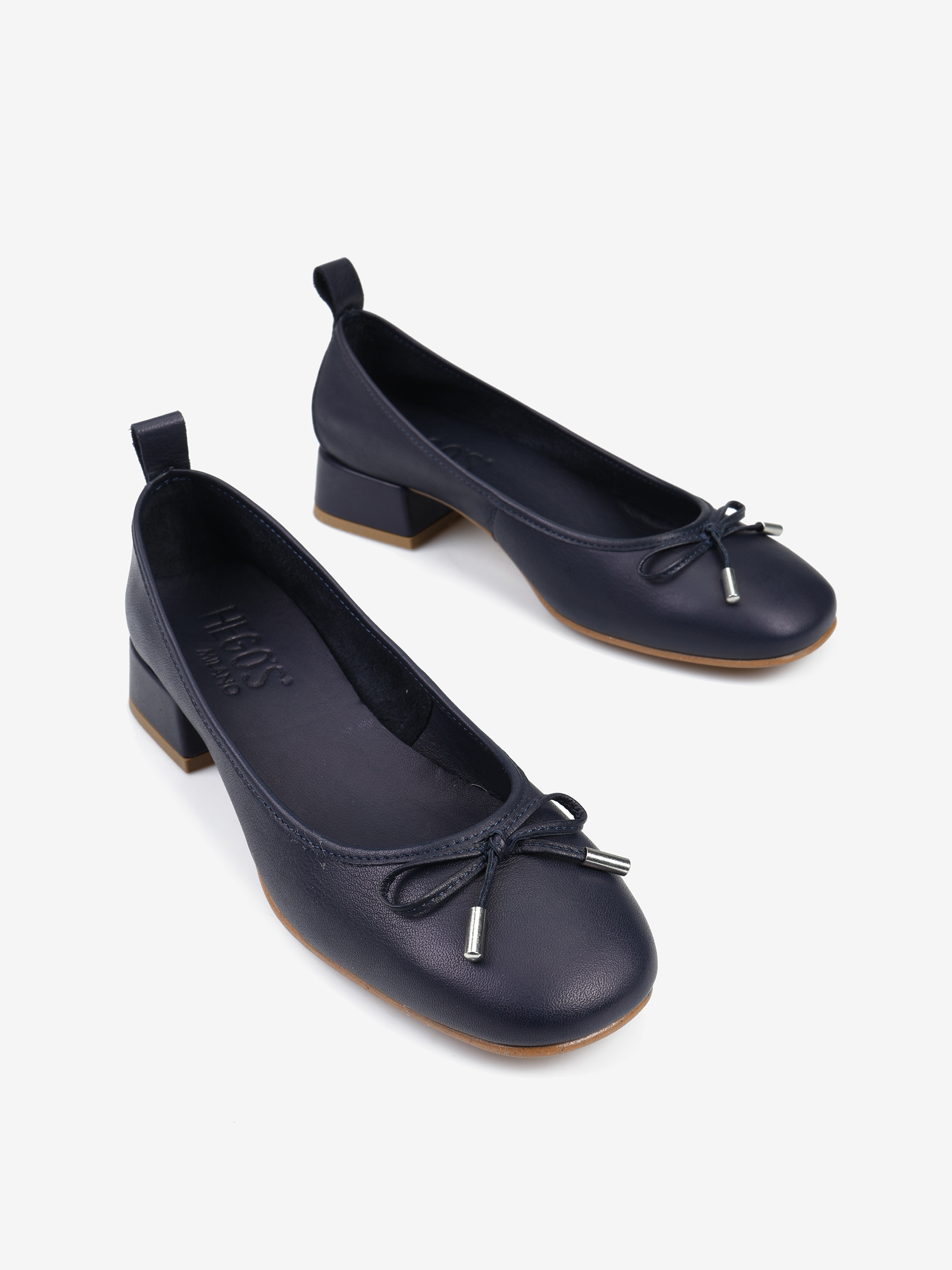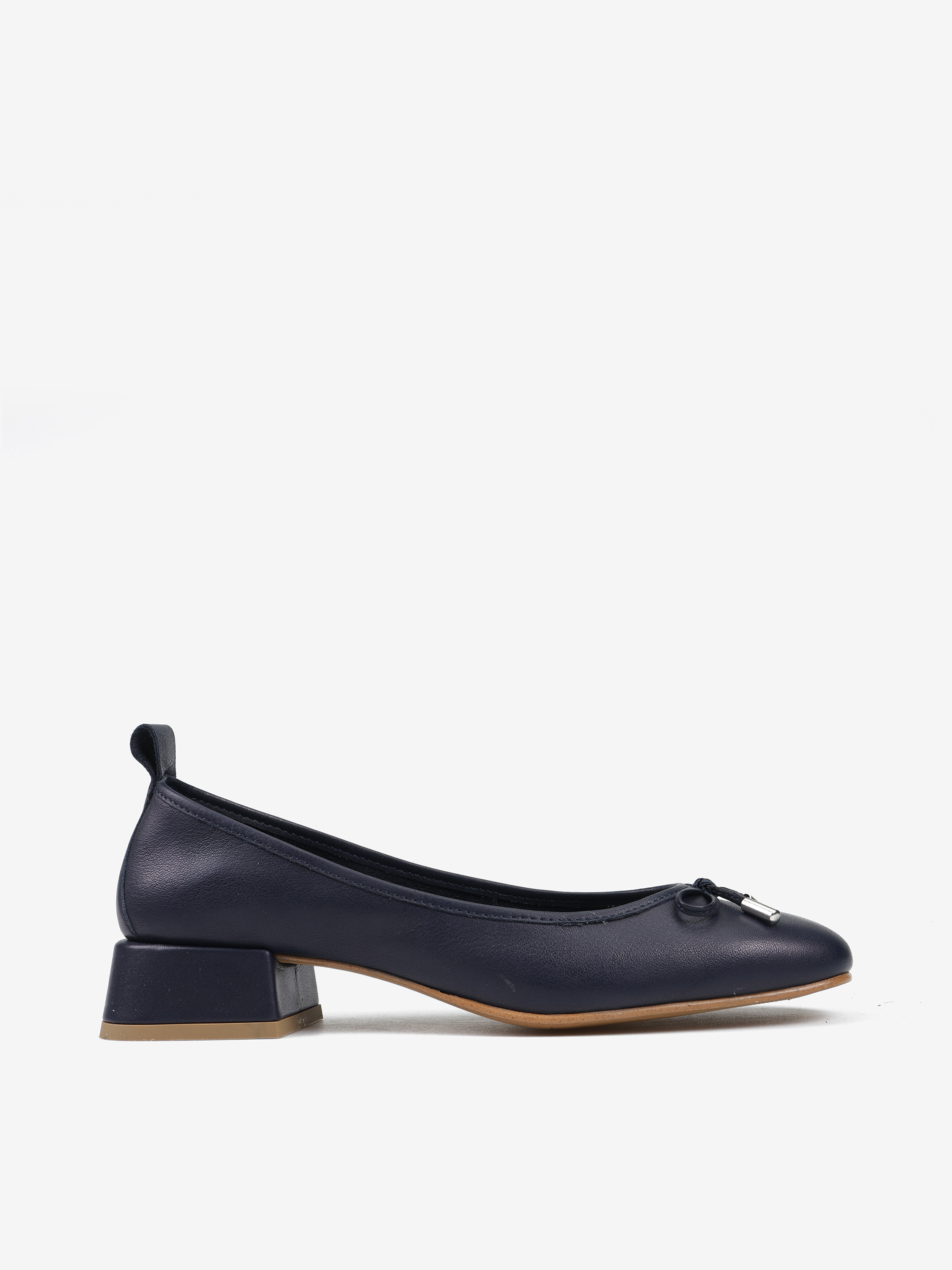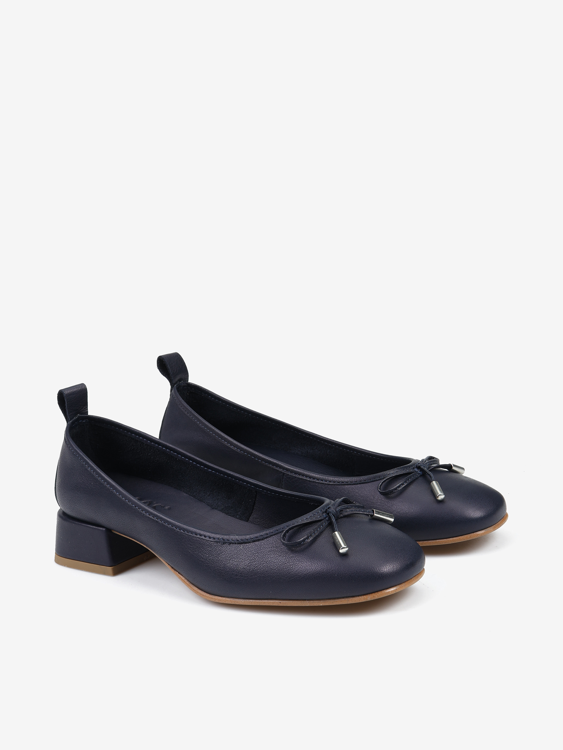 Baleriny na niskim obcasie wykonane z miękkiej, delikatnej skóry. Ozdobna kokardka z metalowymi skuwkami.