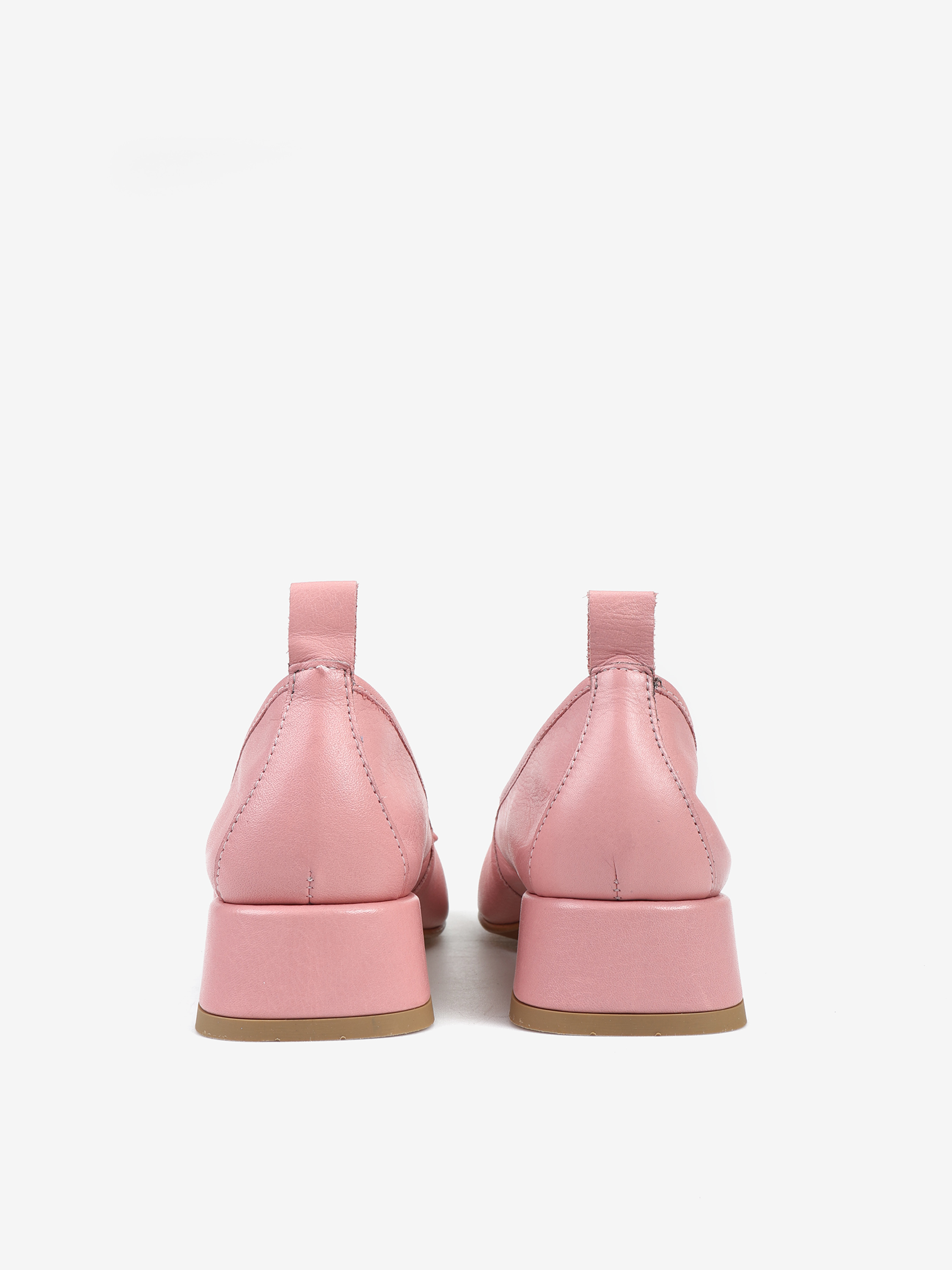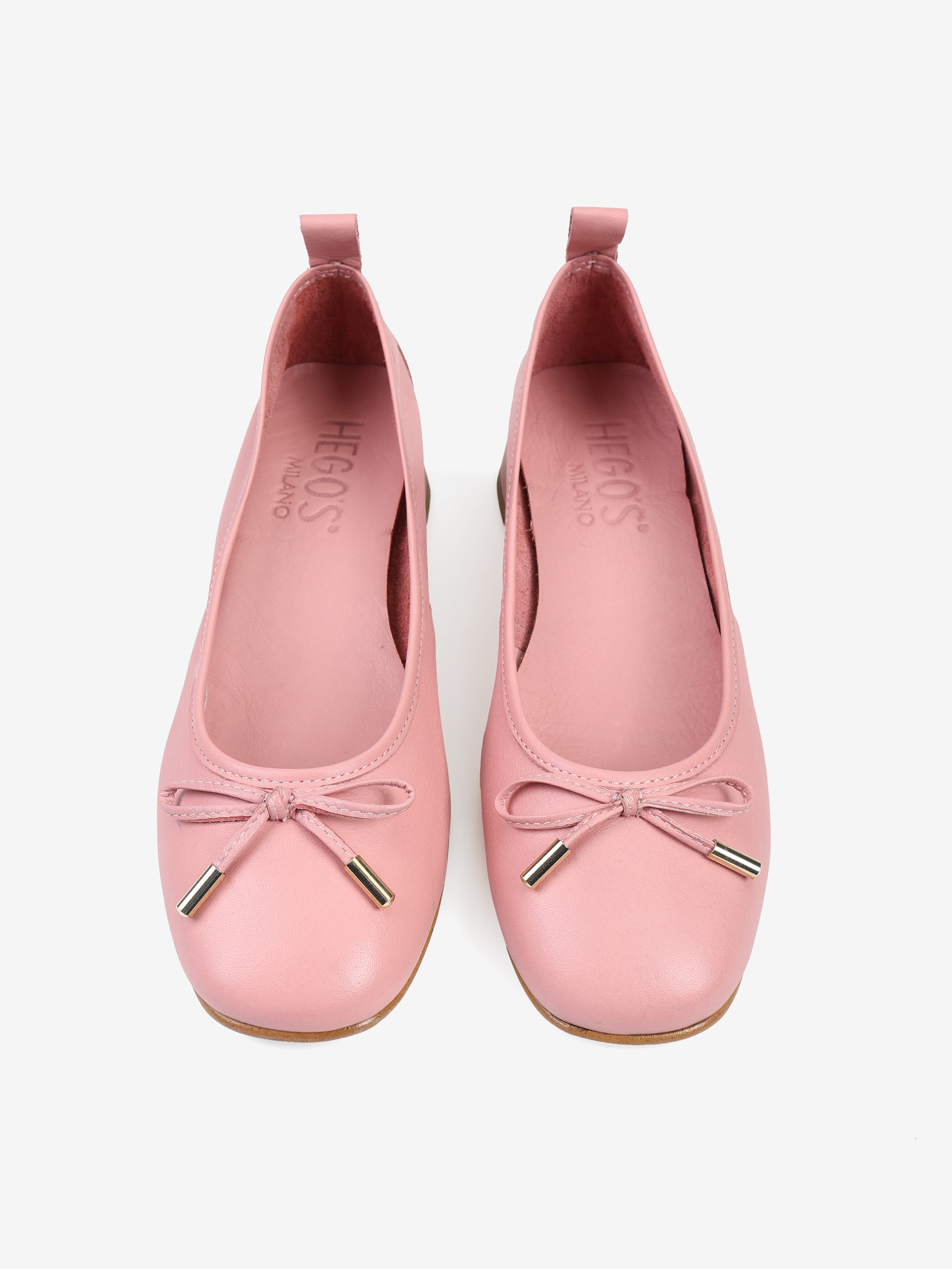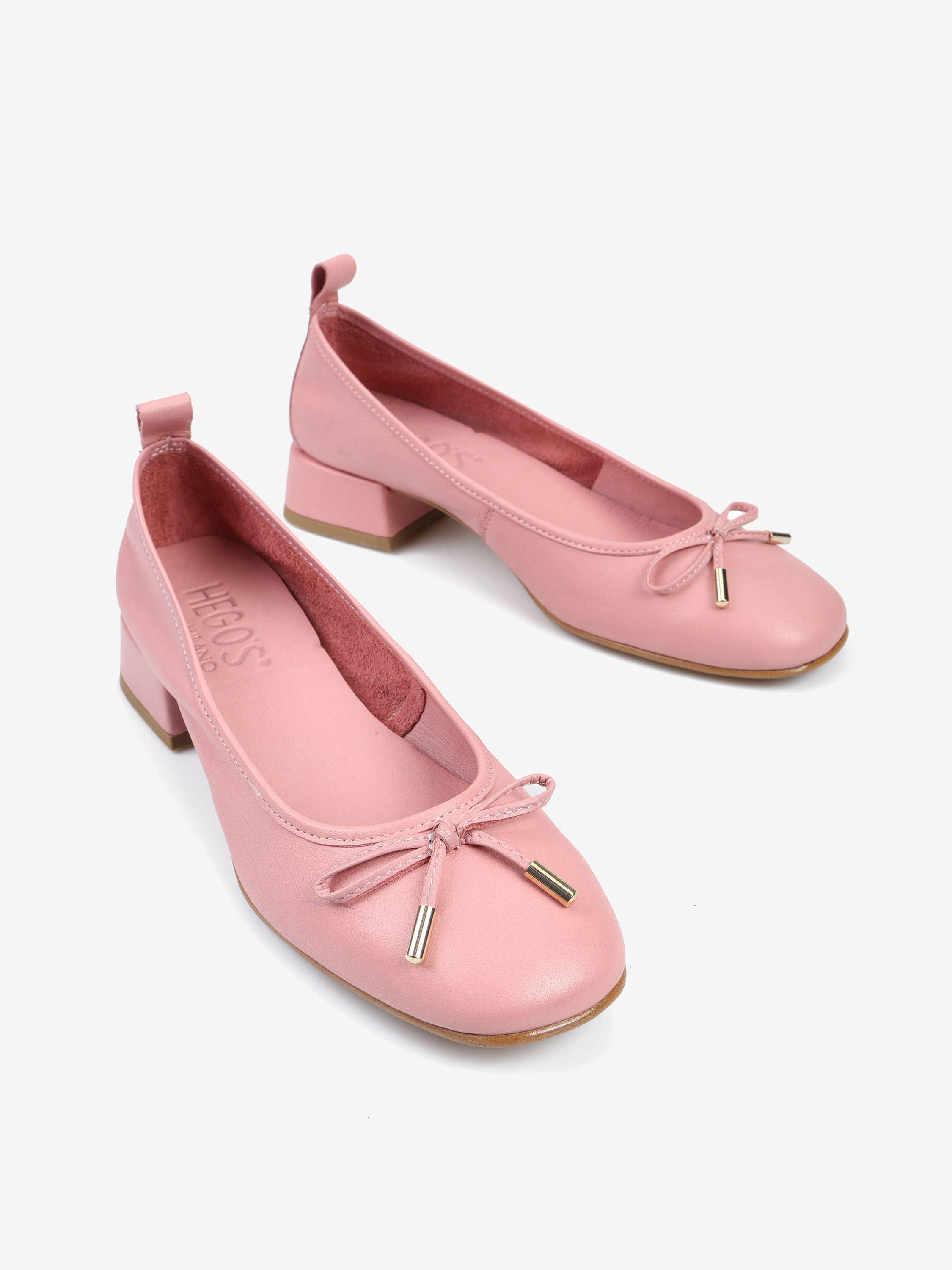 Baleriny na niskim obcasie wykonane z miękkiej, delikatnej skóry. Ozdobna kokardka z metalowymi skuwkami.