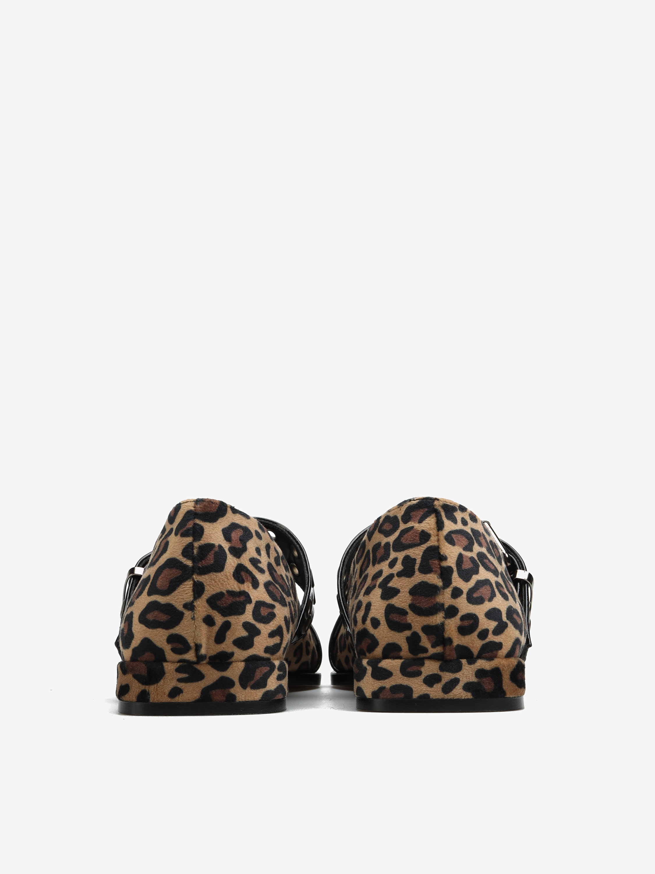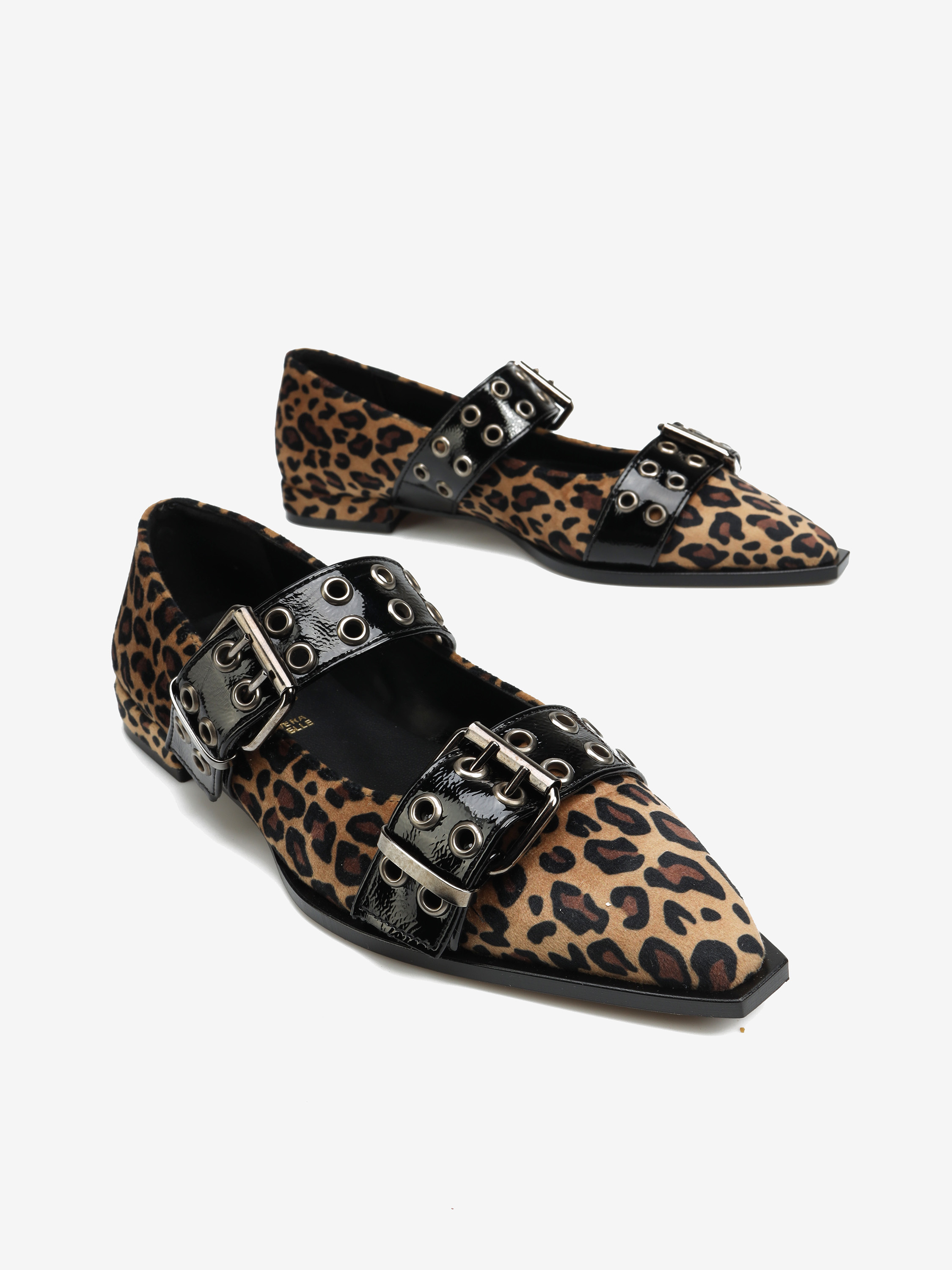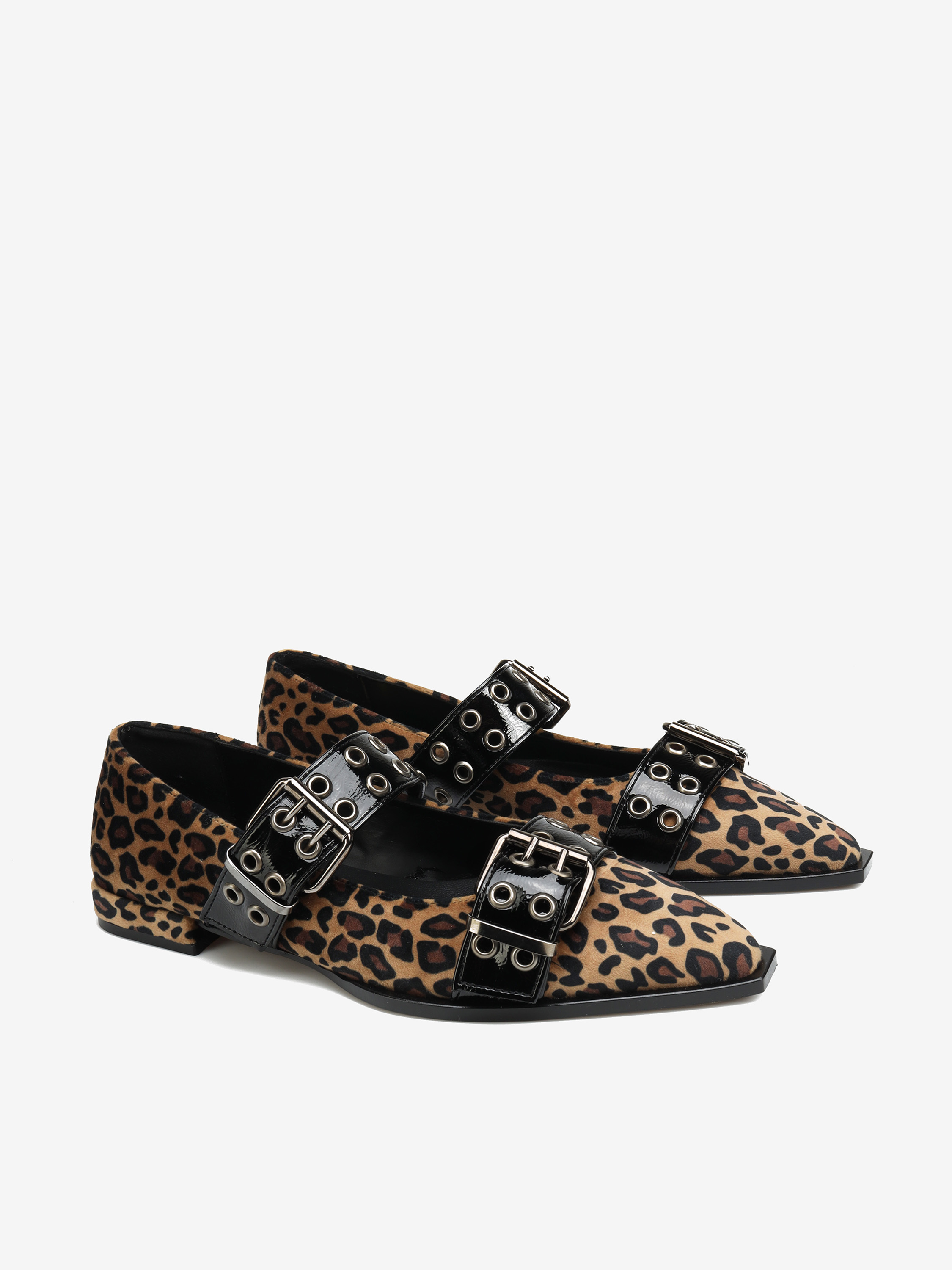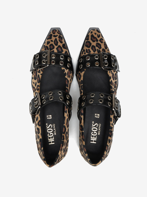 Baleriny wykonane z materiału w animal print zapinane i wykończone wyrazistą klamrą.