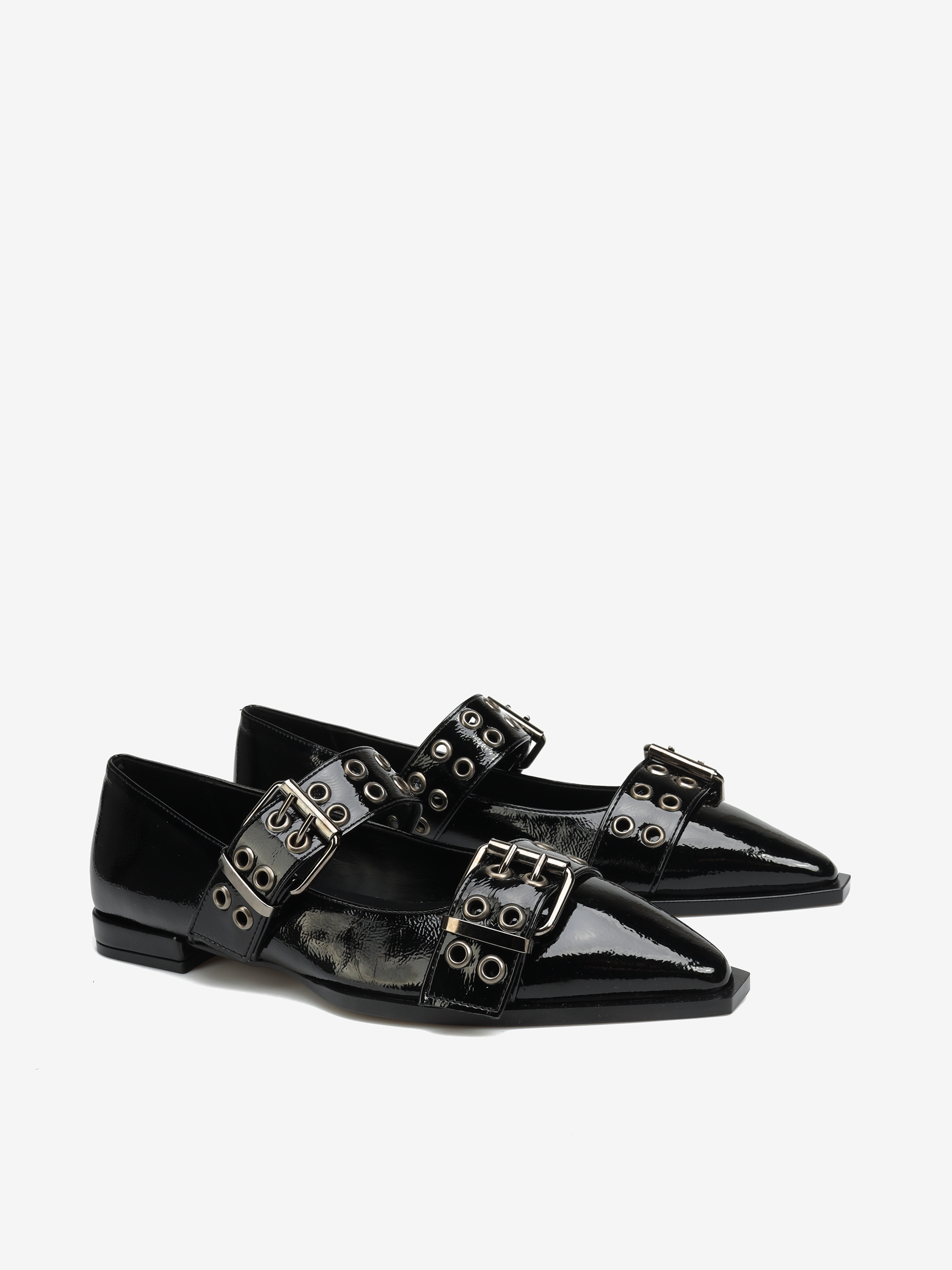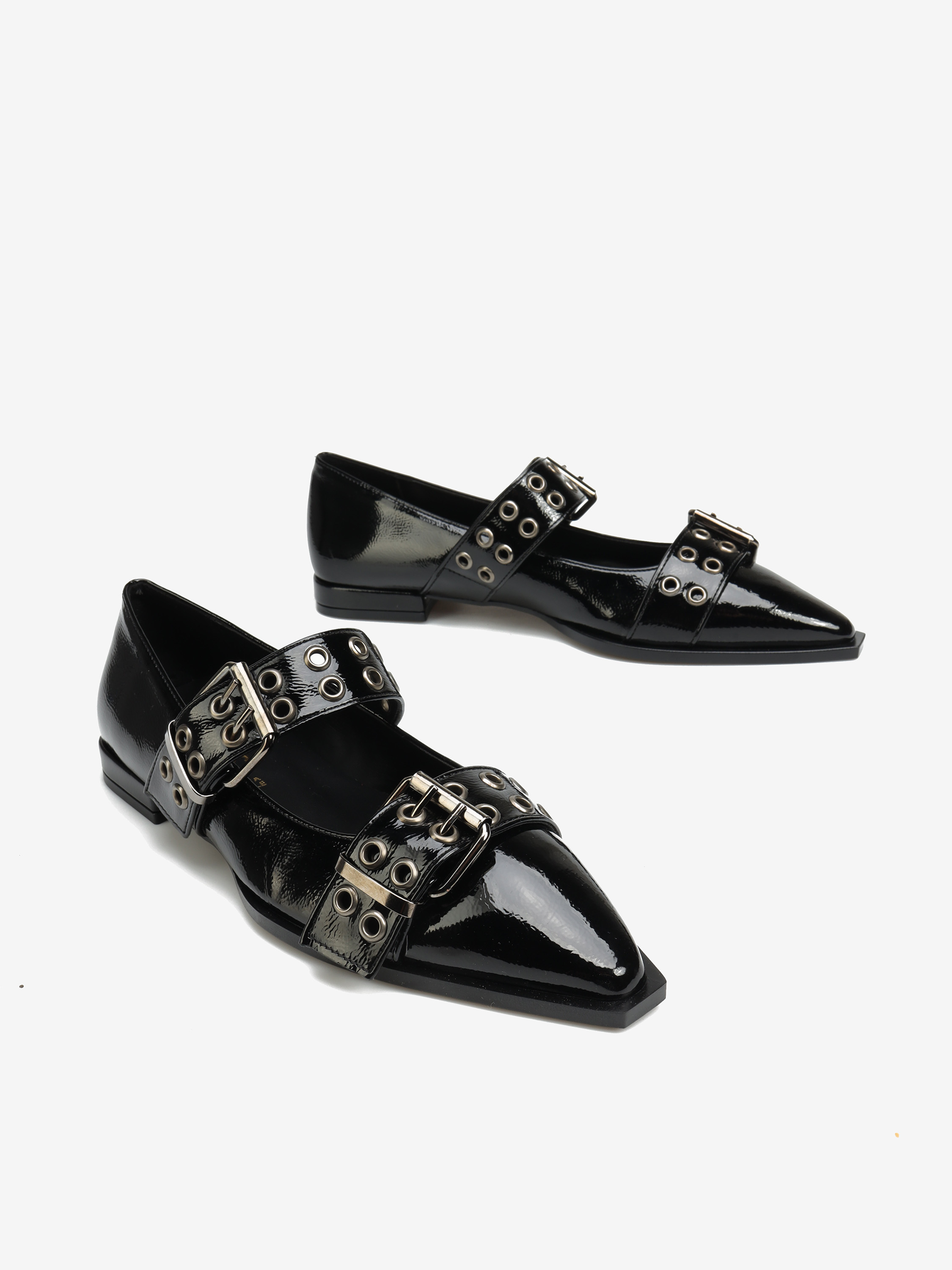 Czarne baleriny wykonane ze skóry ekologicznej zapinane i wykończone wyrazistą klamrą.