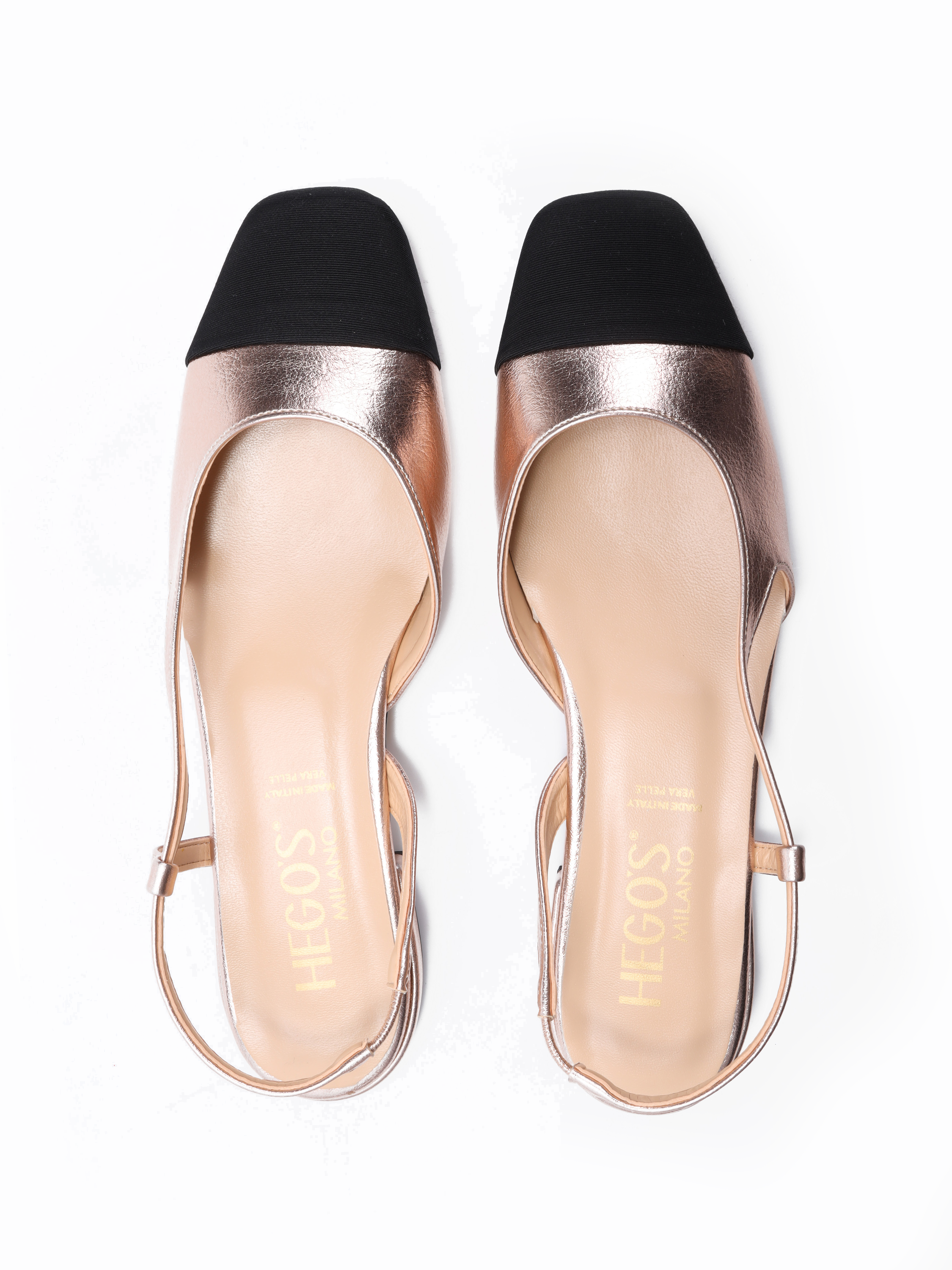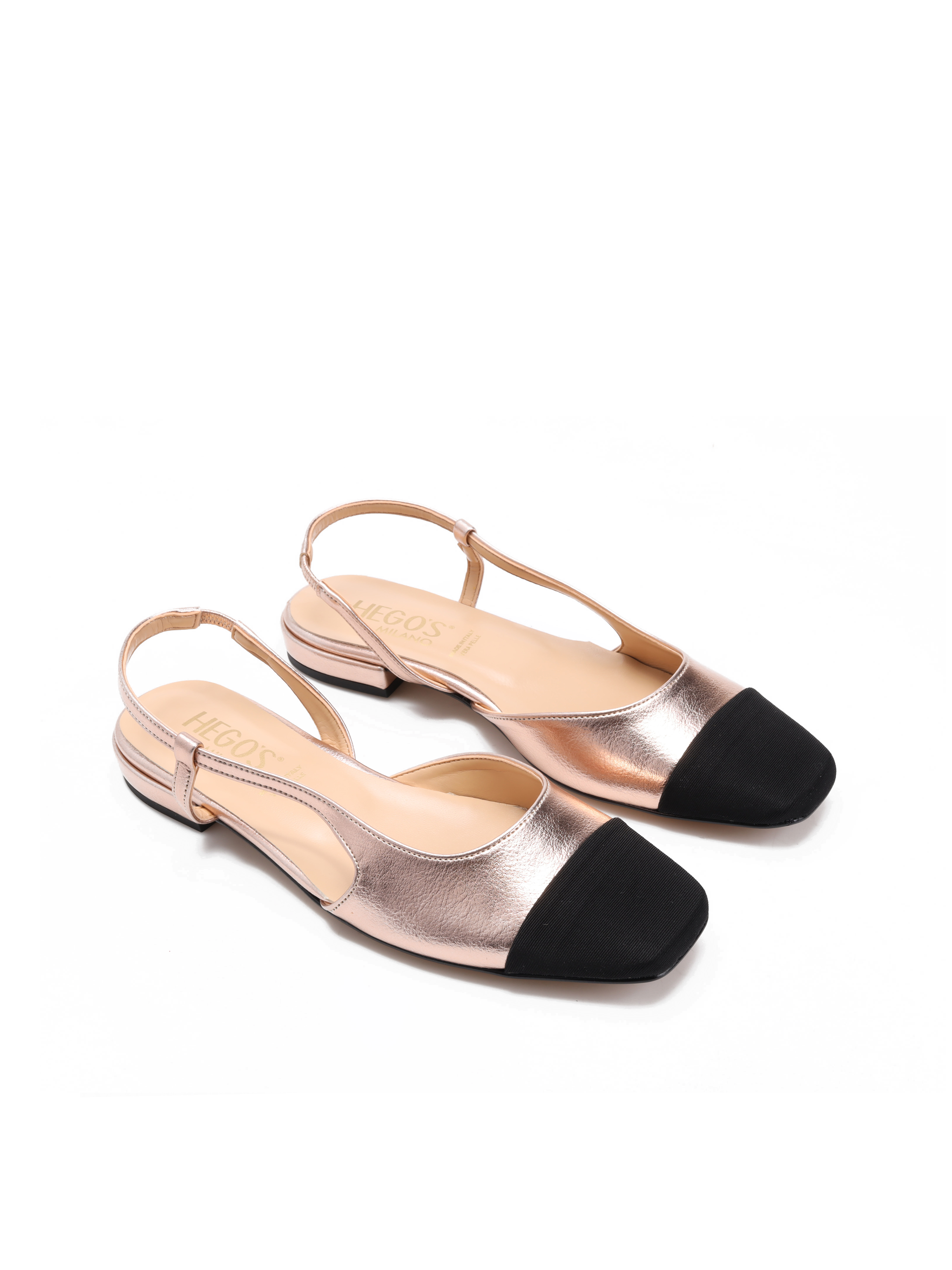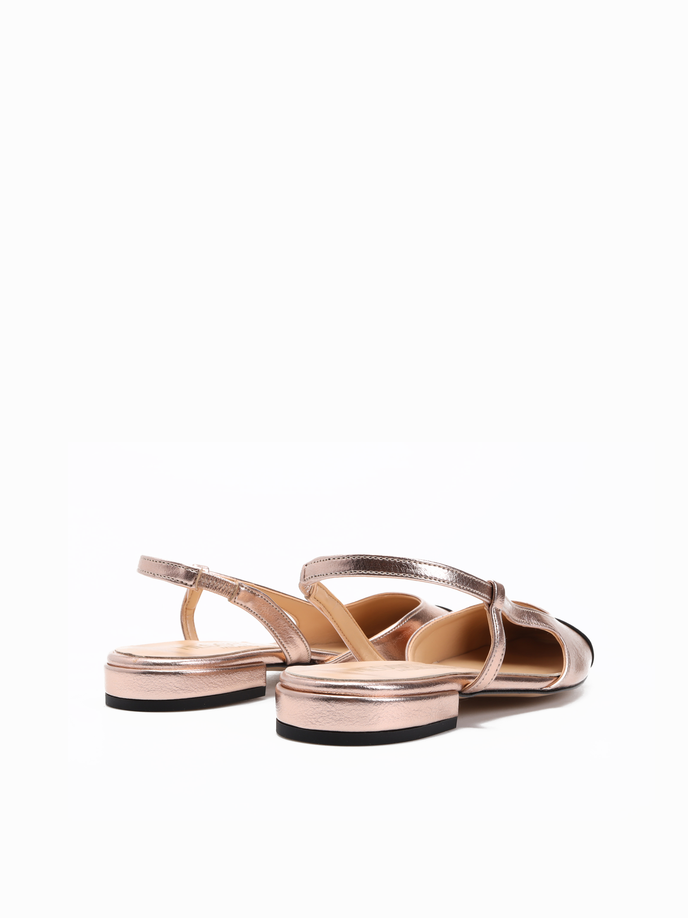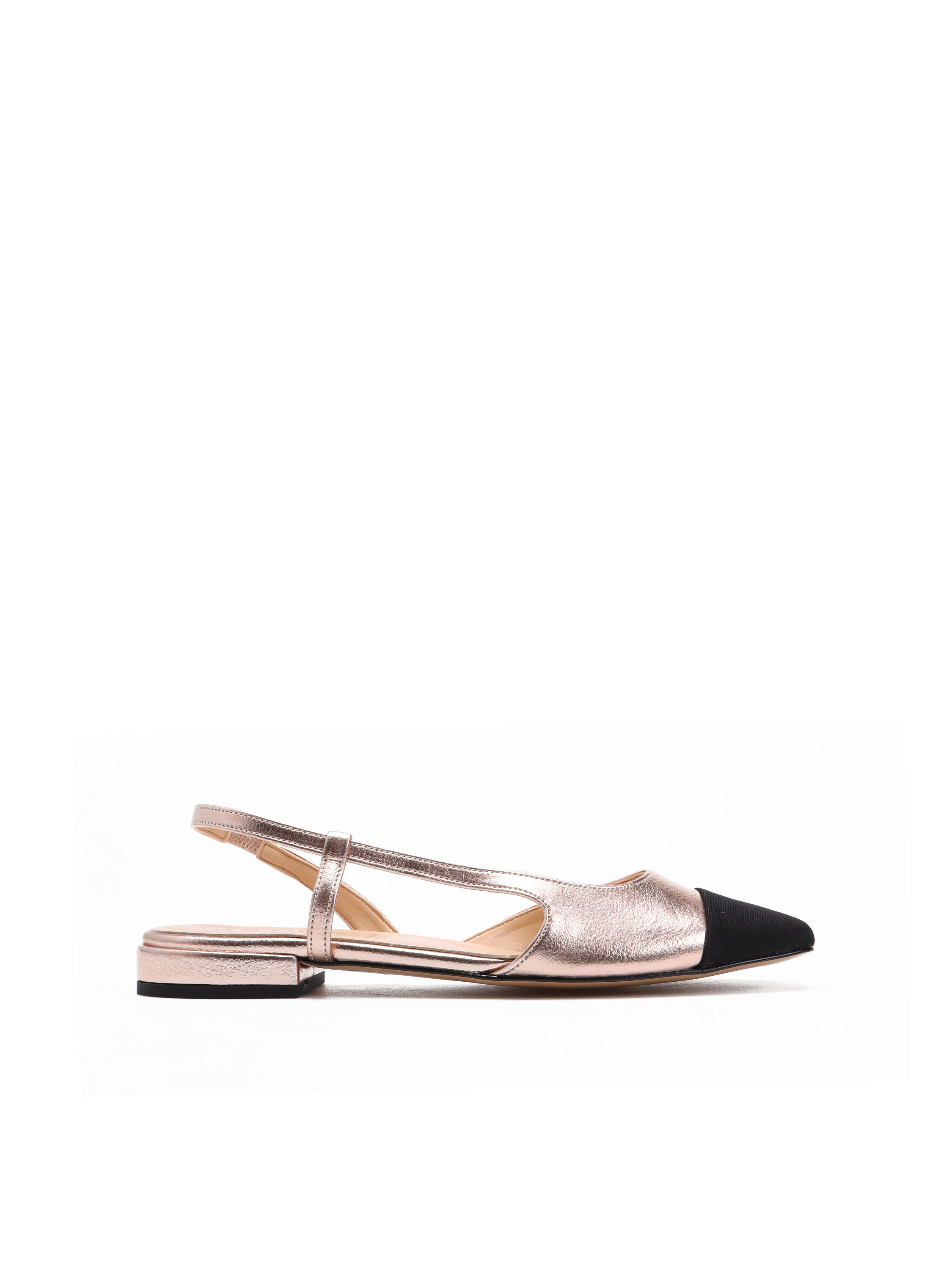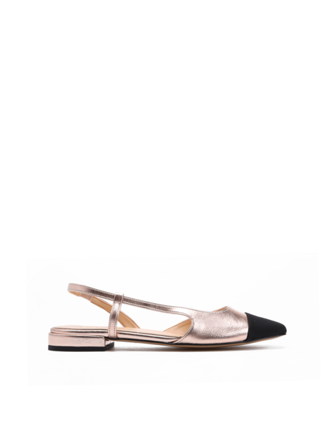 Baleriny z odkrytą piętą to Trend sezonu. Klasyczny fason na płaskim obcasie. Pasek przy pięcie posiada wszytą gumkę, która trzyma stopę. Model z okrągłym, czarnym noskiem w stylu Chanel.