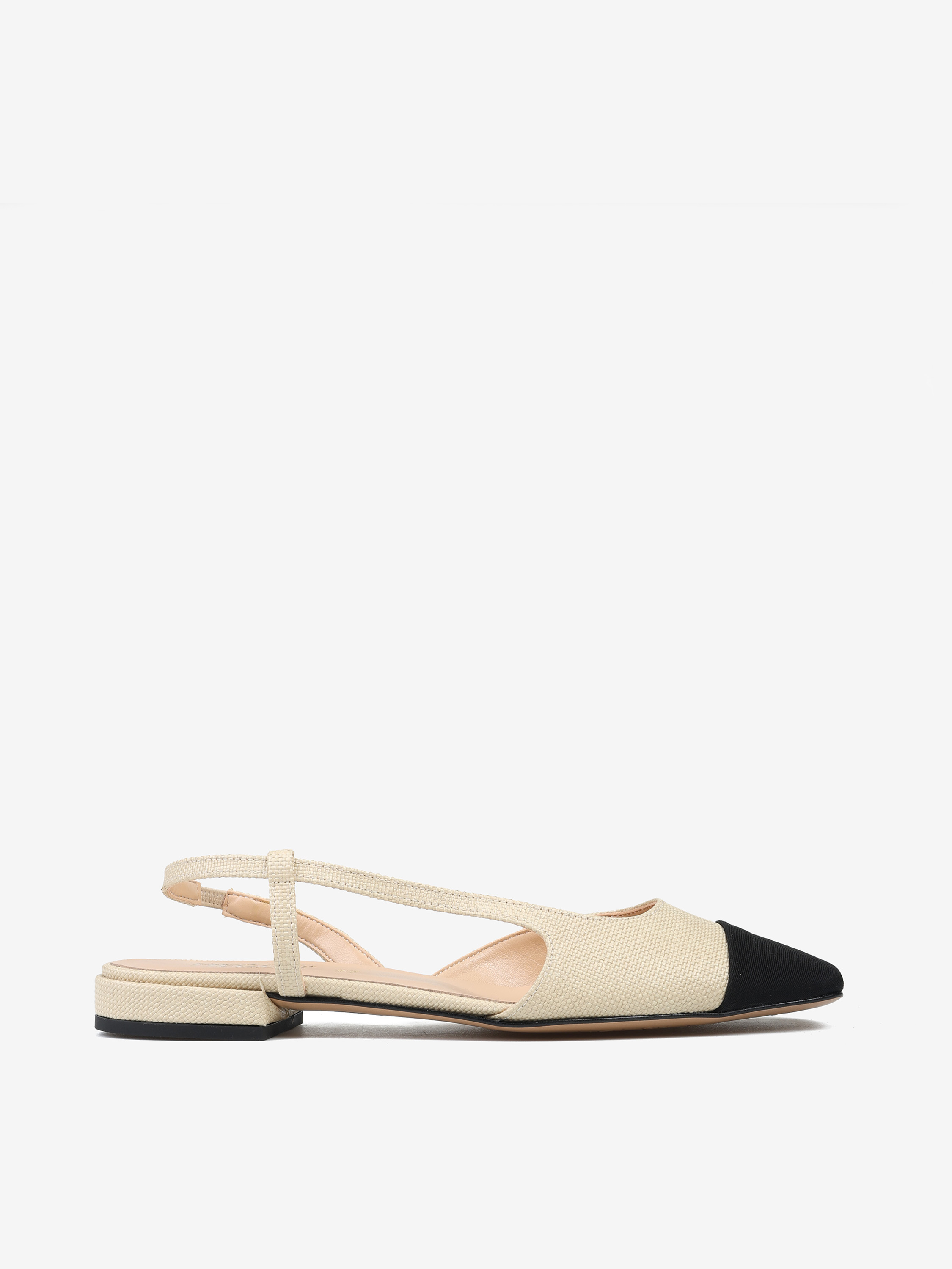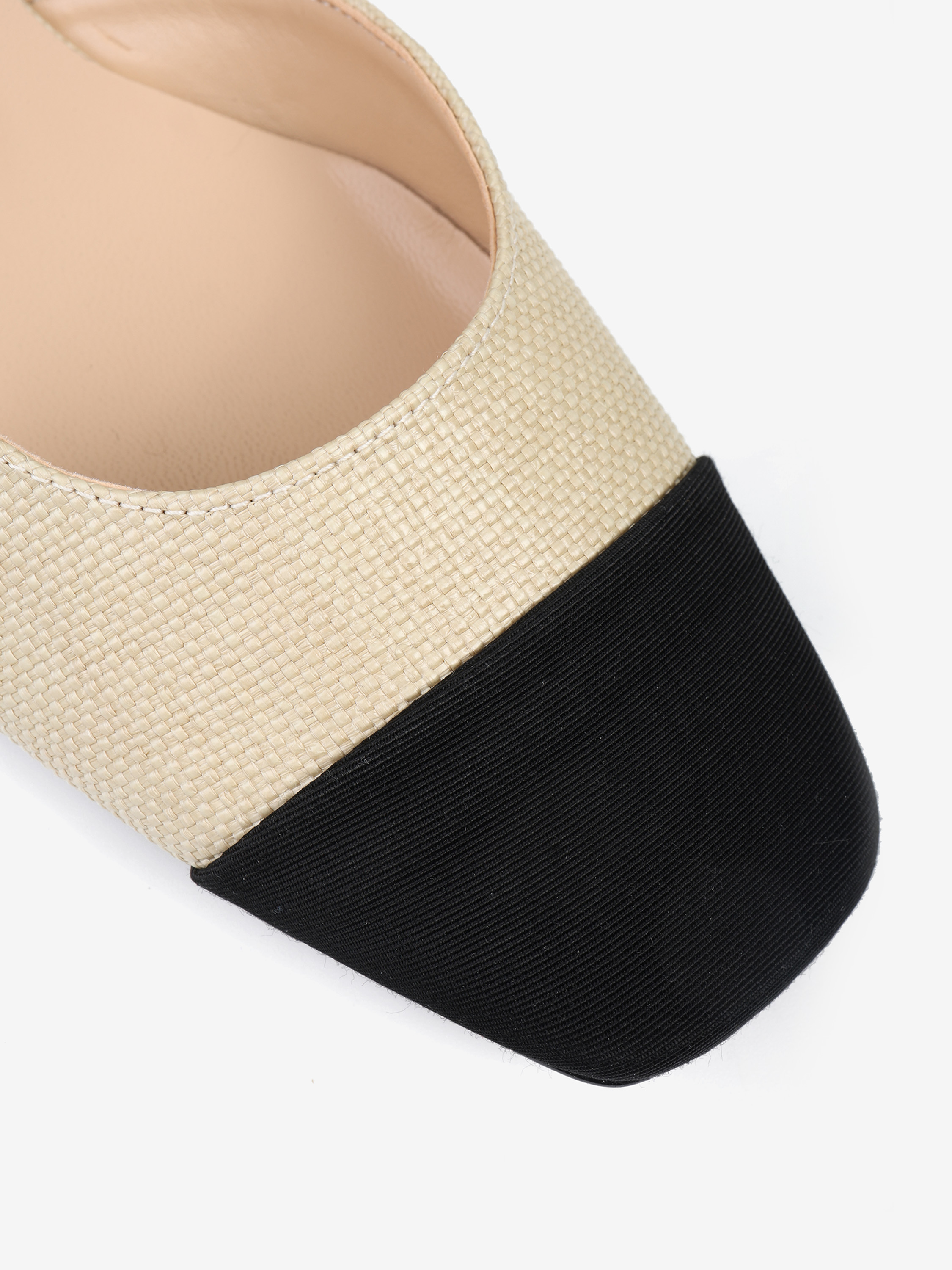 Asymetryczne baleriny z odkrytą piętą wykonane z plecionej tkaniny. Kwadratowy, czarny nosek w szpic.