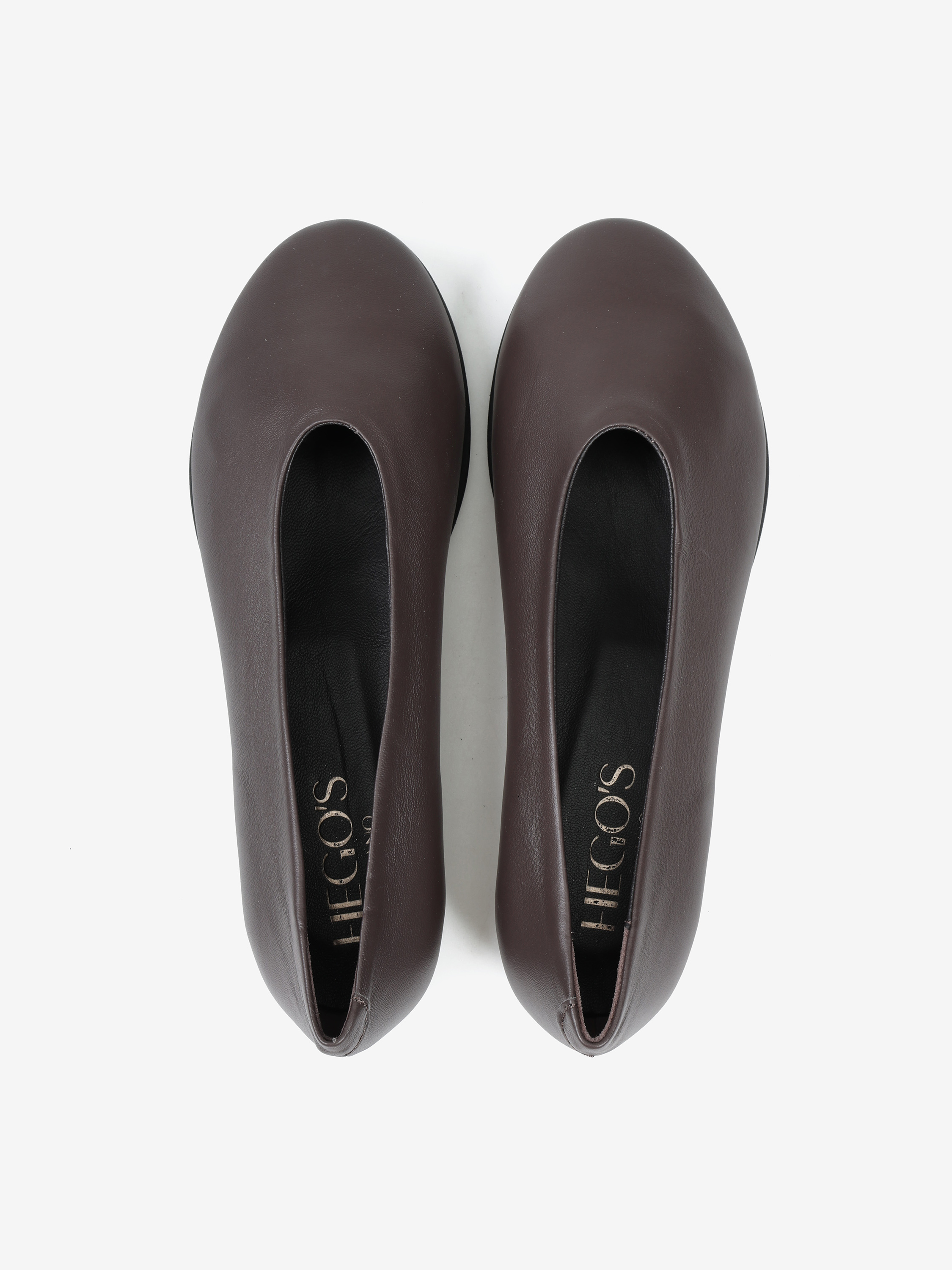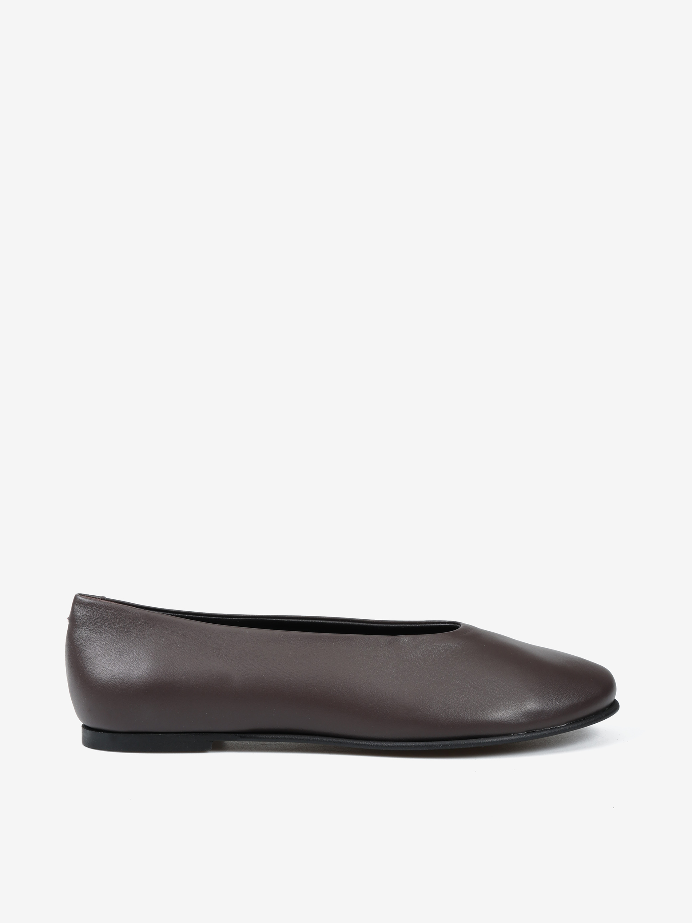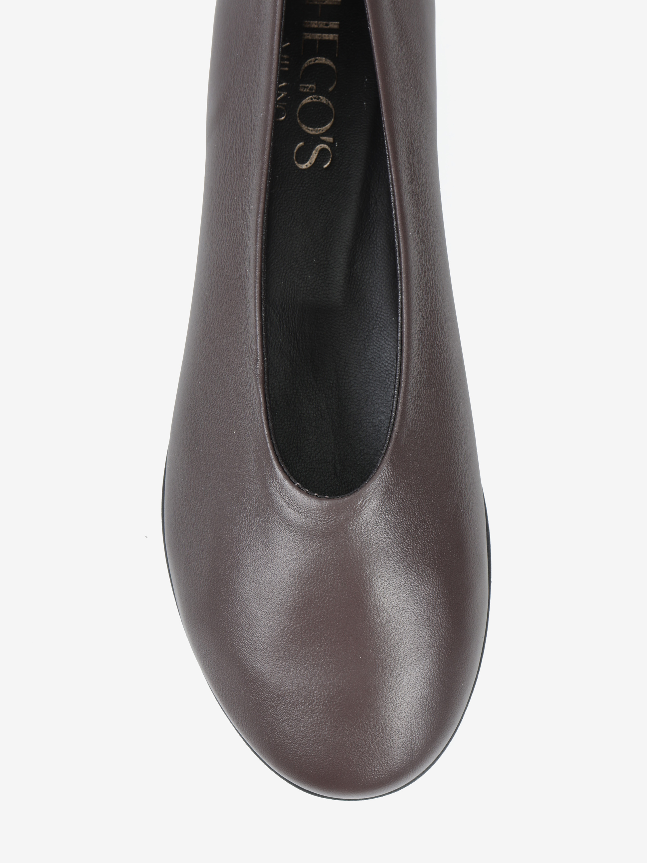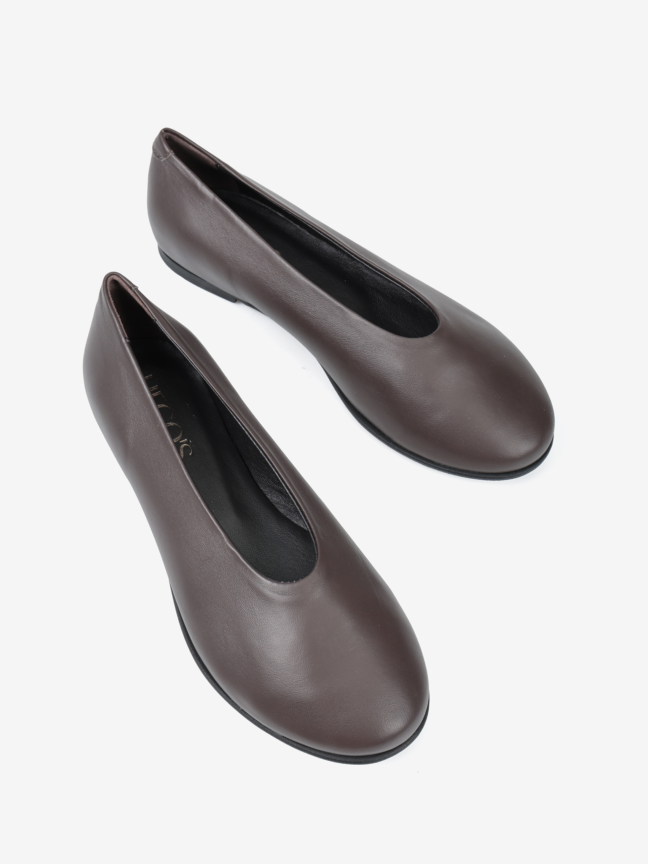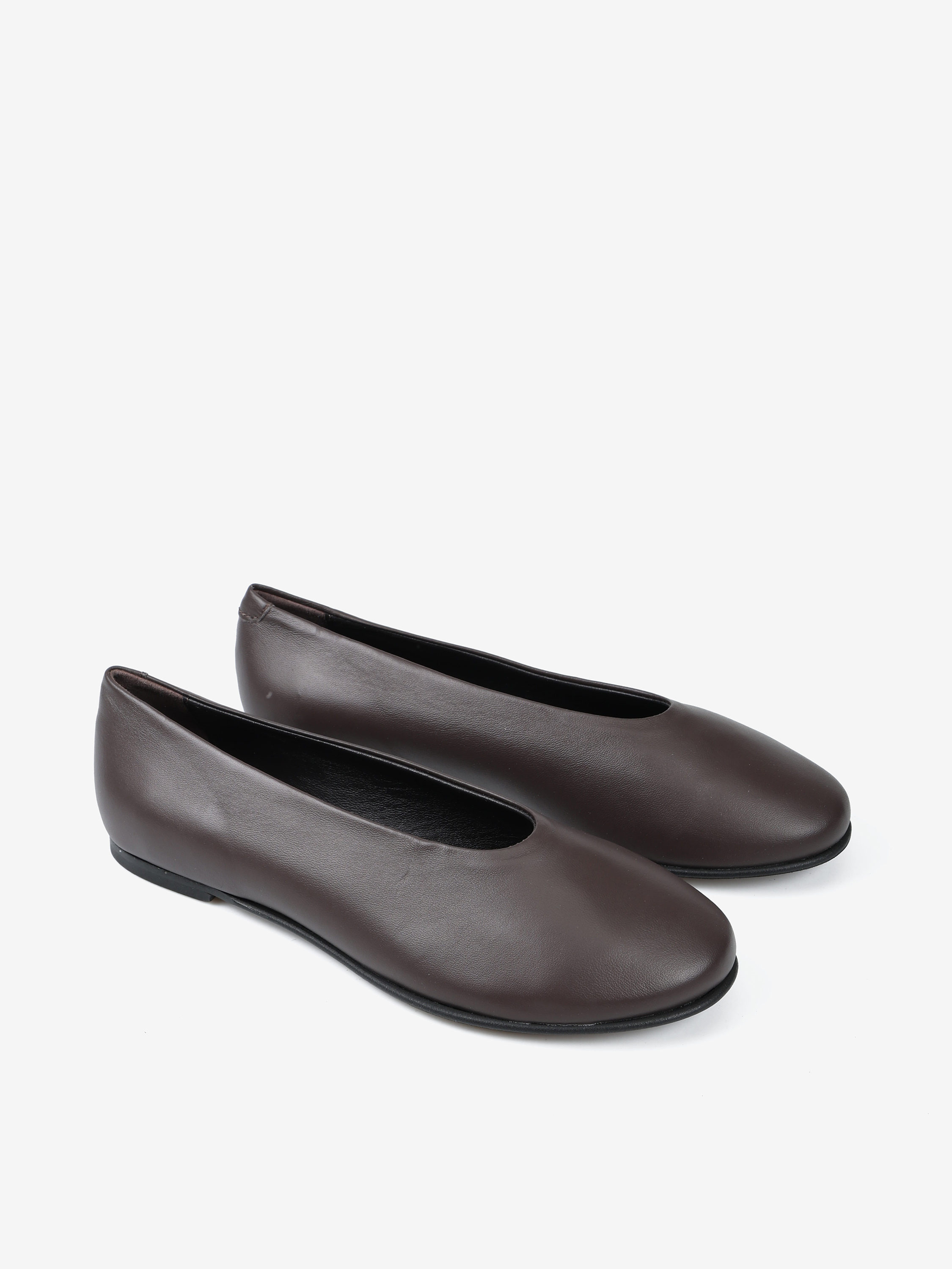 Brązowe, proste baleriny wykonane z miękkiej i delikatnej skóry. Owalne wycięcie z zabudowanymi brzegami.