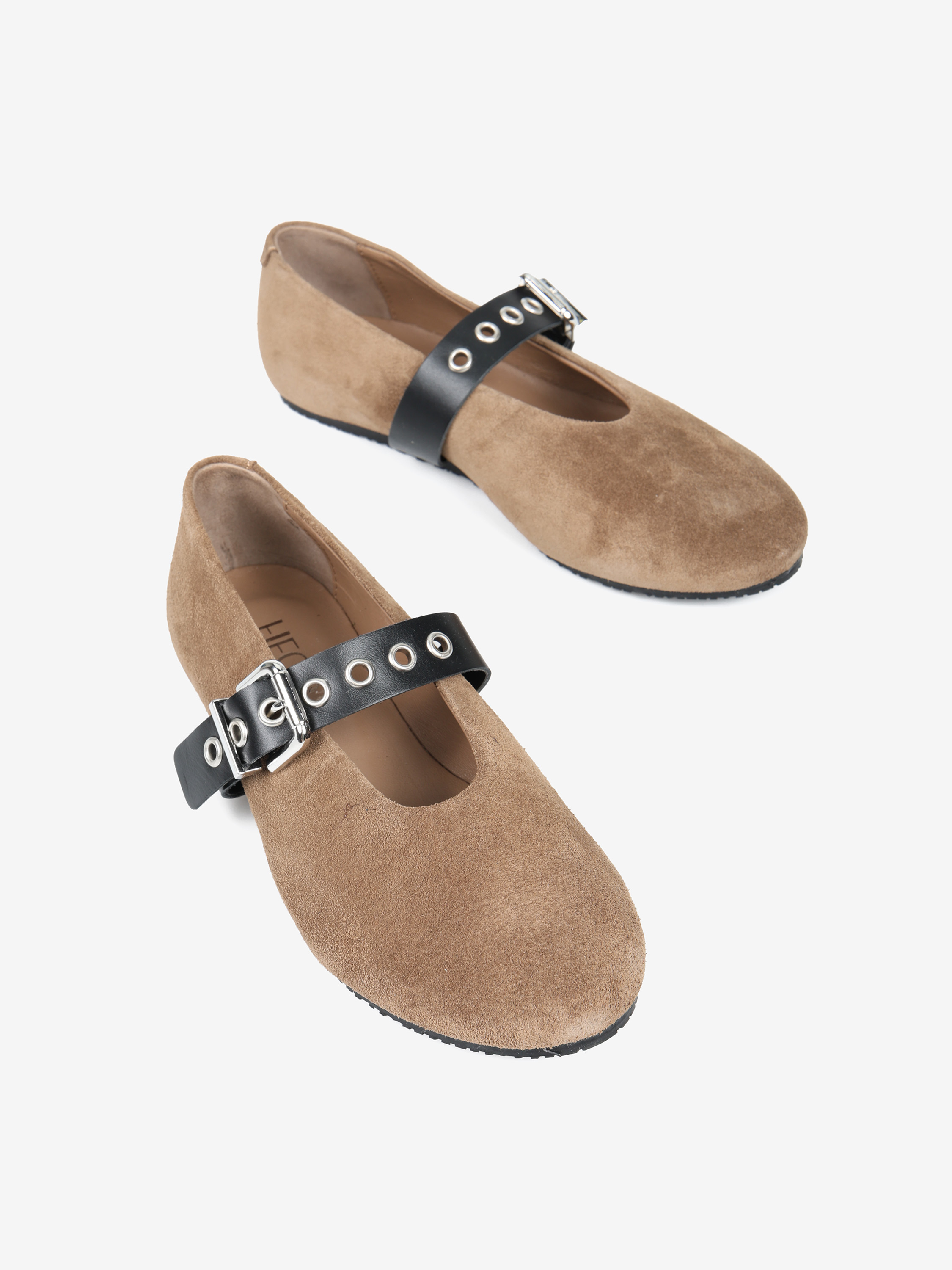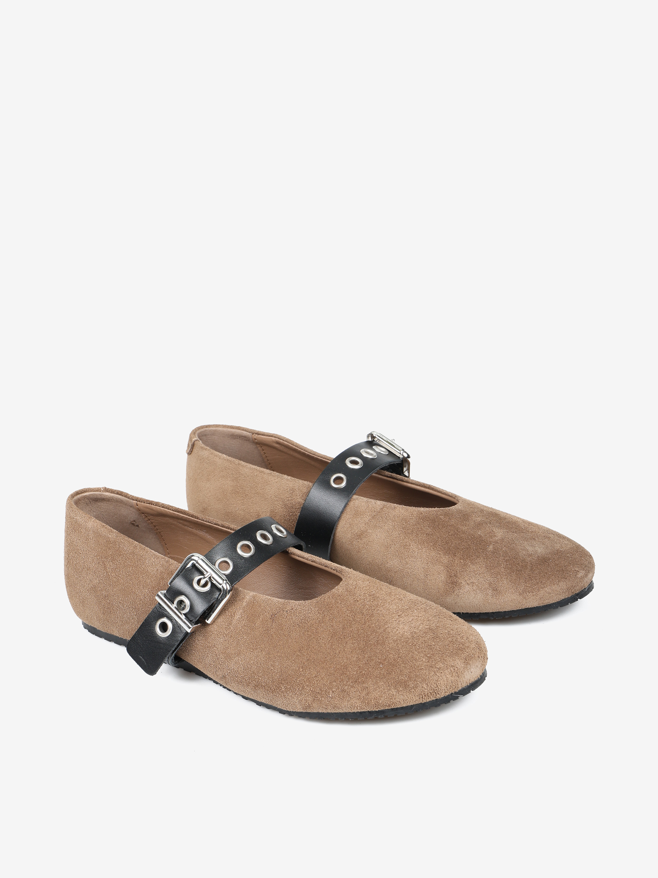 Zamszowe baleriny z regulowanym, skórzanym paskiem. Owalne wycięcie z zabudowanymi brzegami.