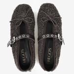 Baleriny z tkaniny imitującej futro baranka. Wiązana kokardka i regulowany pasek umożliwiają idealne dopasowanie.