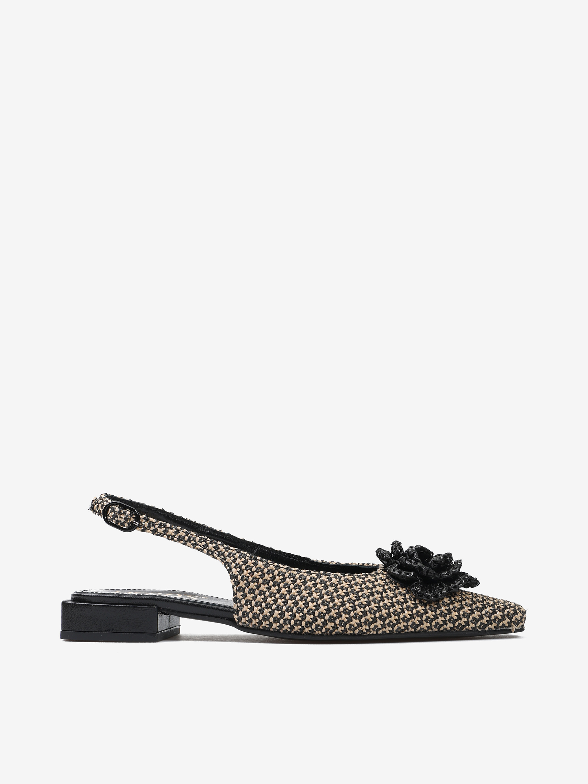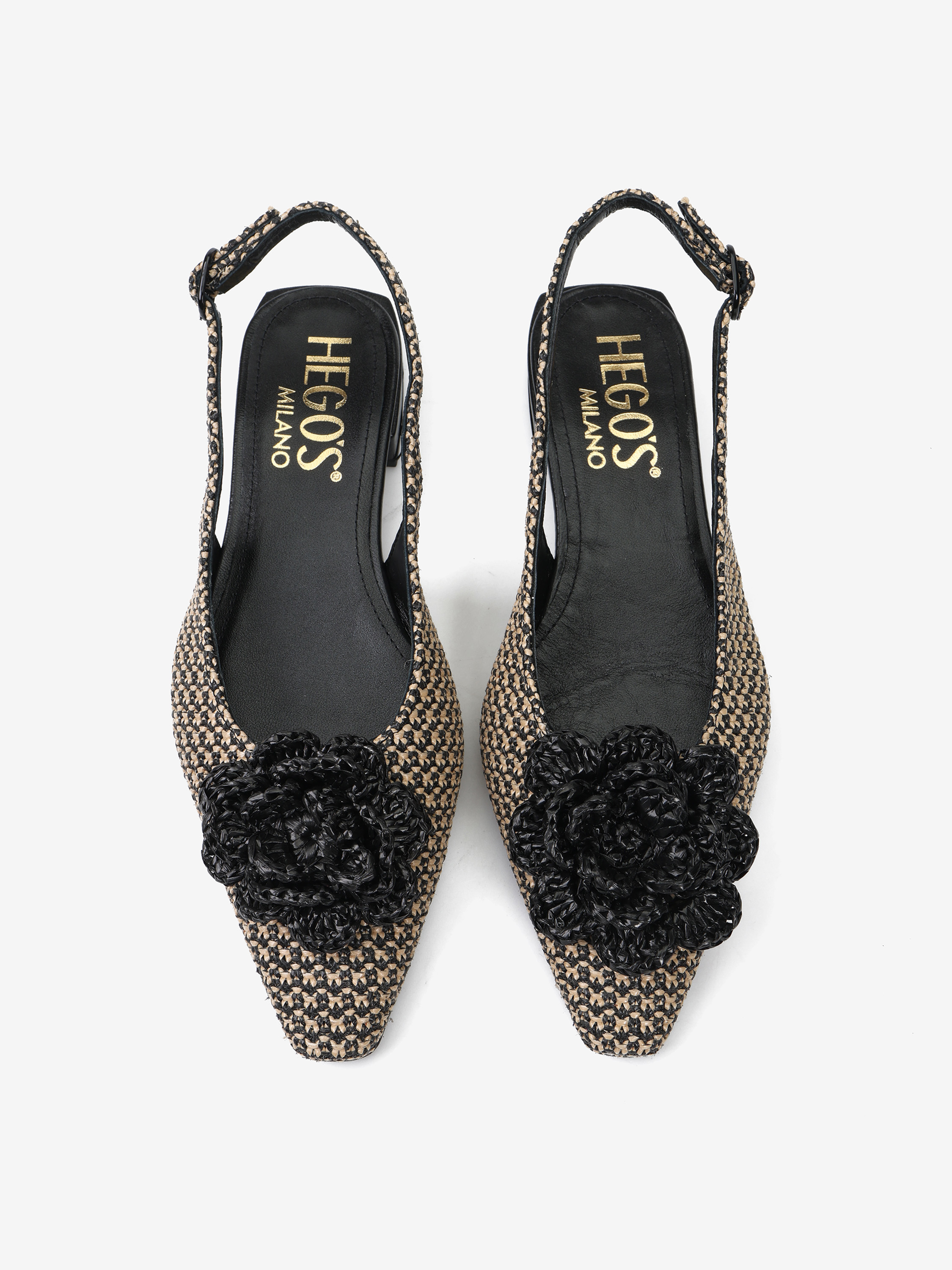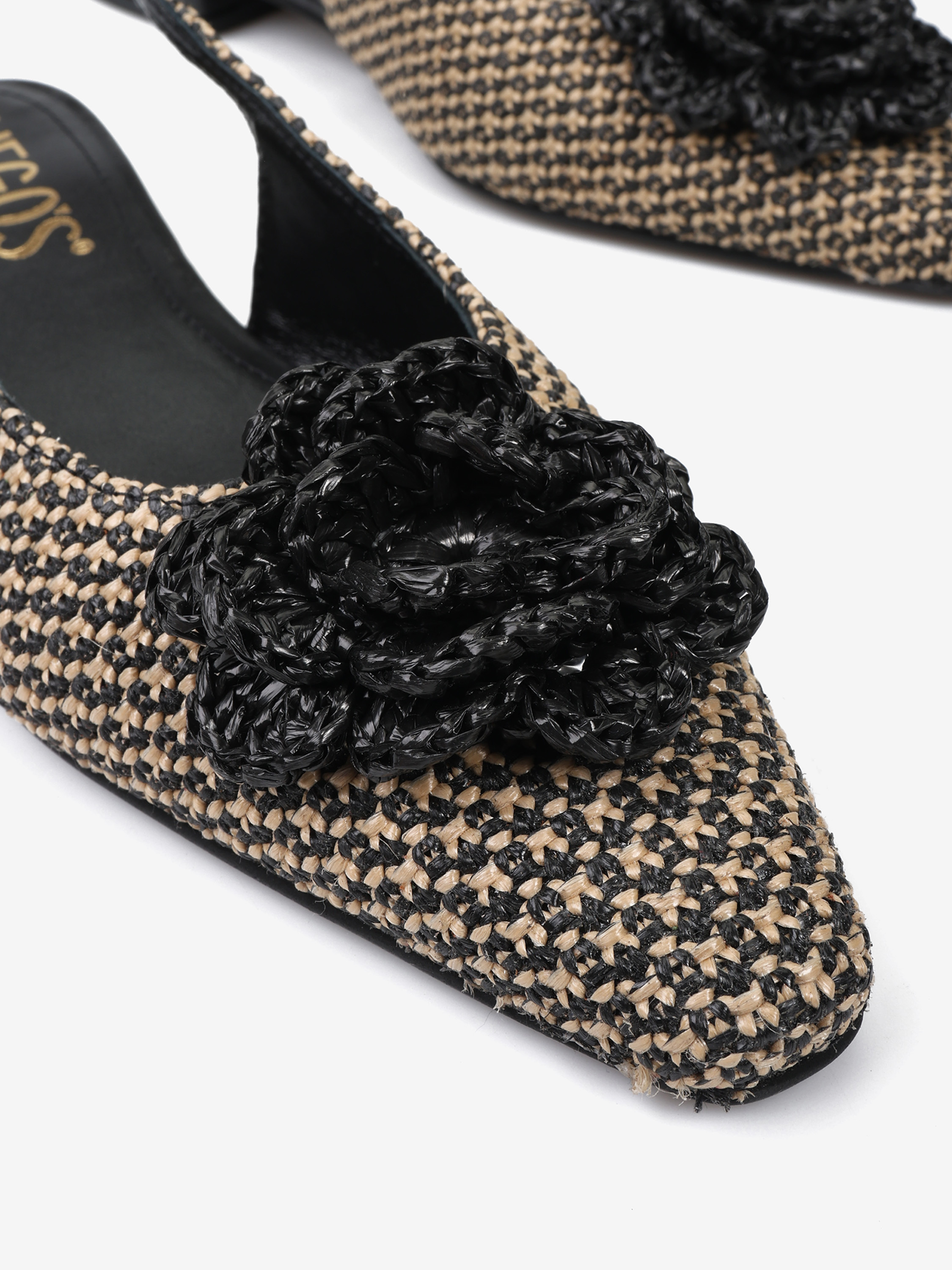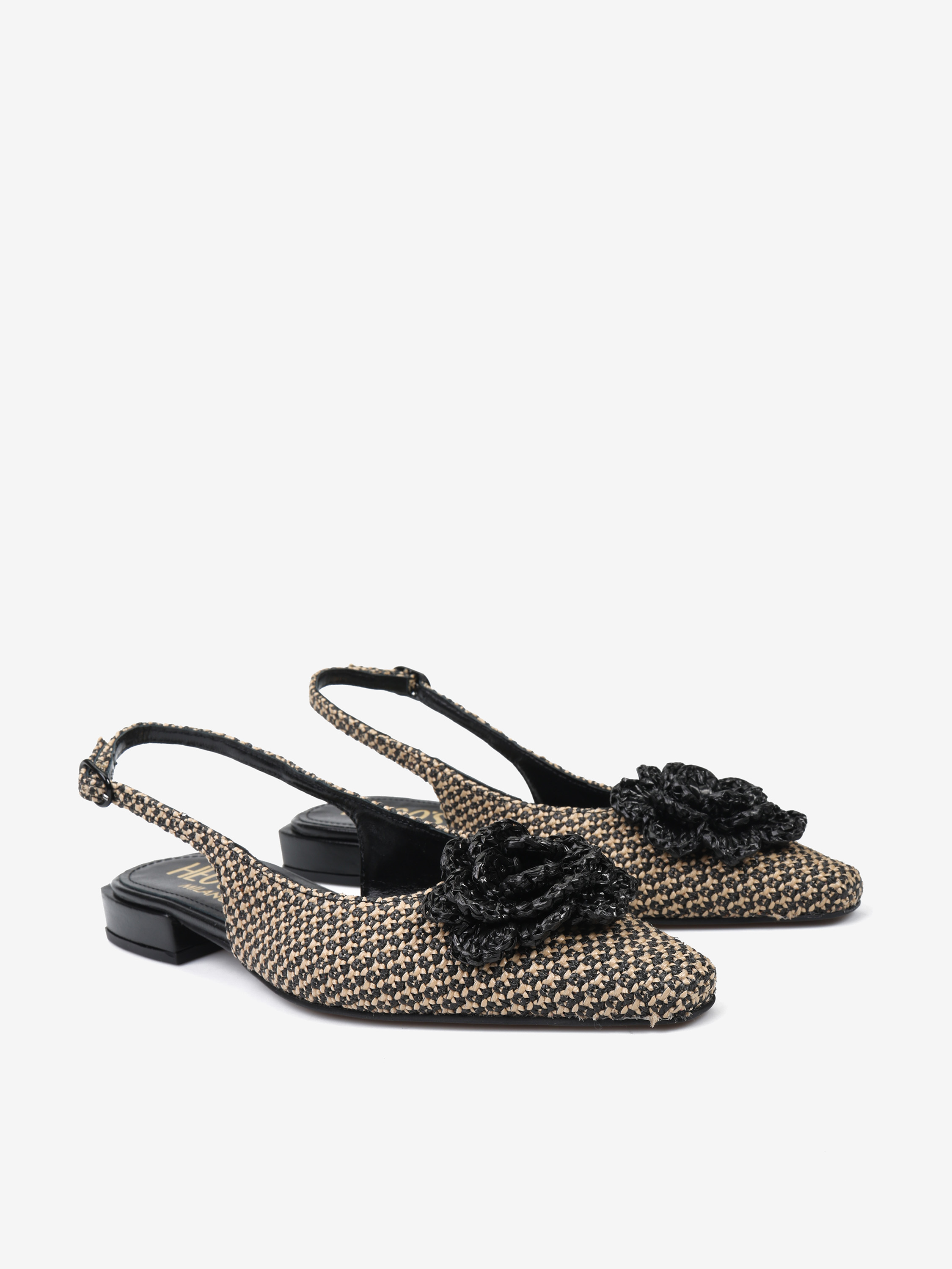 Baleriny z noskiem w szpic z ozdobnym kwiatem. Pleciona, dwukolorowa rafia i odkryta pięta z regulowanym paskiem.