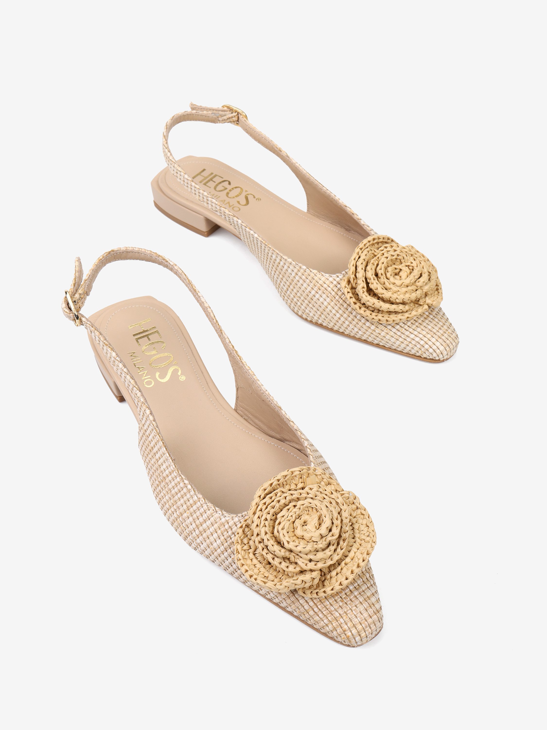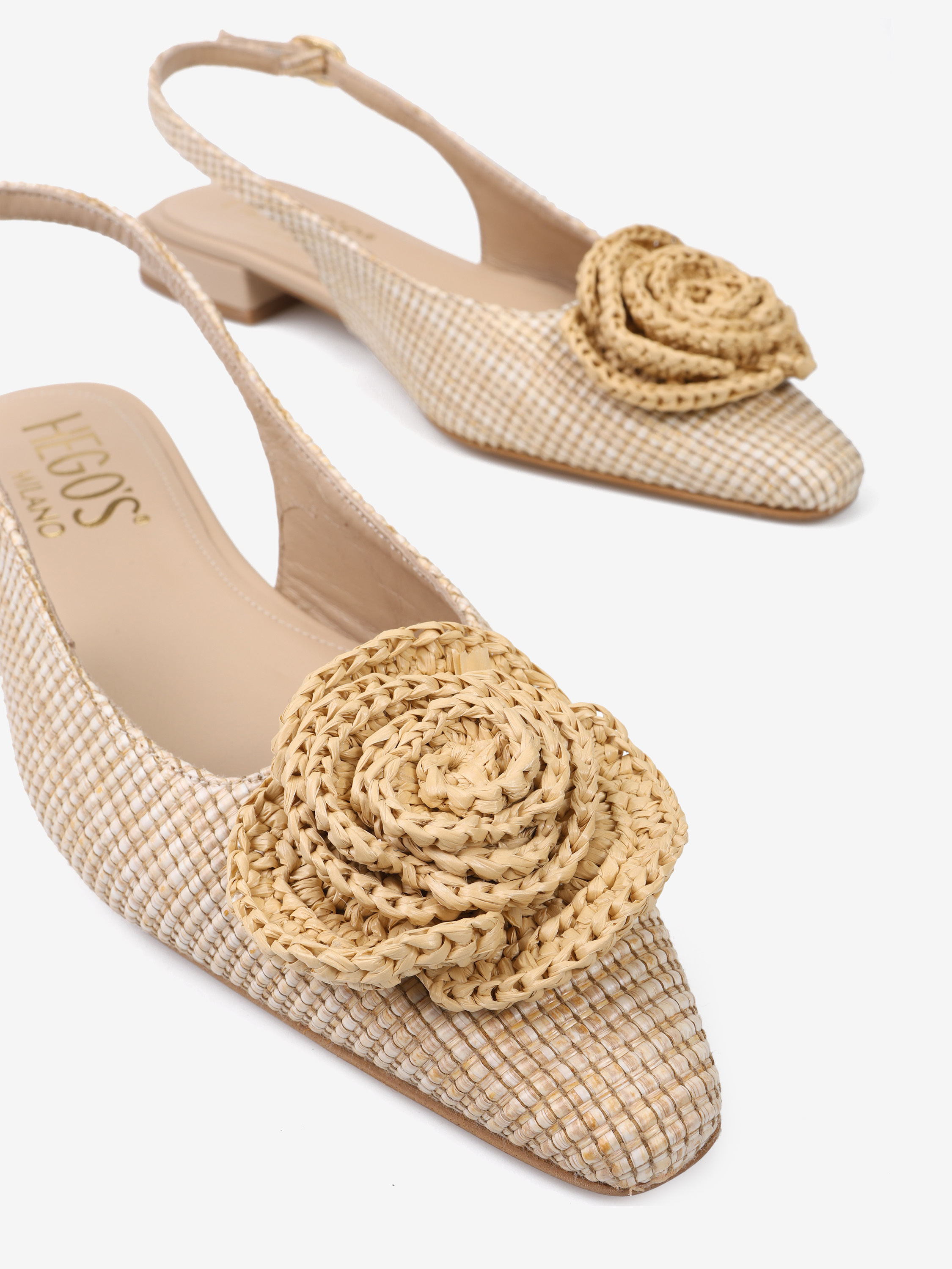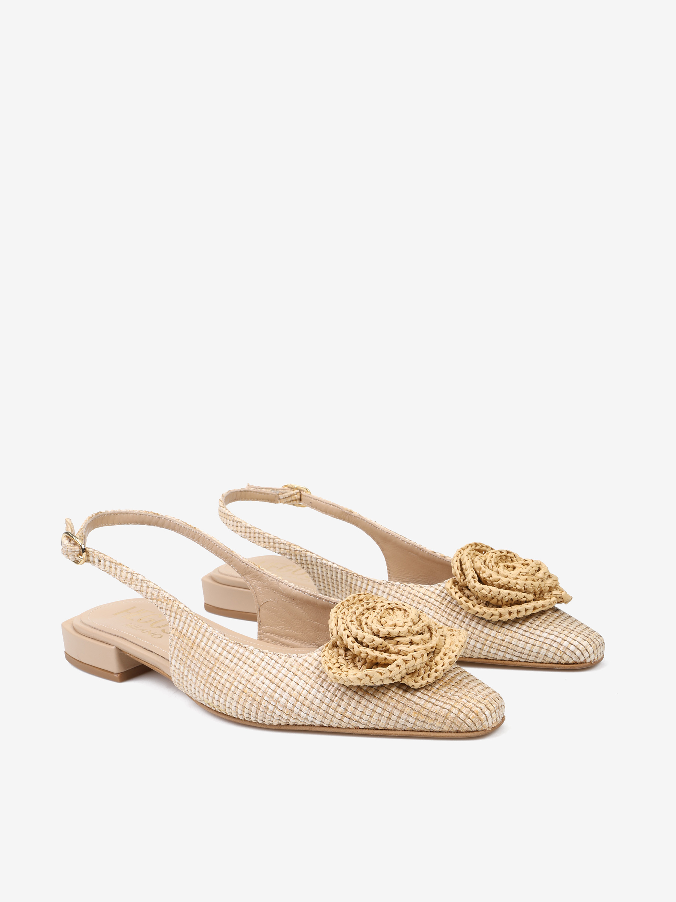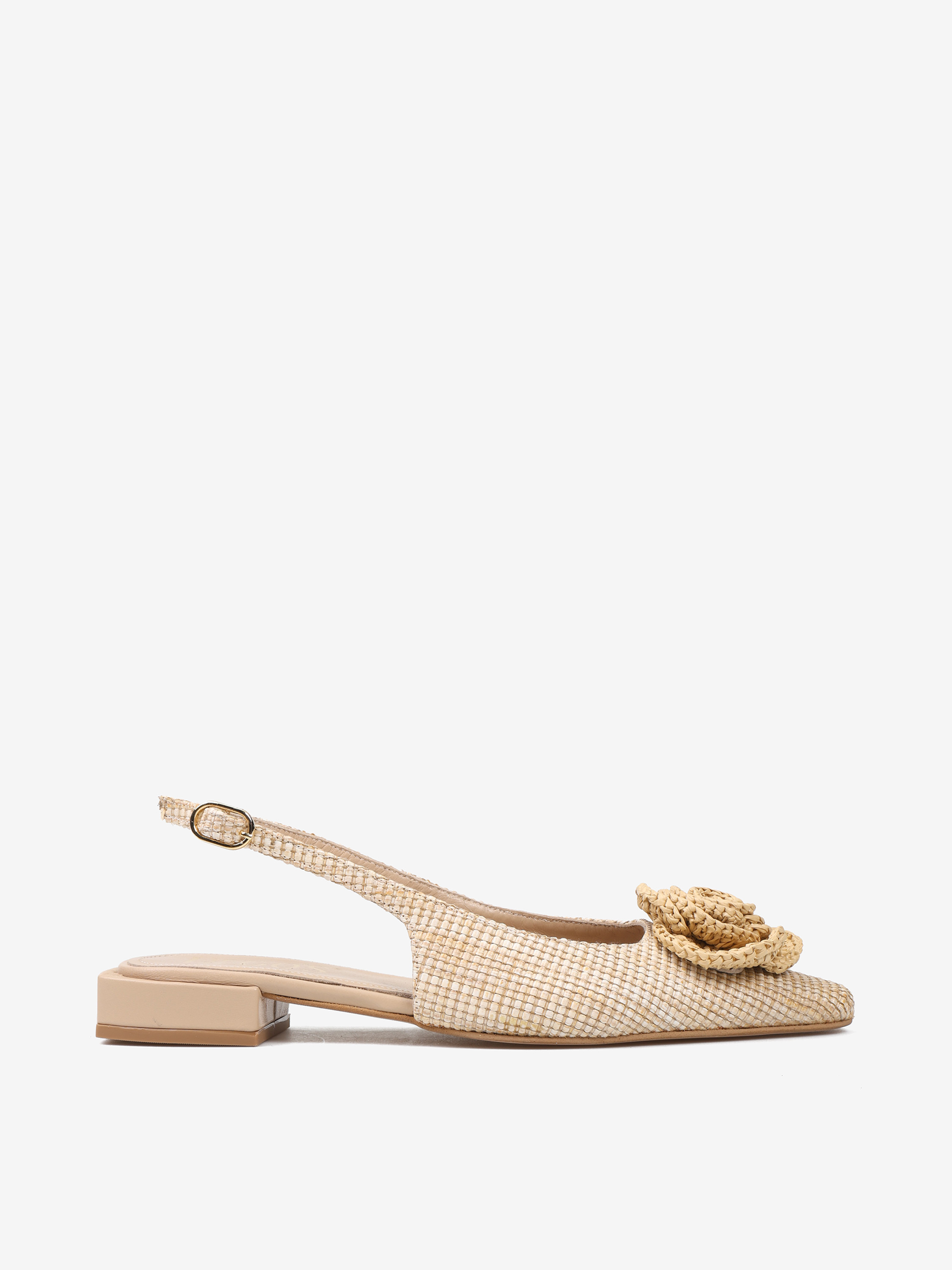 Baleriny z noskiem w szpic z ozdobnym kwiatem. Pleciona rafia i odkryta pięta z regulowanym paskiem.
