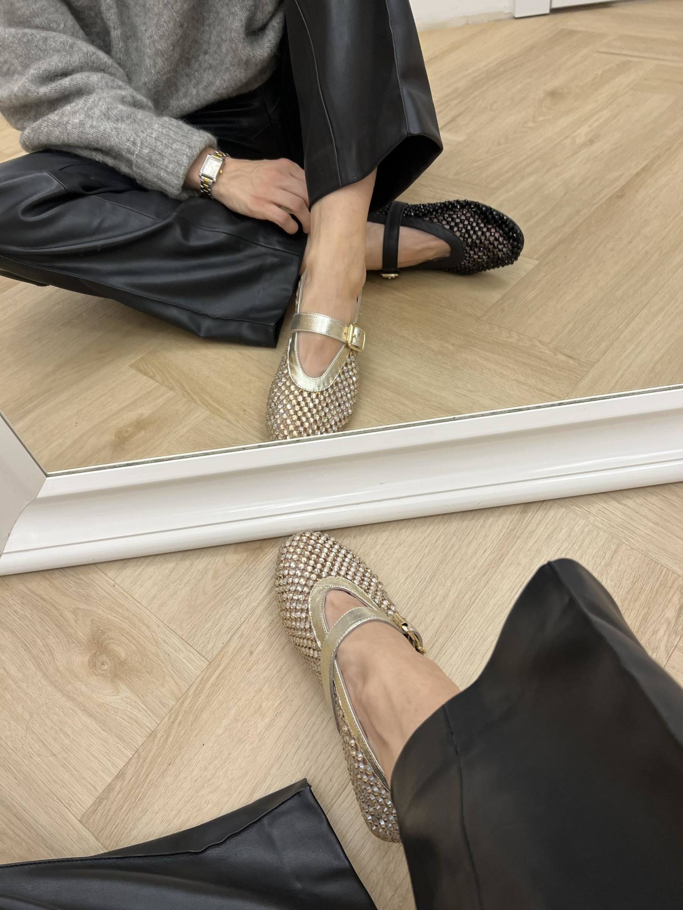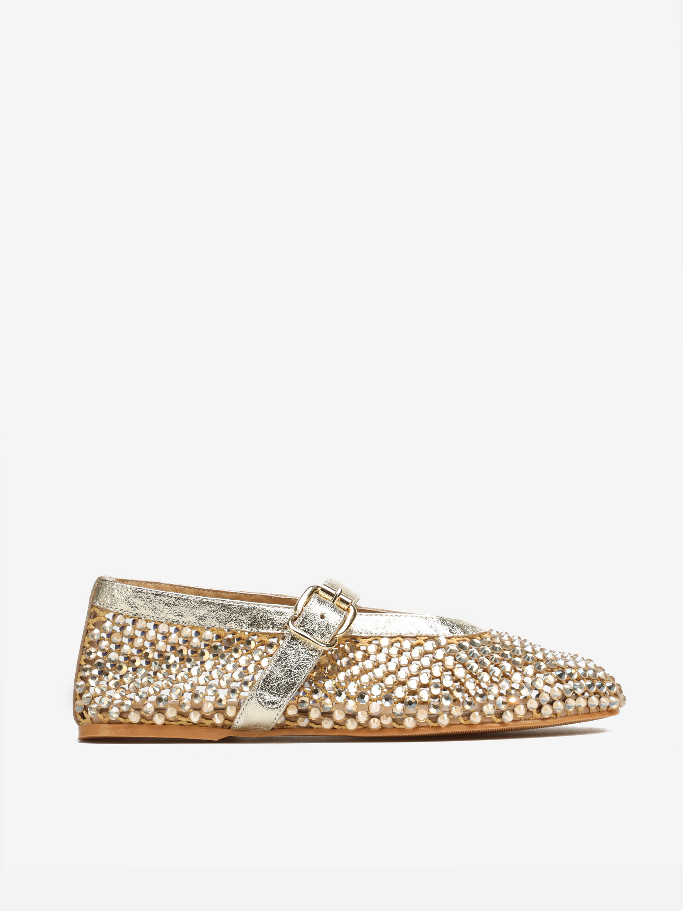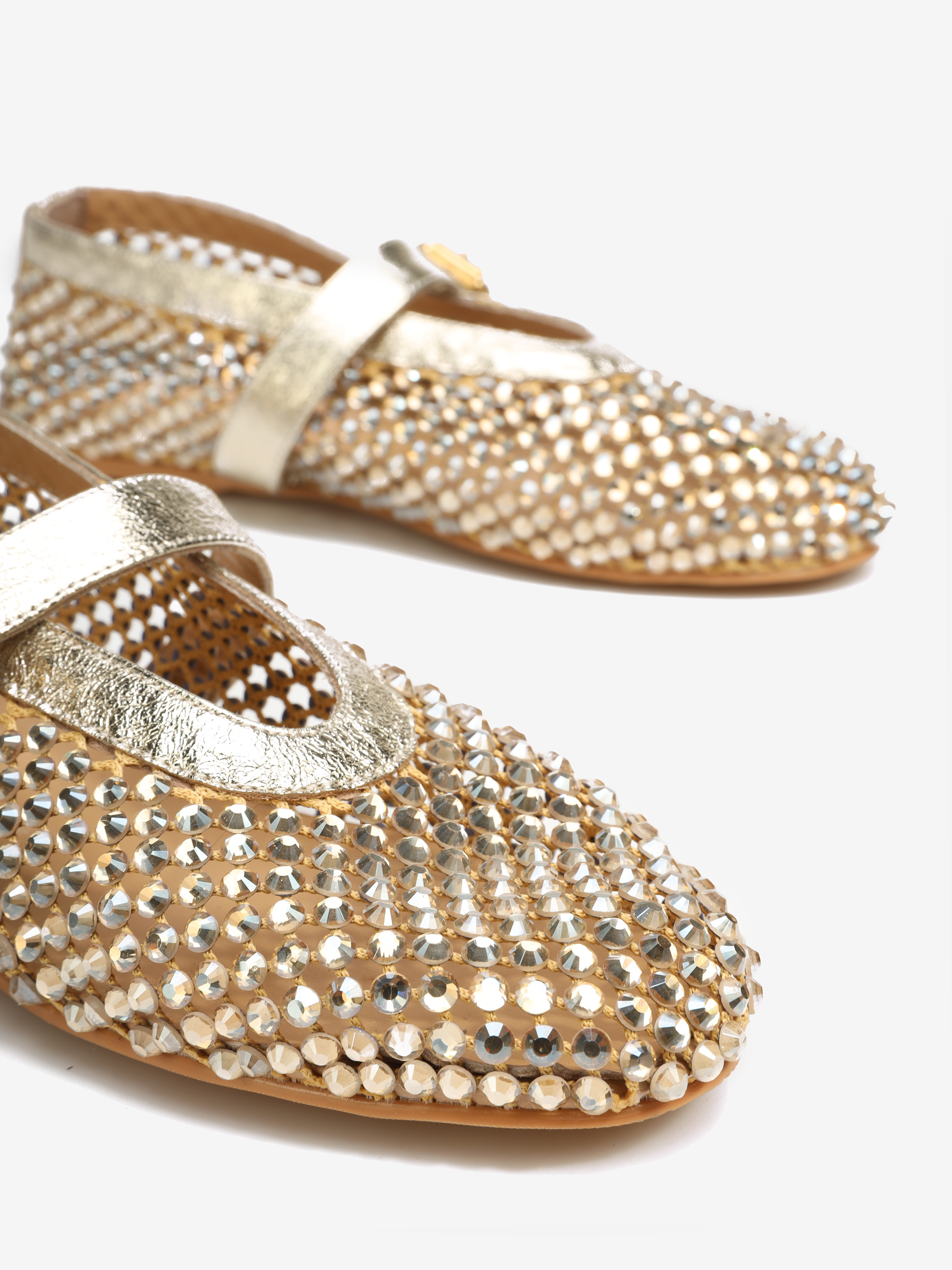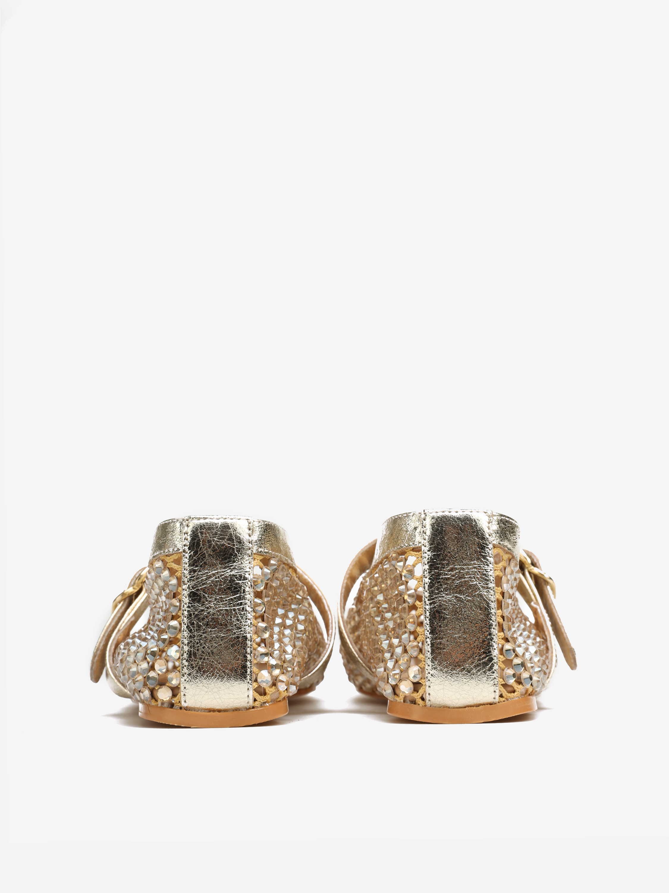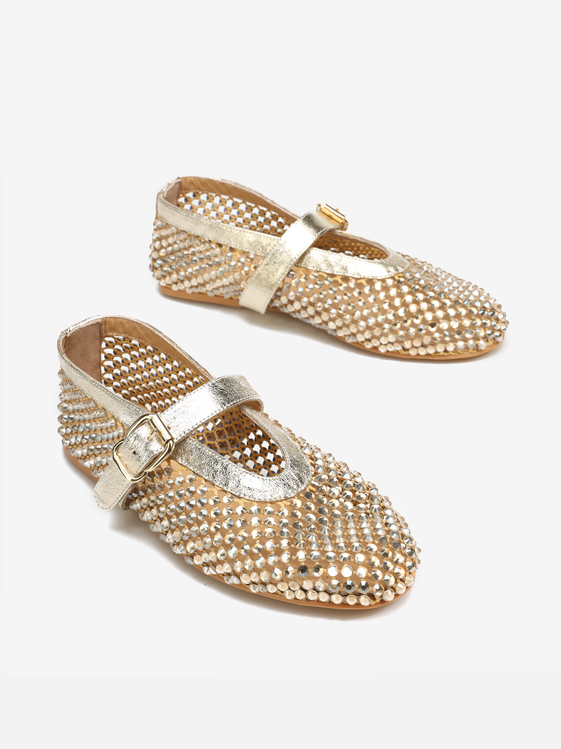 Baleriny Mary Jane wykonane z przewiewnej siateczki z połyskującymi kamyczkami. Regulowany pasek.