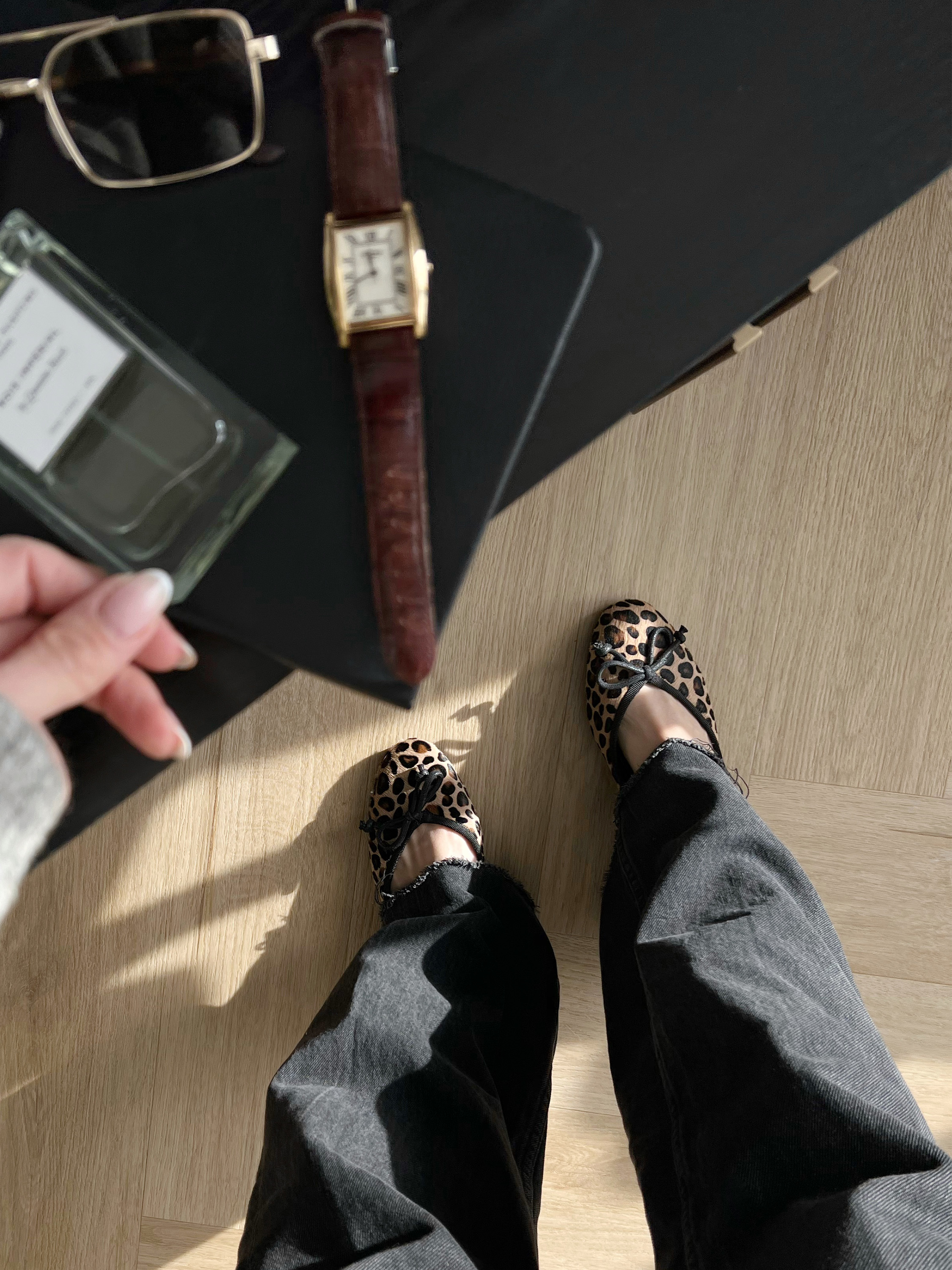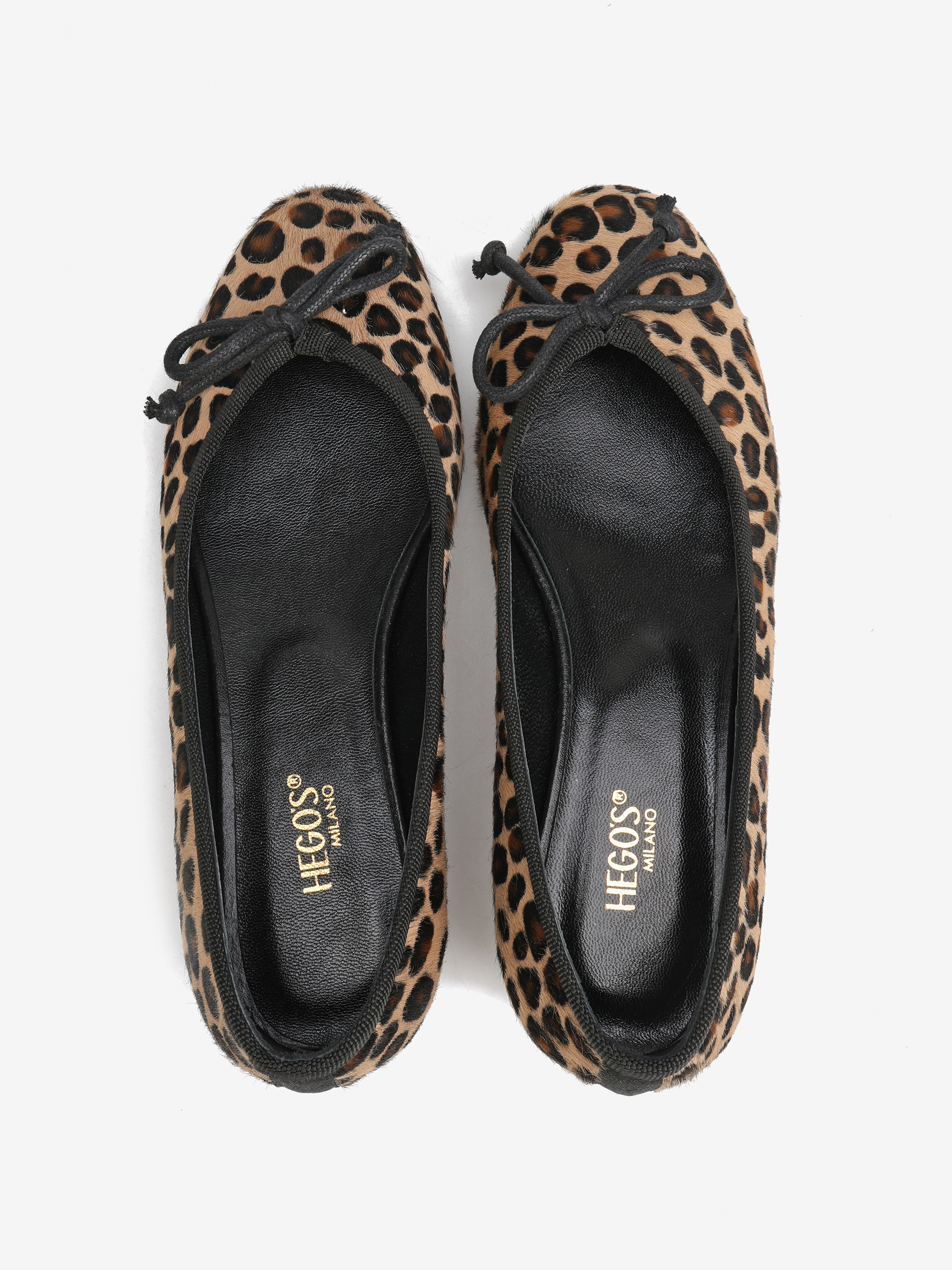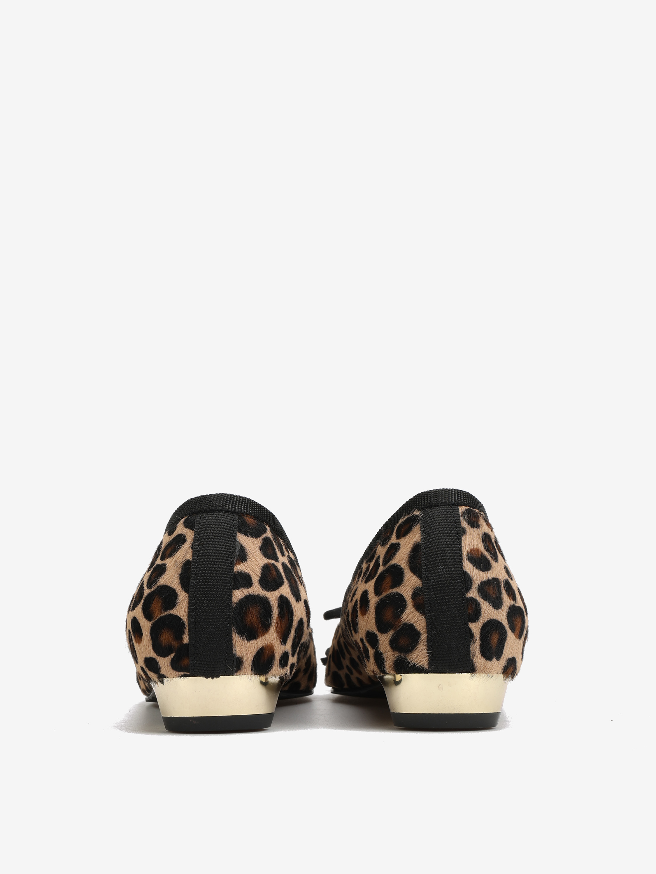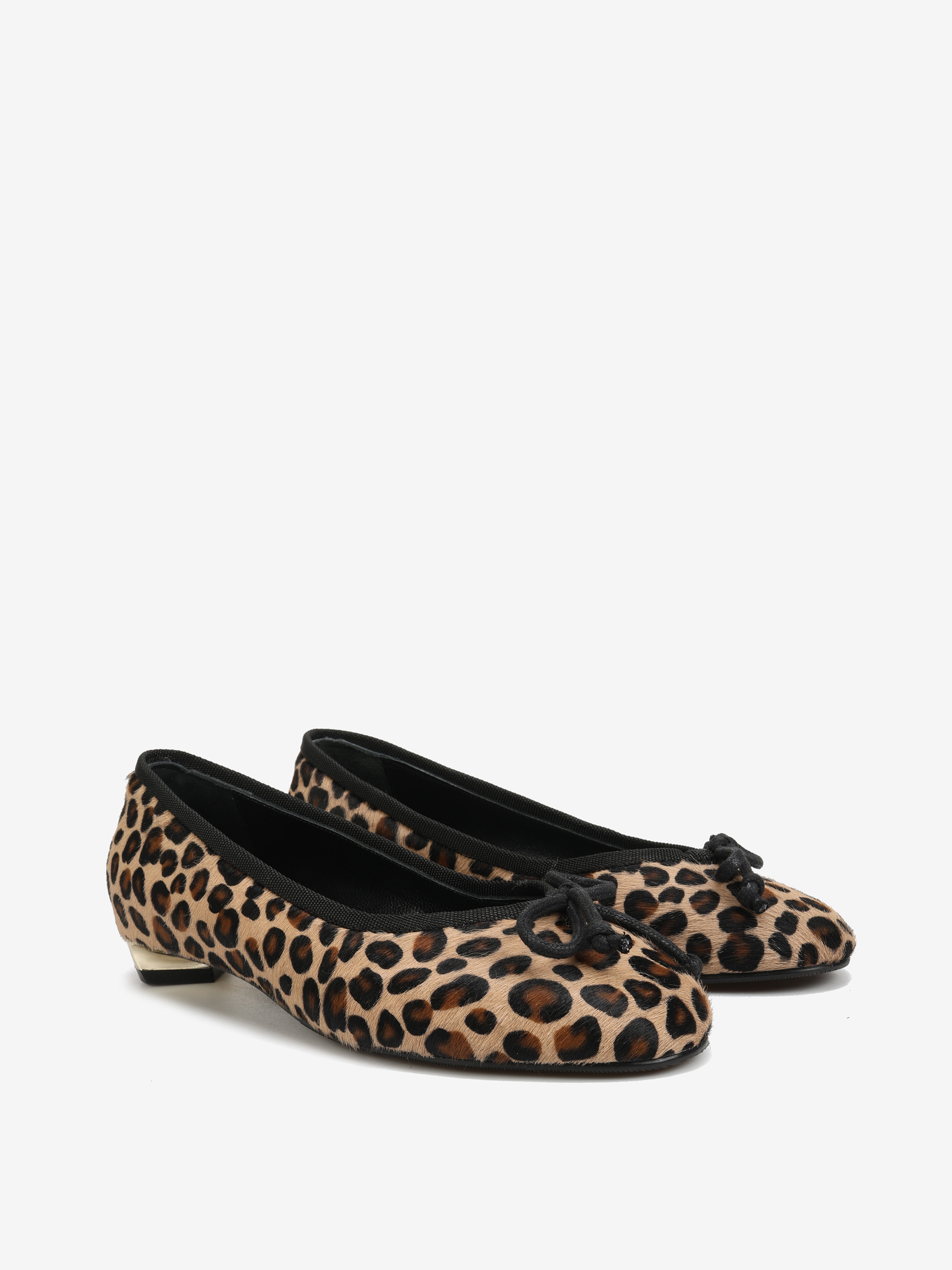 baleriny w zwierzece wzory na niskim, złotym obcasie. Wiązana kokardka umożliwia regulację dopasowania.