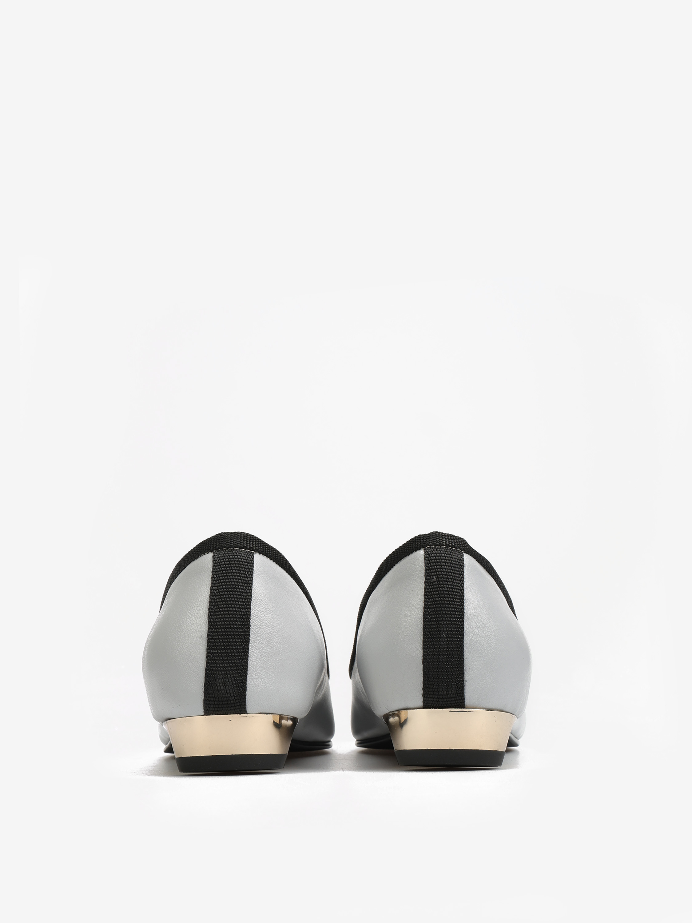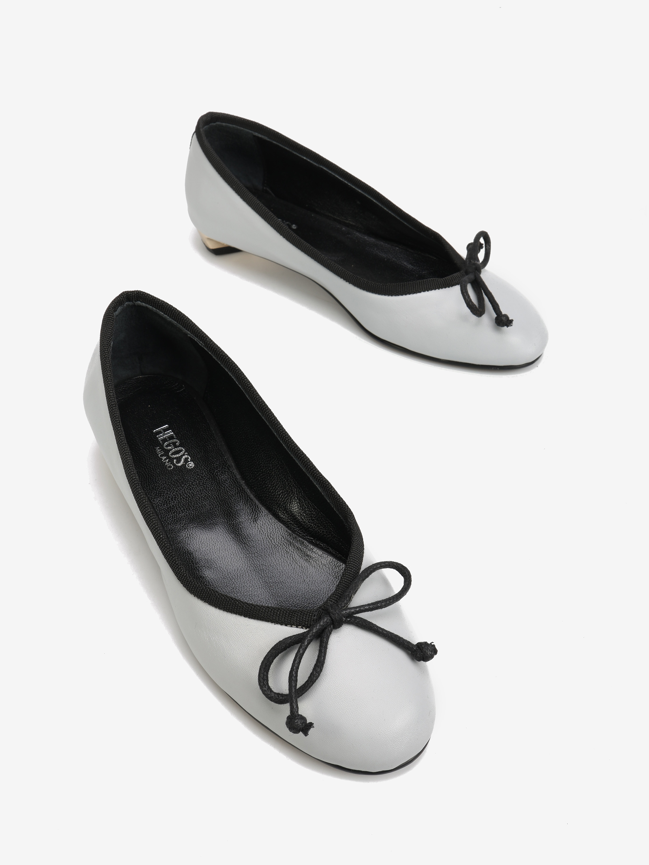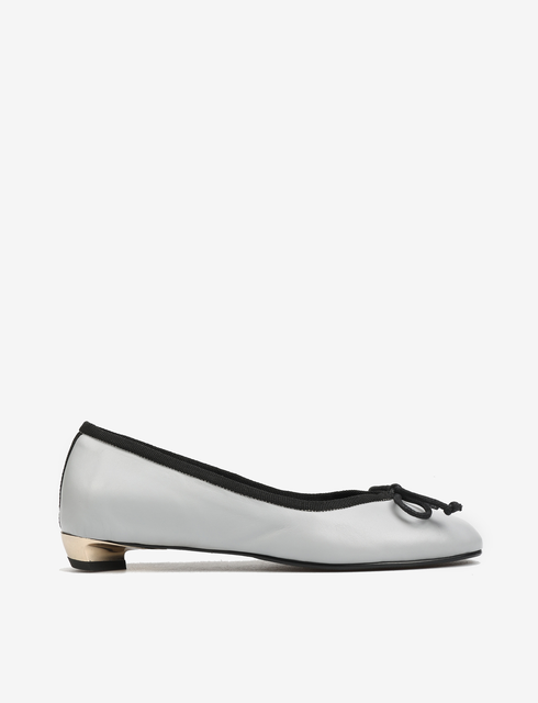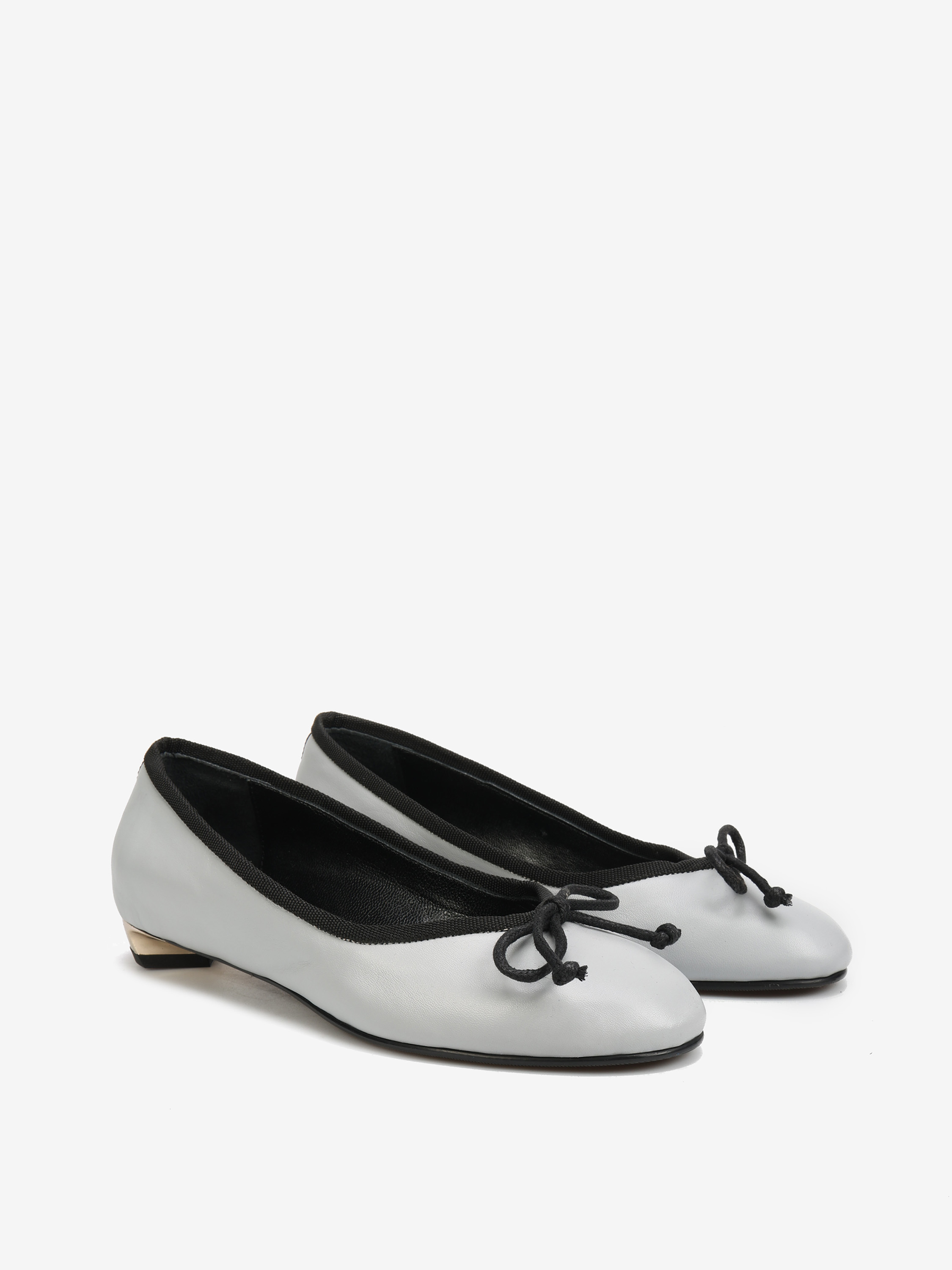 Klasyczne baleriny na niskim, złotym obcasie. Wiązana kokardka umożliwia regulację dopasowania.