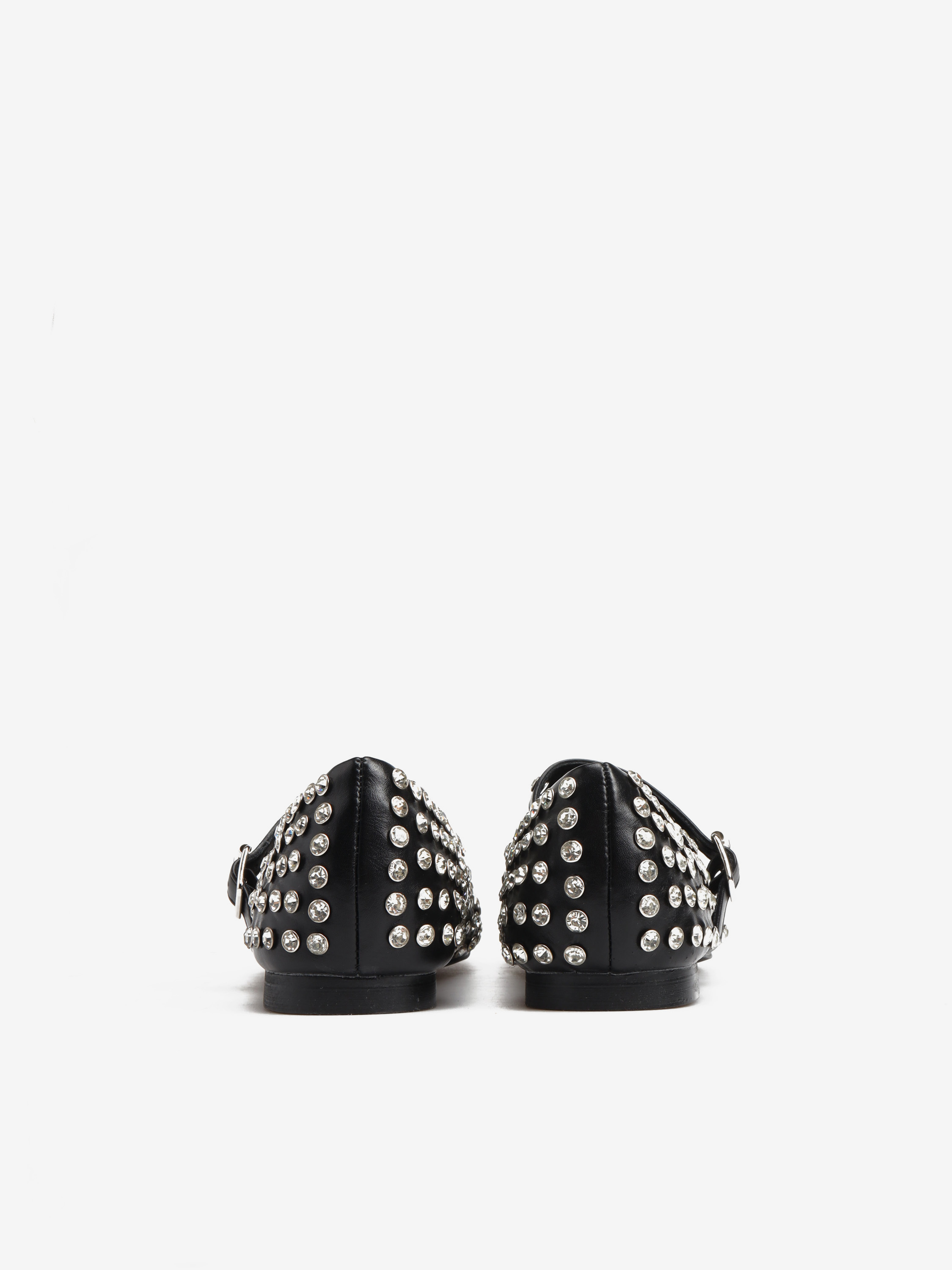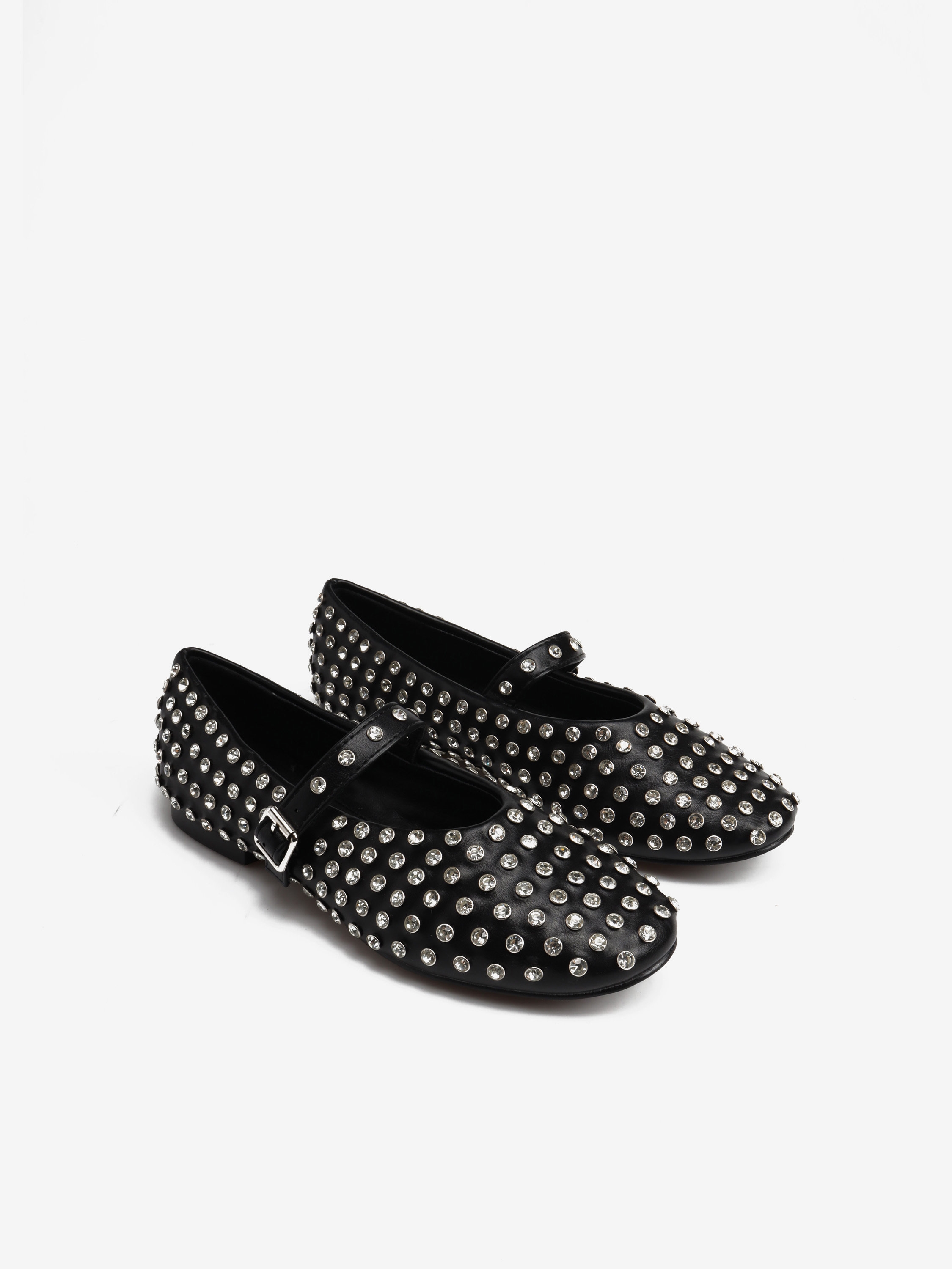 Baleriny z okrągłym noskiem o ozdobnymi, połyskującymi kamieniami. Regulowany pasek.
