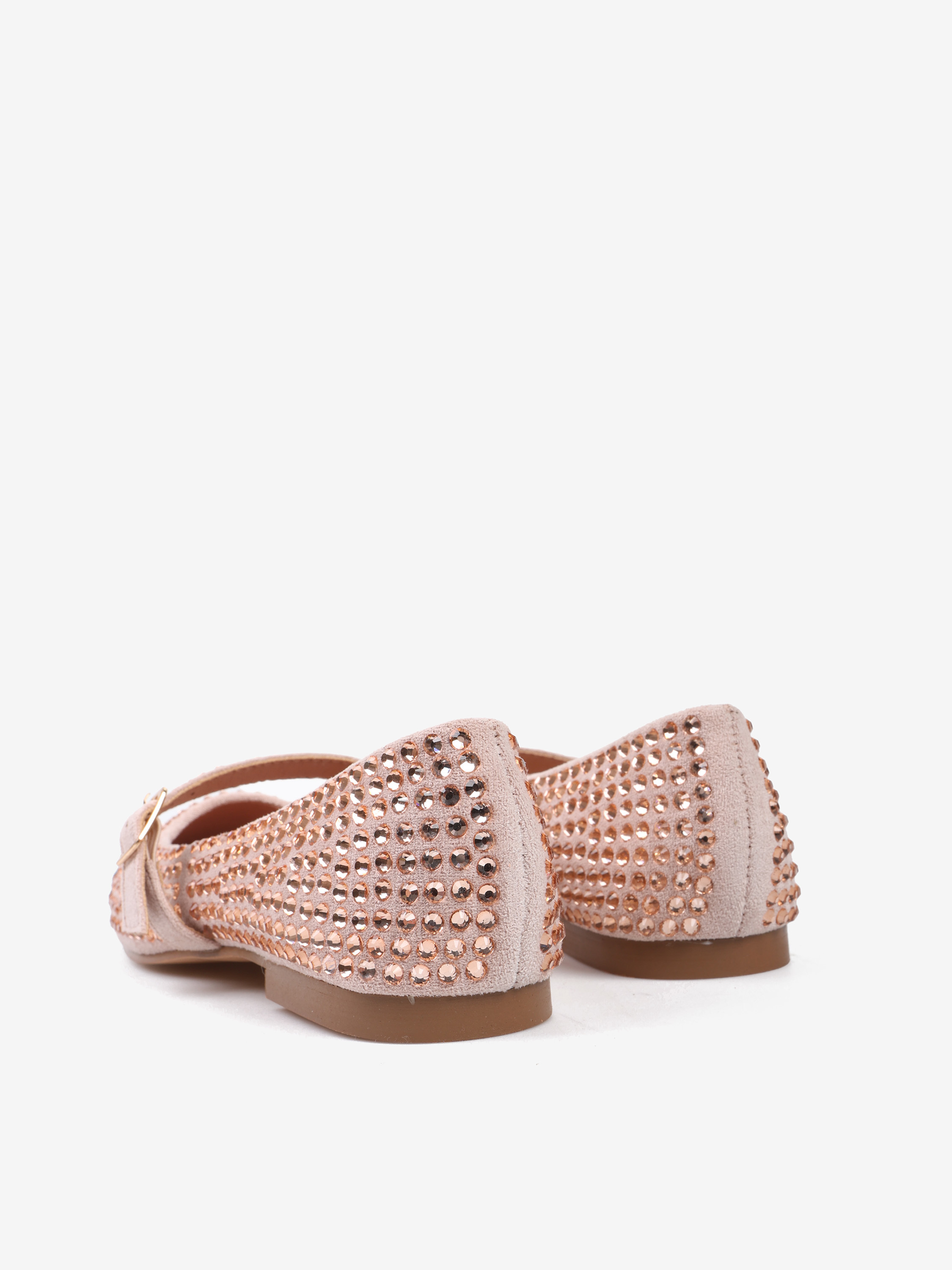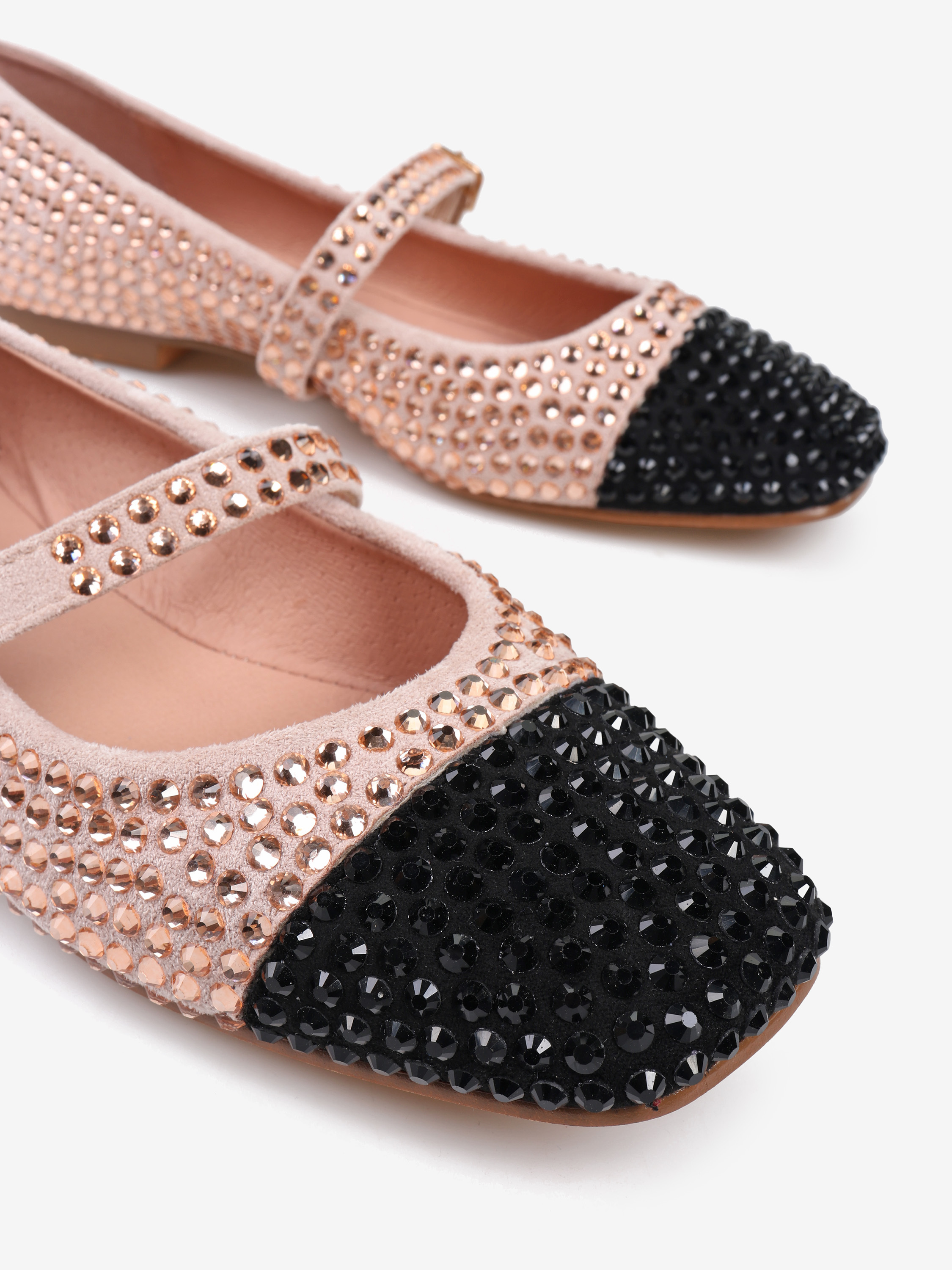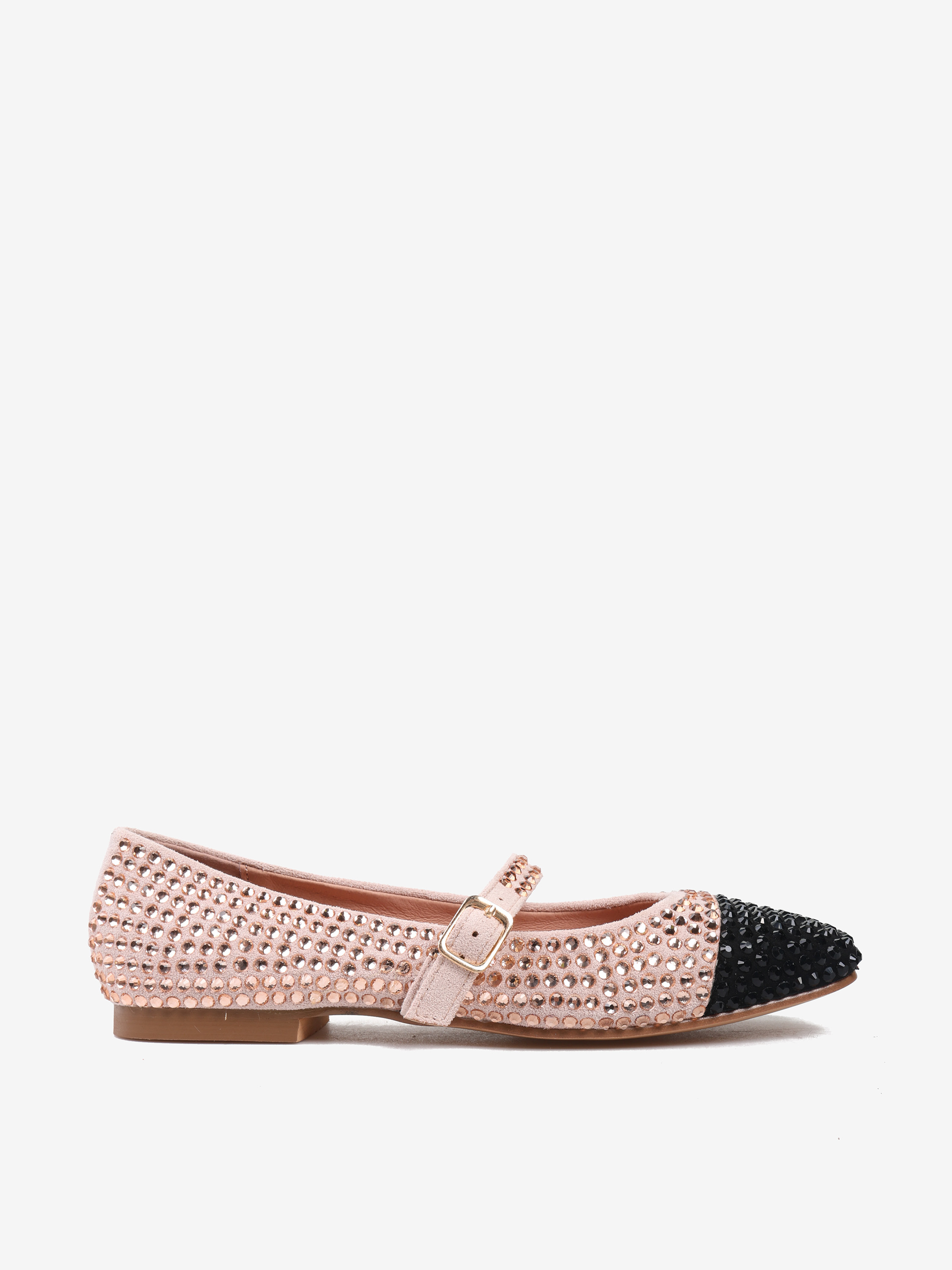 Różowe baleriny Mary Jane z ozdobnymi, połyskującymi kamykami. Kwadratowy, czarny nosek i regulowany pasek.