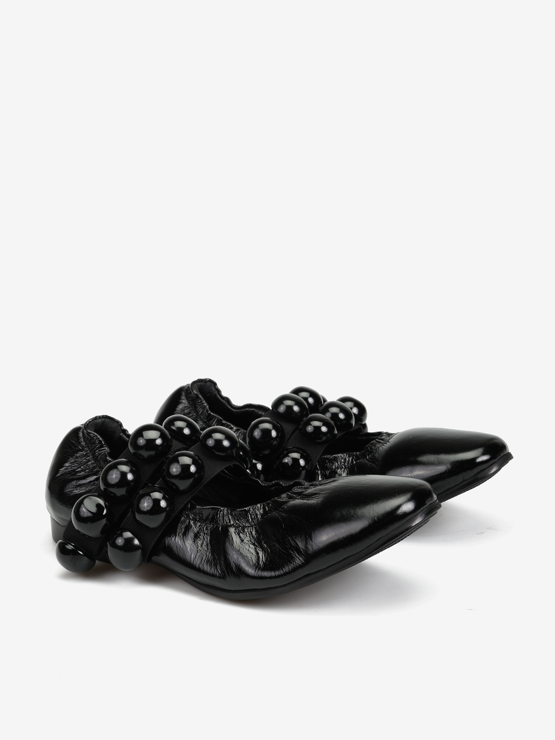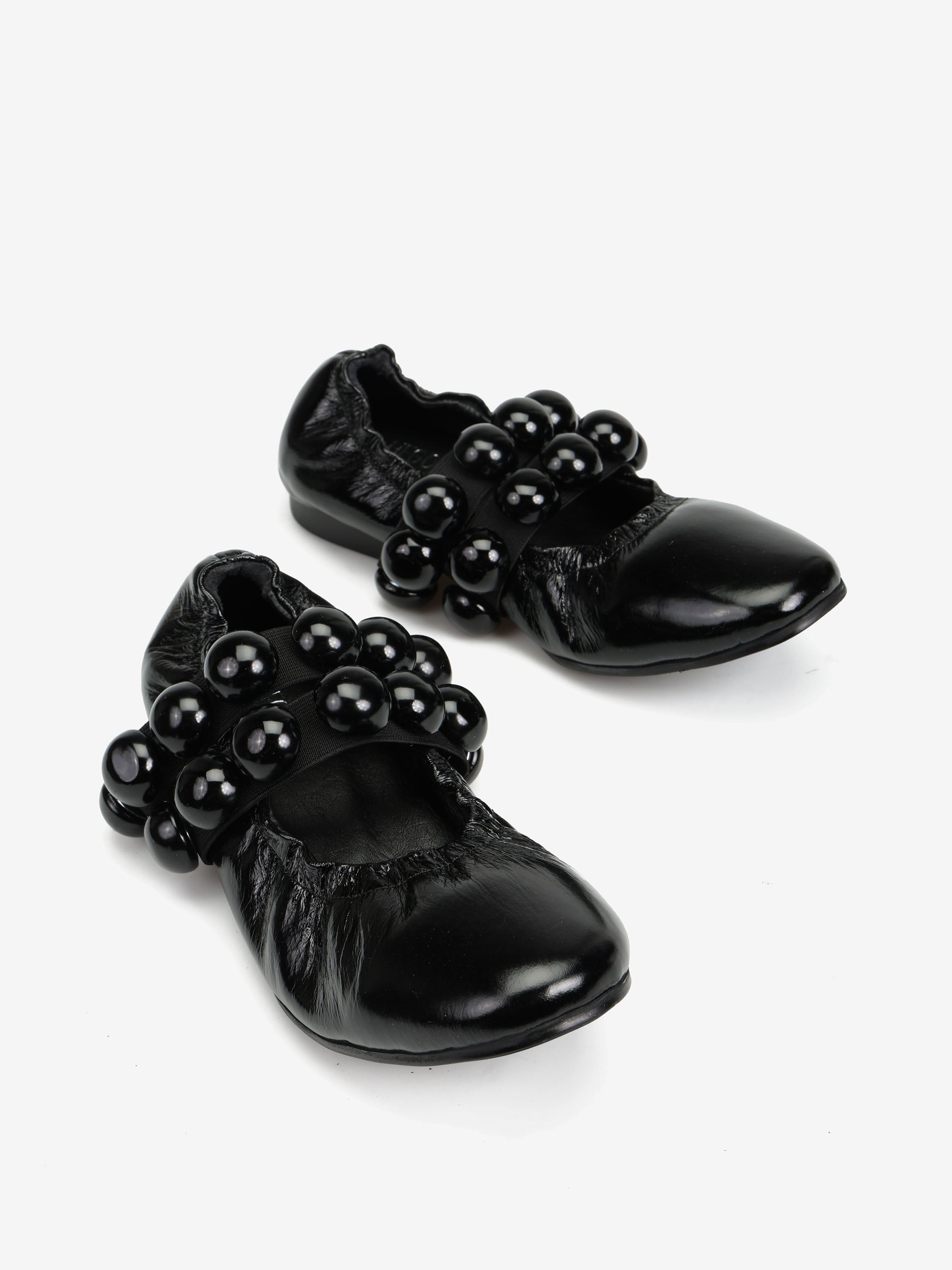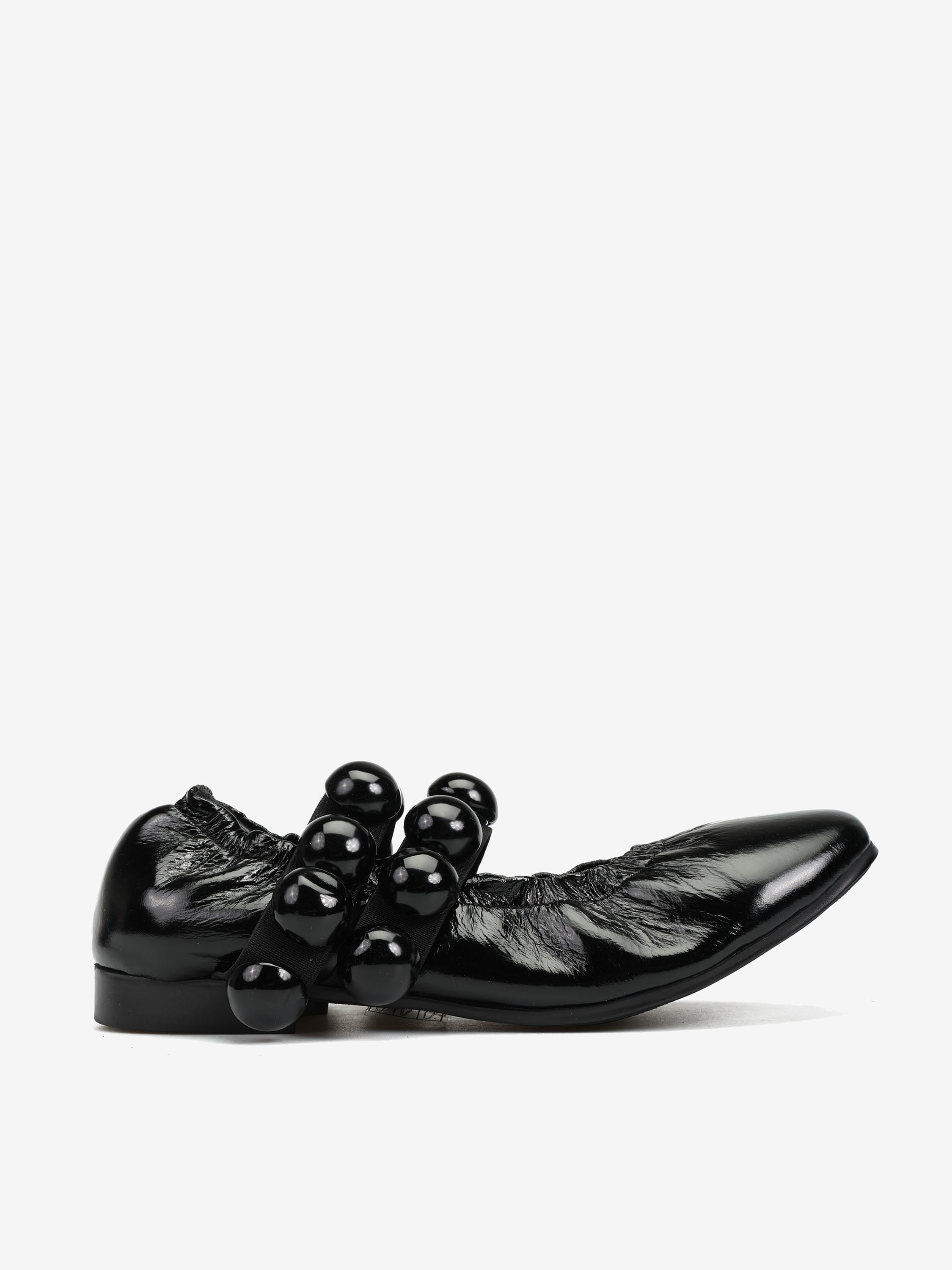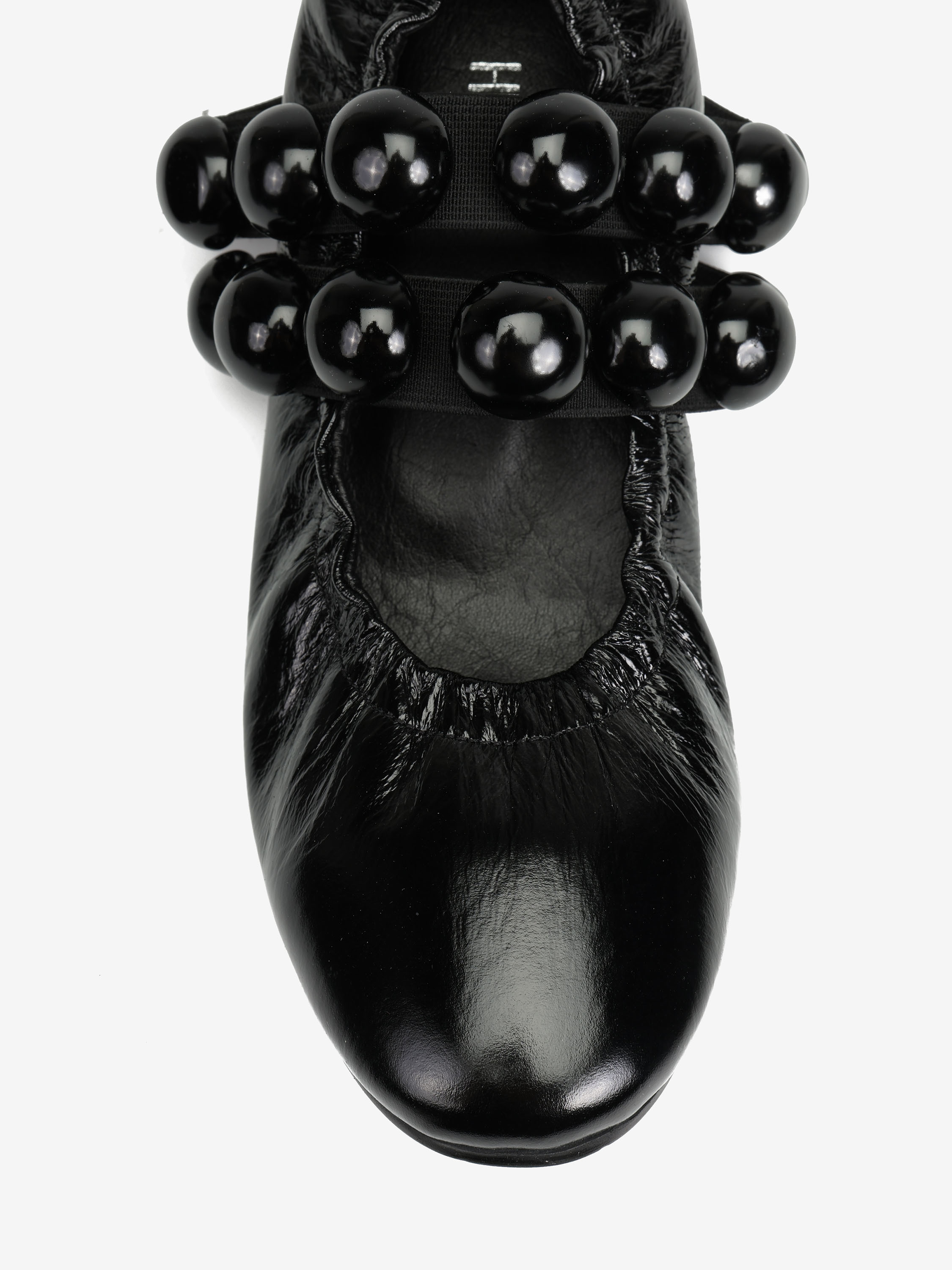 Skórzane baleriny z elastyczną lamówką. Podwójna gumka z ozdobną aplikacją na podbiciu.