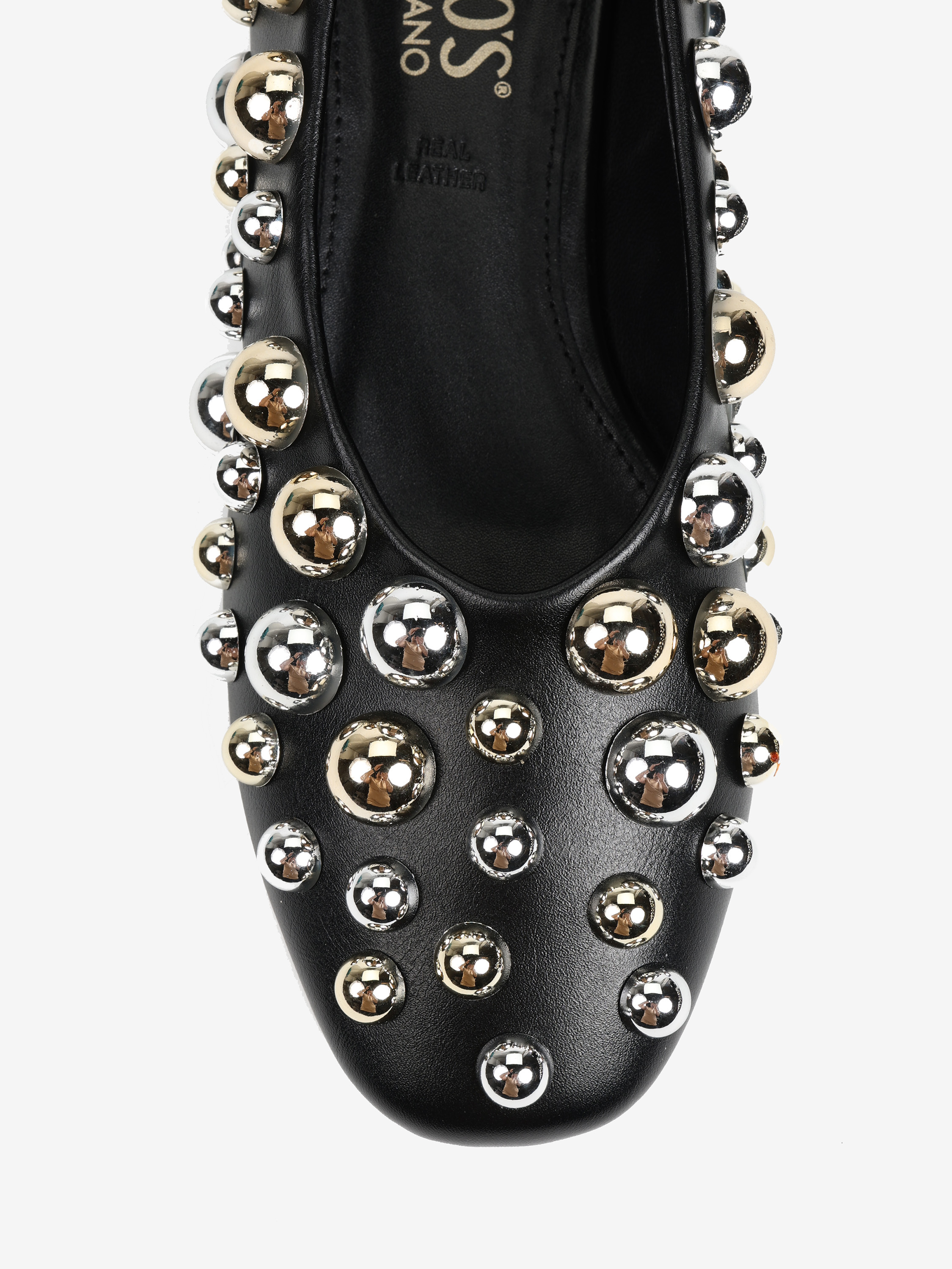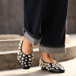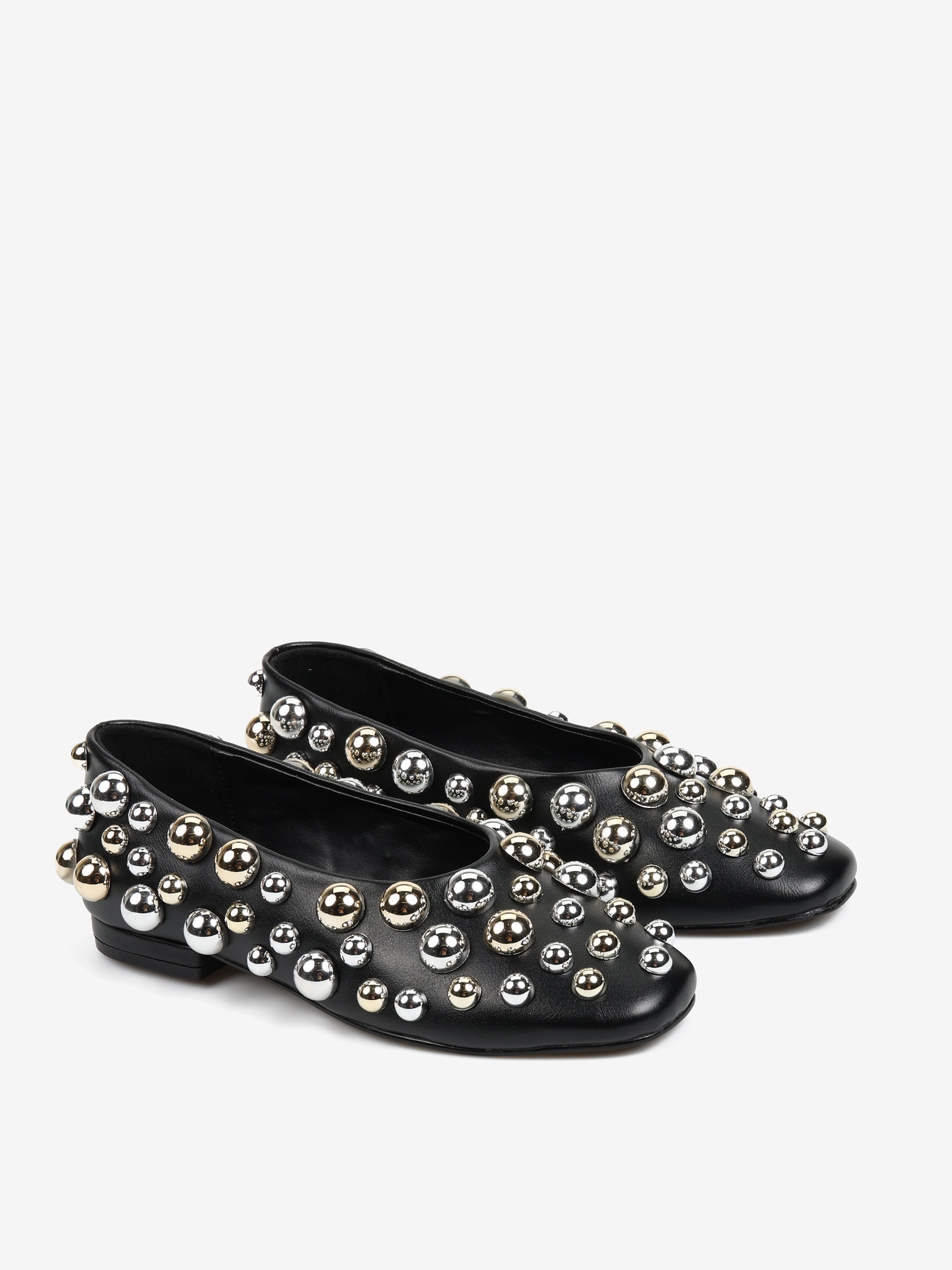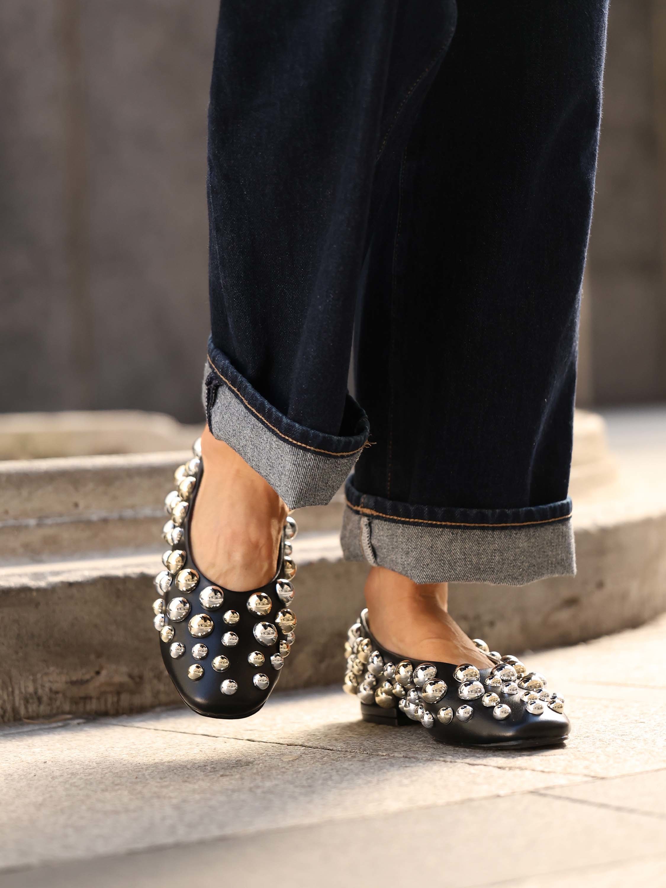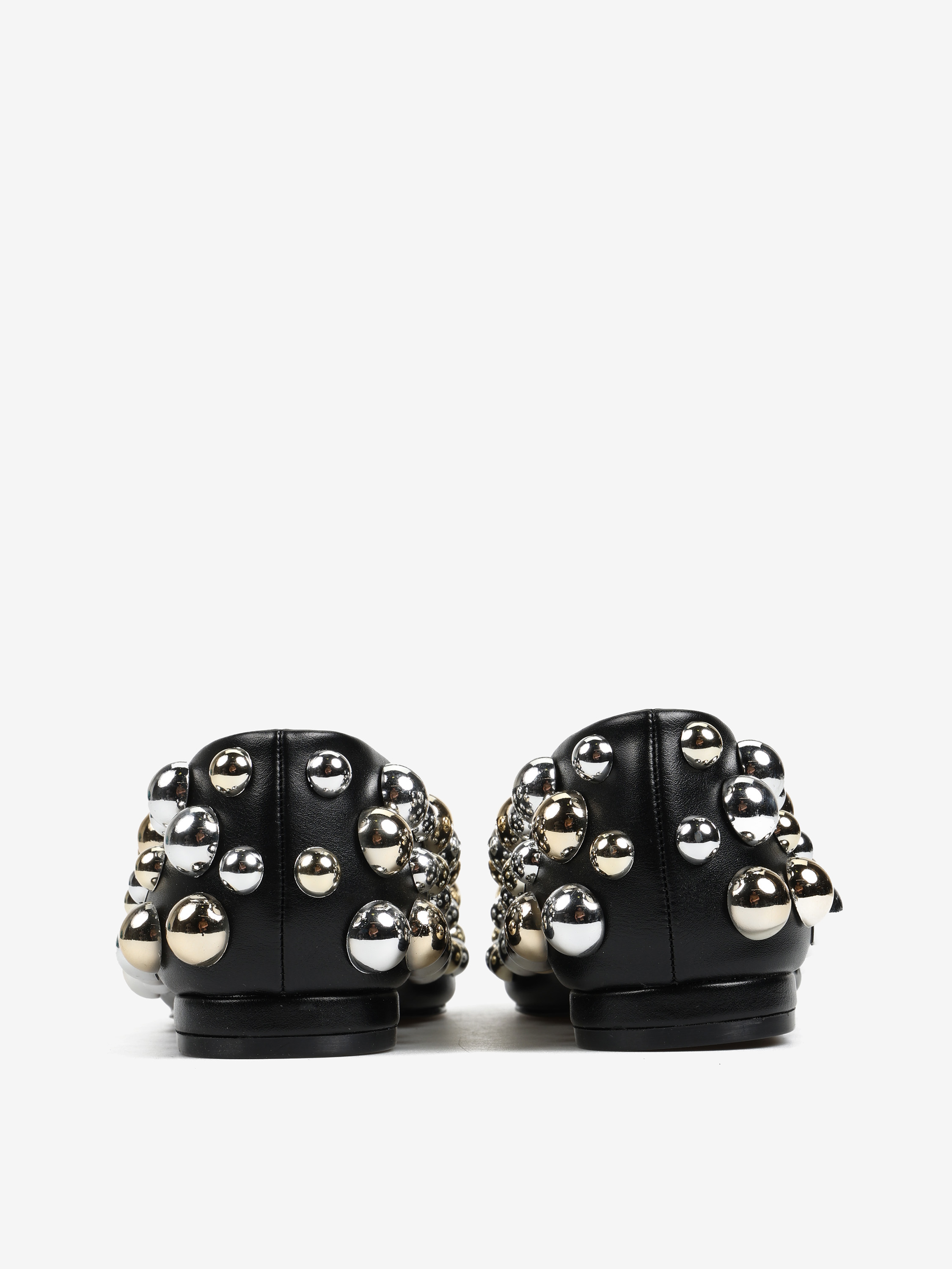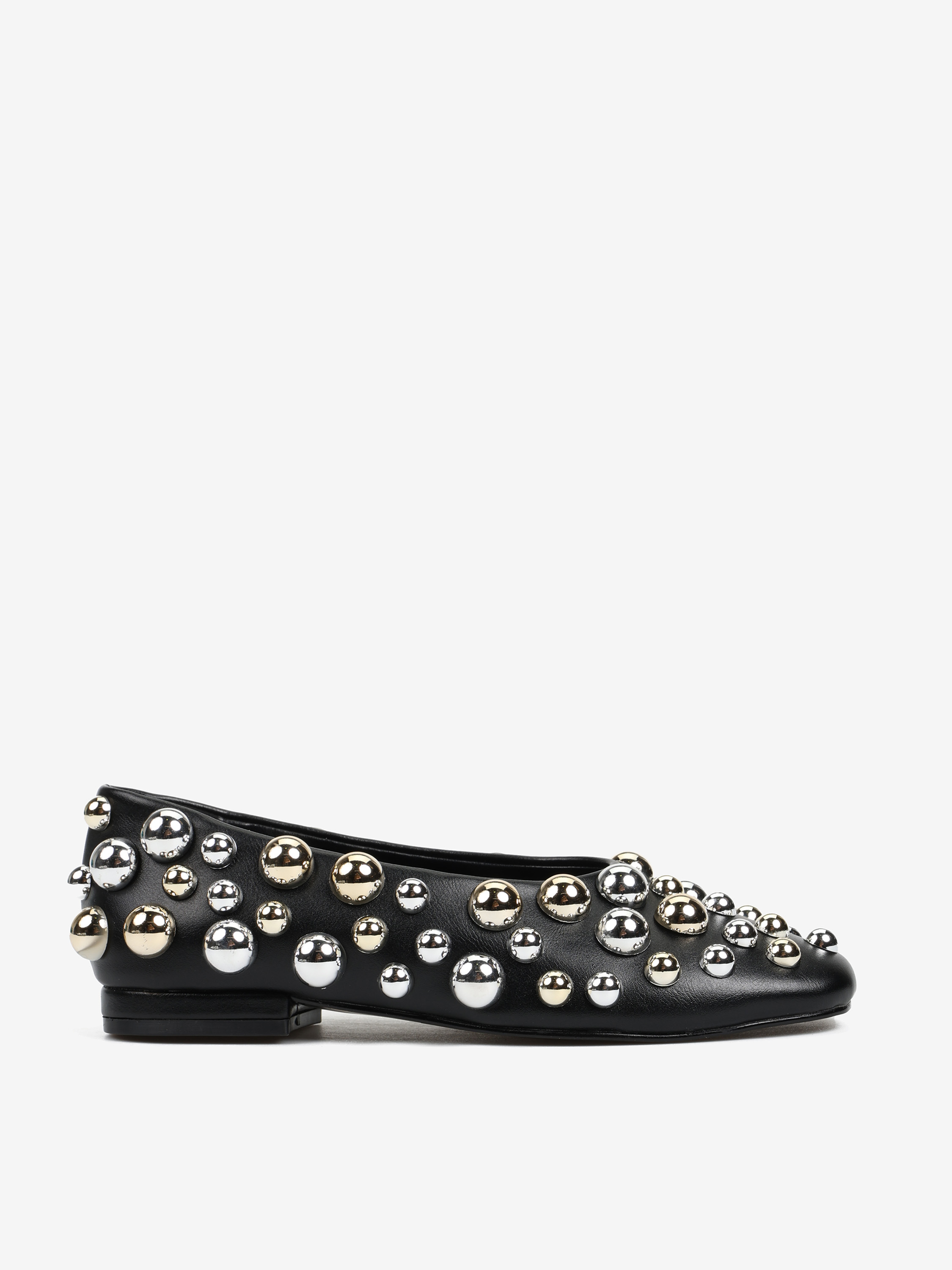 Baleriny z owalnym, zabudowanym wycięciem. Ozdobione srebrnymi i złotymi ćwiekami w różnych rozmiarach.