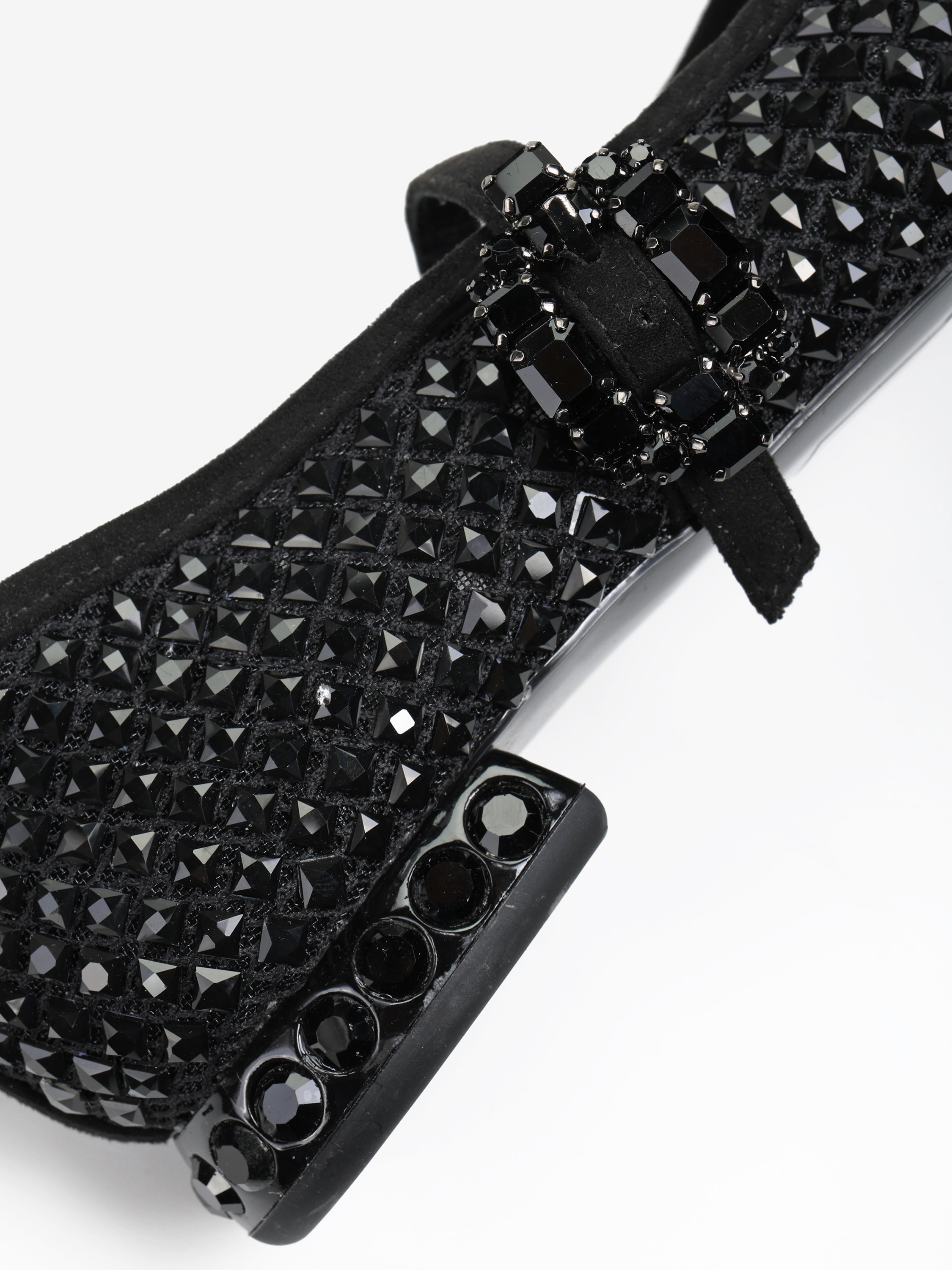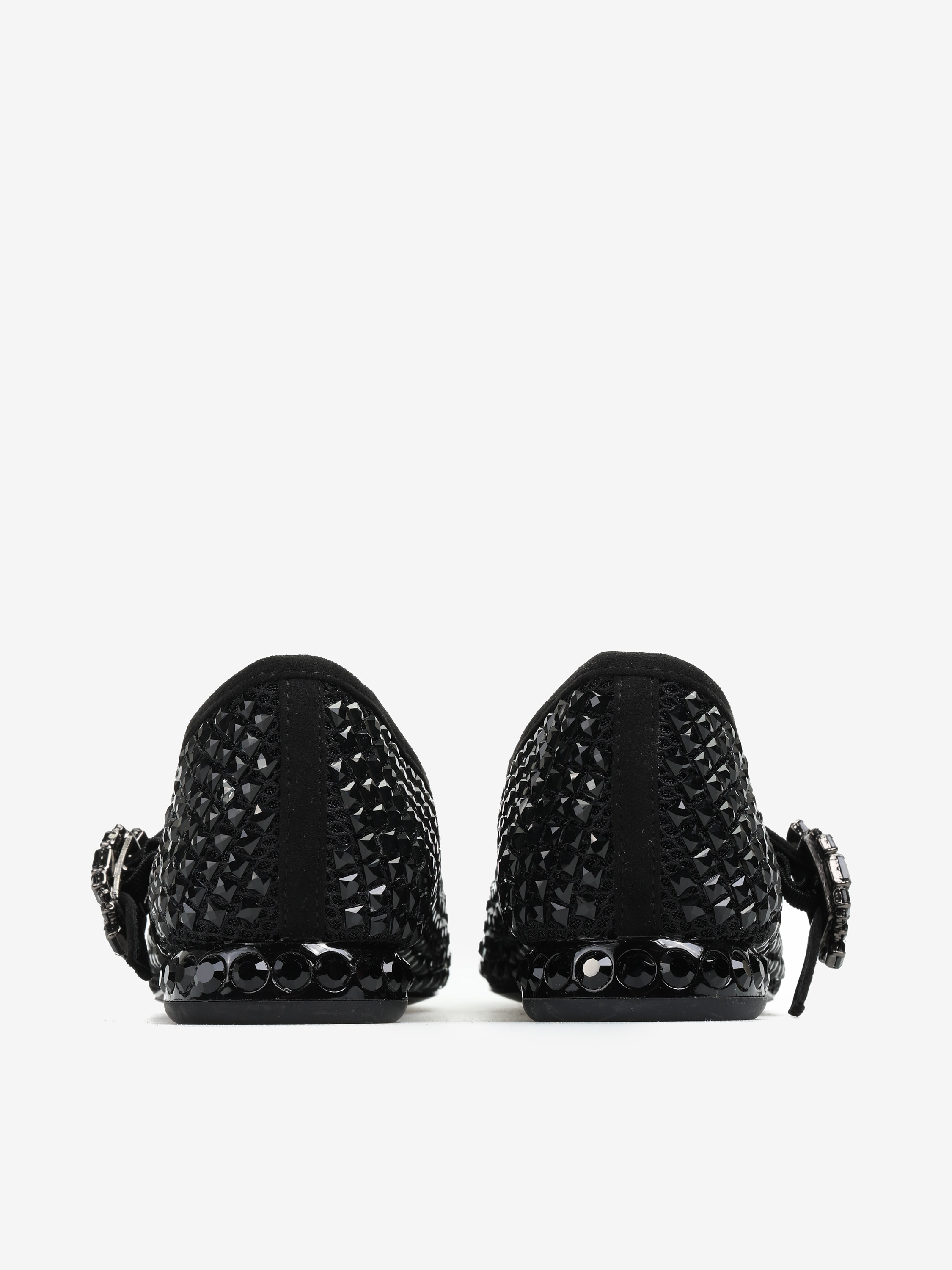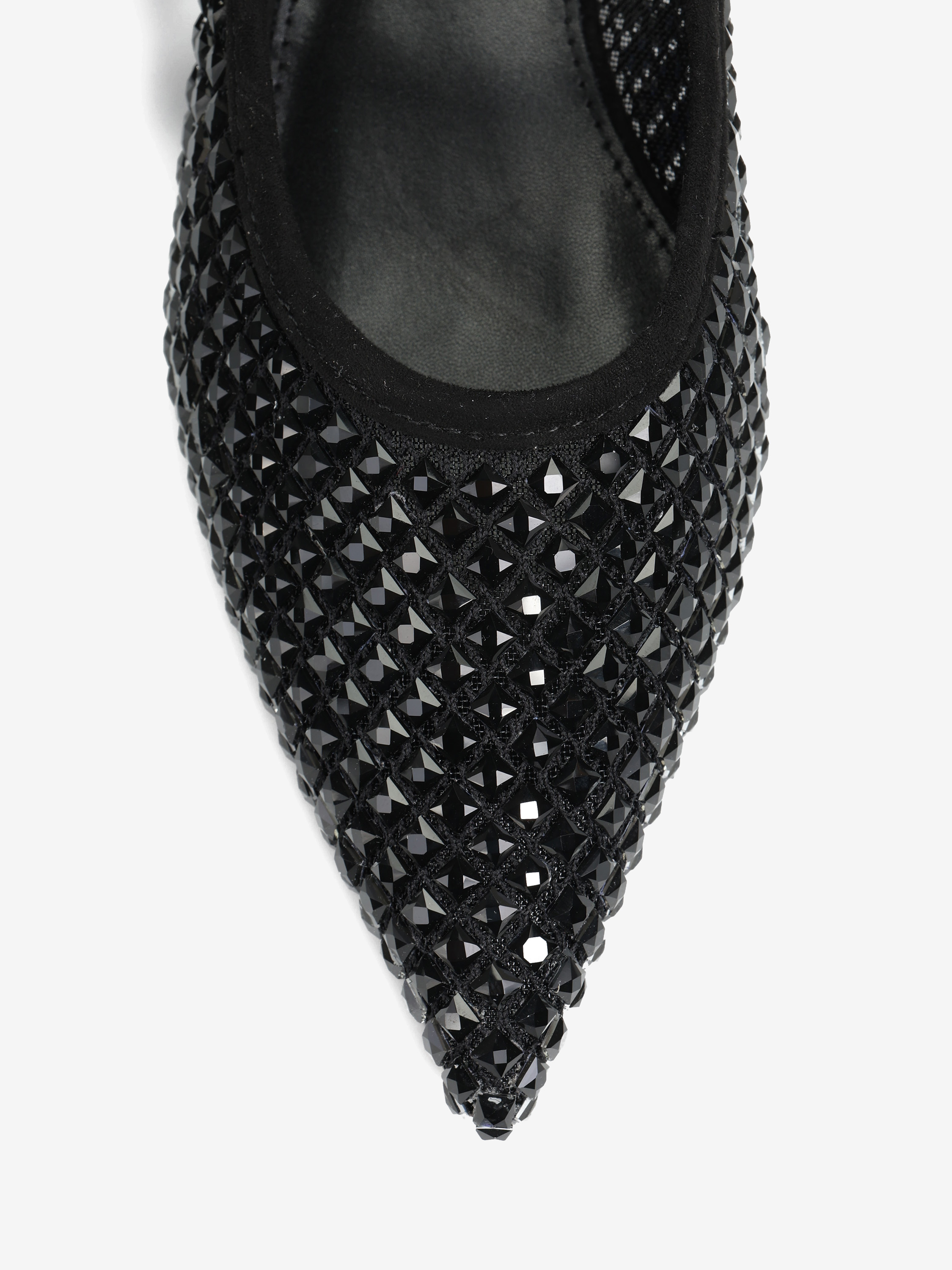 Baleriny Mary Jane wykonane z siateczki zdobionej kryształkami. Noski w szpic, niski obcas i regulowany pasek.