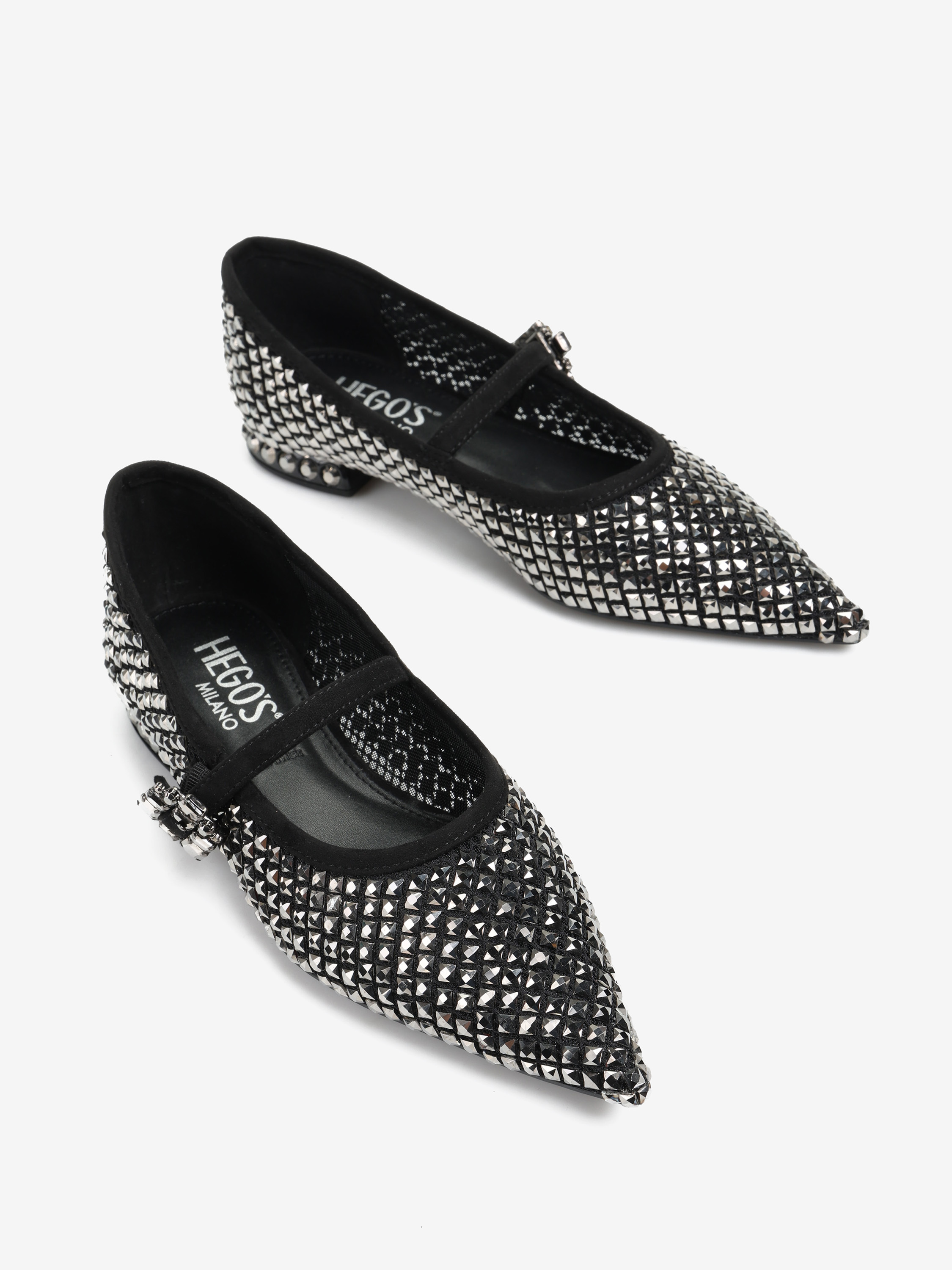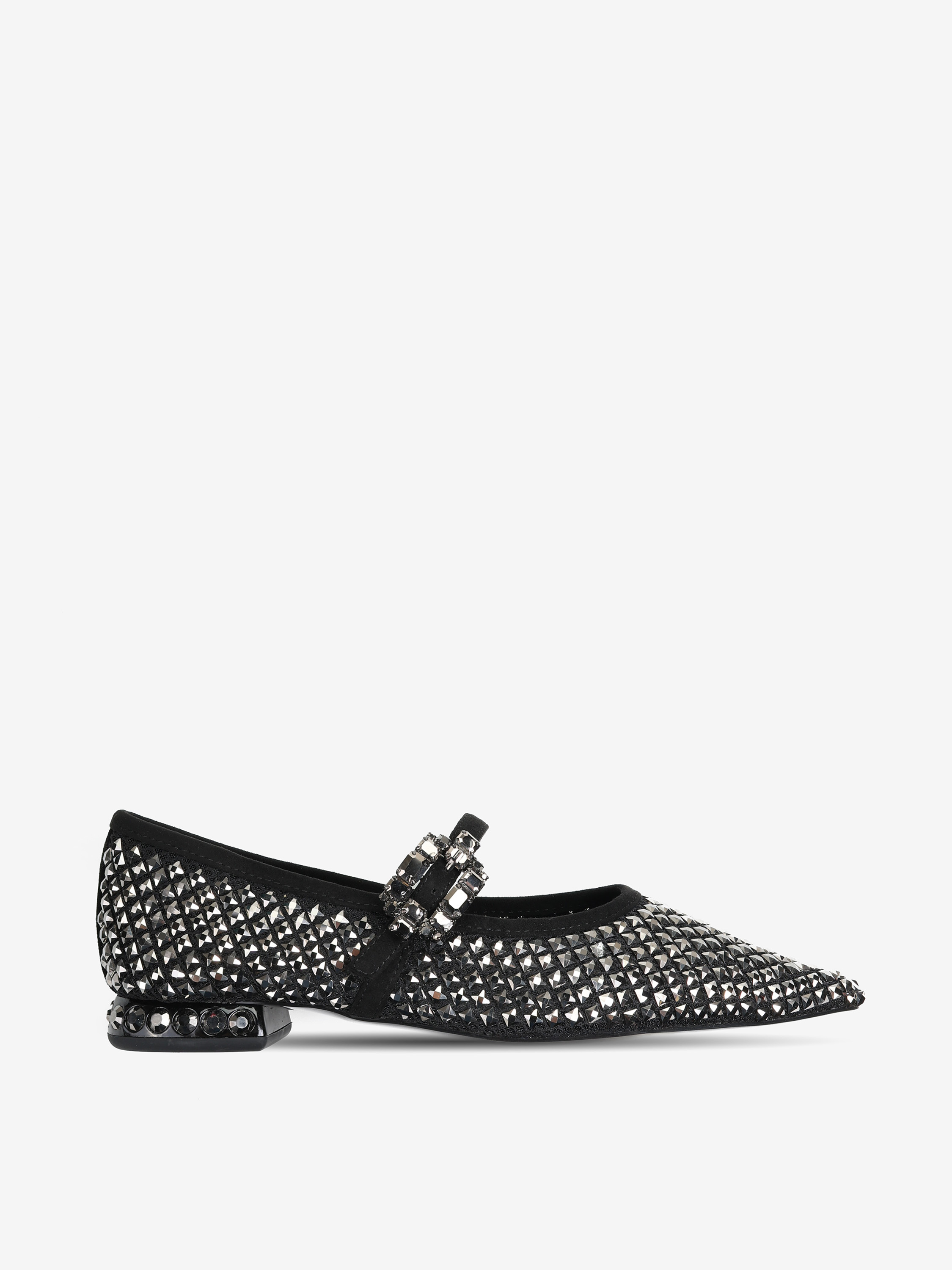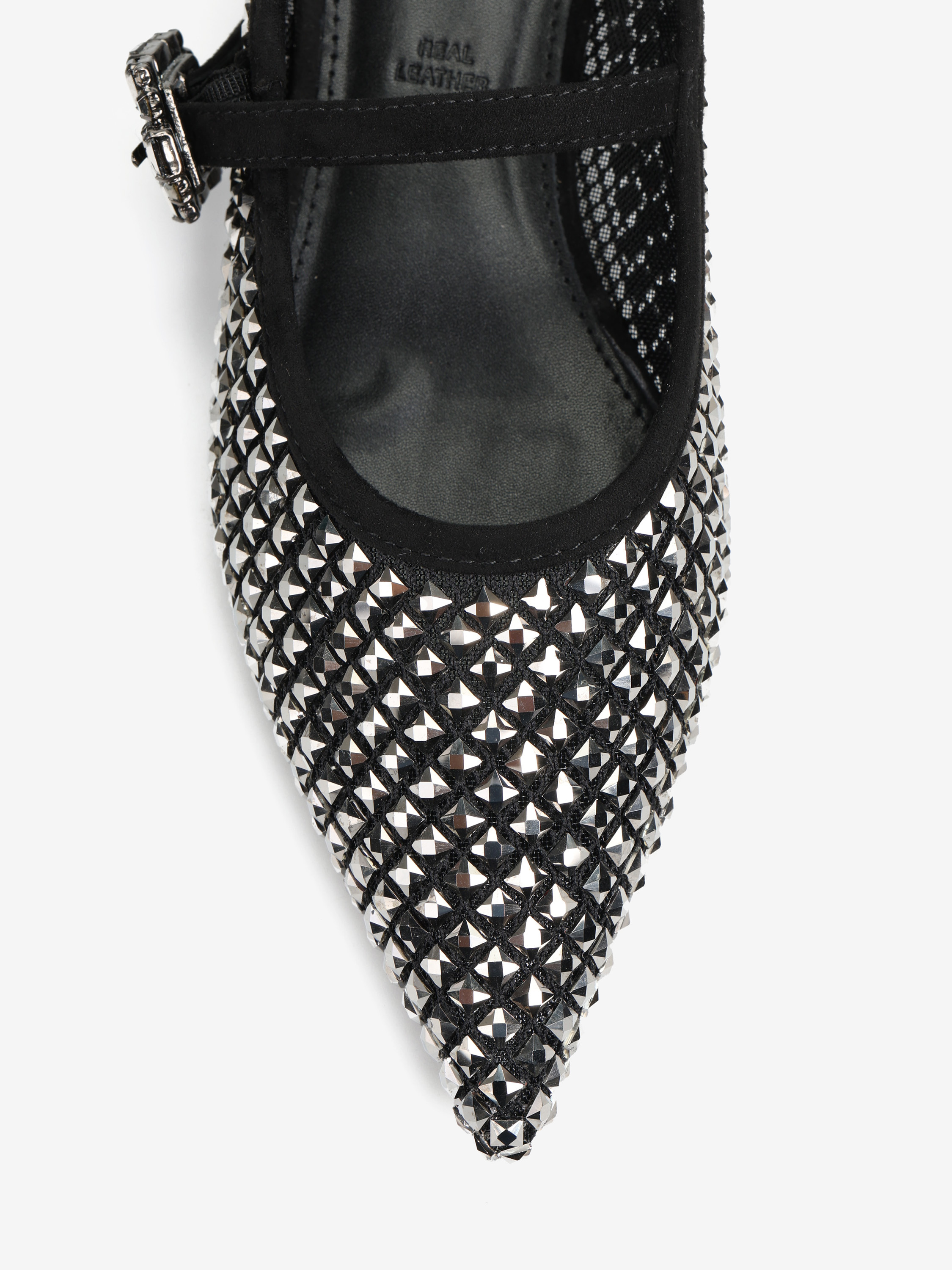 Baleriny Mary Jane wykonane z siateczki zdobionej kryształkami. Noski w szpic, niski obcas i regulowany pasek.