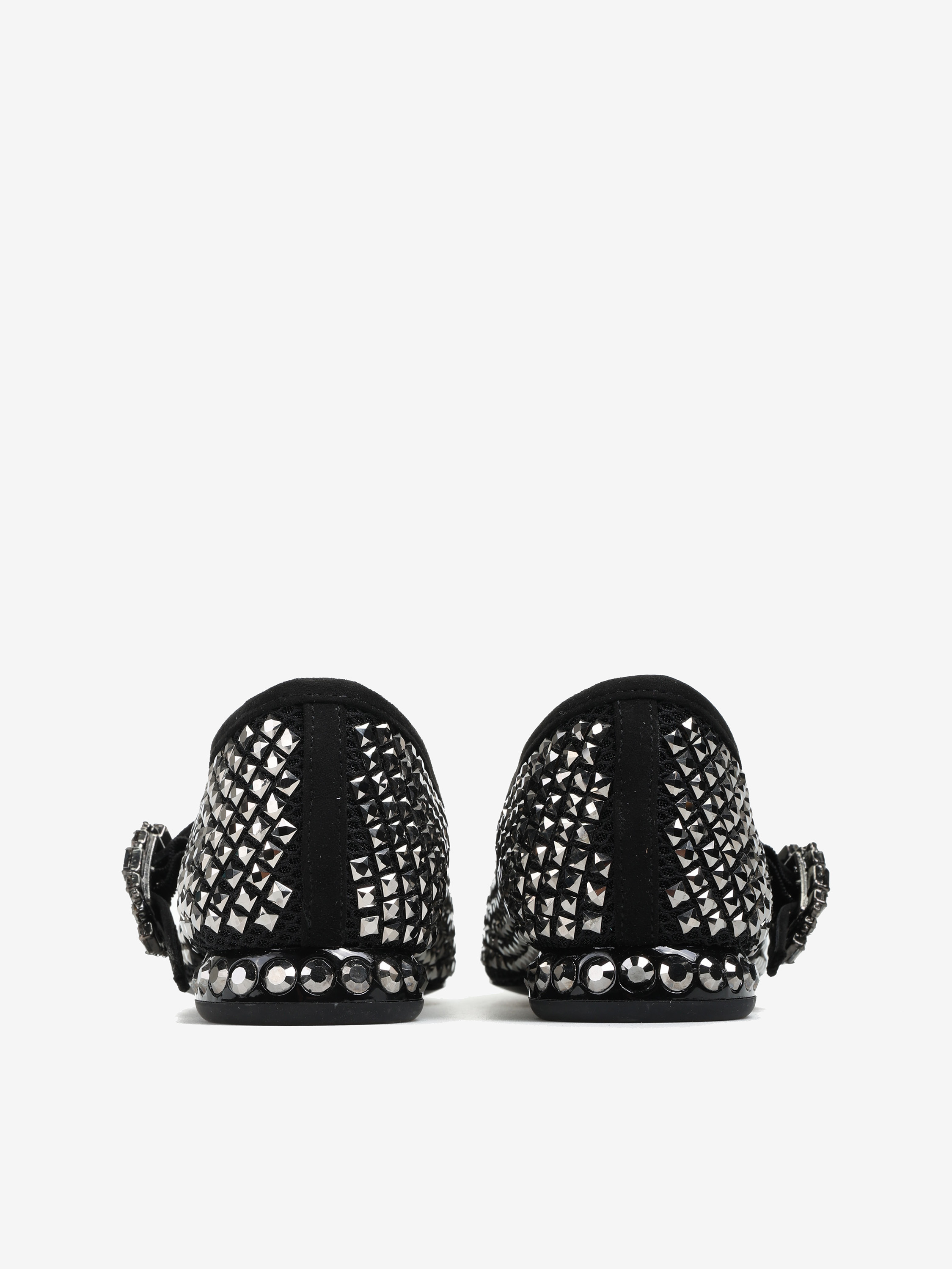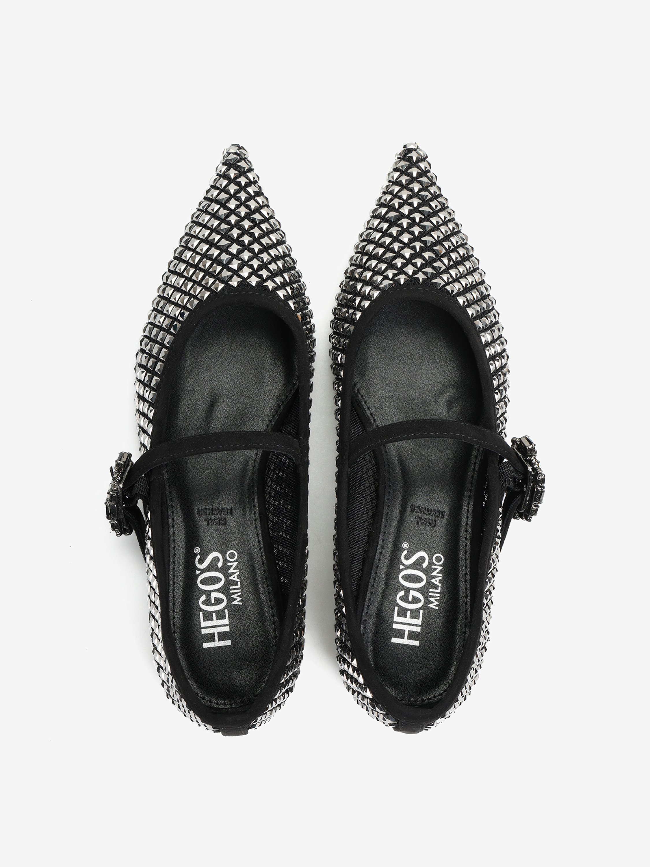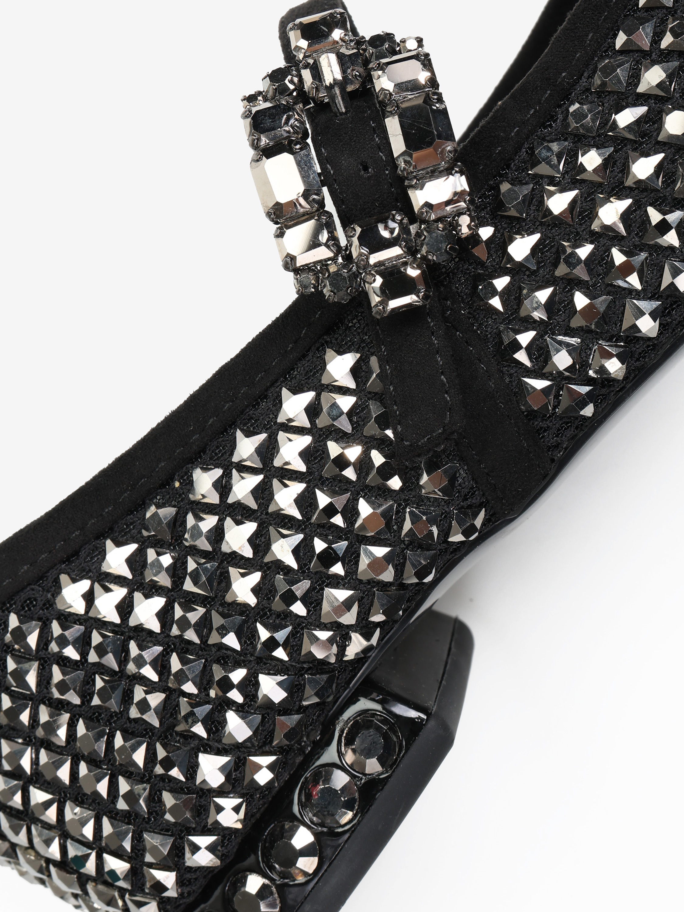 Baleriny Mary Jane wykonane z siateczki zdobionej kryształkami. Noski w szpic, niski obcas i regulowany pasek.