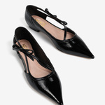 Lakierowane, czarne baleriny z noskami w szpic. Głębokie wycięcie i ozdobny pasek z kokardą.